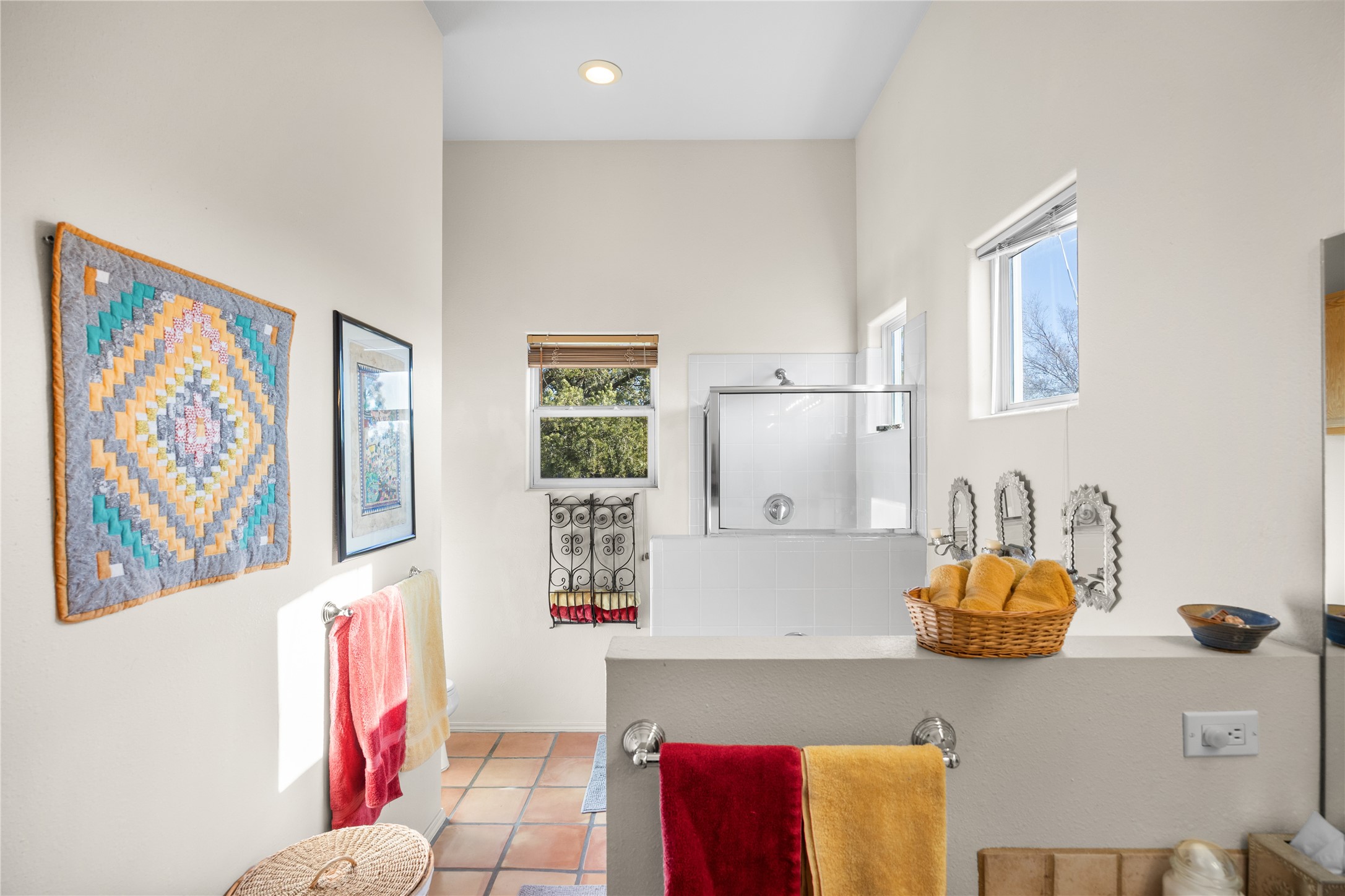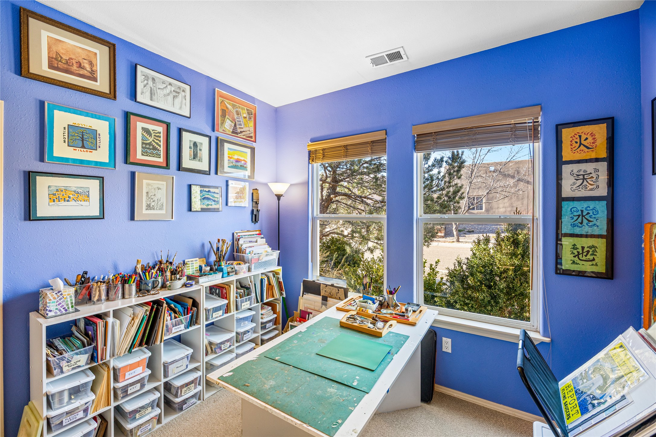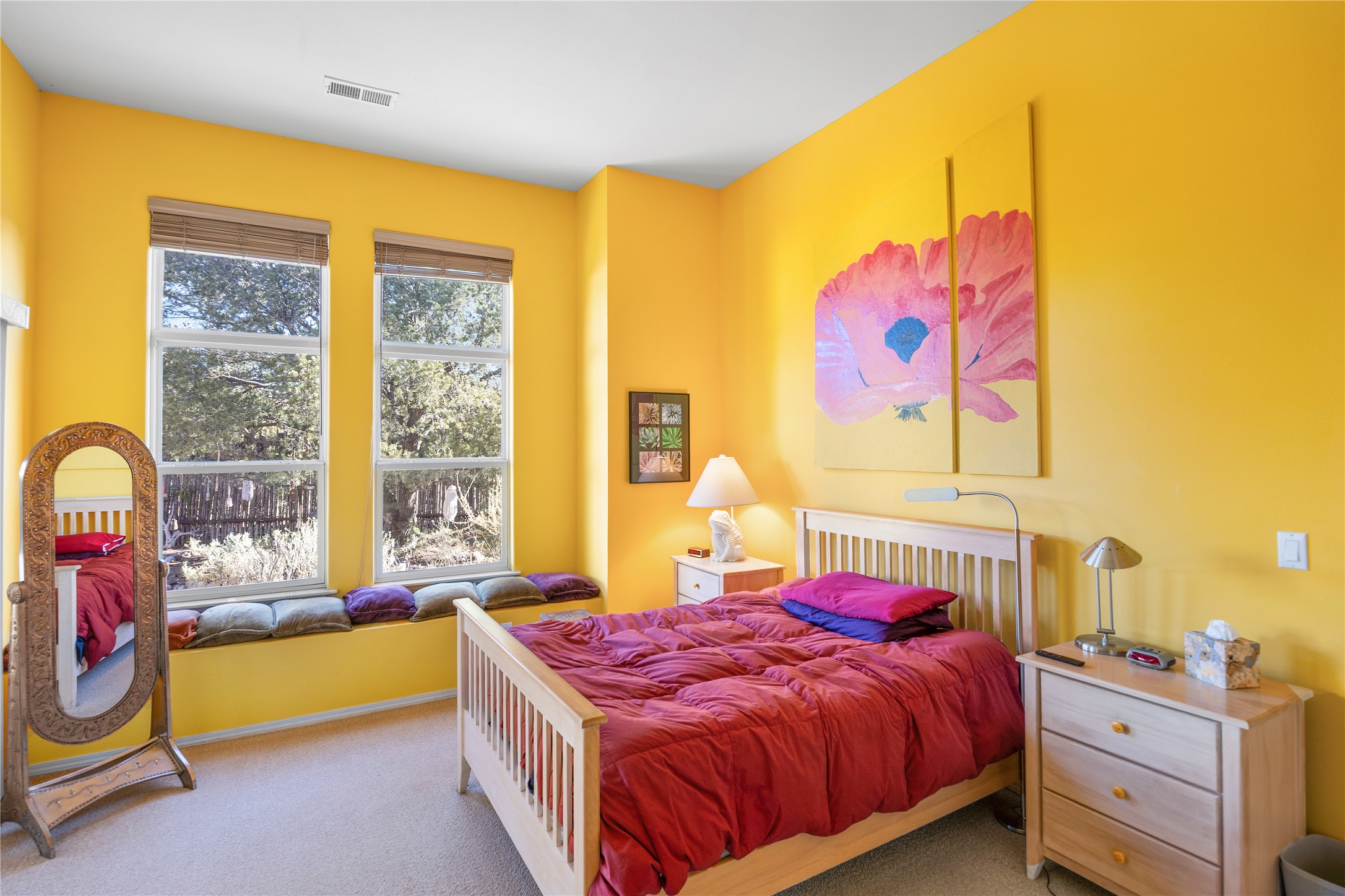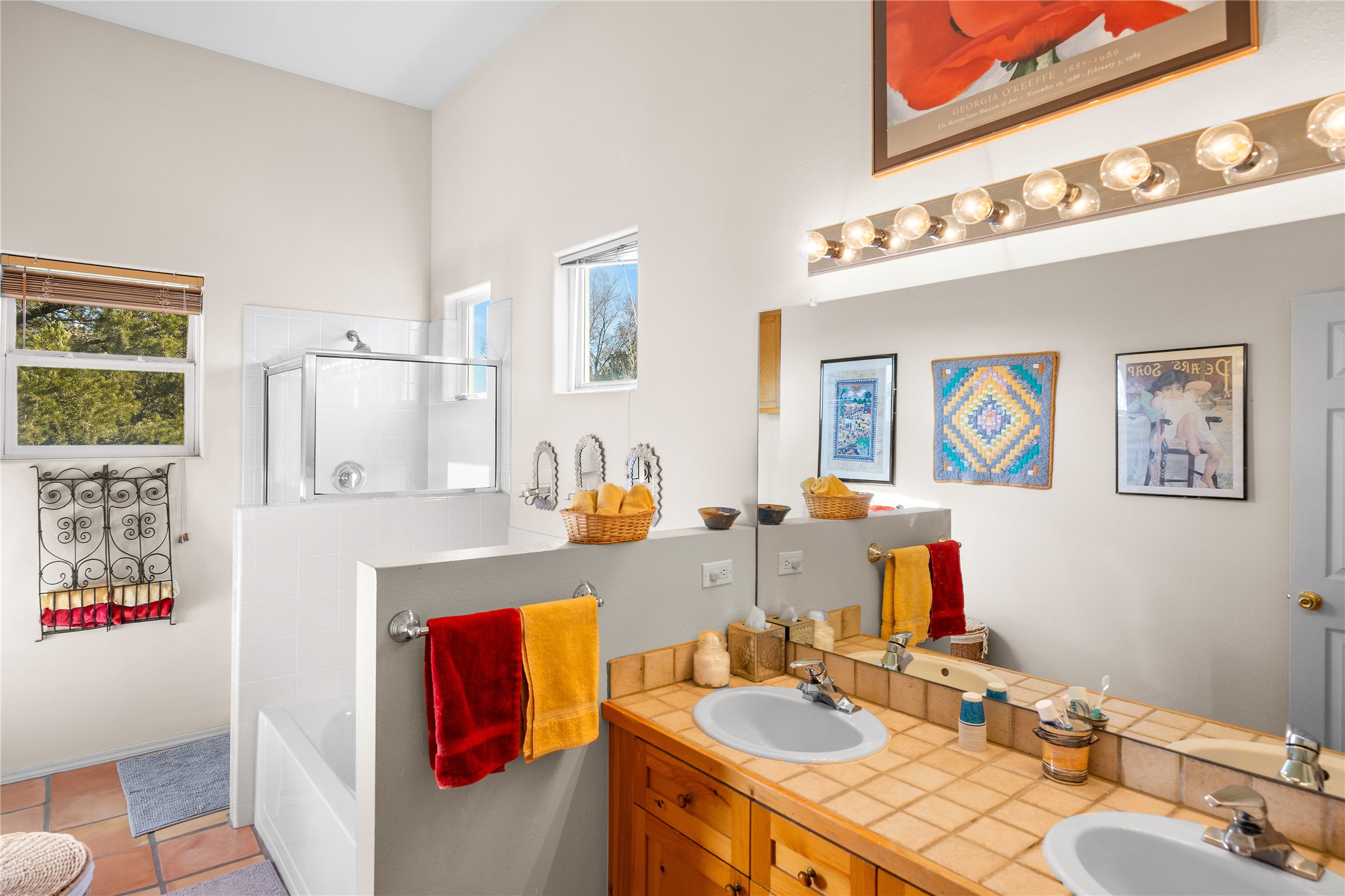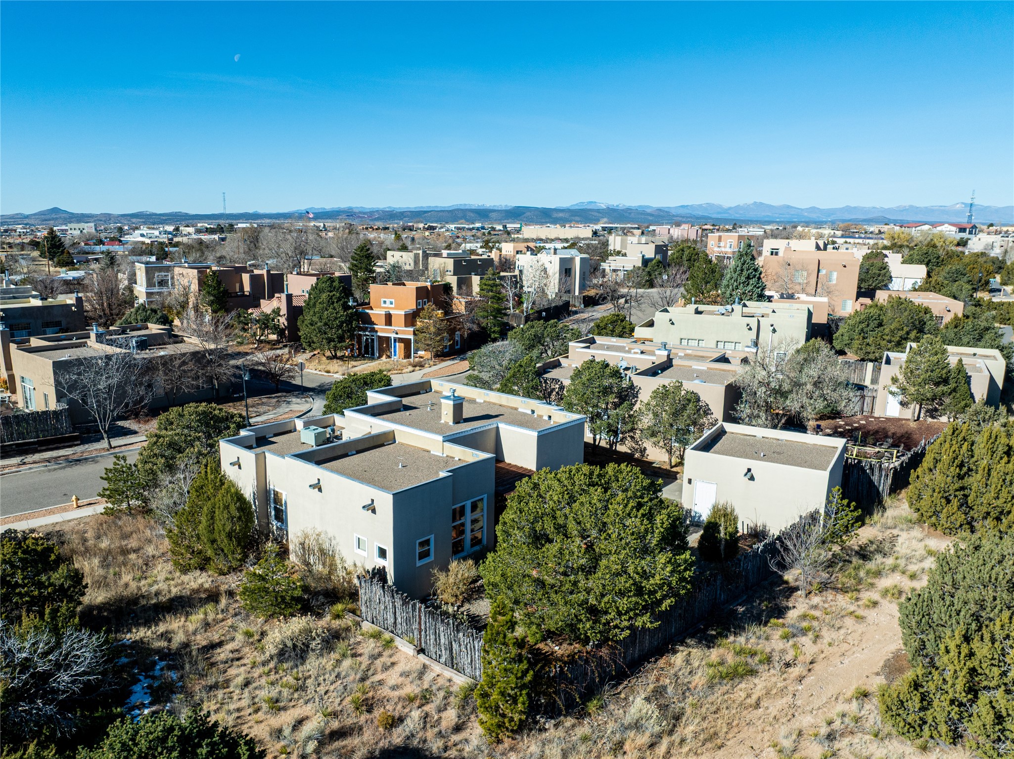 Get ready for this lovely, well cared for single level home in Nava Ade! Sited on a sizeable lot bordered on two sides by green space and adjacent to the walking path, this property features all the interior and exterior comforts that allow for authentic Santa Fe living. Enter its spacious Living Room through a sweet portal. Enjoy high ceilings adorned with wood beams. A decorative wall, which sports a two-sided gas fireplace, separates the Living Room from the oversized open concept Dining Room/Sitting Room. A wall of tall windows with wooden blinds graces this area. Beautiful Saltillo tile flooring adds to the warmth and Southwestern vibe of these rooms. Exit the Living Room through sliders that lead to a charming portal, ideal for outdoor entertaining. The whimsical rear yard provides a delightful retreat year-round! Custom shelving in all bedroom closets, and owner-made tin accents for the home's vertical blinds are thoughtful and creative touches. In addition to miles of walking paths, enjoy the community clubhouse, pool and gym. This much loved, special home will enchant its next lucky owner.