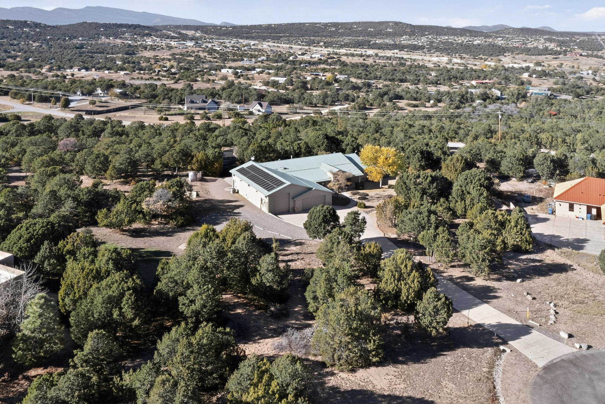 Rare opportunity in Sandia Mountain Ranch for this one-owner, single-level custom beauty on 2 acres, just minutes from Albuquerque. 3634 SF, 3BR + Office, 3 baths and a 2204 finished and insulated garage, workshop and 60' X 17.75' RV garage. The owner spared no expense when building this home - it has so many incredible features. Large cook's kitchen with Kitchen Aid appliances, convection ovens, custom cabinetry with full-extension pull-out drawers, warming drawer, 2 pantries, 3 cm thick granite countertops and a large center island. 3/4'' solid red oak floors in main living areas, dining, halls and bedrooms, natural cork in the kitchen and ceramic tile in wet areas and entry. No carpet in home. Solid wood doors and Eagle thermal, double-paned aluminum clad exterior and wood interior windows throughout.Primary bath features his & hers double sinks, an Aquatic Infinity jetted tub and a large, walk-in/roll-in shower with double showerheads and shower massage units. Large walk-in closets in every bedroom and tons of storage in the entire home. Junior suite with a private bath and walk-in shower.10 kW seller-owned, grid-connected solar power generation system and 18KWh battery backup system makes electric bills non-existent. All new metal Pro-Panel roof and colorguard snow stop system, gutters, downspouts and skylights installed in 2022. High efficiency heating and refrigerated cooling system w/ humidfier, tankless water heaters, and reverse osmosis systems in the kitchen and laundry. Floor warming system under ceramic tile in primary bath, laundry room and garage entry into home. RV garage features 50 amp electrical & water/sewer connection both inside and outside and 12'W x 13'H doors on both ends for easy entrance and exit. Home was thoughtfully designed to be fully handicap accessible. It has been landscaped using Firewise design techniques to create defensible space around the home. Entrances to the property off of both Western Trail Dr. (front) and Sedillo.