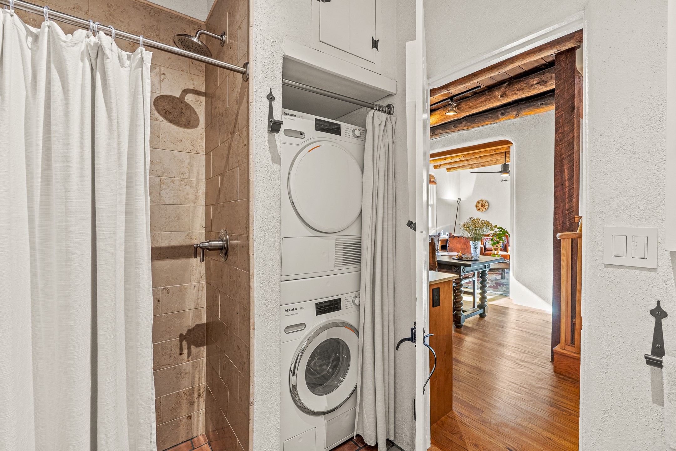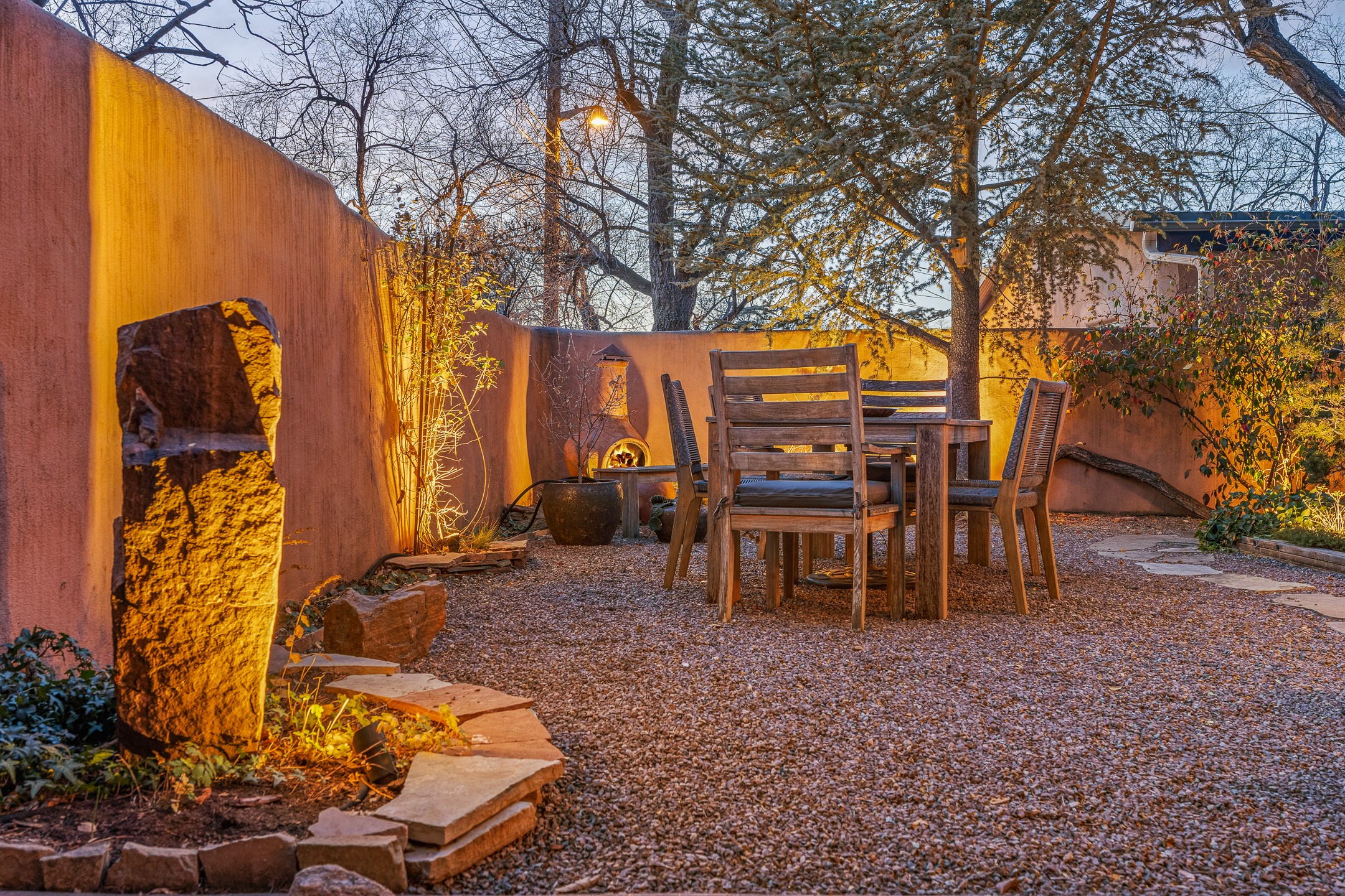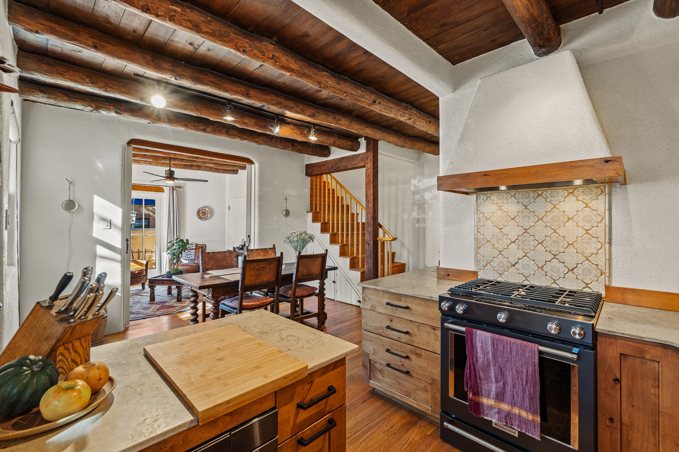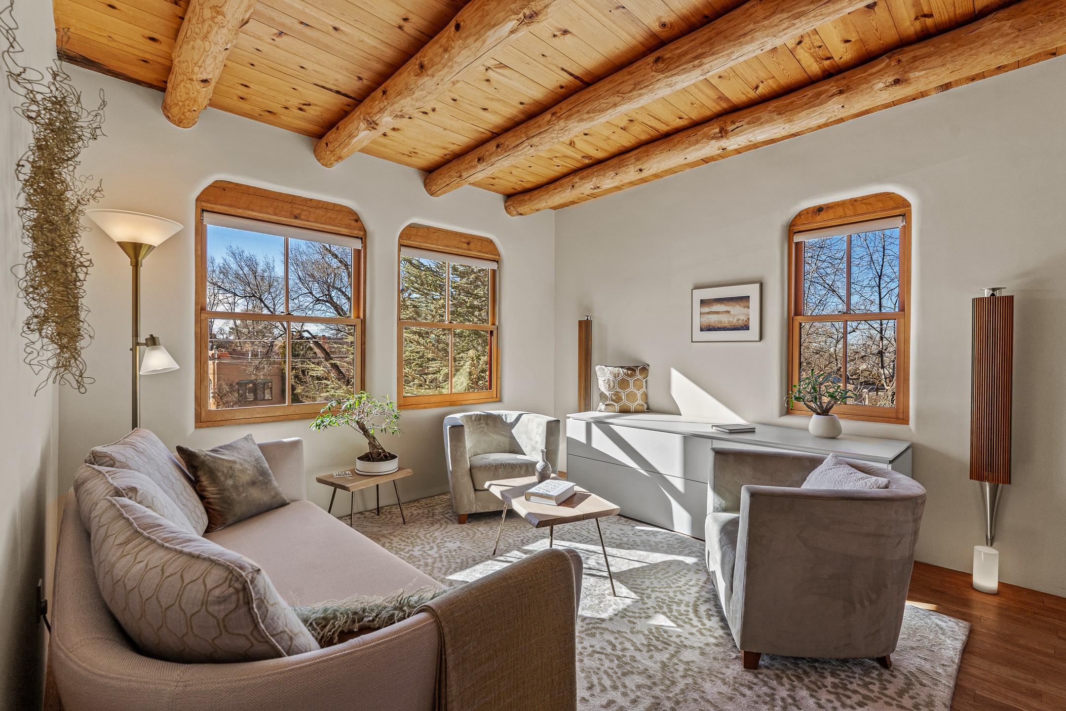 Tucked away on a quiet street in South Capitol, this charming 2-bedroom, 2-bathroom condo has been thoughtfully transformed by Santa Fe Kitchen Design. Every detail of the home reflects quality and craftsmanship with high-end finishes and an integrated design that maximizes style as well as space. The ground level includes the designer kitchen, dining area, a bath with laundry, and a flexible guest bedroom with a walk-in closet which is currently used as an office/sitting room--easily closed off with sliding barn doors. Beautiful hardwood floors run throughout. Upstairs, the sunny living room offers a warm and inviting retreat, perfect for relaxing or entertaining. The primary suite features a stylish built-in desk, a custom walk-in closet, and a beautifully renovated (2025) bathroom complete with a wall-mounted vanity, an onyx vessel sink, Toto wall-mounted toilet, floor-to-ceiling tiled walk-in shower, and radiant heat flooring. Solar panels, installed in 2023 and backed by a 20-year warranty, enhance energy efficiency and sustainability, while a curbside EV outlet is pre-wired for convenient electric vehicle charging. Comfort is ensured year-round with mini-split heating and cooling in all open-concept living areas on both floors, supplemented by electric space heaters in other areas, as well as a stylish gas heater as a back-up heat source. Located just minutes from downtown Santa Fe, this home is a rare opportunity to own a turnkey, design-forward residence in one of the city's most beloved neighborhoods.