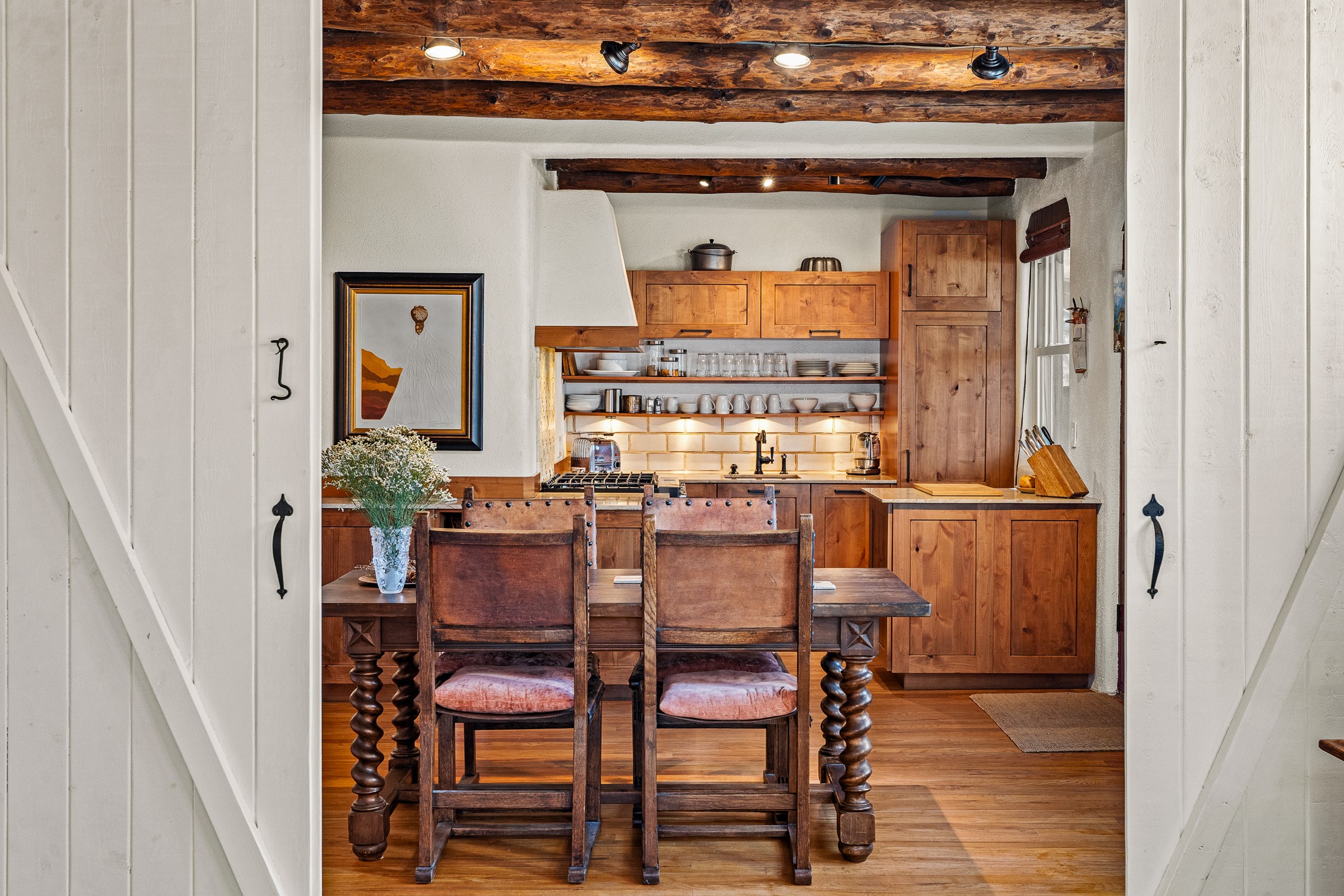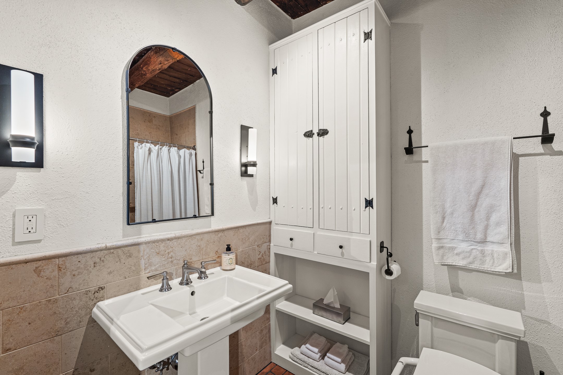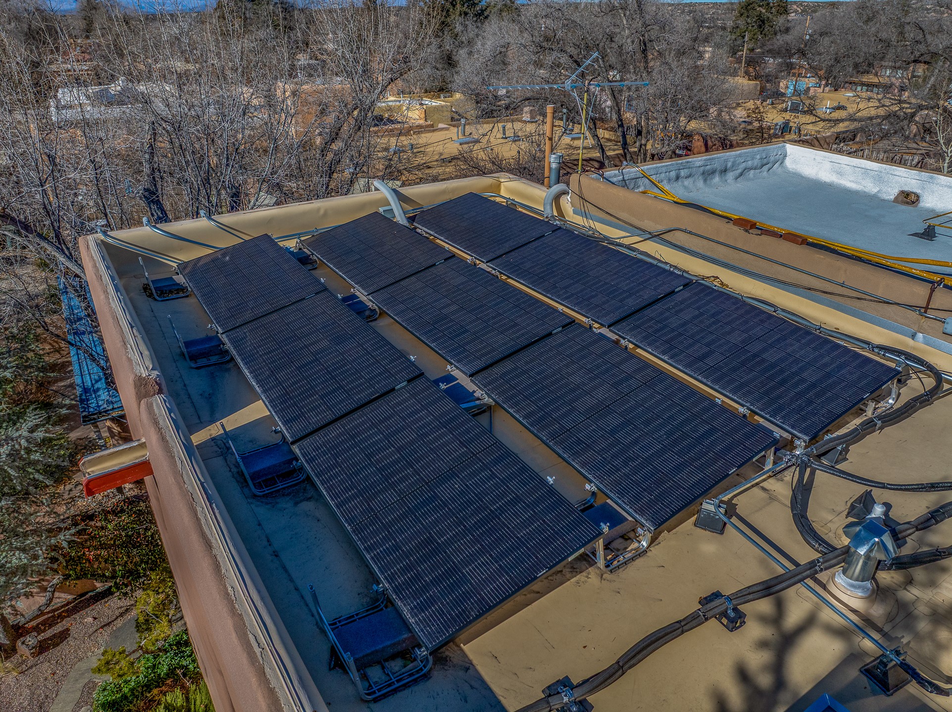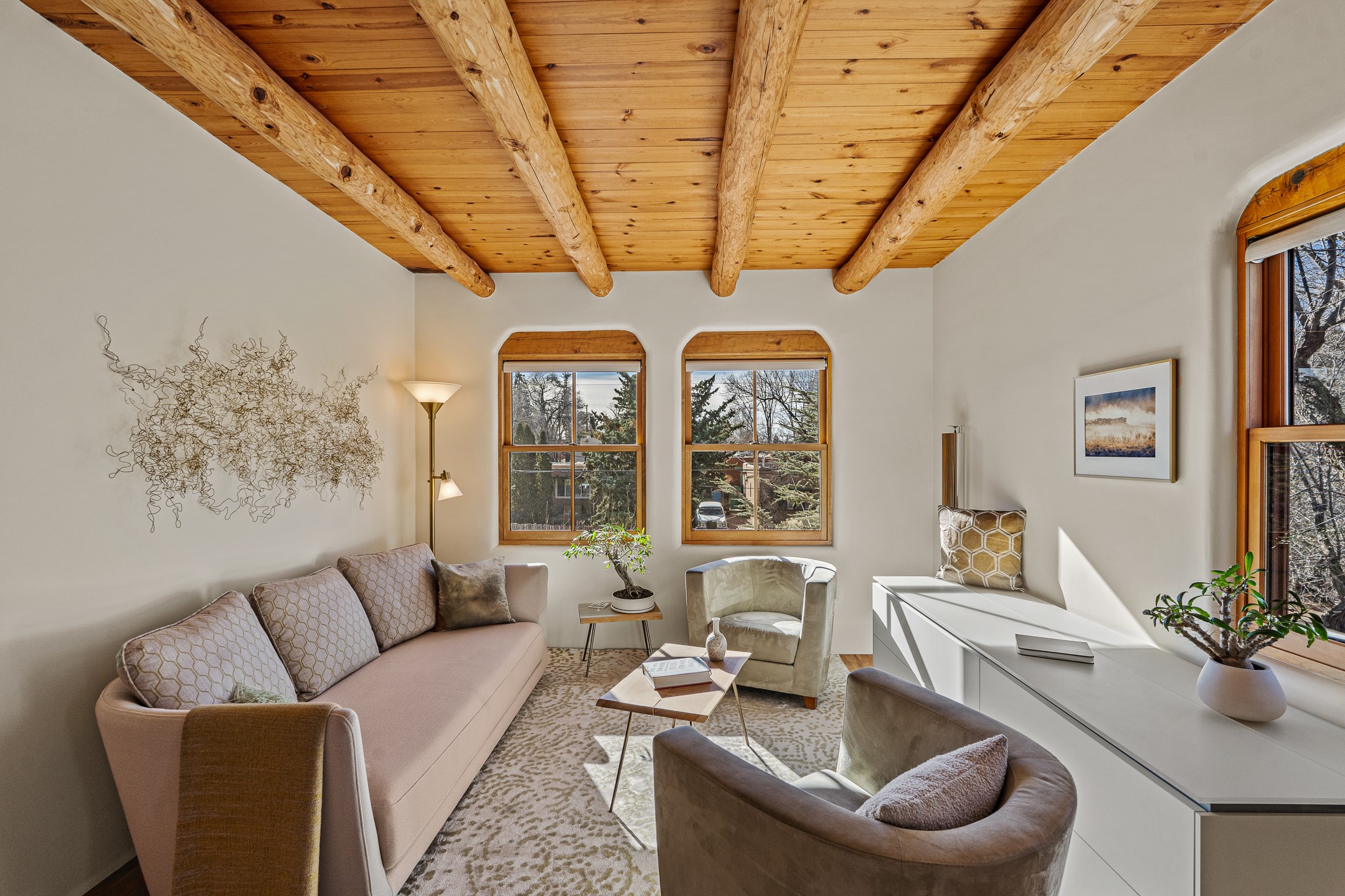 Tucked away on a quiet street in South Capitol, this charming 2-bedroom, 2-bathroom condo has been thoughtfully transformed by Santa Fe Kitchen Design. Every detail of the home reflects quality and craftsmanship with high-end finishes and an integrated design that maximizes style as well as space. The ground level includes the designer kitchen, dining area, a bath with laundry, and a flexible guest bedroom with a walk-in closet which is currently used as an office/sitting room--easily closed off with sliding barn doors. Beautiful hardwood floors run throughout. Upstairs, the sunny living room offers a warm and inviting retreat, perfect for relaxing or entertaining. The primary suite features a stylish built-in desk, a custom walk-in closet, and a beautifully renovated (2025) bathroom complete with a wall-mounted vanity, an onyx vessel sink, Toto wall-mounted toilet, floor-to-ceiling tiled walk-in shower, and radiant heat flooring. Solar panels, installed in 2023 and backed by a 20-year warranty, enhance energy efficiency and sustainability, while a curbside EV outlet is pre-wired for convenient electric vehicle charging. Comfort is ensured year-round with mini-split heating and cooling in all open-concept living areas on both floors, supplemented by electric space heaters in other areas, as well as a stylish gas heater as a back-up heat source. Located just minutes from downtown Santa Fe, this home is a rare opportunity to own a turnkey, design-forward residence in one of the city's most beloved neighborhoods.