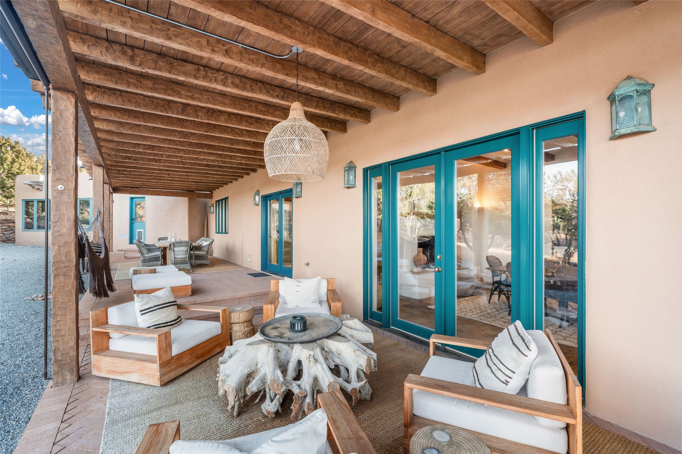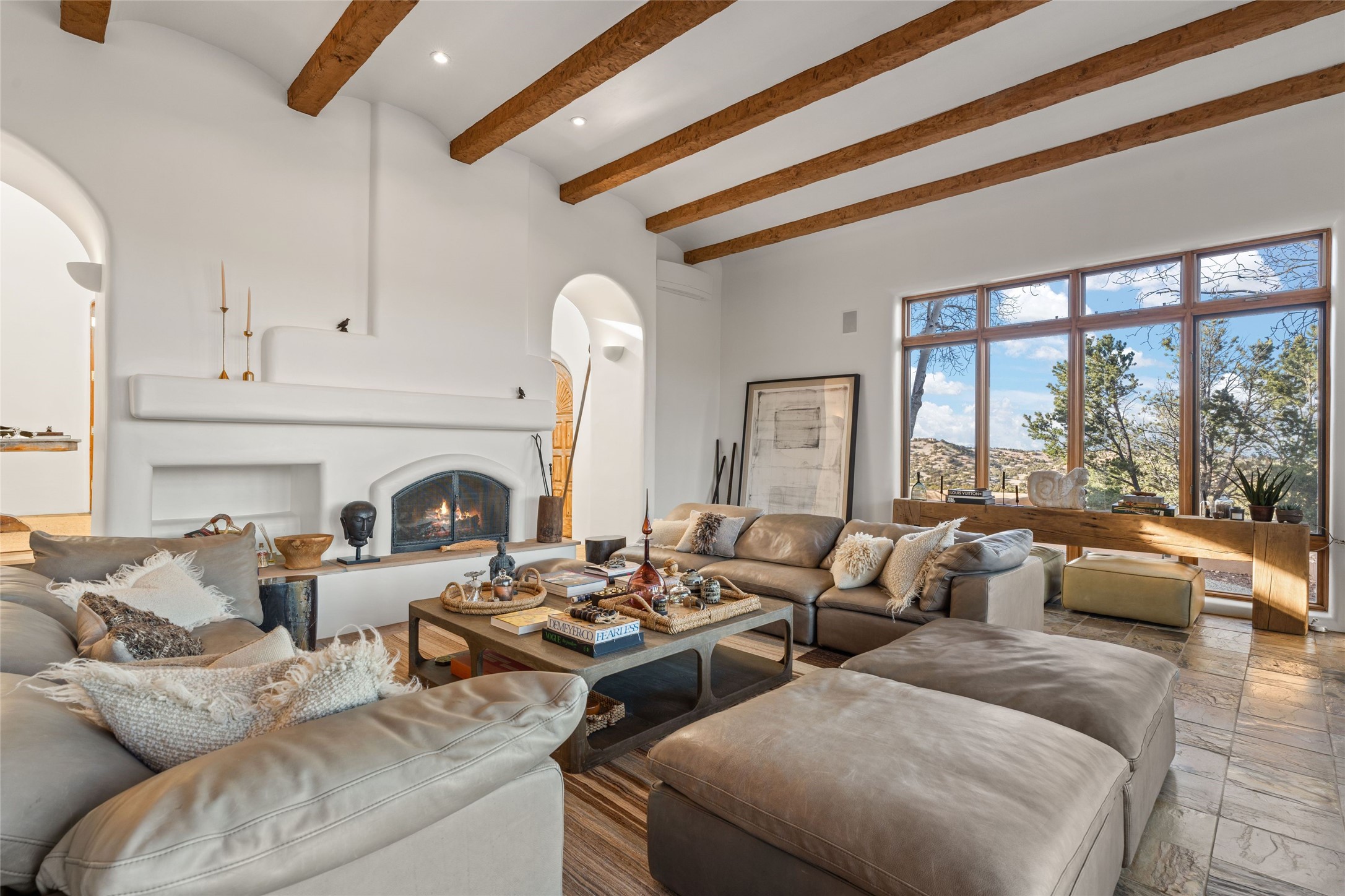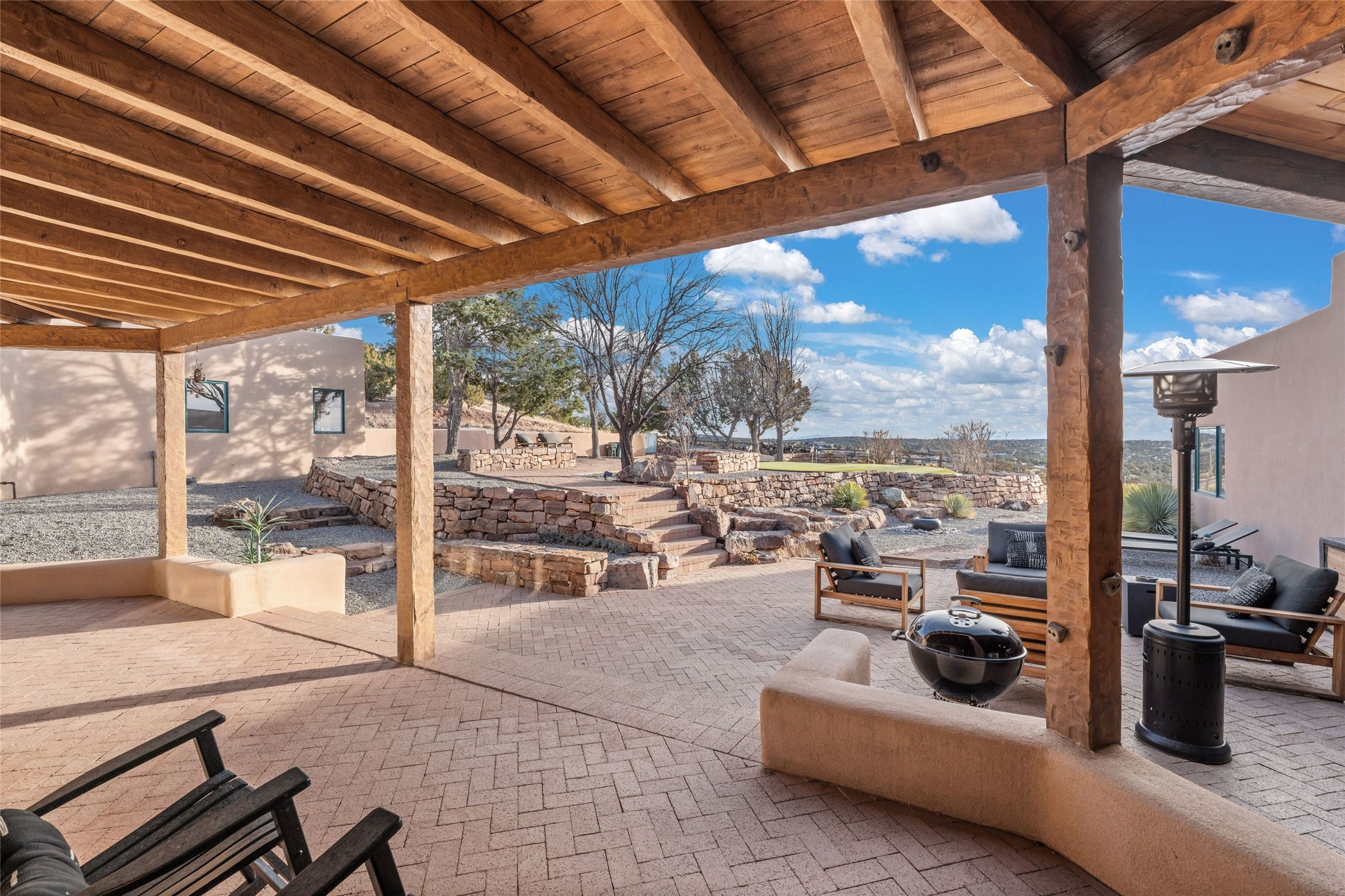 Remarkable 3-bedroom, 4.5-bath luxury retreat set on nearly 12 acres in the desirable La Tierra community. This stunning property offers breathtaking views and a unique 6-hole putting green, making it a golfer's paradise right in your backyard. Diamond plaster walls, vigas and beams, and expansive brick-lined portals add character. Enter through carved wood doors and be greeted by a grand foyer that seamlessly flows into an open-concept living space. Living and dining areas are adorned with soaring 12-ft. ceilings, large-scale windows, and French doors that invite natural light and the beauty of the outdoors into your home. Gourmet kitchen features high-end appliances, a center island with 6-burner cooktop, and a stylish bar area complete with a wine cooler. Retreat to the primary suite, which includes sitting area, fireplace, and a luxurious bath with divided 2 vanities and sinks, 2 water closets, and 2 walk-in closets for ample storage. A versatile studio/media room offers flex space as a 4th bedroom complete with a bathroom with shower. 3-car garage and an extra 10,000-gallon water storage tank. Recent upgrades such as solar photovoltaic electric, 2 new water heaters, window screens, motorized awnings in the living and dining rooms, and all new skylights enhance the home's efficiency. Enjoy awe-inspiring sunset views that will take your breath away, all while being conveniently located just 10-15 minutes from the Santa Fe Plaza, Ten Thousand Waves, and the Santa Fe Opera.