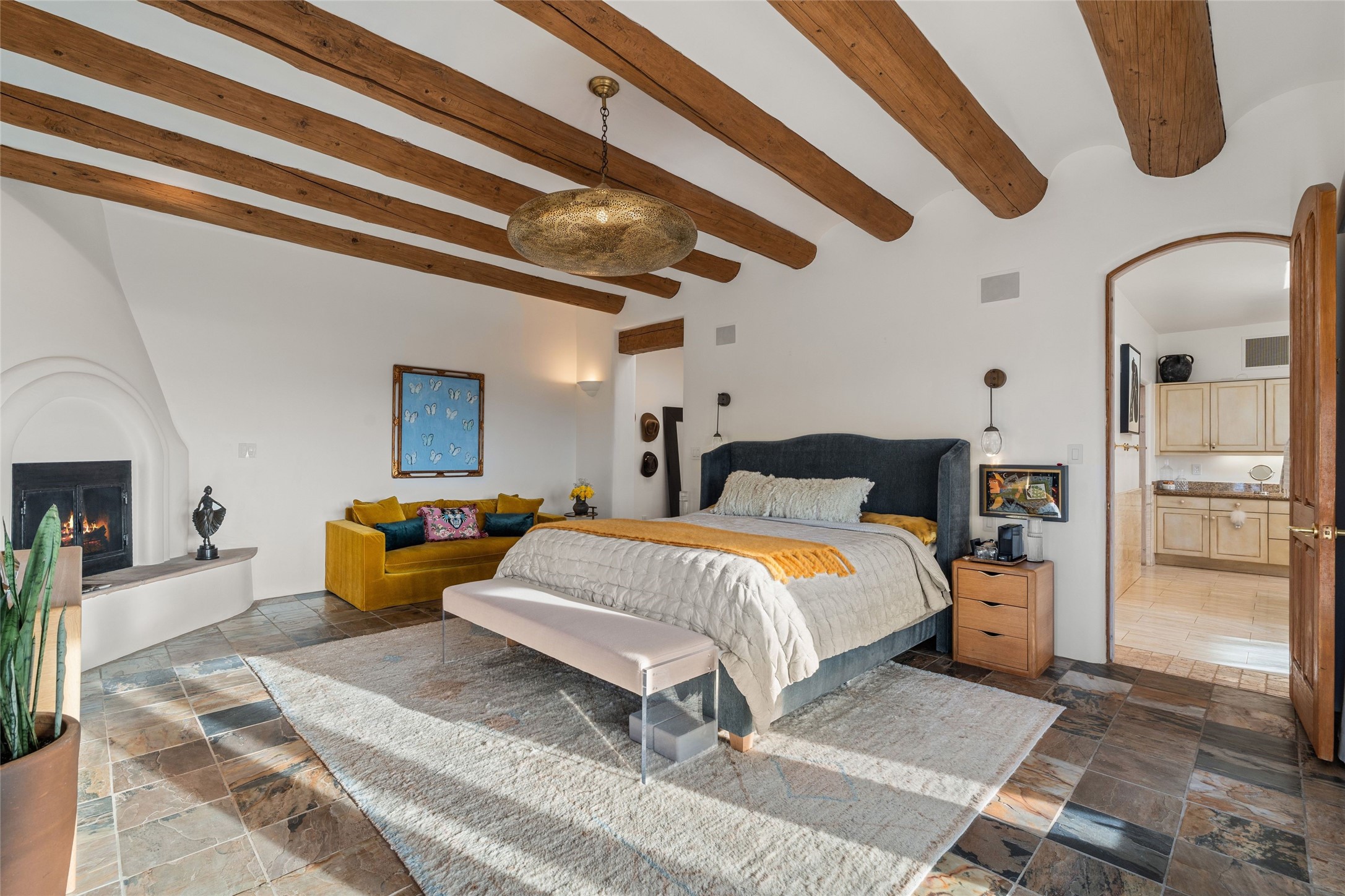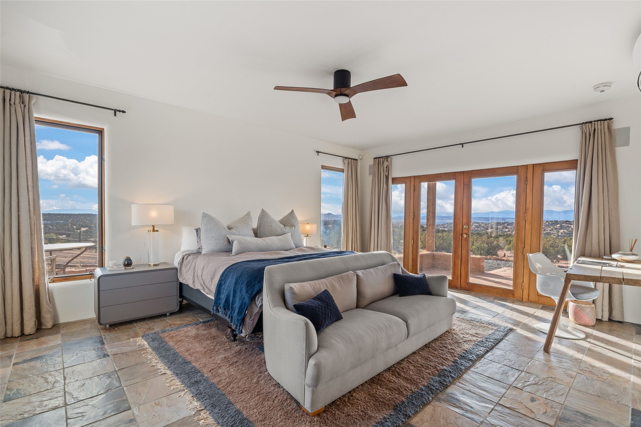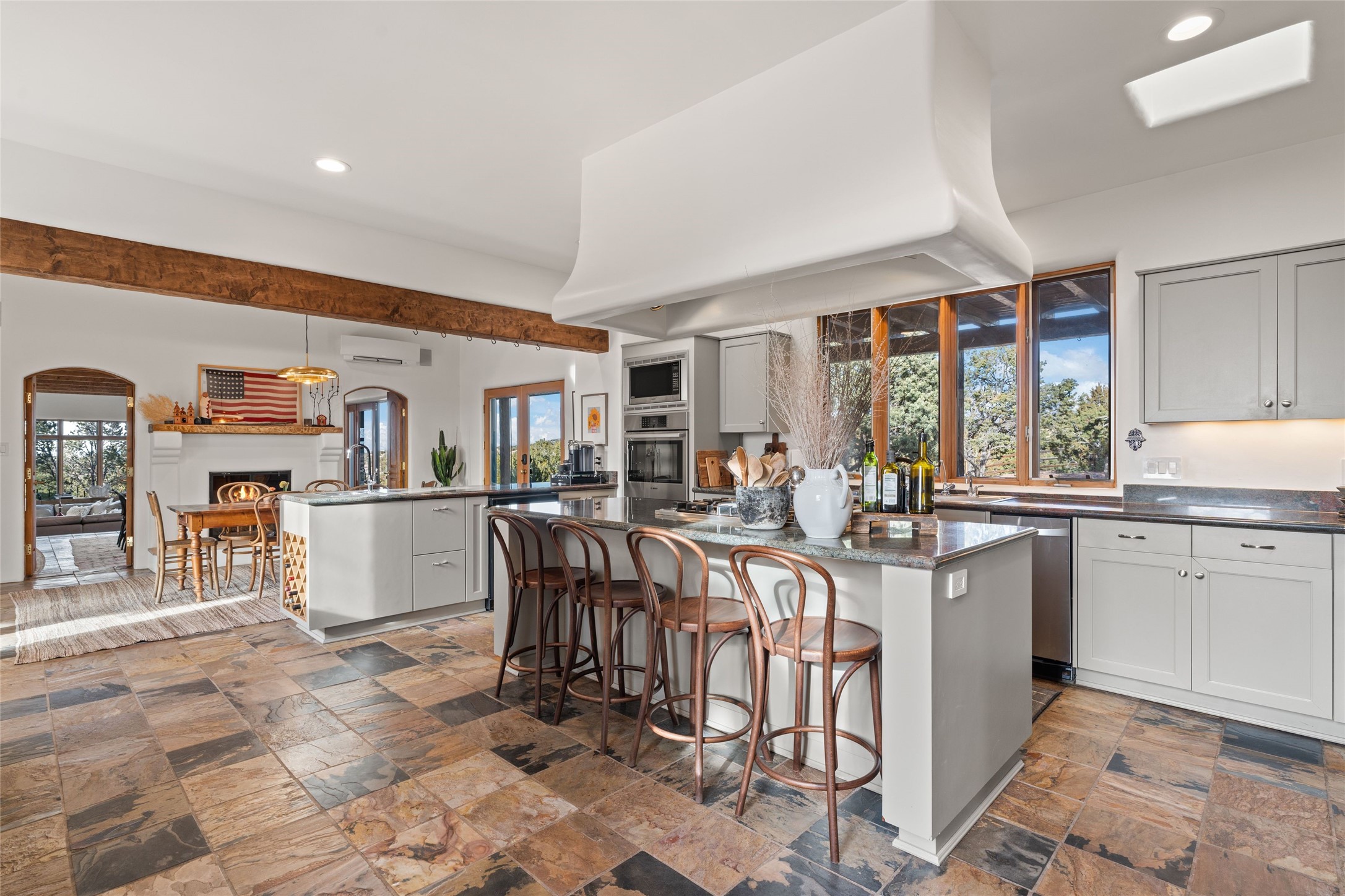 Remarkable 3-bedroom, 4.5-bath luxury retreat set on nearly 12 acres in the desirable La Tierra community. This stunning property offers breathtaking views and a unique 6-hole putting green, making it a golfer's paradise right in your backyard. Diamond plaster walls, vigas and beams, and expansive brick-lined portals add character. Enter through carved wood doors and be greeted by a grand foyer that seamlessly flows into an open-concept living space. Living and dining areas are adorned with soaring 12-ft. ceilings, large-scale windows, and French doors that invite natural light and the beauty of the outdoors into your home. Gourmet kitchen features high-end appliances, a center island with 6-burner cooktop, and a stylish bar area complete with a wine cooler. Retreat to the primary suite, which includes sitting area, fireplace, and a luxurious bath with divided 2 vanities and sinks, 2 water closets, and 2 walk-in closets for ample storage. A versatile studio/media room offers flex space as a 4th bedroom complete with a bathroom with shower. 3-car garage and an extra 10,000-gallon water storage tank. Recent upgrades such as solar photovoltaic electric, 2 new water heaters, window screens, motorized awnings in the living and dining rooms, and all new skylights enhance the home's efficiency. Enjoy awe-inspiring sunset views that will take your breath away, all while being conveniently located just 10-15 minutes from the Santa Fe Plaza, Ten Thousand Waves, and the Santa Fe Opera.