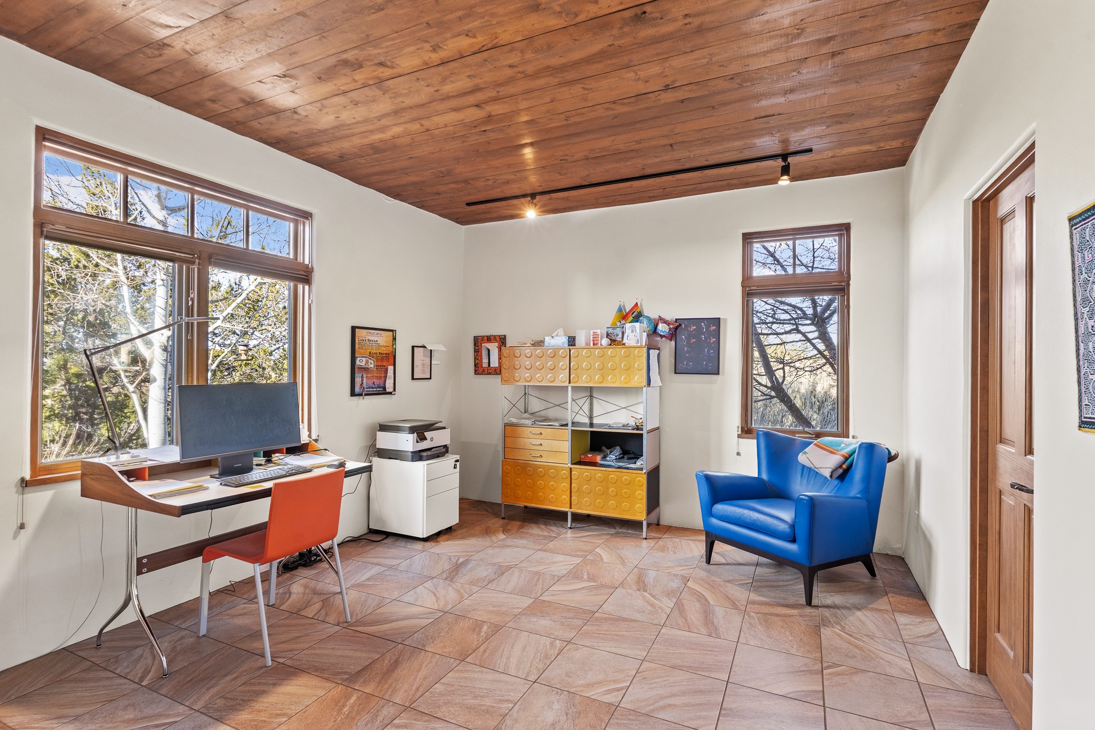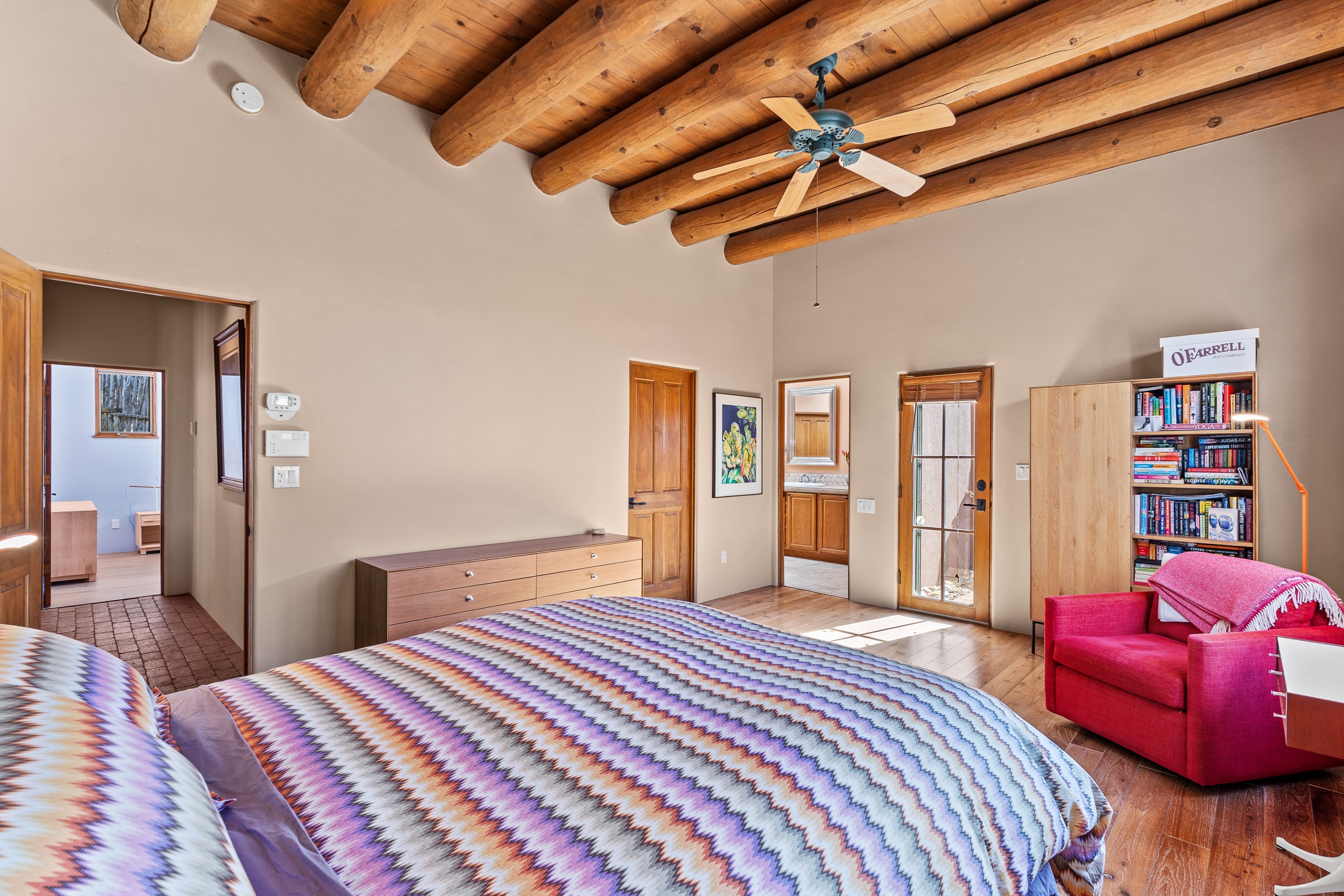 An exquisite hilltop residence located in Northwest Santa Fe on over 3.22 acres captures panoramic Sandia and Ortiz Mountain views from an expansive South and West facing portal. Abundant natural light fills the home with open living and dining, highlighting classic Santa Fe architectural details with viga beams, soaring wood ceilings, brick floors, and a welcoming kiva fireplace. The thoughtfully designed layout offers separation and privacy.The spacious primary suite, situated on the East side of the home, provides a tranquil escape and opens to a charming, courtyard, perfect for morning coffee. The ensuite bath features a walk-in shower and a jetted soaking tub. A guest bedroom is located on this wing along with a full bathroom. Beautiful walnut wood flooring is in both the primary suite and guest bedroom. The generous kitchen is designed for gathering, offering granite countertops, a central island with bar seating, and abundant workspace. On the West end of the home, a relaxed secondary living area, adds flexibility leading to an additional full bath. A bright office/studio provides an ideal space for work, your creative pursuits, or as a bedroom. Private, serene, and surrounded by natural beauty, this inviting property captures the essence of exceptional Santa Fe living with access to the La Tierra Trails and a short drive into downtown Santa Fe. The property includes a 2024 roof with transferrable warranty and new stucco in 2026.