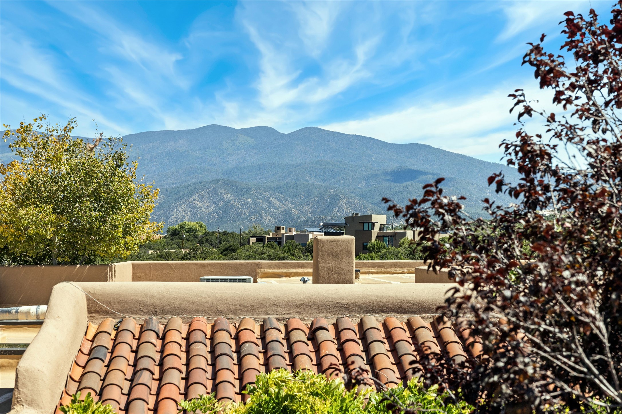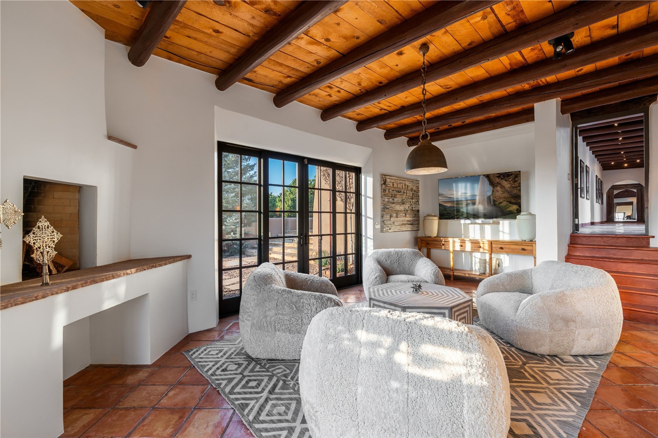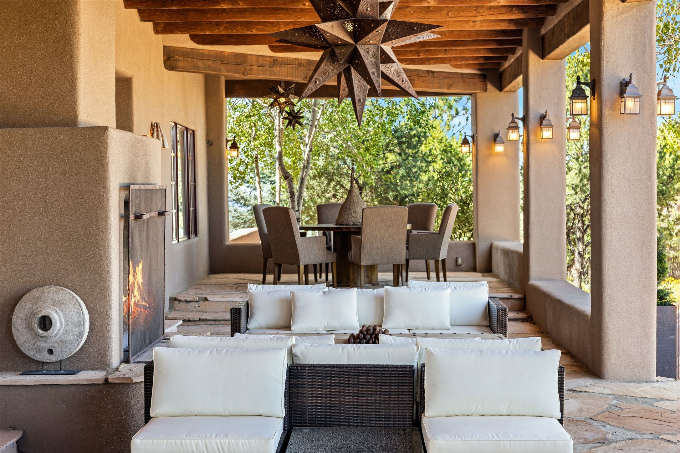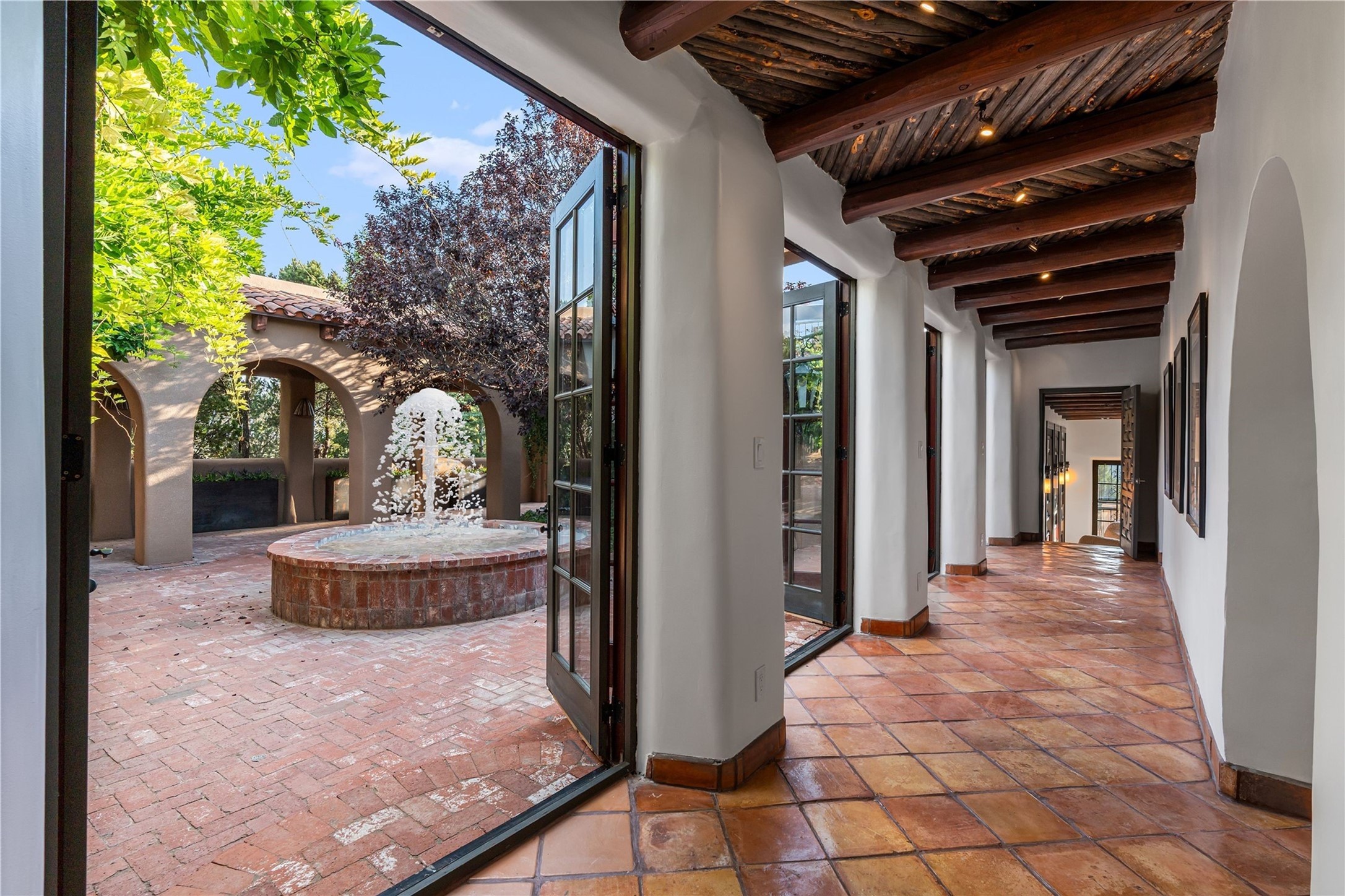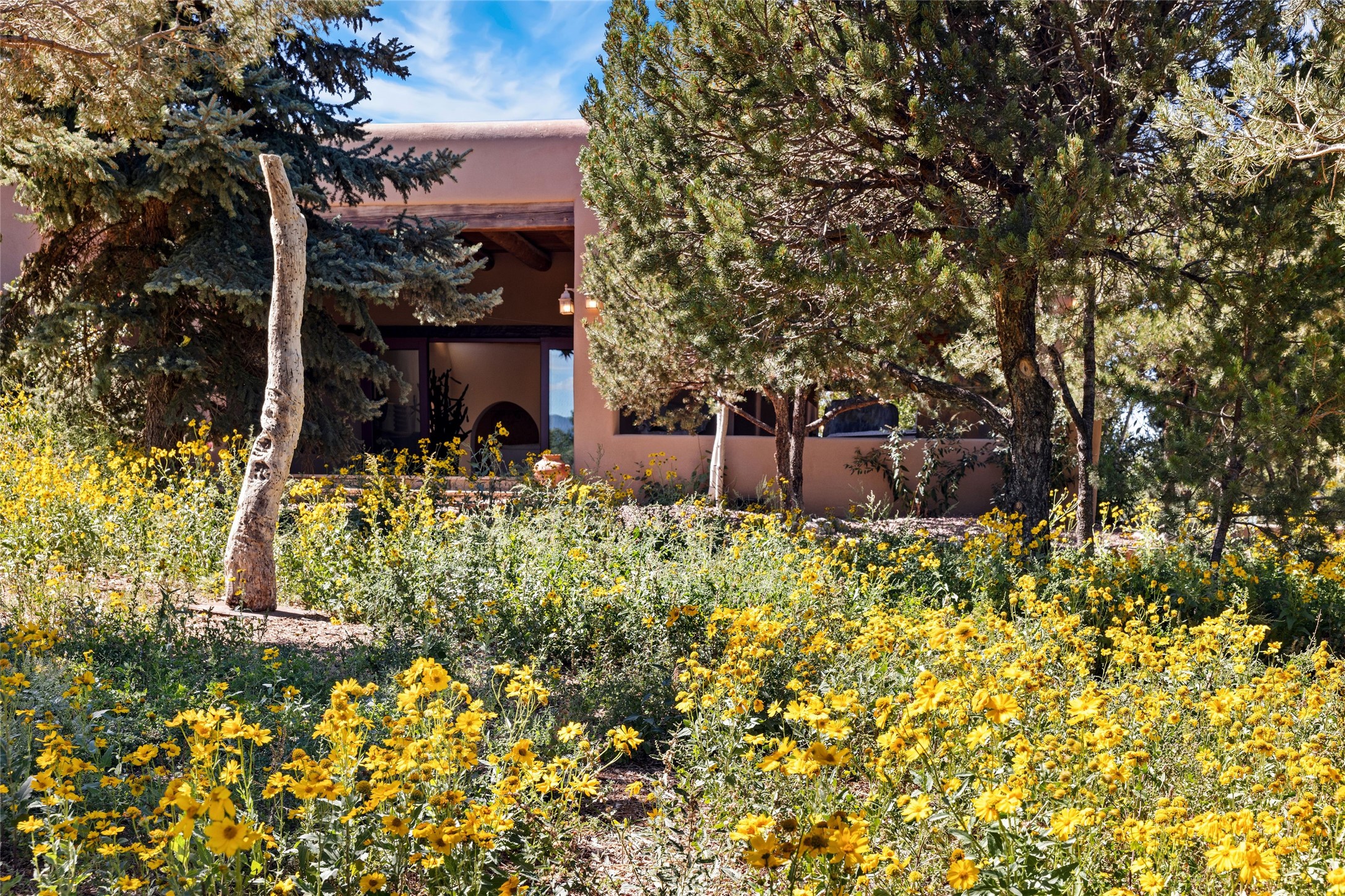 Have you dreamed of living in a true, classic Santa Fe Style Buzz Bainbridge ADOBE Hacienda? (If you know his work you have!) This 5 bedroom/7 bath masterpiece has had a facelift and is now totally reimagined with an updated floor plan and fresh new ambiance while honoring the great Bainbridge bones; extravagant ceiling finishes, generous rooms, thoughtful infrastructure and 30" DOUBLE ADOBE walls. Glamorous yet livable, this rambling estate with gorgeous architecture on 2.5 private, wooded view acres offers spectacular entertaining amid smashing mountain views and total, gated privacy! It has been home to many a sunset fiesta, Town & Country brunch, jaw dropping wedding, plus noteworthy spectacular parties. Brilliantly conceived by the legendary master builder Buzz Bainbridge this is the entertainers ultimate dream inside and out with oversized rooms, breezy wrap around covered flagstone portals with magnificent mountain views, romantic courtyards, airy patios out nearly every room, amid lush gardens, pinons and lofty aspen. Fireplaces inside and out-7 of them! The central, custom, chef's kitchen is efficient and stylish with Wolf and Sub-Zero appliances and custom cabinetry by Jonathan Boyd. The sumptuous primary suite is a hedonist's dream - with Sangre de Cristo views from your bed, and bathtub in the palatial new marble master bath. There are 4 large, comfortable guest suites as well, each with new bath; plus an impressive library/ media room and a third cozy central sitting room. Located on prestigious Calle San Martin, it is 7-10 minutes to downtown. No HOA. Nice neighbors. Fabulous property! This Hacienda has it all!