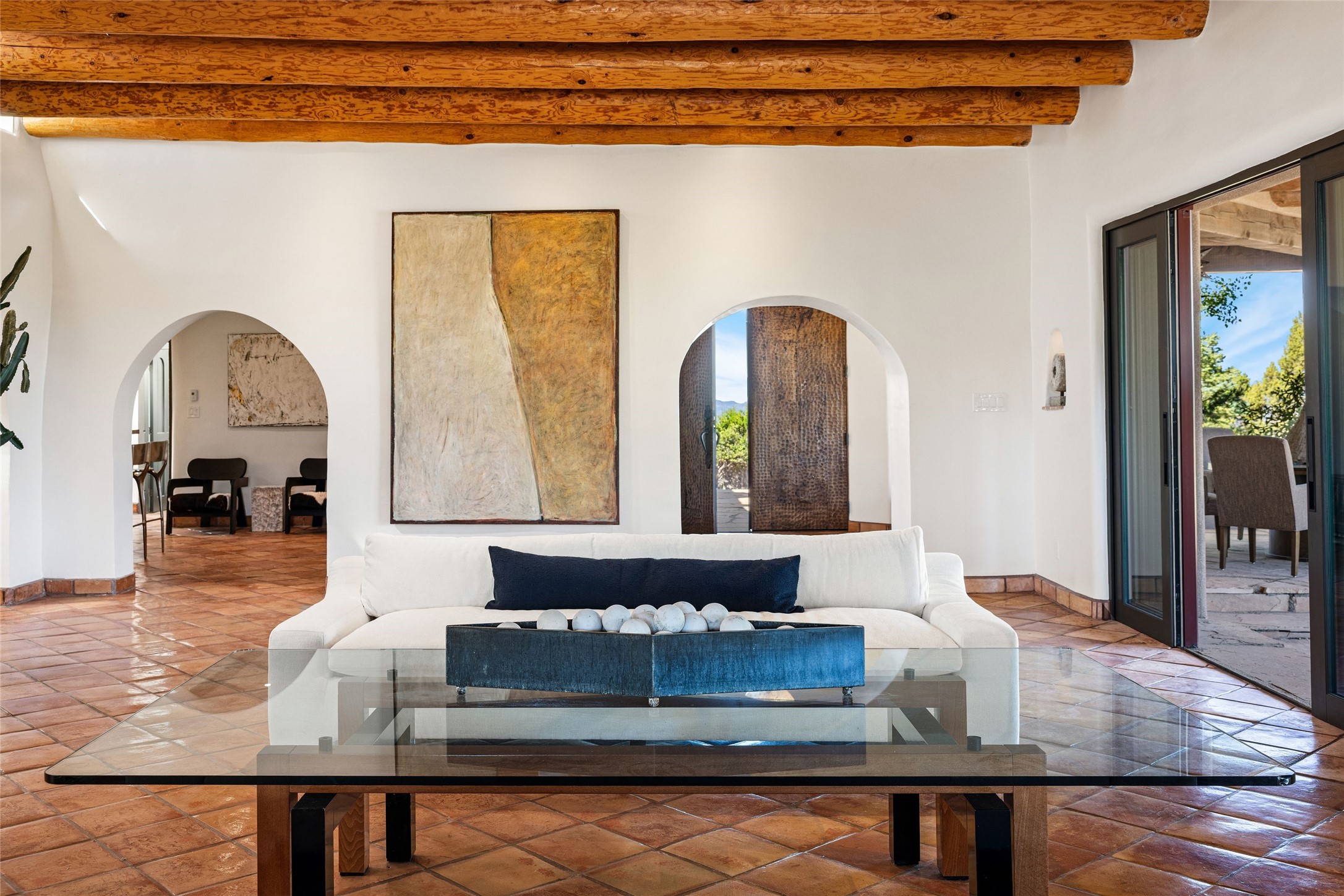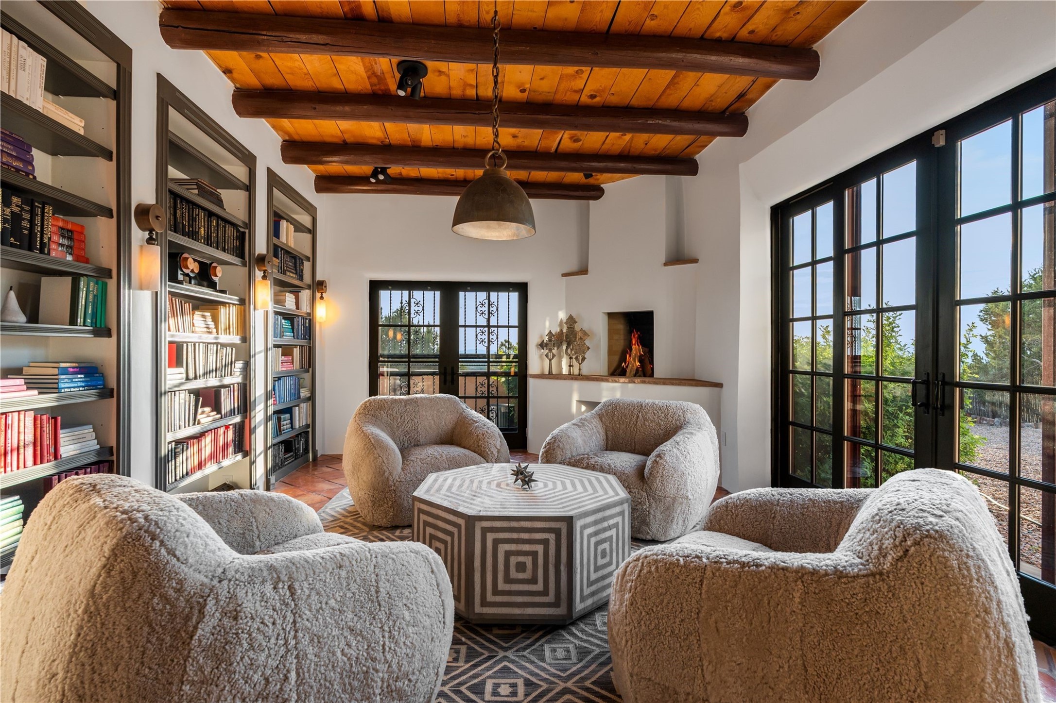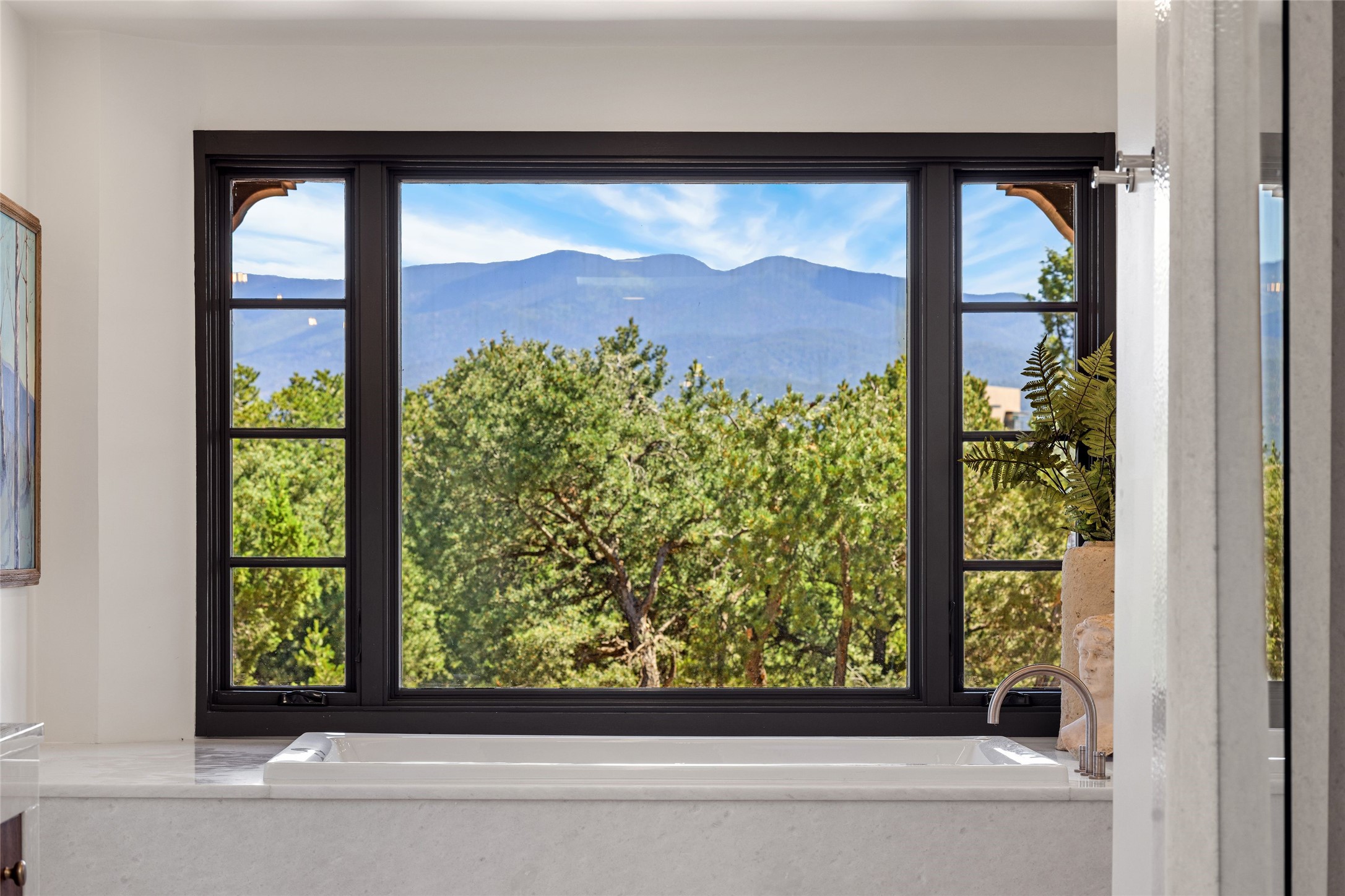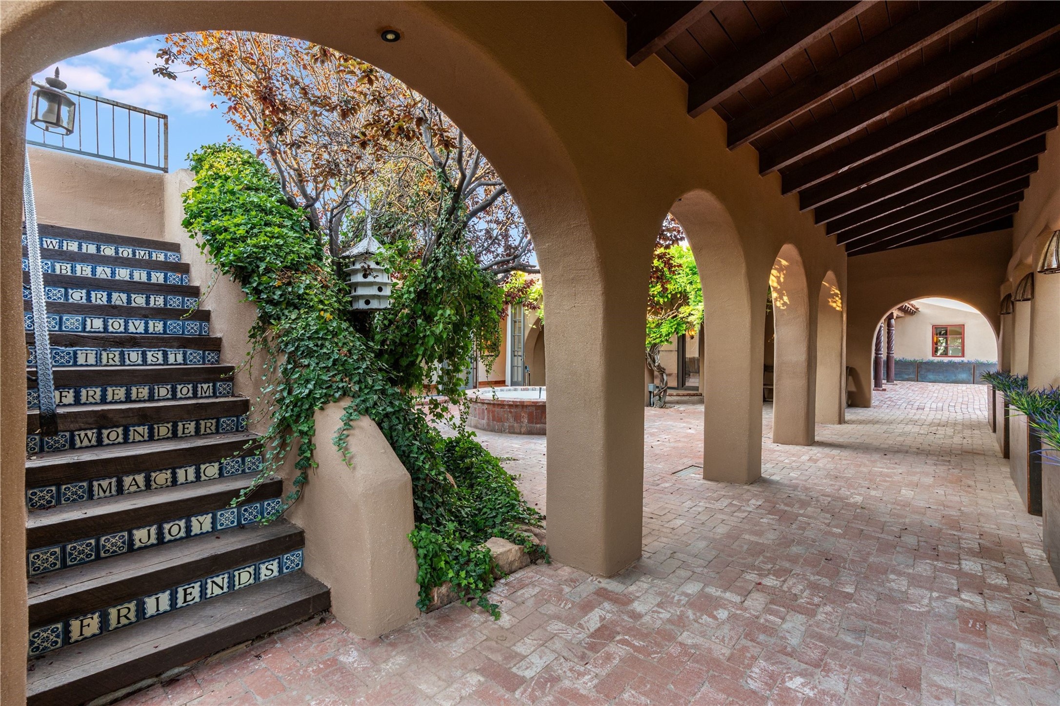 Have you dreamed of living in a true, classic Santa Fe Style Buzz Bainbridge ADOBE Hacienda? (If you know his work you have!) This 5 bedroom/7 bath masterpiece has had a facelift and is now totally reimagined with an updated floor plan and fresh new ambiance while honoring the great Bainbridge bones; extravagant ceiling finishes, generous rooms, thoughtful infrastructure and 30" DOUBLE ADOBE walls. Glamorous yet livable, this rambling estate with gorgeous architecture on 2.5 private, wooded view acres offers spectacular entertaining amid smashing mountain views and total, gated privacy! It has been home to many a sunset fiesta, Town & Country brunch, jaw dropping wedding, plus noteworthy spectacular parties. Brilliantly conceived by the legendary master builder Buzz Bainbridge this is the entertainers ultimate dream inside and out with oversized rooms, breezy wrap around covered flagstone portals with magnificent mountain views, romantic courtyards, airy patios out nearly every room, amid lush gardens, pinons and lofty aspen. Fireplaces inside and out-7 of them! The central, custom, chef's kitchen is efficient and stylish with Wolf and Sub-Zero appliances and custom cabinetry by Jonathan Boyd. The sumptuous primary suite is a hedonist's dream - with Sangre de Cristo views from your bed, and bathtub in the palatial new marble master bath. There are 4 large, comfortable guest suites as well, each with new bath; plus an impressive library/ media room and a third cozy central sitting room. Located on prestigious Calle San Martin, it is 7-10 minutes to downtown. No HOA. Nice neighbors. Fabulous property! This Hacienda has it all!