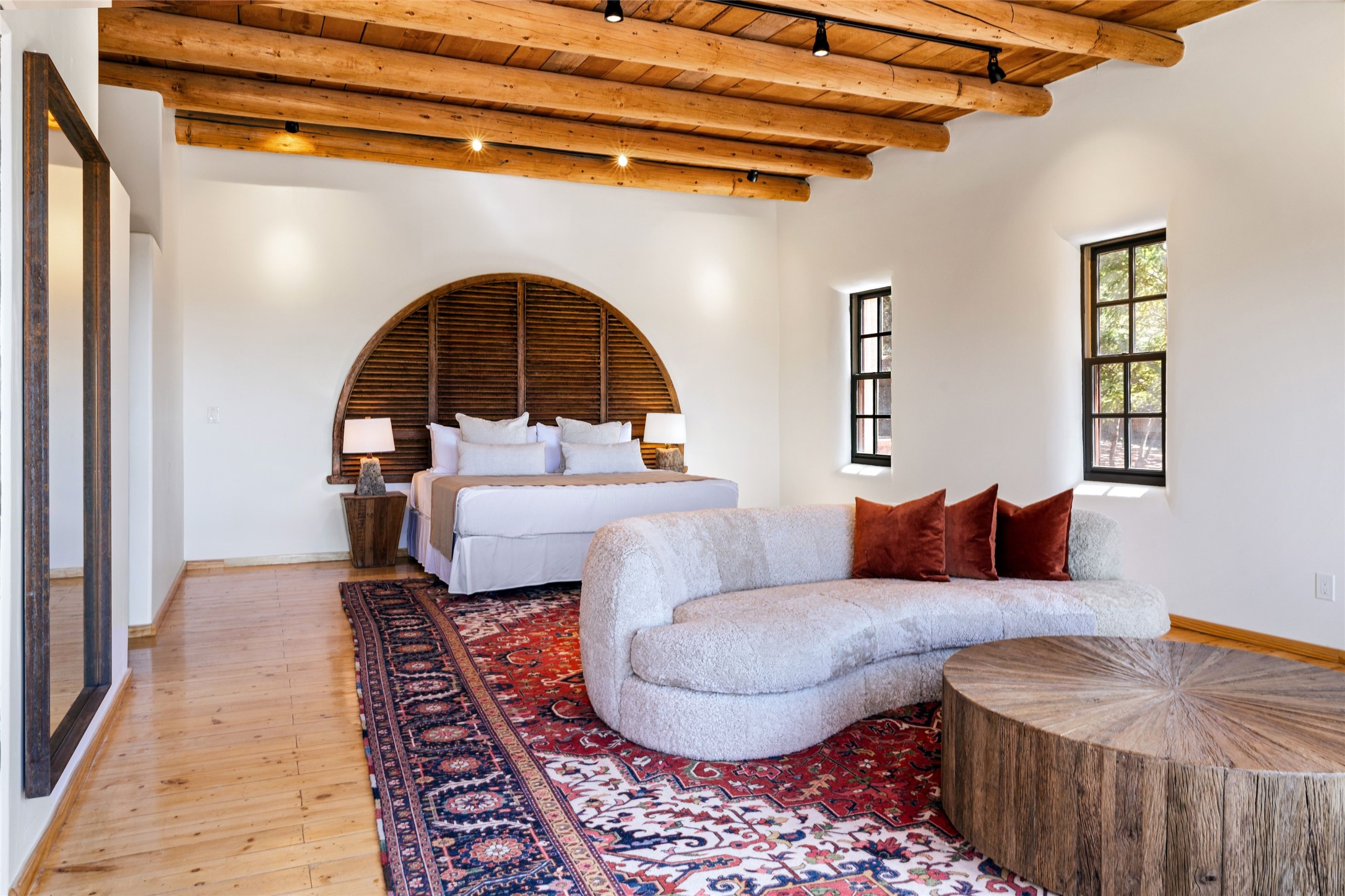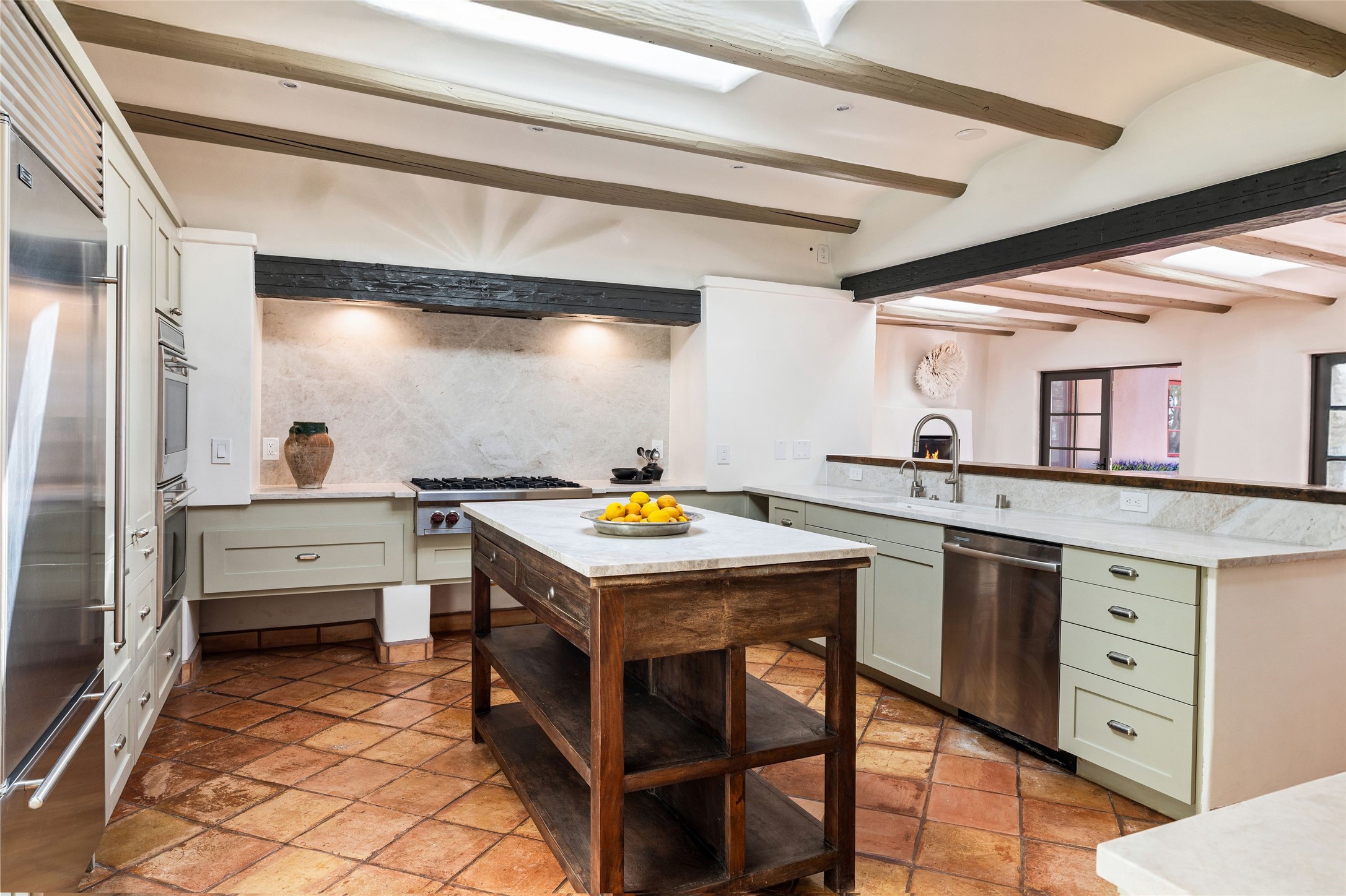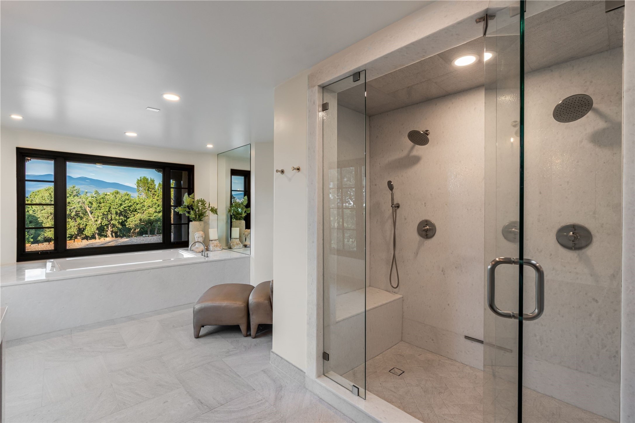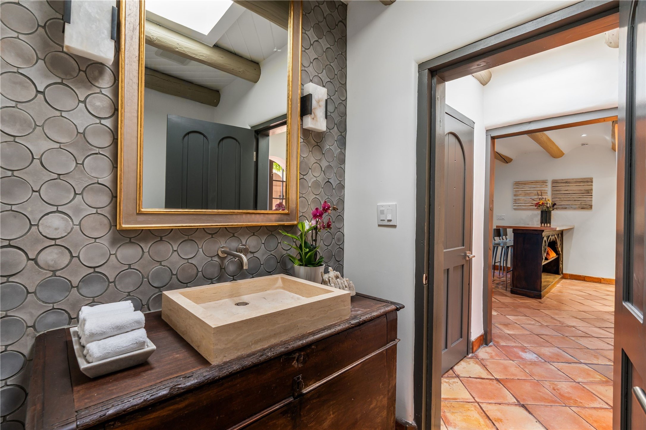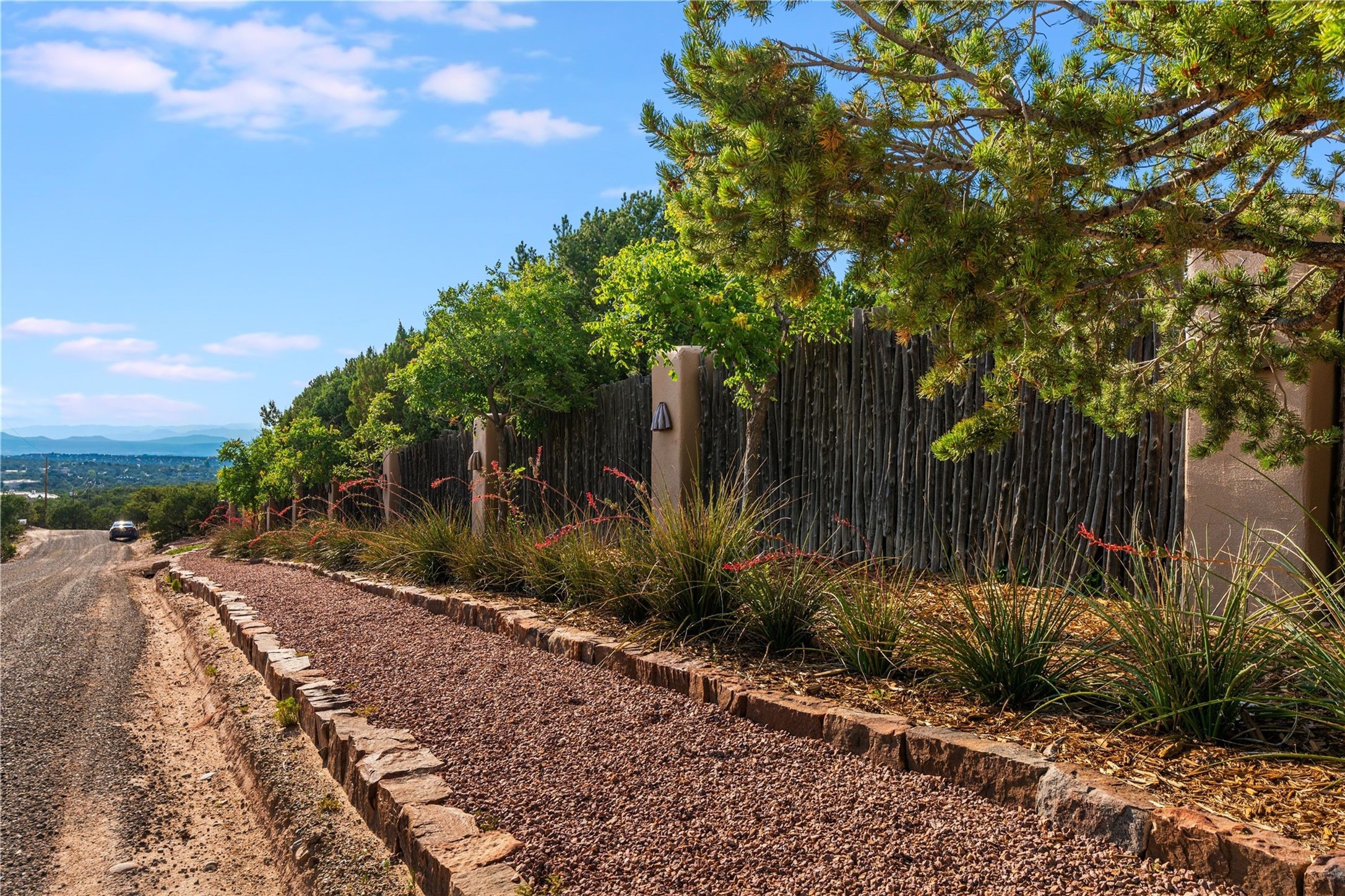 Have you dreamed of living in a true, classic Santa Fe Style Buzz Bainbridge ADOBE Hacienda? (If you know his work you have!) This 5 bedroom/7 bath masterpiece has had a facelift and is now totally reimagined with an updated floor plan and fresh new ambiance while honoring the great Bainbridge bones; extravagant ceiling finishes, generous rooms, thoughtful infrastructure and 30" DOUBLE ADOBE walls. Glamorous yet livable, this rambling estate with gorgeous architecture on 2.5 private, wooded view acres offers spectacular entertaining amid smashing mountain views and total, gated privacy! It has been home to many a sunset fiesta, Town & Country brunch, jaw dropping wedding, plus noteworthy spectacular parties. Brilliantly conceived by the legendary master builder Buzz Bainbridge this is the entertainers ultimate dream inside and out with oversized rooms, breezy wrap around covered flagstone portals with magnificent mountain views, romantic courtyards, airy patios out nearly every room, amid lush gardens, pinons and lofty aspen. Fireplaces inside and out-7 of them! The central, custom, chef's kitchen is efficient and stylish with Wolf and Sub-Zero appliances and custom cabinetry by Jonathan Boyd. The sumptuous primary suite is a hedonist's dream - with Sangre de Cristo views from your bed, and bathtub in the palatial new marble master bath. There are 4 large, comfortable guest suites as well, each with new bath; plus an impressive library/ media room and a third cozy central sitting room. Located on prestigious Calle San Martin, it is 7-10 minutes to downtown. No HOA. Nice neighbors. Fabulous property! This Hacienda has it all!