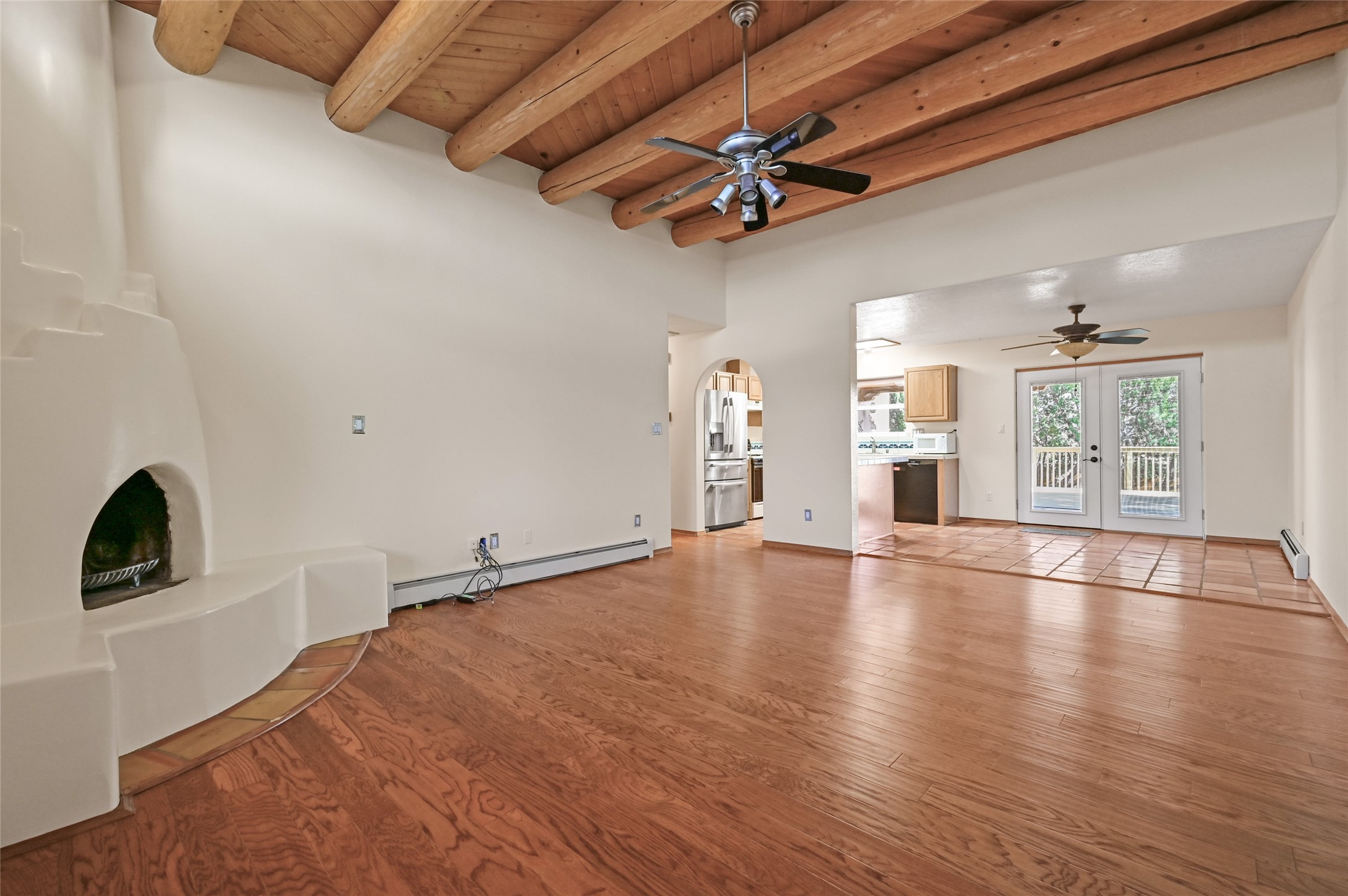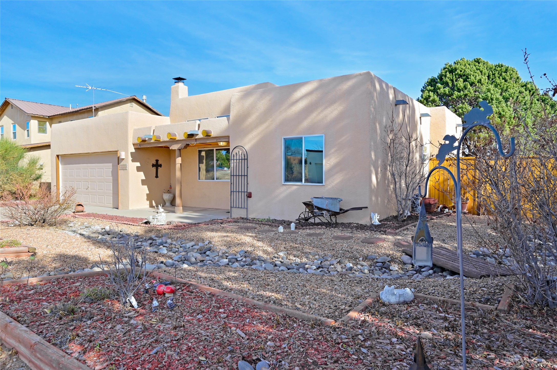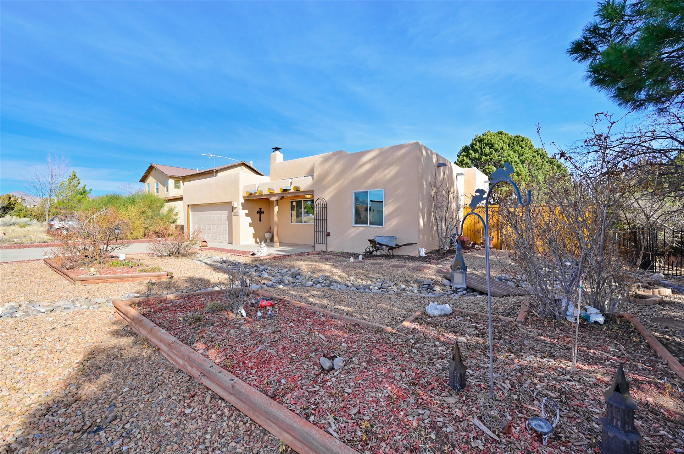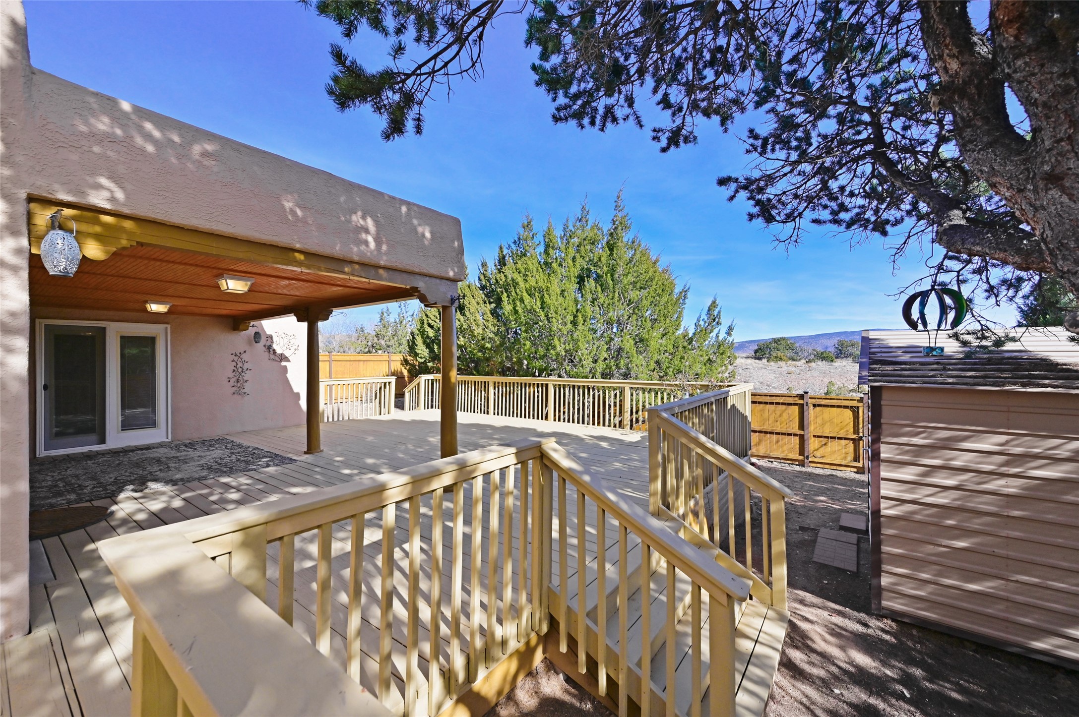 Southwestern Charm Near Cochiti Lake. Discover the perfect blend of tradition and comfort in this lovely 3-bedroom, 2-bathroom home located near the high end of Cochiti Lake on Vooscane Avenue. From the mature, thoughtfully landscaped front yard to the classic covered portal entry, this residence exudes authentic New Mexico character.Inside, the Great Room makes a dramatic impression with soaring ceilings adorned with traditional vigas and herringbone decking. At the heart of the home sits a sculpted Kiva fireplace, offering a warm and inviting focal point. The flooring is a beautiful mix of classic Saltillo tile and rich, engineered hardwood, providing a timeless aesthetic that is as durable as it is stylish.The kitchen and bathrooms carry the theme with classic NM tile motifs and ample oak cabinetry, while the kitchen is updated with a sleek stainless steel refrigerator. Comfort is prioritized year-round with radiant baseboard heating, evaporative cooling, and multiple ceiling fans throughout.Step out onto the spacious outdoor deck and covered portal, an ideal spot for entertaining or quiet reflection. The fully fenced backyard, secured by high-quality wood fencing, offers privacy and a limited view toward Tetilla Peak. Practicality is also built-in, with a handy backyard storage shed and organized garage shelving for all your gear.Don't miss this one. Schedule your showing today!