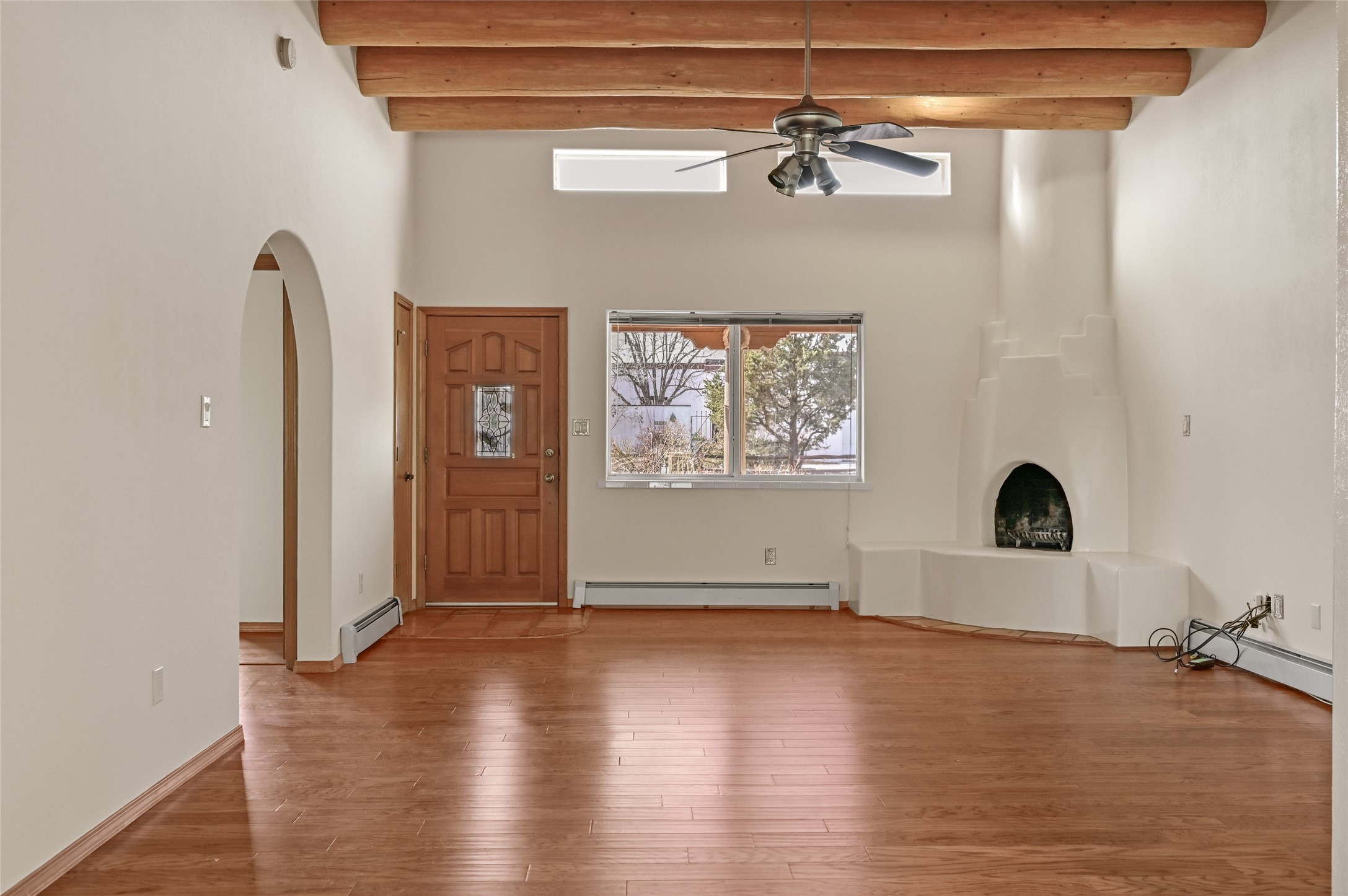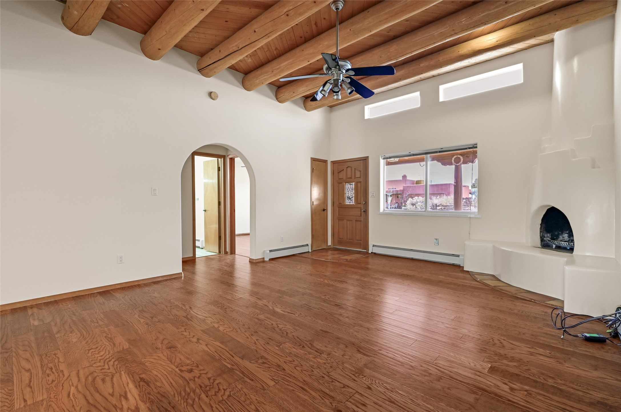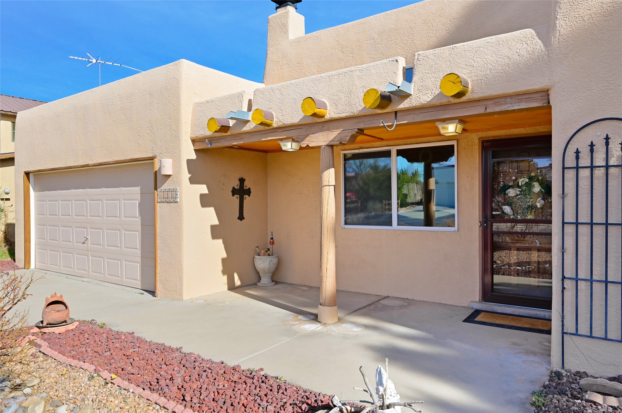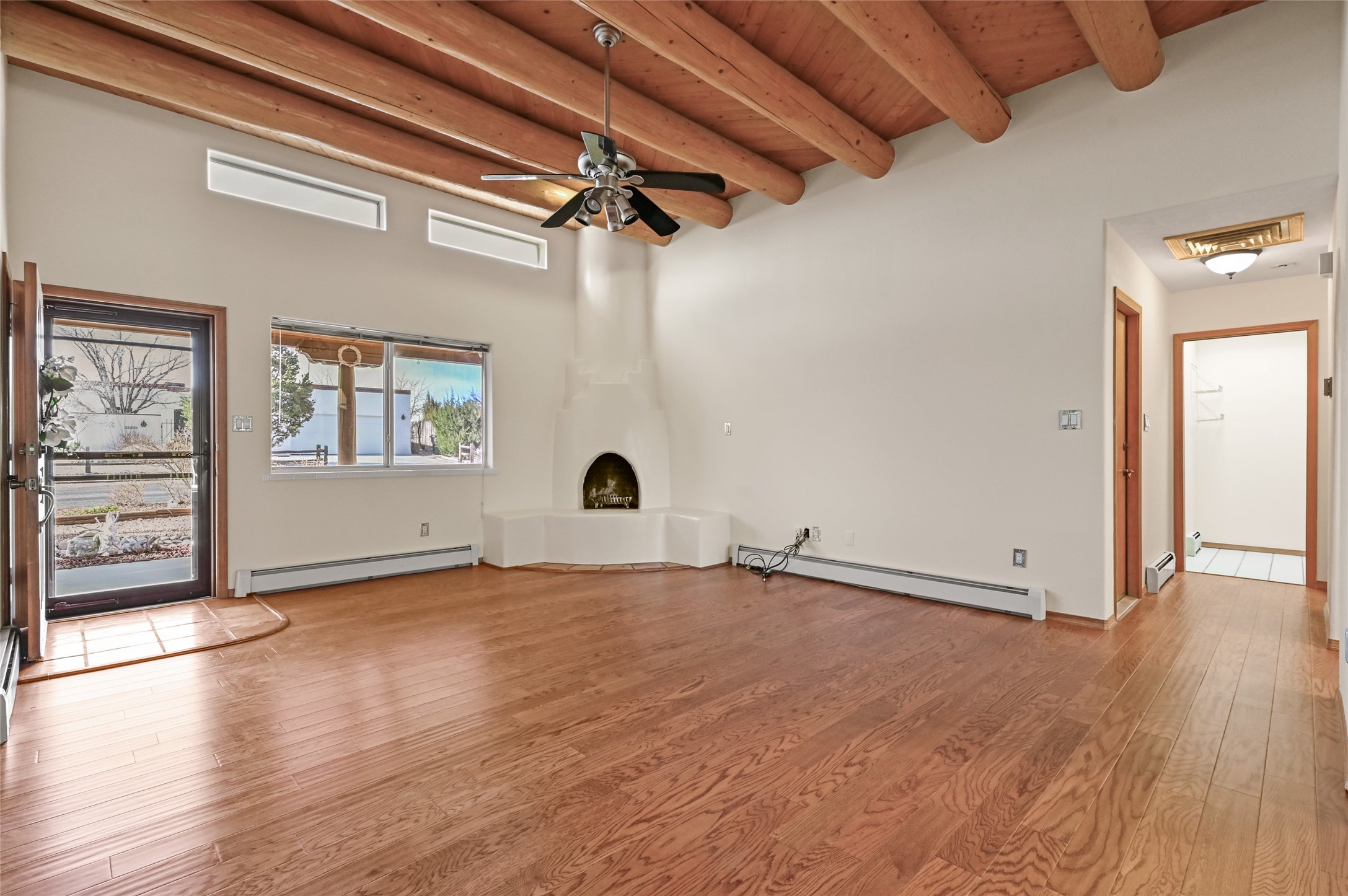 Southwestern Charm Near Cochiti Lake. Discover the perfect blend of tradition and comfort in this lovely 3-bedroom, 2-bathroom home located near the high end of Cochiti Lake on Vooscane Avenue. From the mature, thoughtfully landscaped front yard to the classic covered portal entry, this residence exudes authentic New Mexico character.Inside, the Great Room makes a dramatic impression with soaring ceilings adorned with traditional vigas and herringbone decking. At the heart of the home sits a sculpted Kiva fireplace, offering a warm and inviting focal point. The flooring is a beautiful mix of classic Saltillo tile and rich, engineered hardwood, providing a timeless aesthetic that is as durable as it is stylish.The kitchen and bathrooms carry the theme with classic NM tile motifs and ample oak cabinetry, while the kitchen is updated with a sleek stainless steel refrigerator. Comfort is prioritized year-round with radiant baseboard heating, evaporative cooling, and multiple ceiling fans throughout.Step out onto the spacious outdoor deck and covered portal, an ideal spot for entertaining or quiet reflection. The fully fenced backyard, secured by high-quality wood fencing, offers privacy and a limited view toward Tetilla Peak. Practicality is also built-in, with a handy backyard storage shed and organized garage shelving for all your gear.Don't miss this one. Schedule your showing today!