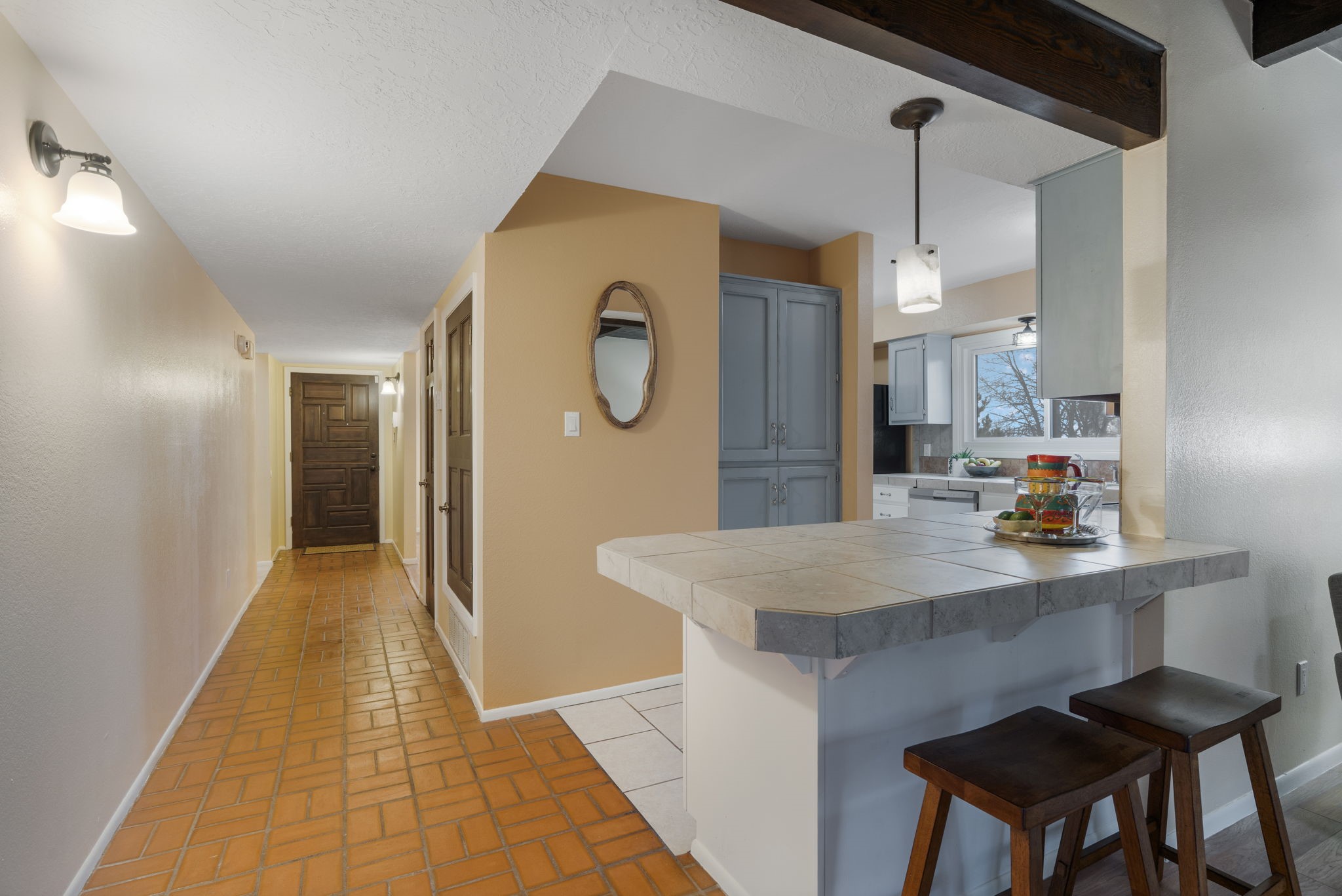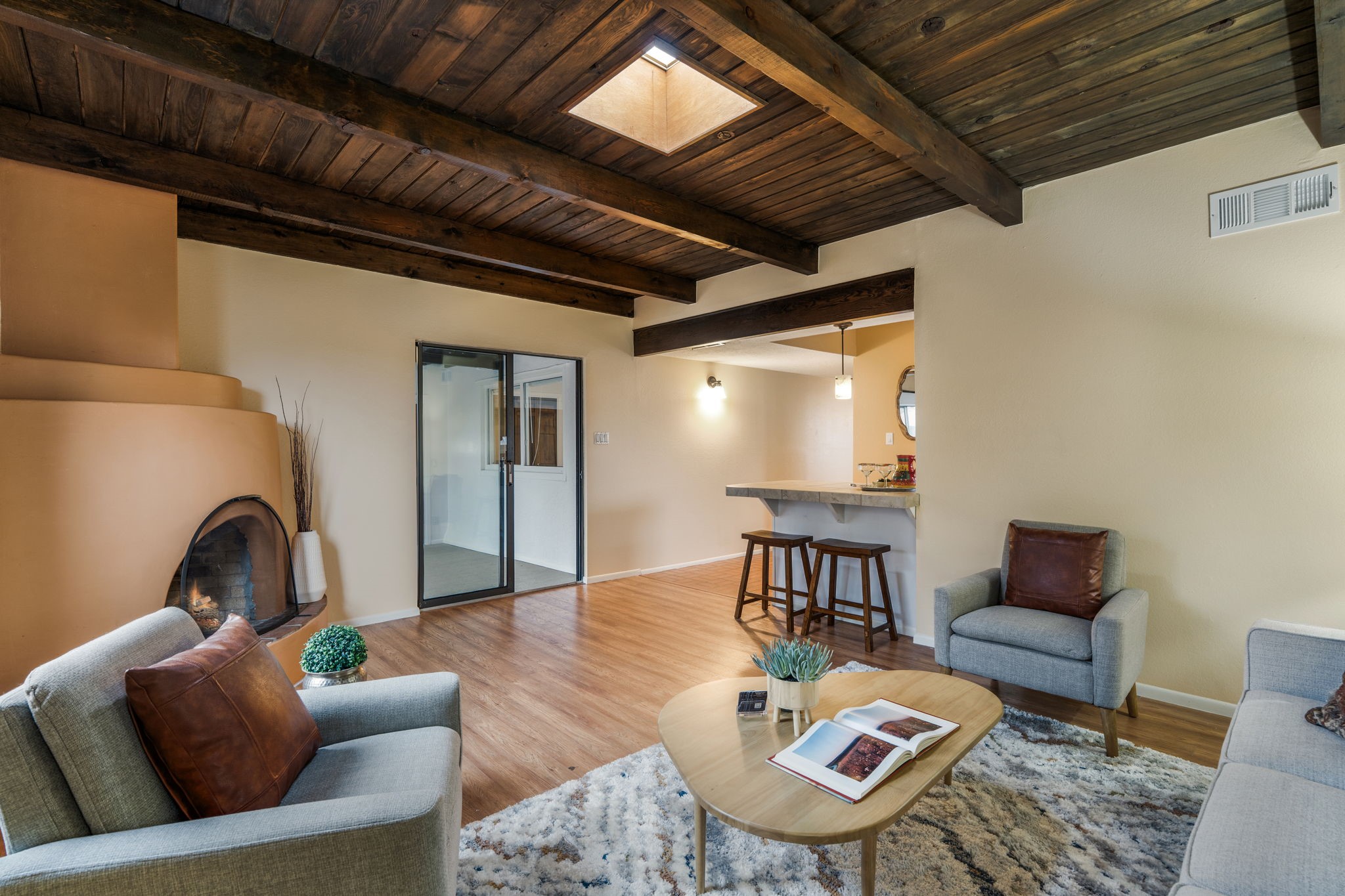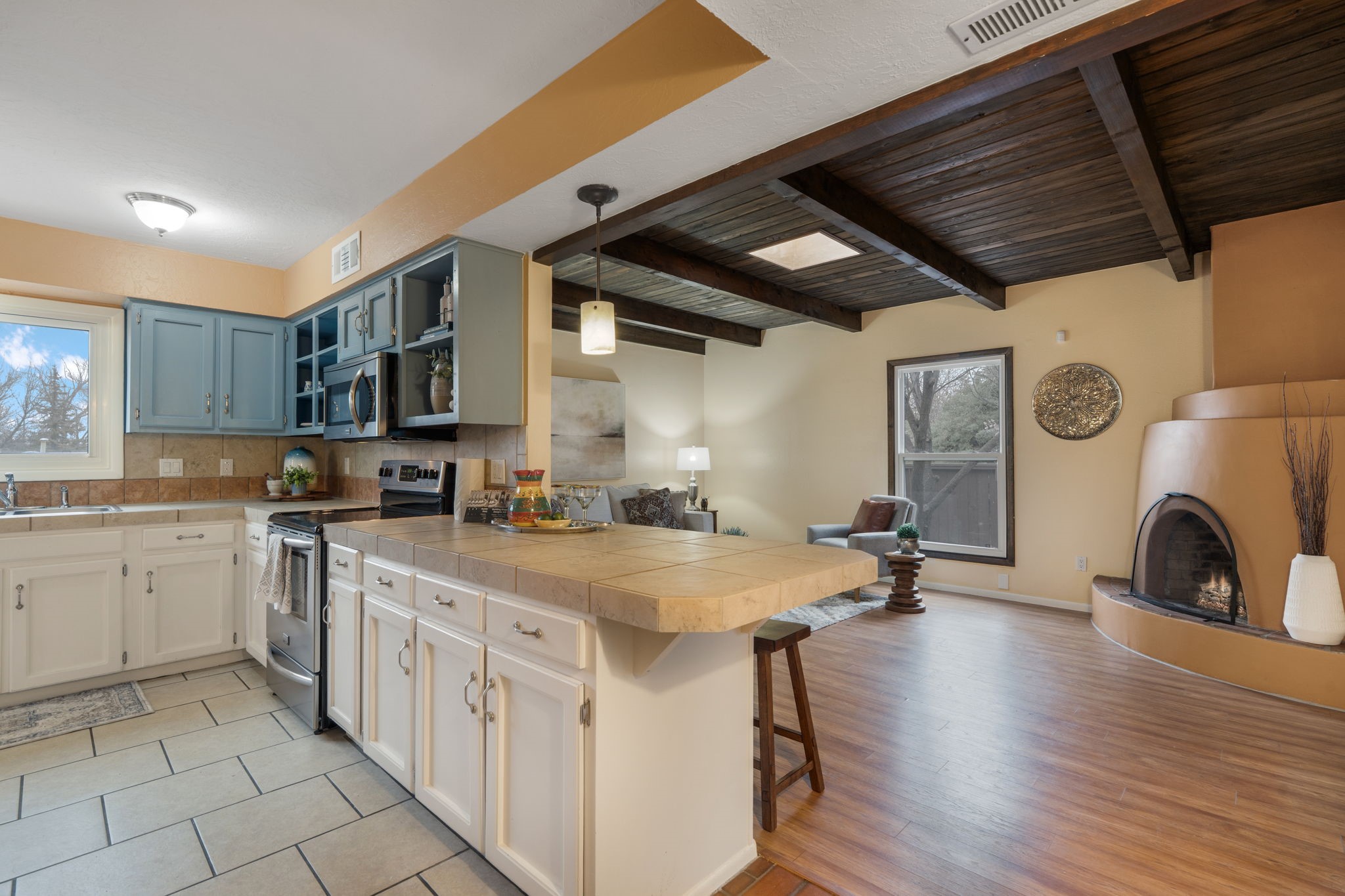Welcome to this adorable single-story gem in coveted Park Plazas, where charm, comfort, and community come together beautifully.Step through a sweet blue gate into a private entry courtyard that sets the tone for the warmth and character found throughout. Inside, a welcoming front hall lined with classic brick tile creates an inviting first impression. To the left, a spacious dining room is bathed in natural light, featuring laminate floors and picturesque views of the Jemez Mountains -- the perfect backdrop for memorable dinners and gatherings.The L-shaped kitchen offers both functionality and style, with tile countertops, generous cabinet and pantry space, and stainless steel appliances, including a brand-new dishwasher. Whether you're preparing a quiet meal at home or entertaining friends, this kitchen is ready to serve.The living room is rich with Southwestern charm, highlighted by a corner Kiva fireplace, beamed ceiling, and laminate wood floors. Sliding doors lead to an enclosed portal that functions beautifully as a sunroom, office, or creative retreat -- a bright and versatile space to enjoy year-round.The primary bedroom is newly carpeted and features a wall of closets along with a private bath. A second bedroom and bath provide comfortable accommodations for guests or family. The entire home has been freshly painted, with new carpet in both bedrooms and the sunroom, giving it a crisp, refreshed feel inside and out. Truly move-in ready.A two-car garage adds convenience and storage.Located in the lovely and centrally situated Park Plazas neighborhood, you're just minutes from restaurants, shopping, and a short drive to the Plaza. Residents enjoy miles of walking trails, tennis courts, an off-leash dog park, community garden, children's playground, and basketball courts -- an active and welcoming community with something for everyone.This is a wonderful home in a wonderful neighborhood -- ready to welcome its next owner.
