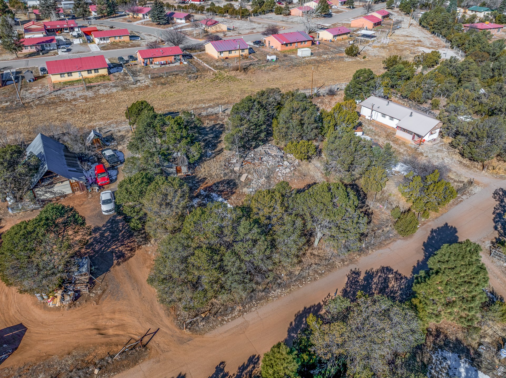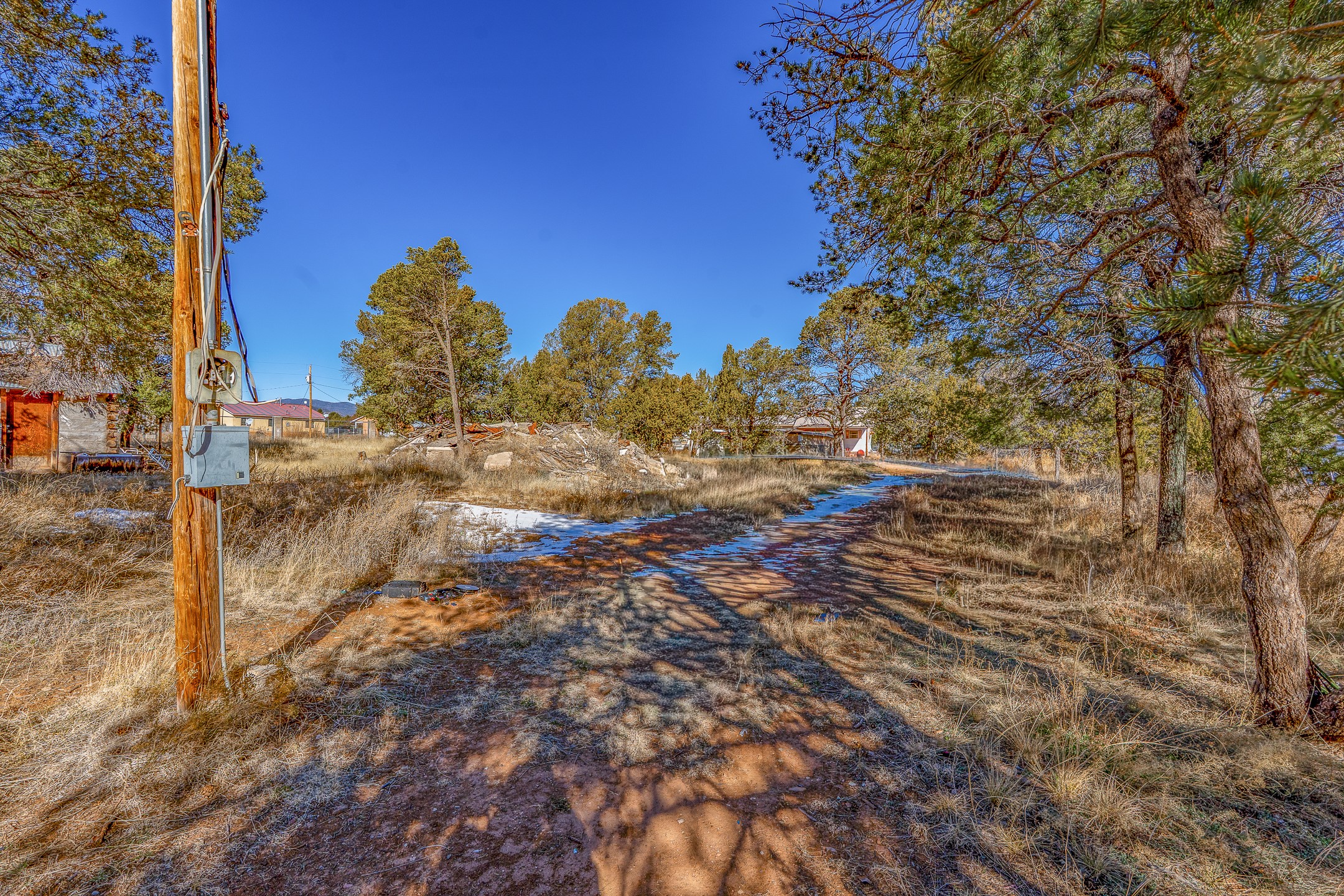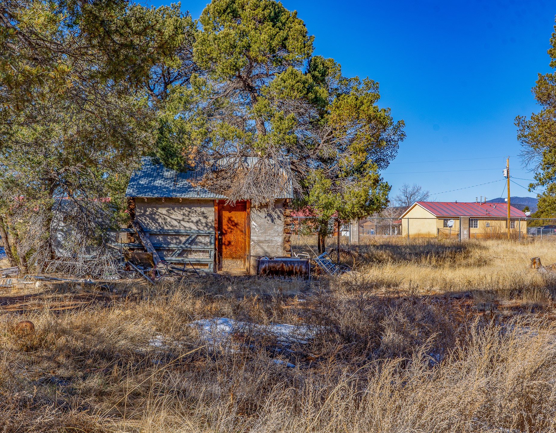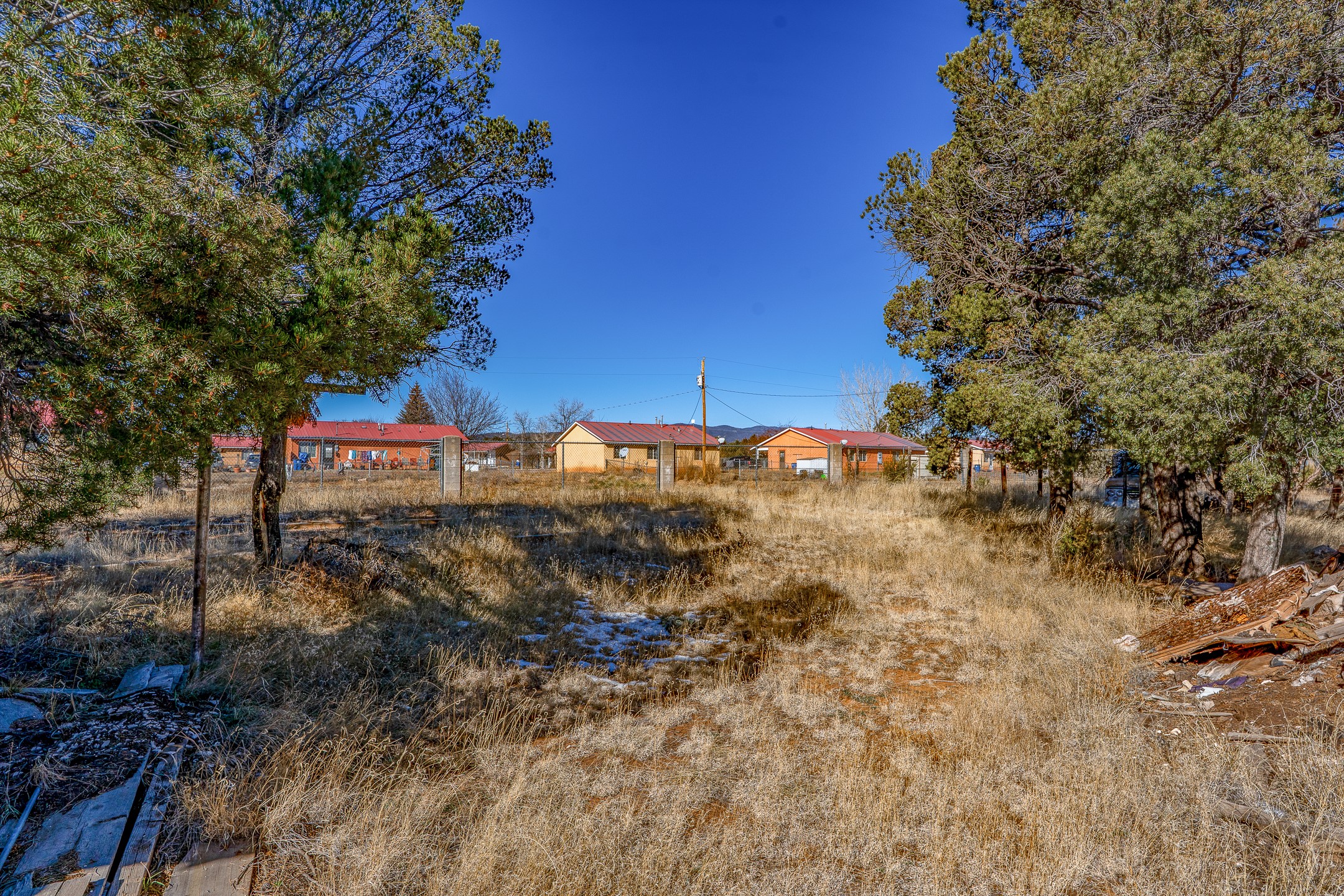 Just over a half acre in the Village of Pecos. Two lots make up this property, with considerable flat space for easy building and large pine trees. Connection to village water and sewer possible. A home had been on the lot and burned years ago, some rubble remains. An old outbuilding is still on the lot. Easy to access, easy to build.