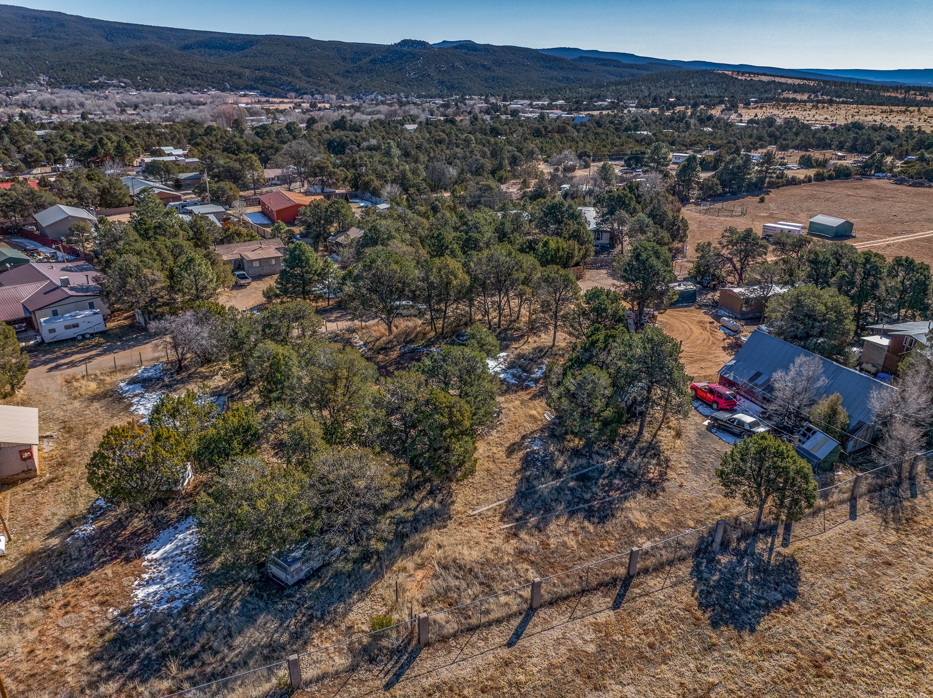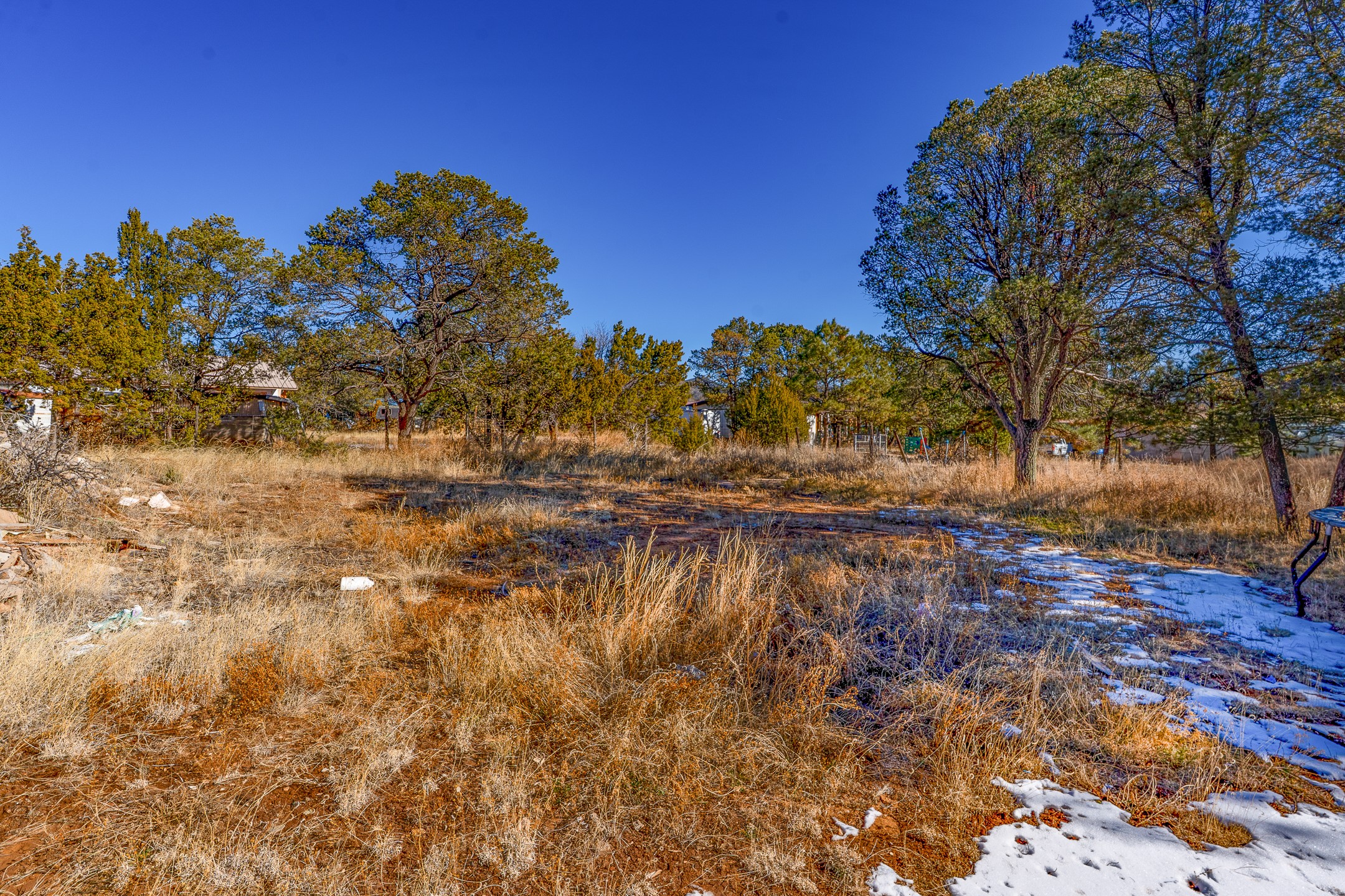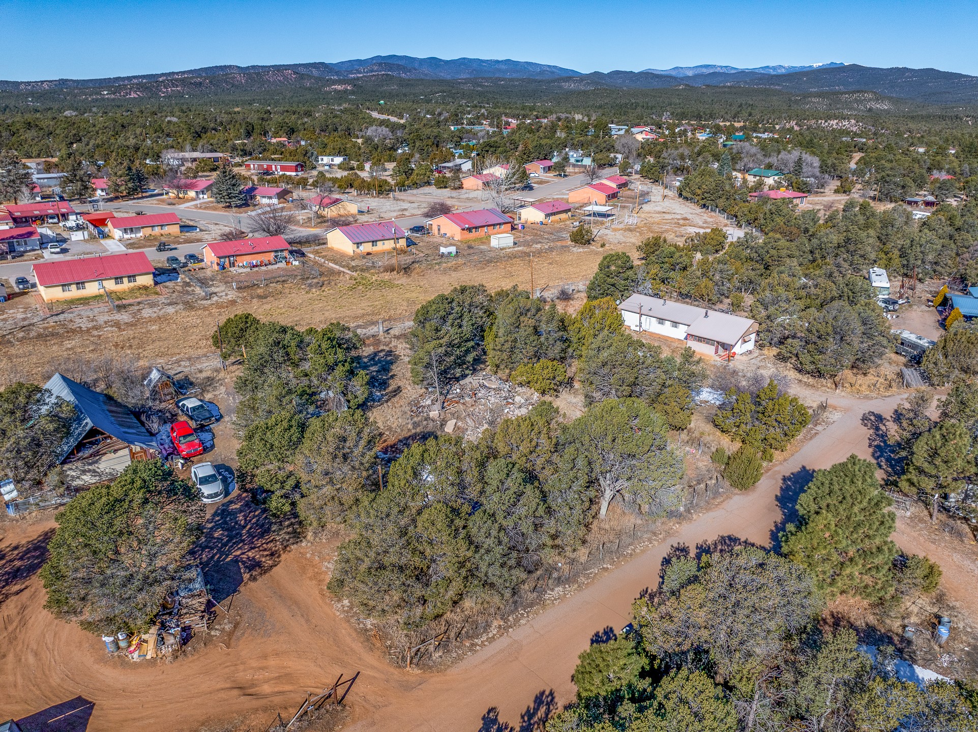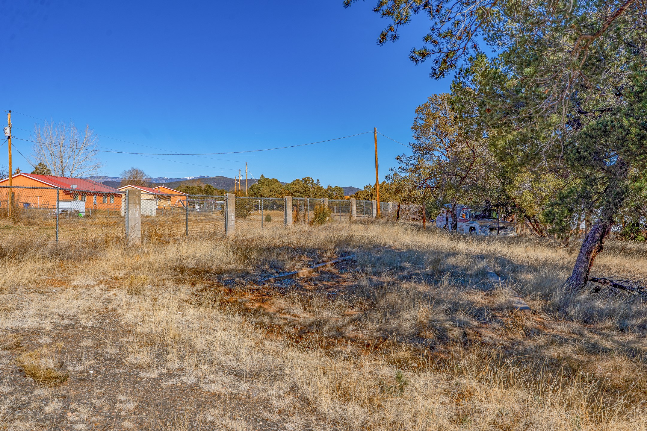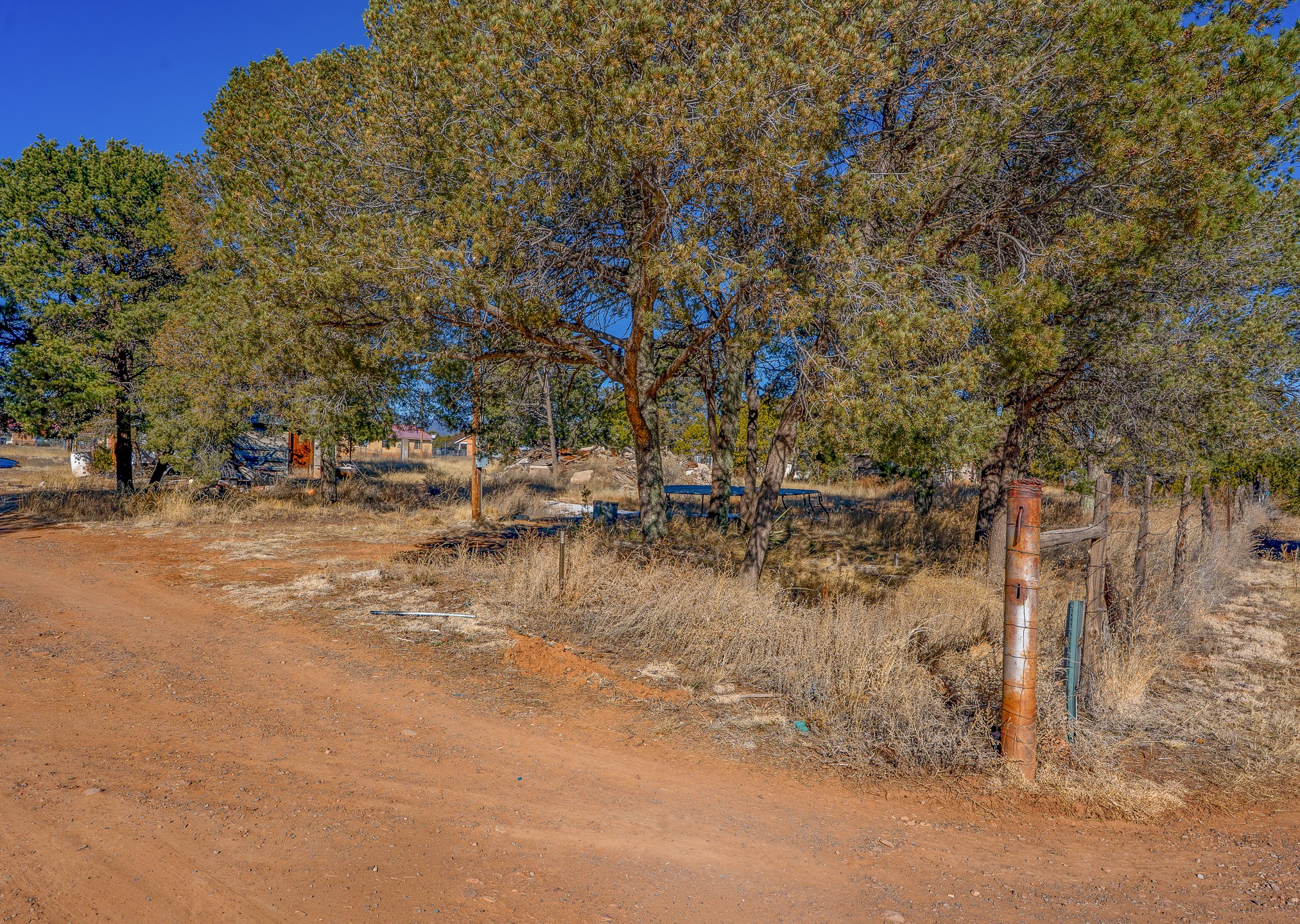 Just over a half acre in the Village of Pecos. Two lots make up this property, with considerable flat space for easy building and large pine trees. Connection to village water and sewer possible. A home had been on the lot and burned years ago, some rubble remains. An old outbuilding is still on the lot. Easy to access, easy to build.