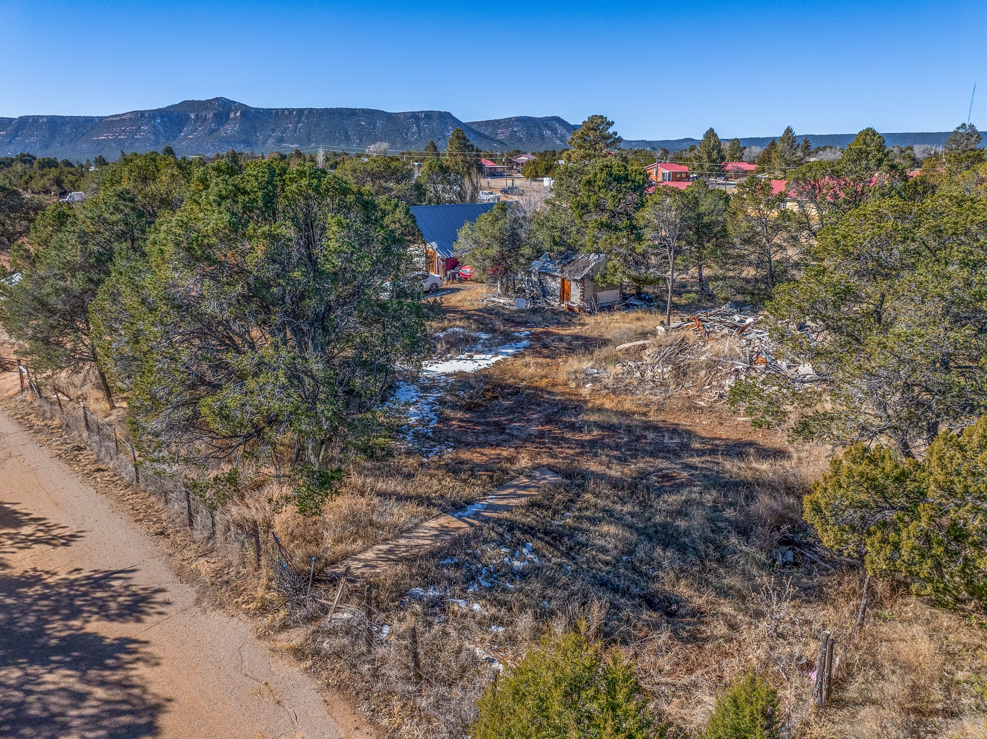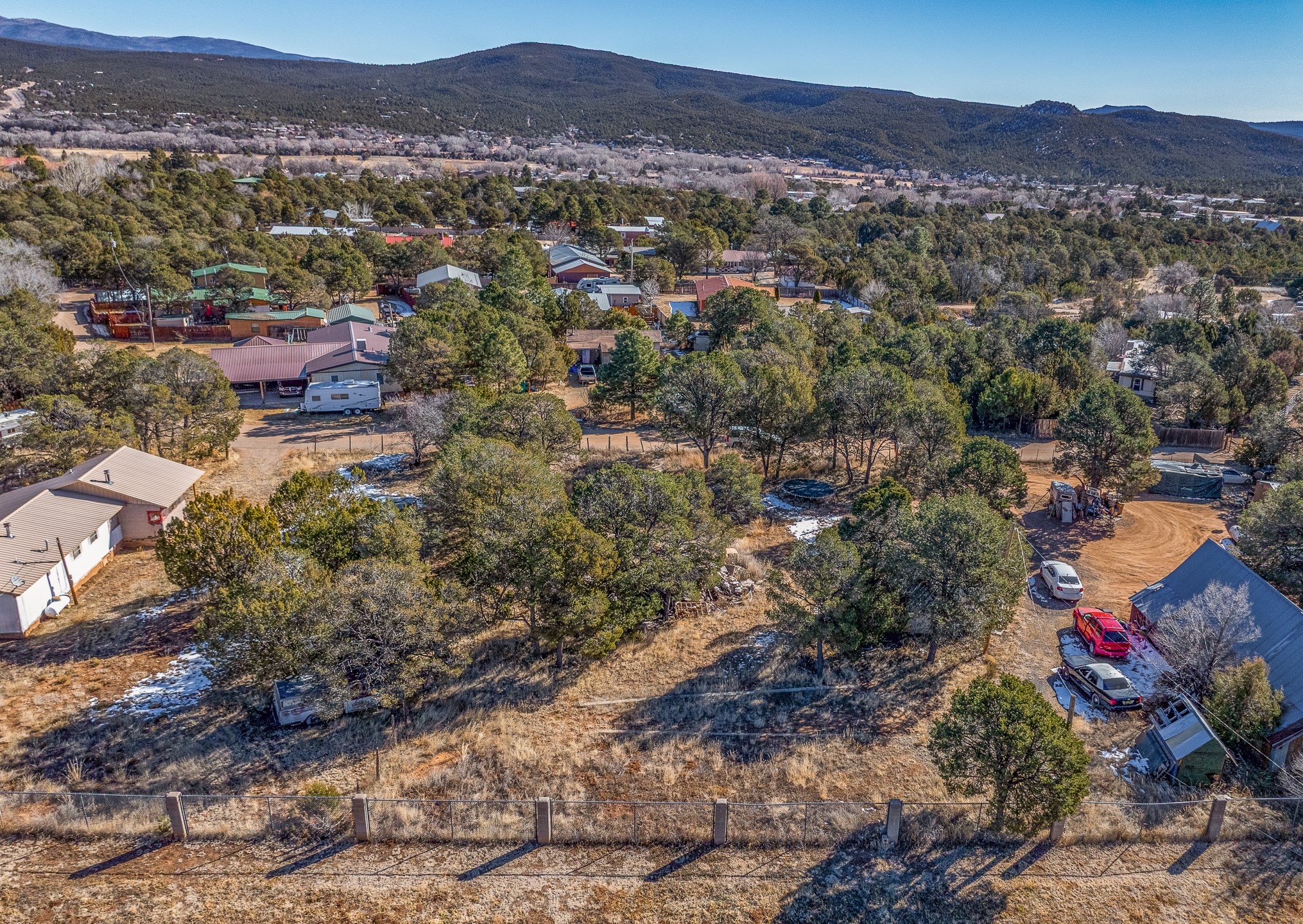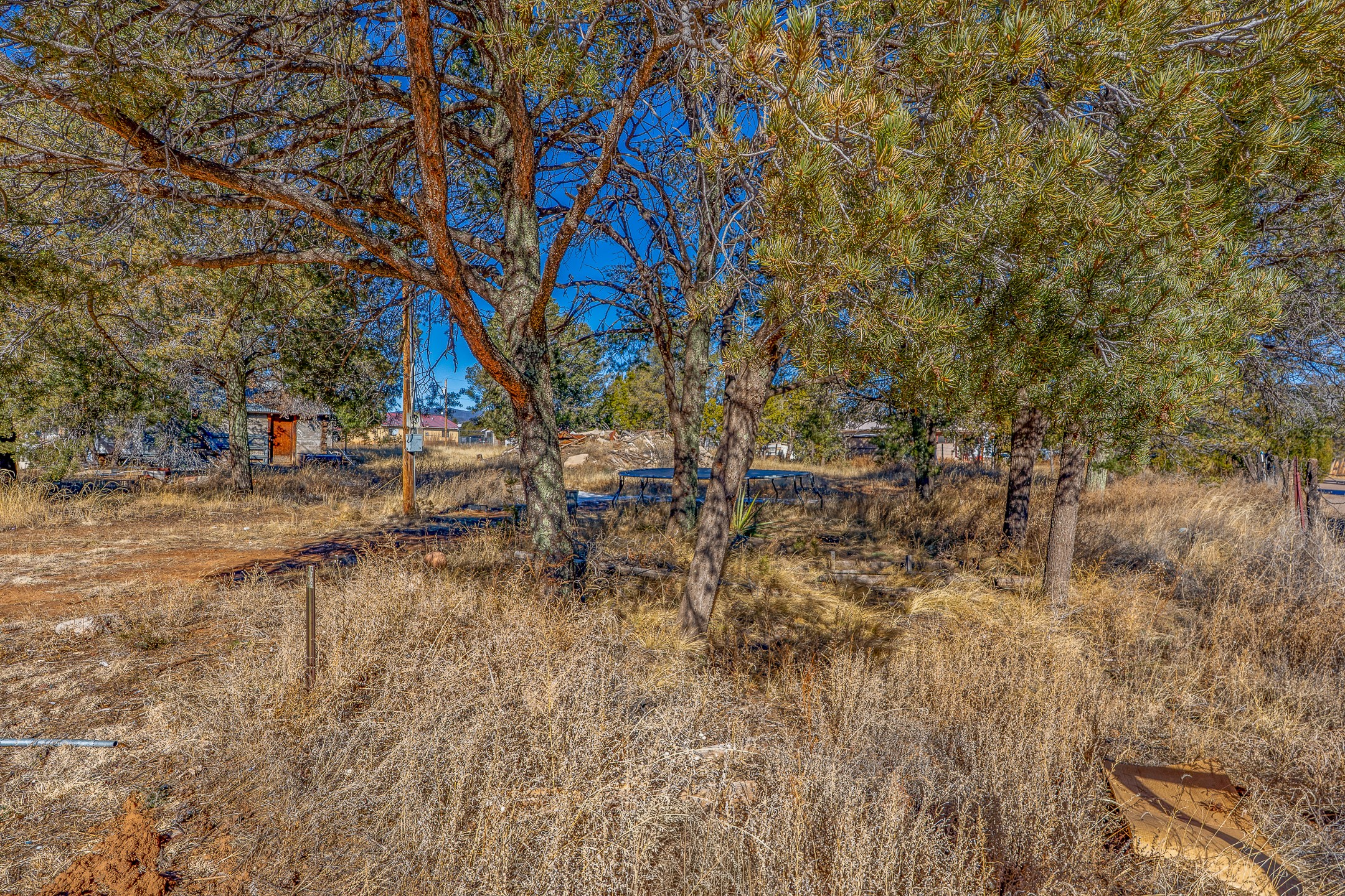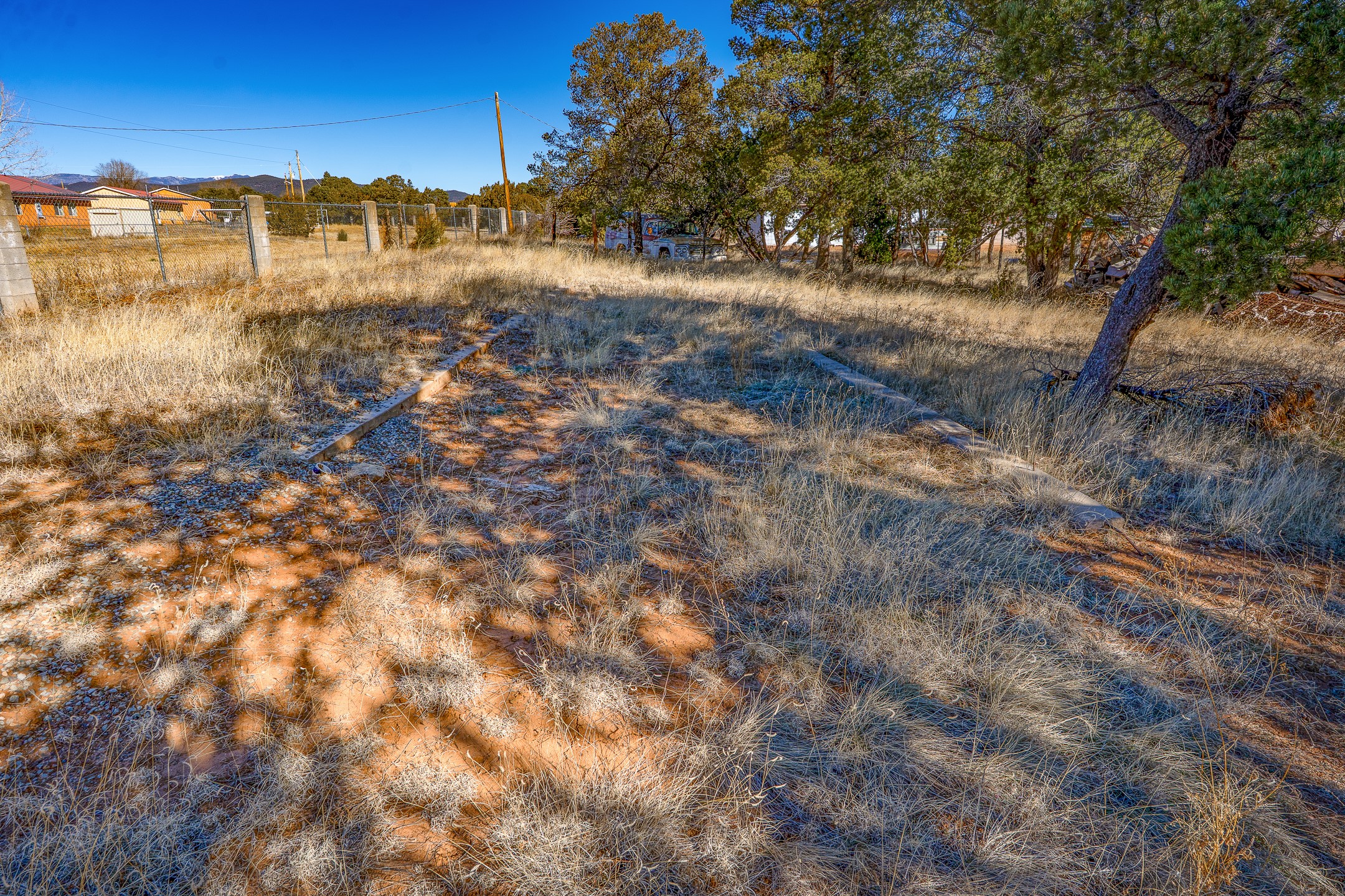 Just over a half acre in the Village of Pecos. Two lots make up this property, with considerable flat space for easy building and large pine trees. Connection to village water and sewer possible. A home had been on the lot and burned years ago, some rubble remains. An old outbuilding is still on the lot. Easy to access, easy to build.
