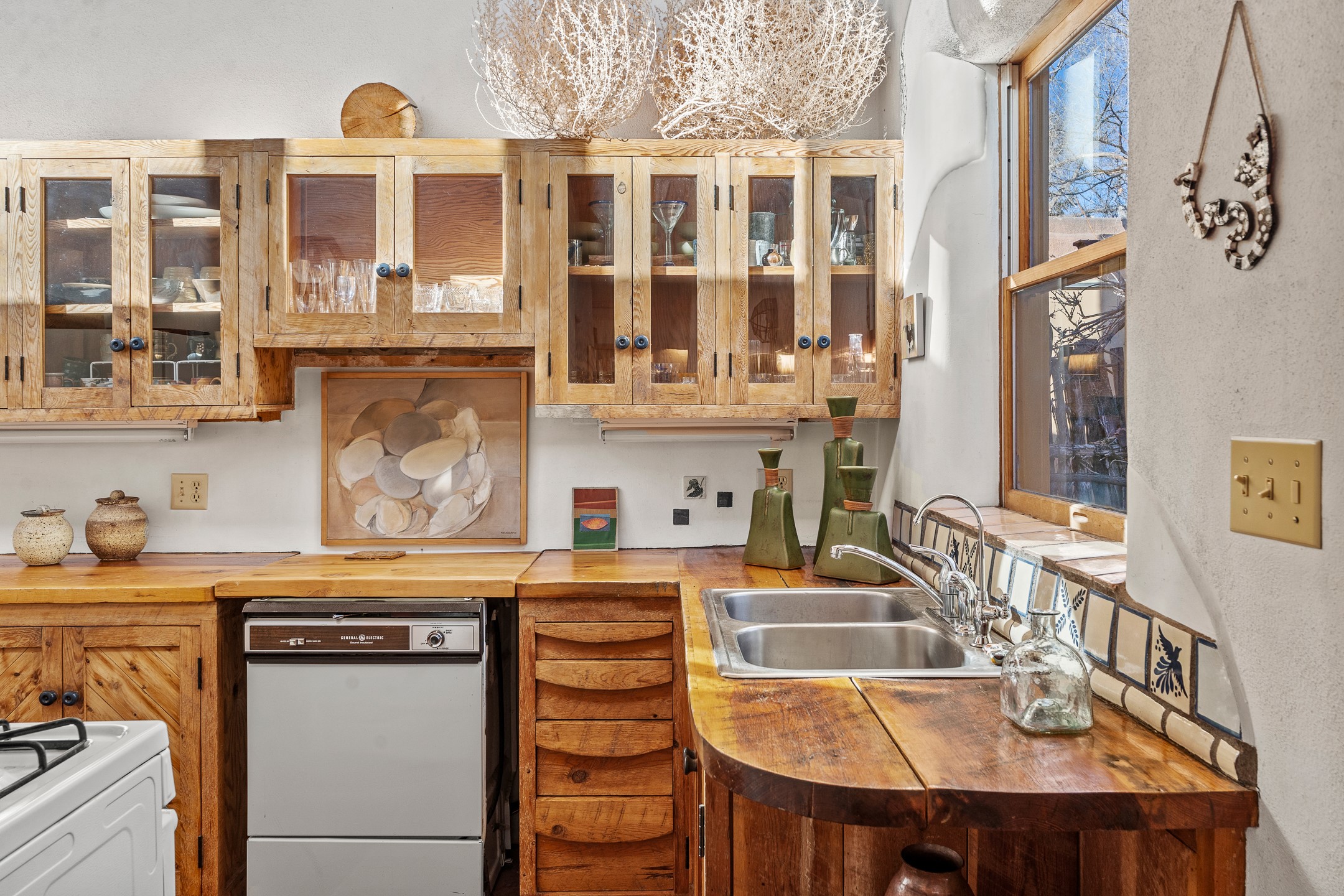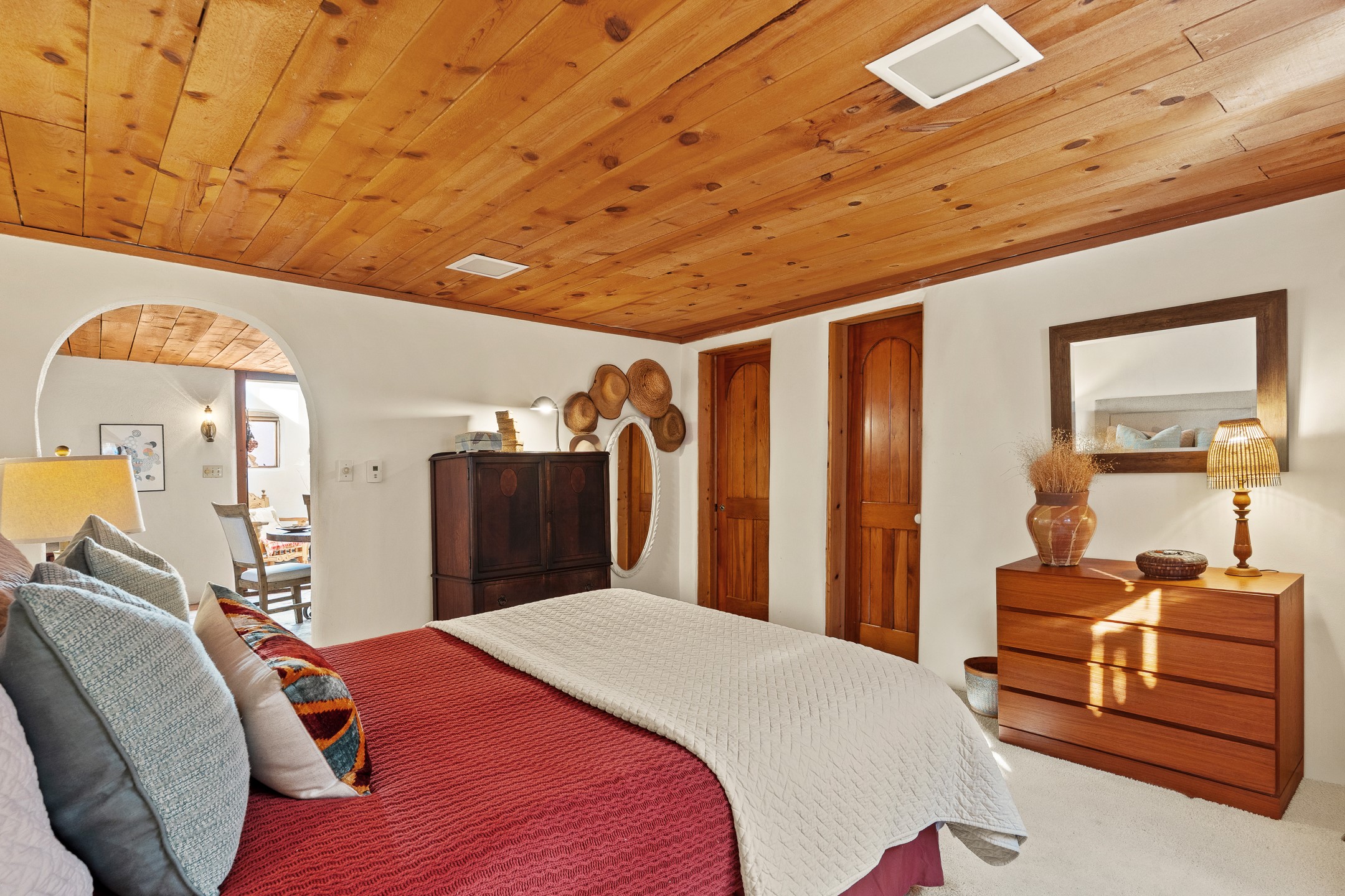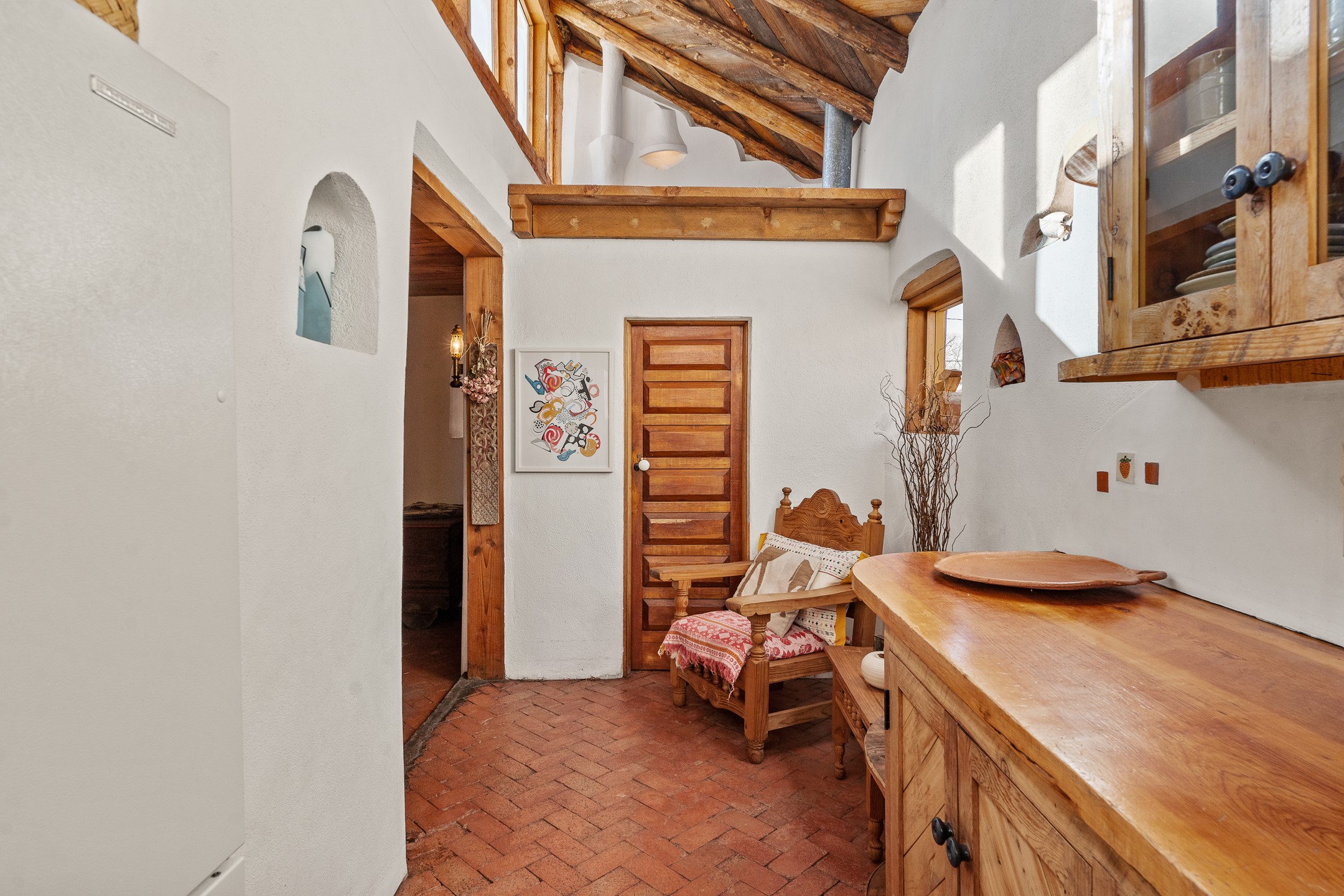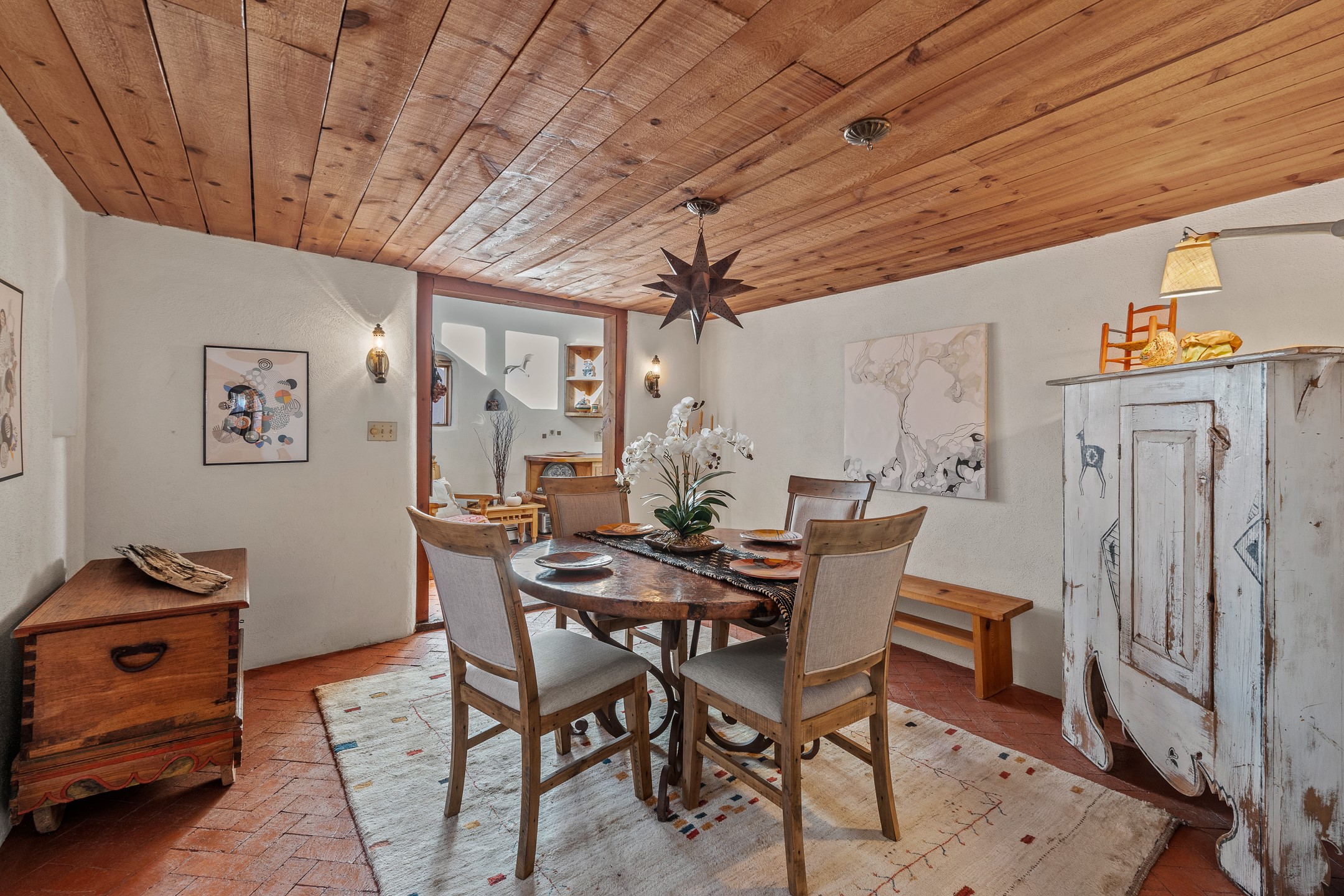 Set in Santa Fe's coveted Historic Eastside, just moments from famed Canyon Road -- world class art, culture, and celebrated dining -- this classic adobe artist's residence captures the timeless spirit of Santa Fe living. Located a half block from the storied Acequia Madre along Camino Don Miguel, the property offers a rare combination of authenticity, privacy, and proximity to one of the most revered cultural corridors in the Southwest.The 2-bedroom, 1-bath main residence is rich with architectural character and artisan detail. Coved viga ceilings, hand-hewn doors, custom plastered kiva fireplaces, clerestory windows, skylights, and a sunlit sitting nook create layered warmth throughout the home. Brick and tile floors -- with additional wood beneath the bedroom carpet -- pair beautifully with custom cabinetry, willow reed sconces, and hand-forged iron railings. Currently arranged with two living areas, one space offers flexibility as an additional bedroom, or private office with its own entrance.A separate casita and an additional outbuilding with barn doors and a window provide versatile spaces ideal for a studio, and guest quarters -- an appealing feature for artists, or those seeking a compound-style Eastside retreat.Enclosed garden patios and mature landscaping create a series of intimate outdoor settings, offering both privacy and a sense of tranquility. A brand new TPO roof with transferable warranty and two off-street parking spaces add comfort and practicality -- a rarity in this historic neighborhood.This is a distinctive opportunity to own a soulful Santa Fe adobe residence in one of the city's most sought-after locations, where historic character, creative legacy, and the Canyon Road lifestyle converge.