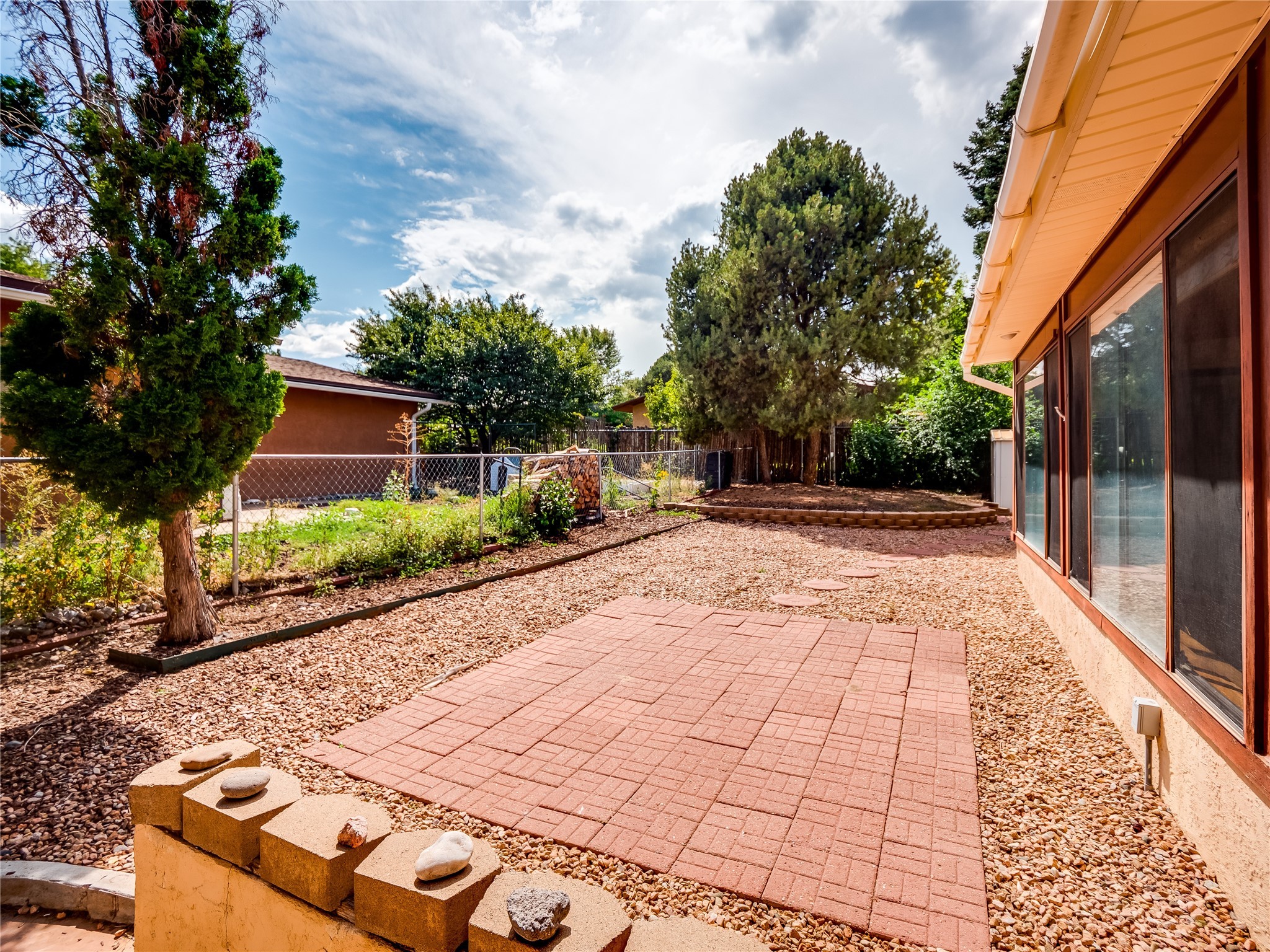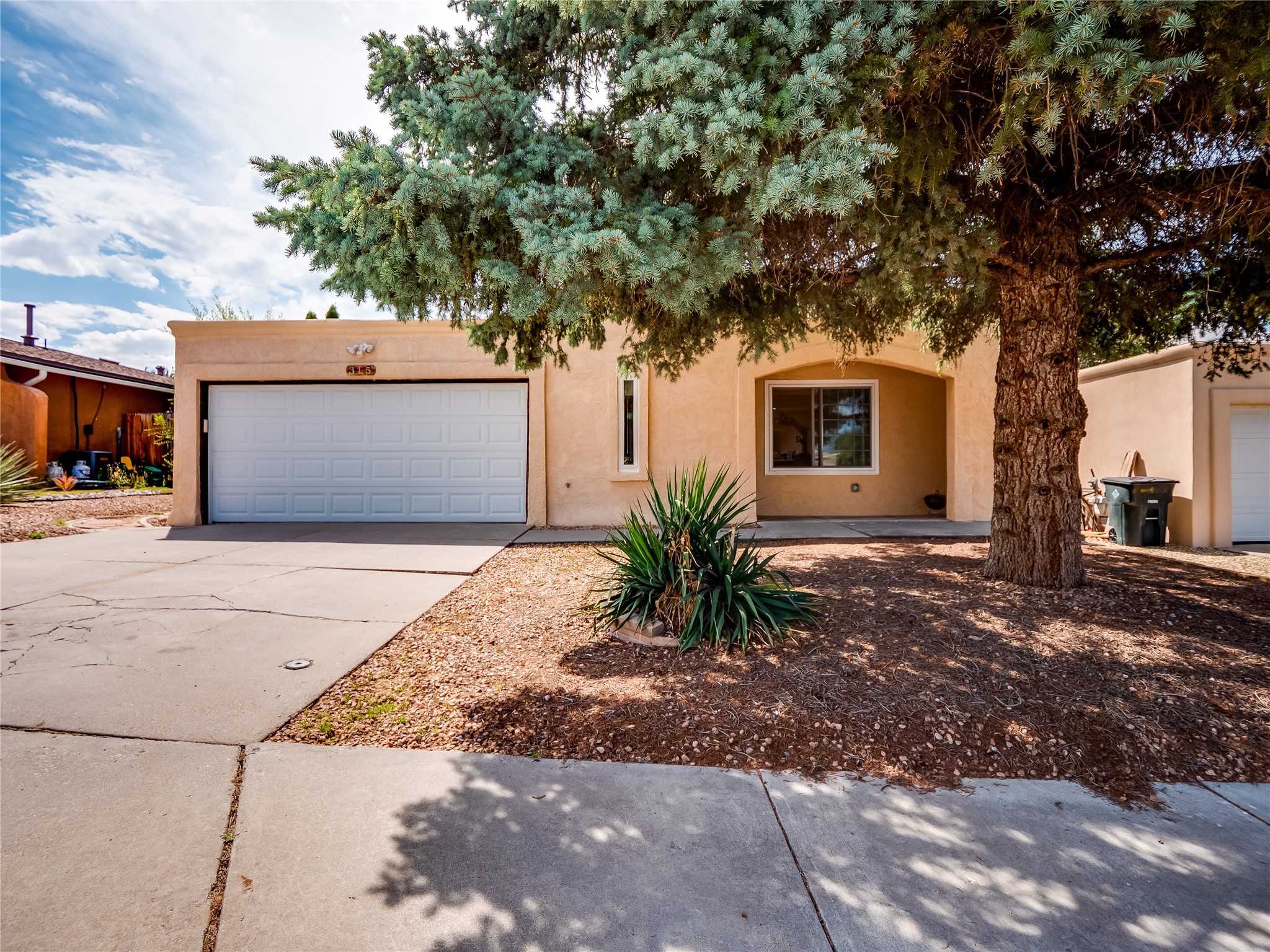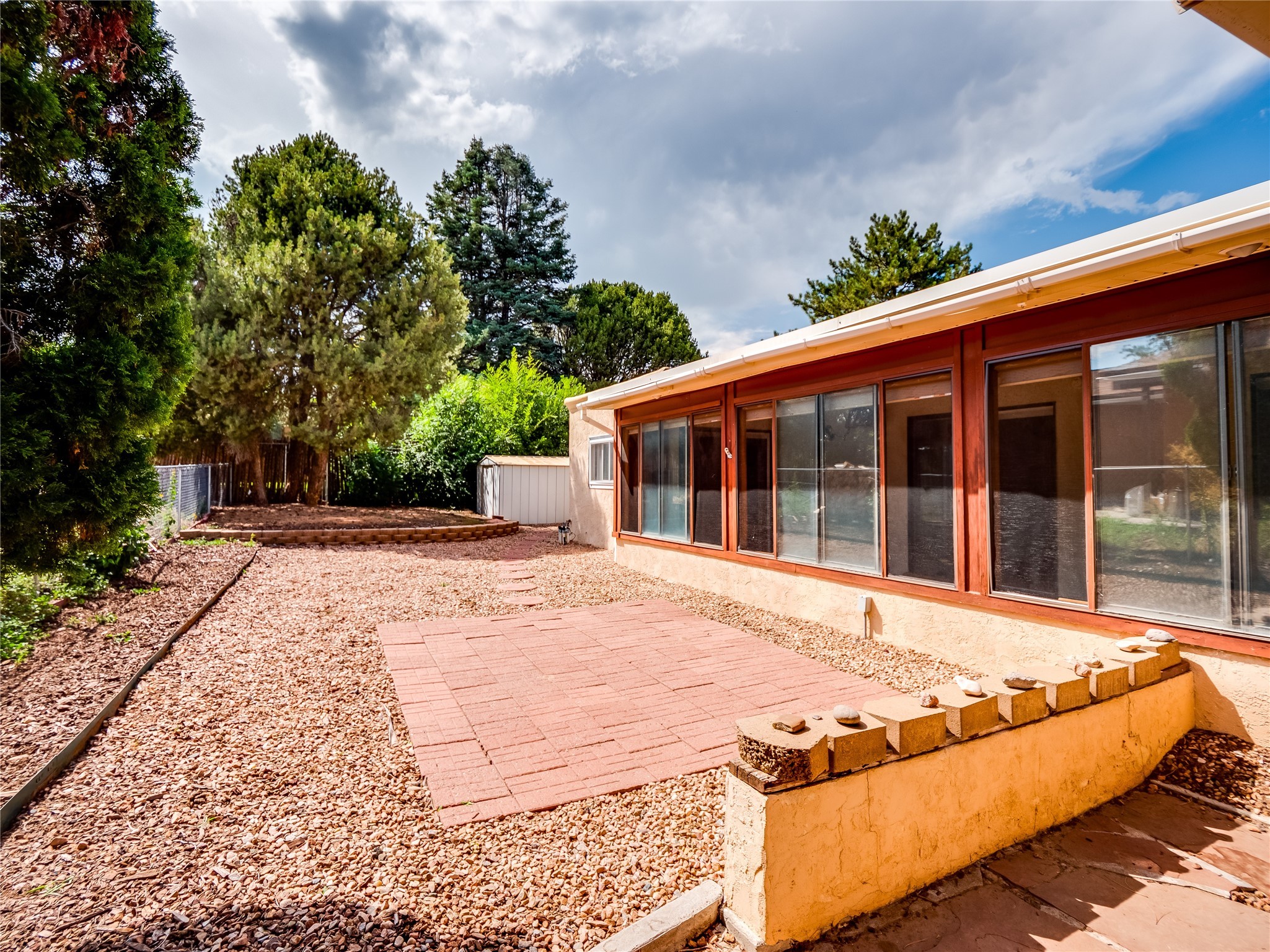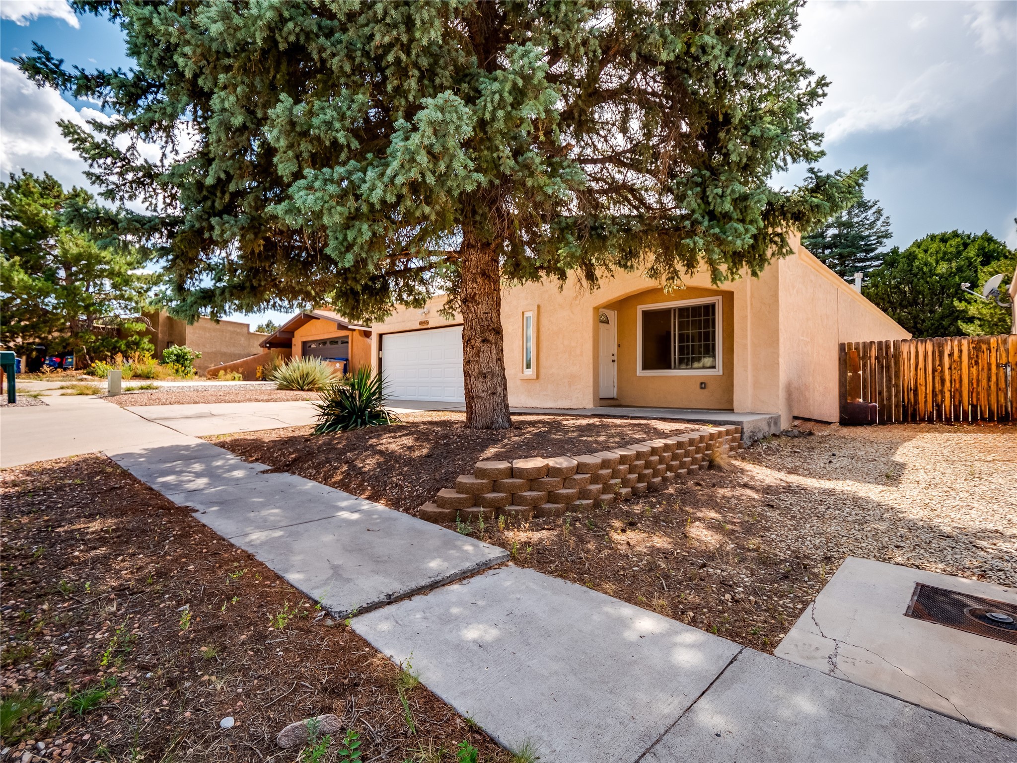 This charming single-story home in White Rock offers beautiful xeriscape landscaping and a welcoming layout. Step through the front entrance onto laminate wood floors that extend through the main living areas. A coat closet and convenient access to the two-car garage greet you at the entry. The spacious living room features a large front-facing window and a skylight, filling the space with natural light. Adjacent to the living room is a dining space with sliders leading to a bright sunroom with new laminate wood flooring. The bonus room, with the same new floors, offers additional space and leads to the backyard, with another access point to the garage for convenience. The galley-style kitchen boasts wood cabinets with glass inlays, hard surface countertops, tile flooring, stainless steel appliances, and a gas oven/range. Another skylight brightens up this functional space. Down the hallway, you'll find a large guest room with a double-door walk-in closet and sliders leading to the sunroom, a guest bathroom with a single sink vanity and a tiled shower/tub, and an open laundry space with upper cabinets that could easily be enclosed. The spacious primary en-suite includes a walk-in closet and sliders to the sunroom, while the primary bathroom has a single sink vanity and tiled shower/tub. The sunroom is surrounded by windows, offering a perfect view of the fenced-in backyard with its low-maintenance landscaping, mature trees, and room to create your dream garden or outdoor living area. With parks, trails, shopping, and restaurants just a short distance away, this home is in an ideal location. Come take a tour today!