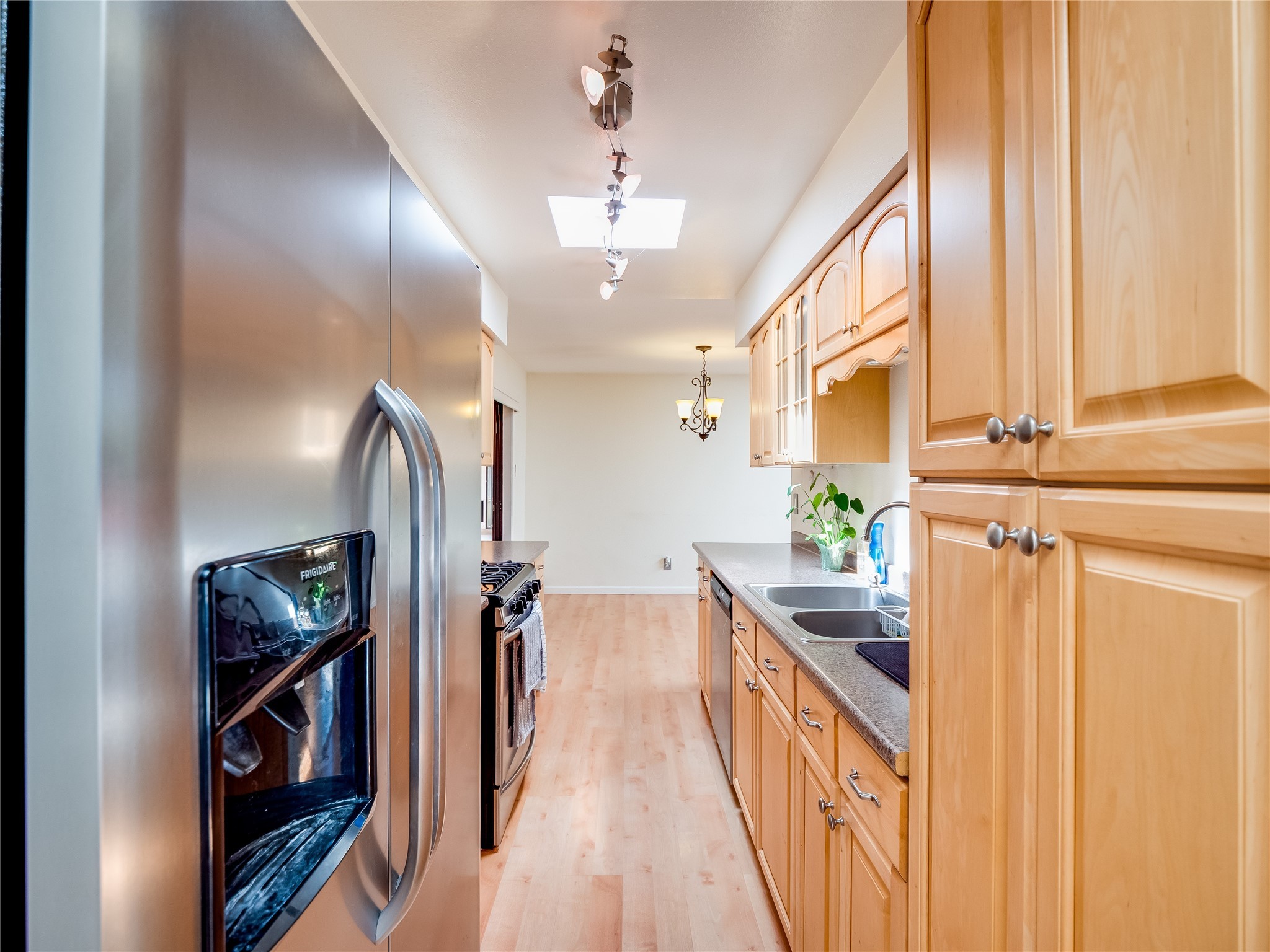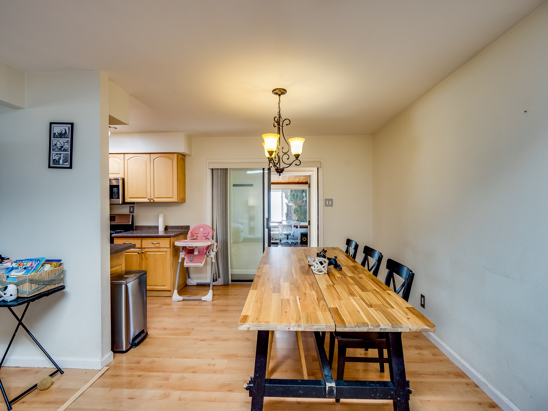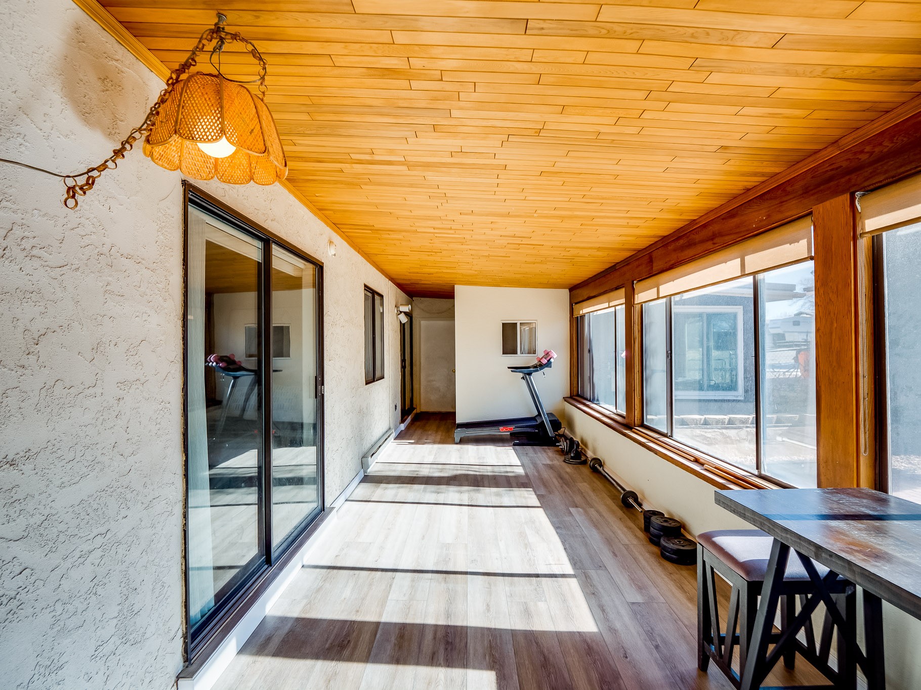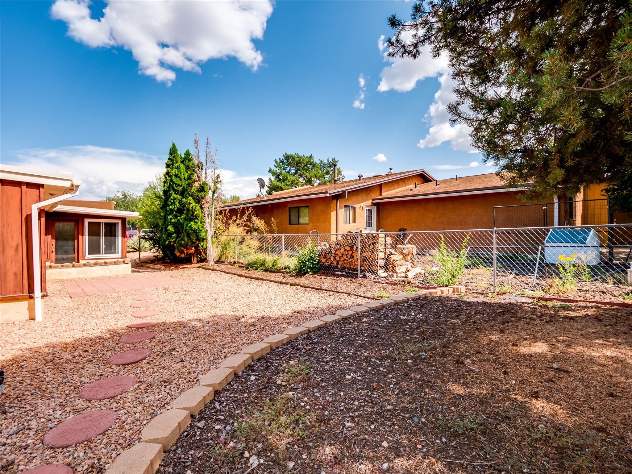 This charming single-story home in White Rock offers beautiful xeriscape landscaping and a welcoming layout. Step through the front entrance onto laminate wood floors that extend through the main living areas. A coat closet and convenient access to the two-car garage greet you at the entry. The spacious living room features a large front-facing window and a skylight, filling the space with natural light. Adjacent to the living room is a dining space with sliders leading to a bright sunroom with new laminate wood flooring. The bonus room, with the same new floors, offers additional space and leads to the backyard, with another access point to the garage for convenience. The galley-style kitchen boasts wood cabinets with glass inlays, hard surface countertops, tile flooring, stainless steel appliances, and a gas oven/range. Another skylight brightens up this functional space. Down the hallway, you'll find a large guest room with a double-door walk-in closet and sliders leading to the sunroom, a guest bathroom with a single sink vanity and a tiled shower/tub, and an open laundry space with upper cabinets that could easily be enclosed. The spacious primary en-suite includes a walk-in closet and sliders to the sunroom, while the primary bathroom has a single sink vanity and tiled shower/tub. The sunroom is surrounded by windows, offering a perfect view of the fenced-in backyard with its low-maintenance landscaping, mature trees, and room to create your dream garden or outdoor living area. With parks, trails, shopping, and restaurants just a short distance away, this home is in an ideal location. Come take a tour today!
