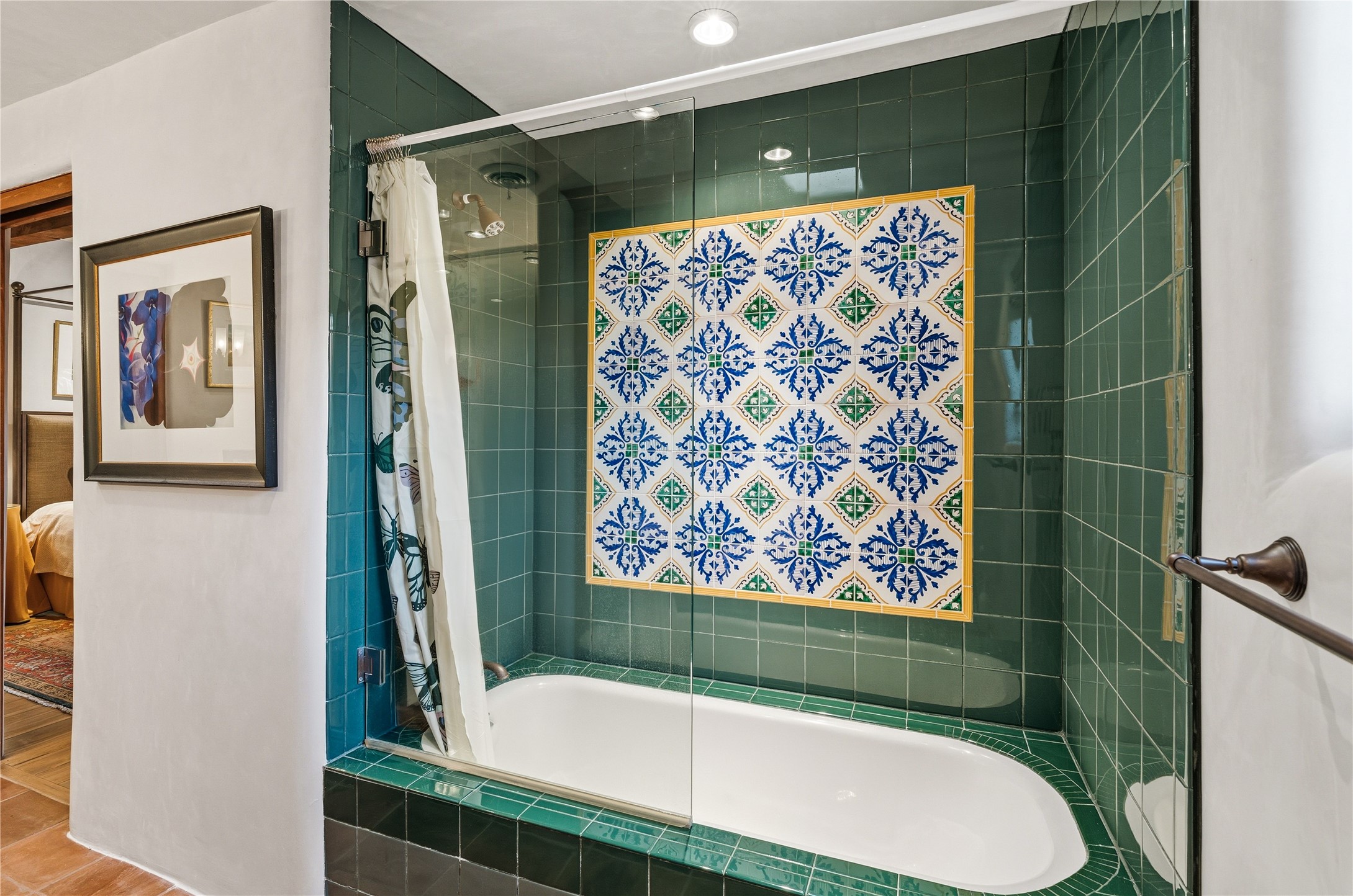 Enter the cobblestone street of the Las Puertas neighborhood within Las Campanas, and this impeccable terracotta hued stucco home welcomes you. A mixture of Puebloan Revival and Mexican Hacienda with contemporary proportions, this 2,861 square-foot, 3-bedroom, 4-bathroom home holds all that makes a Santa Fe house special. The property is in excellent condition and with a $50,000 art and furniture package available, it is the definition of move-in-ready. The step-free layout is organized with clarity and intention. Living spaces are centered within the plan, while the primary suite and guest rooms are set apart for privacy and flexibility. Each bedroom is en-suite, and a half-bath powder room is tucked off the entry hallway. There is a large open living and dining room that flows both to the exterior portal and to the large kitchen. The gourmet kitchen will delight any home chef or entertainer with top-of-the-line appliances, immense kitchen island, ample counter space, butler's pantry & breakfast bar. Off the kitchen is a cozy den, which could also serve as a semi-private office space. Rich details throughout include viga and plank ceilings, exposed wood beams and corbels, hand-painted Tunisian and Spanish tile accents, wood flooring, five fireplaces and custom cabinetry. The covered rear portal extends the living area and is bound by a walled courtyard that wraps around the house. If you're looking for a downsize or an easy second home, it's hard to find anything better than 2A Avenida Madison.