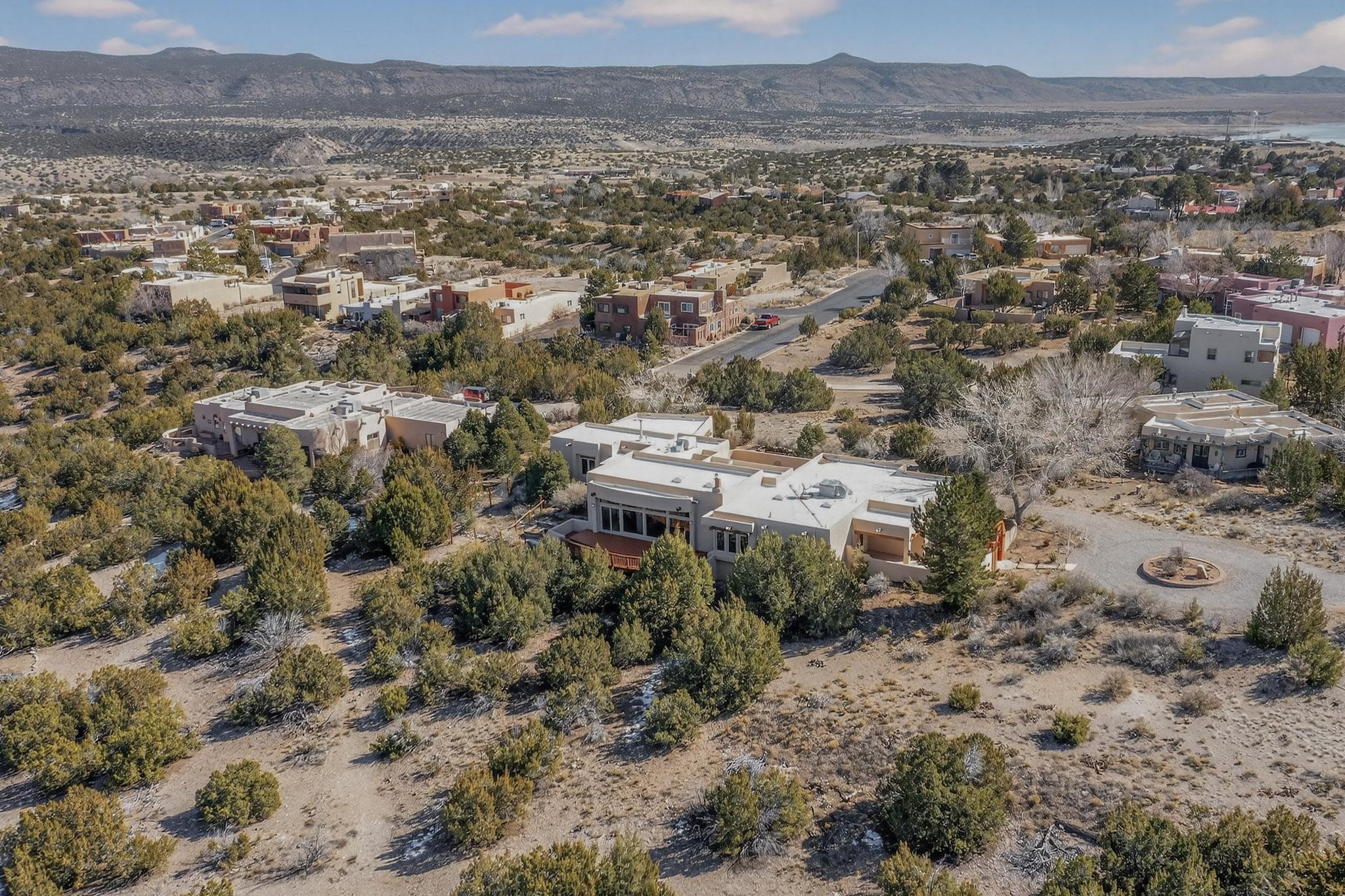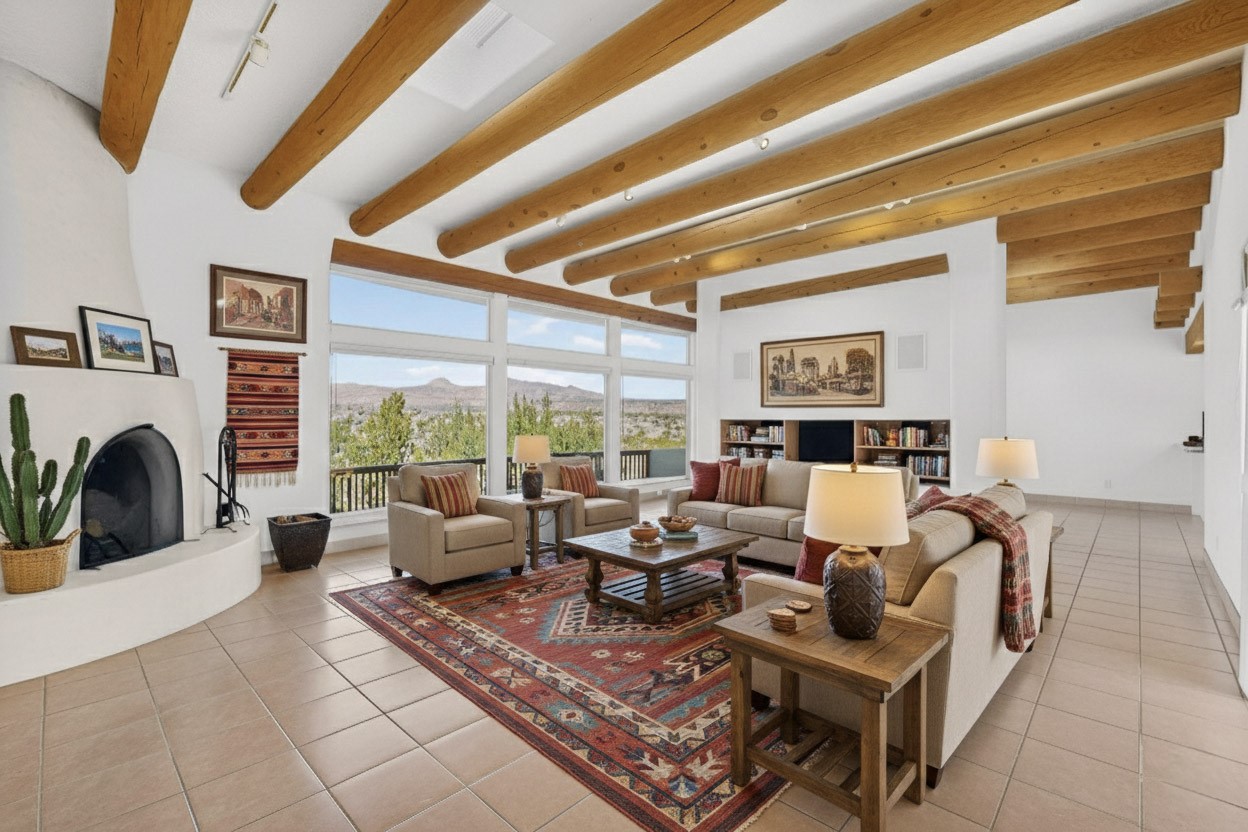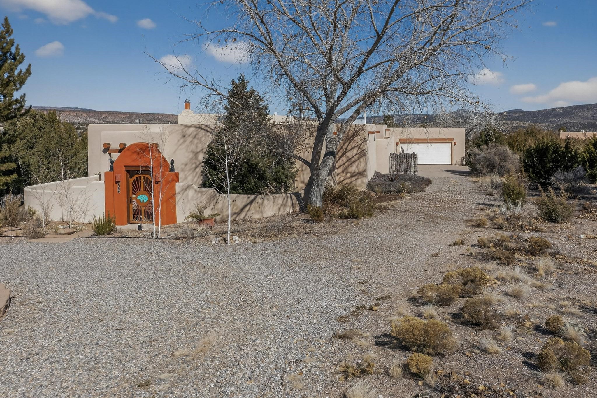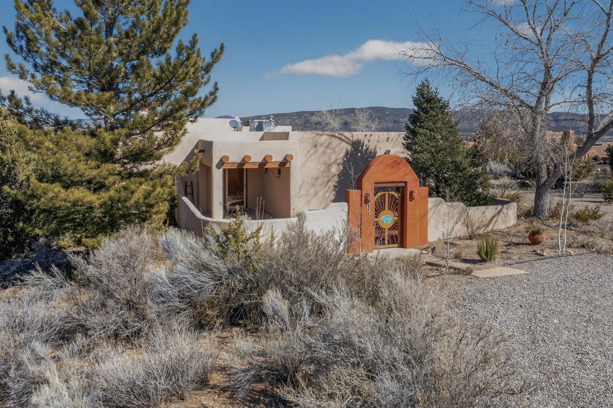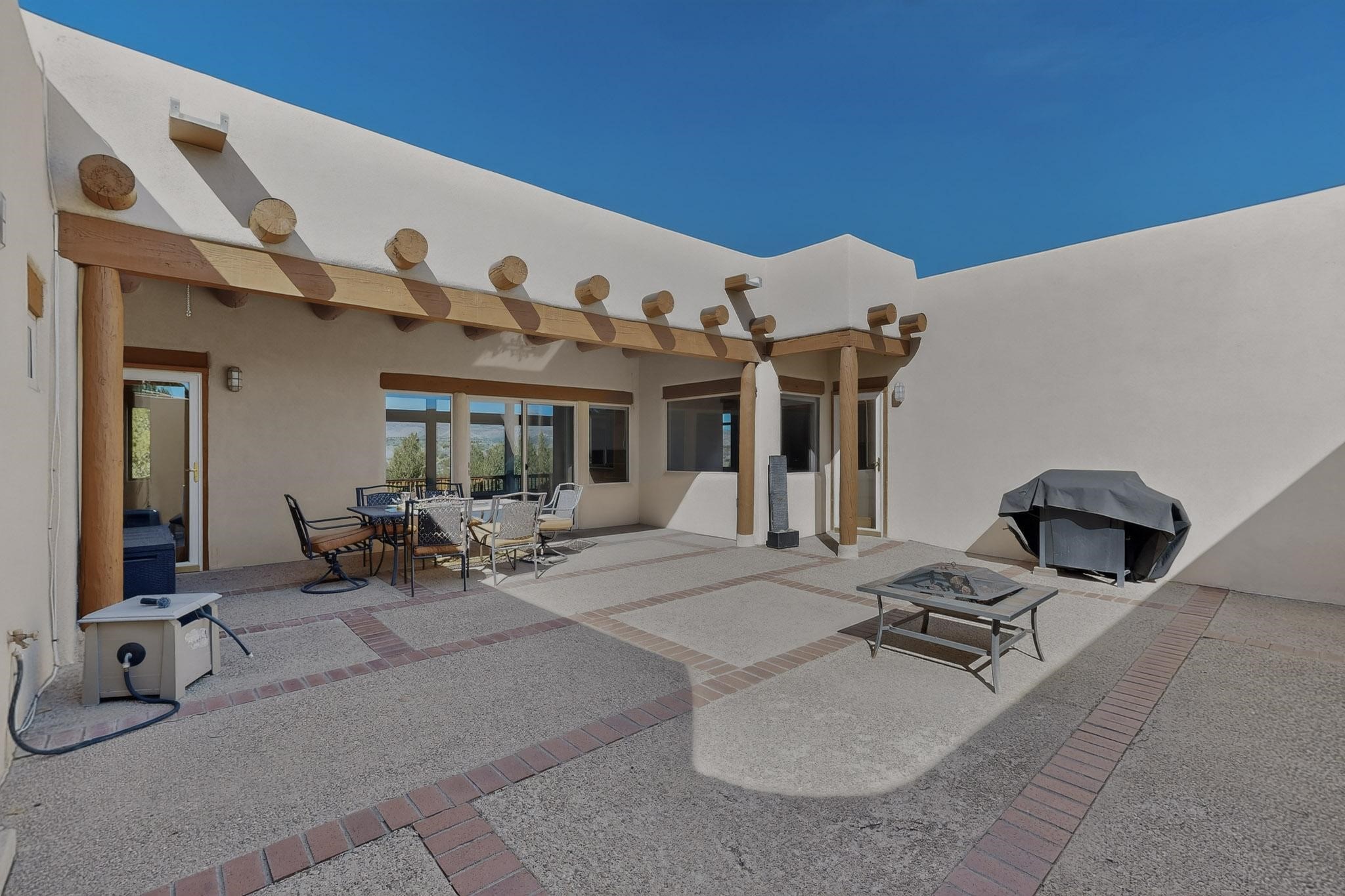 Lovely and bright open concept Santa Fe style 3 bedroom, 4 bathroom 3340 sq ft home plus an additional large walled private courtyard and a second lot to provide preservation of line of sight dramatic views of sunsets and the Jemez Mountains from the living room, dining area and the large exterior patio/deck. This home's spacious kitchen includes a granite island, granite counters, newer appliances, plenty of cabinets and a breakfast nook. In the primary suite, there are two bedrooms and two baths. The main bedroom has a walk-in closet and a bath with a walk-in shower and sauna. The 3rd bedroom is part of a guest suite which includes a full bath and a refrigerator. The guest suite can be accessed without entering the main residence. Other highlights for this exceptional home include kiva fireplace, vigas, skylights, a separate half-bath, 4 ceiling fans, 2 swamp coolers, a two car garage and a fenced area for pets. Enjoy yourself in this home about 30 minutes from Santa Fe or Albuquerque.