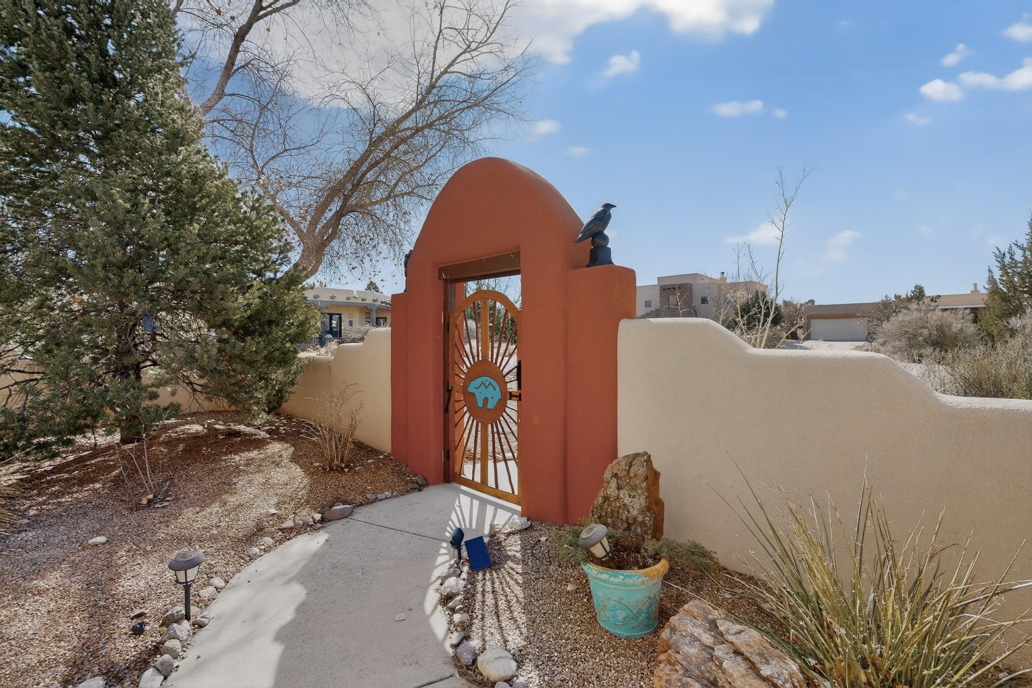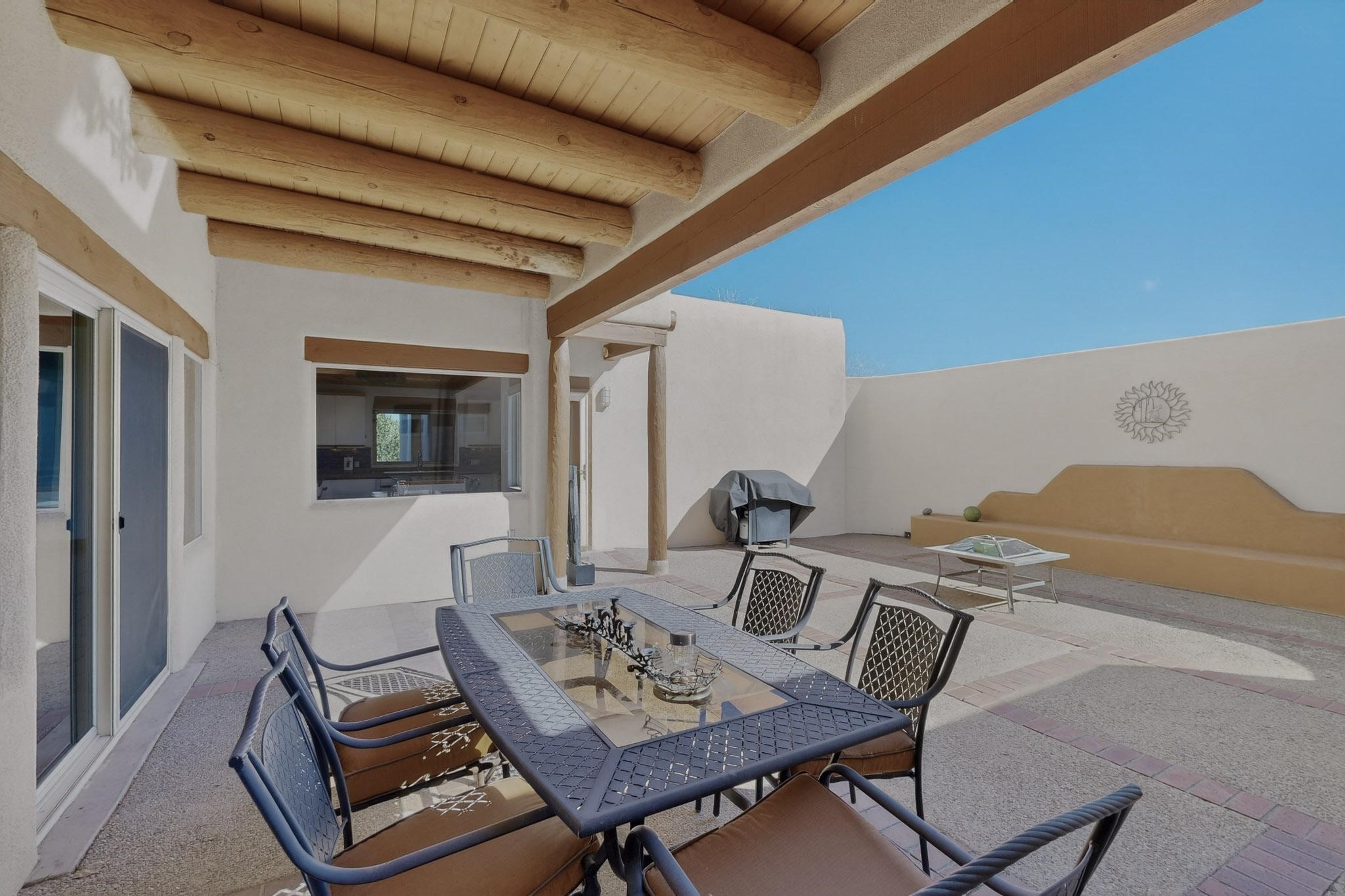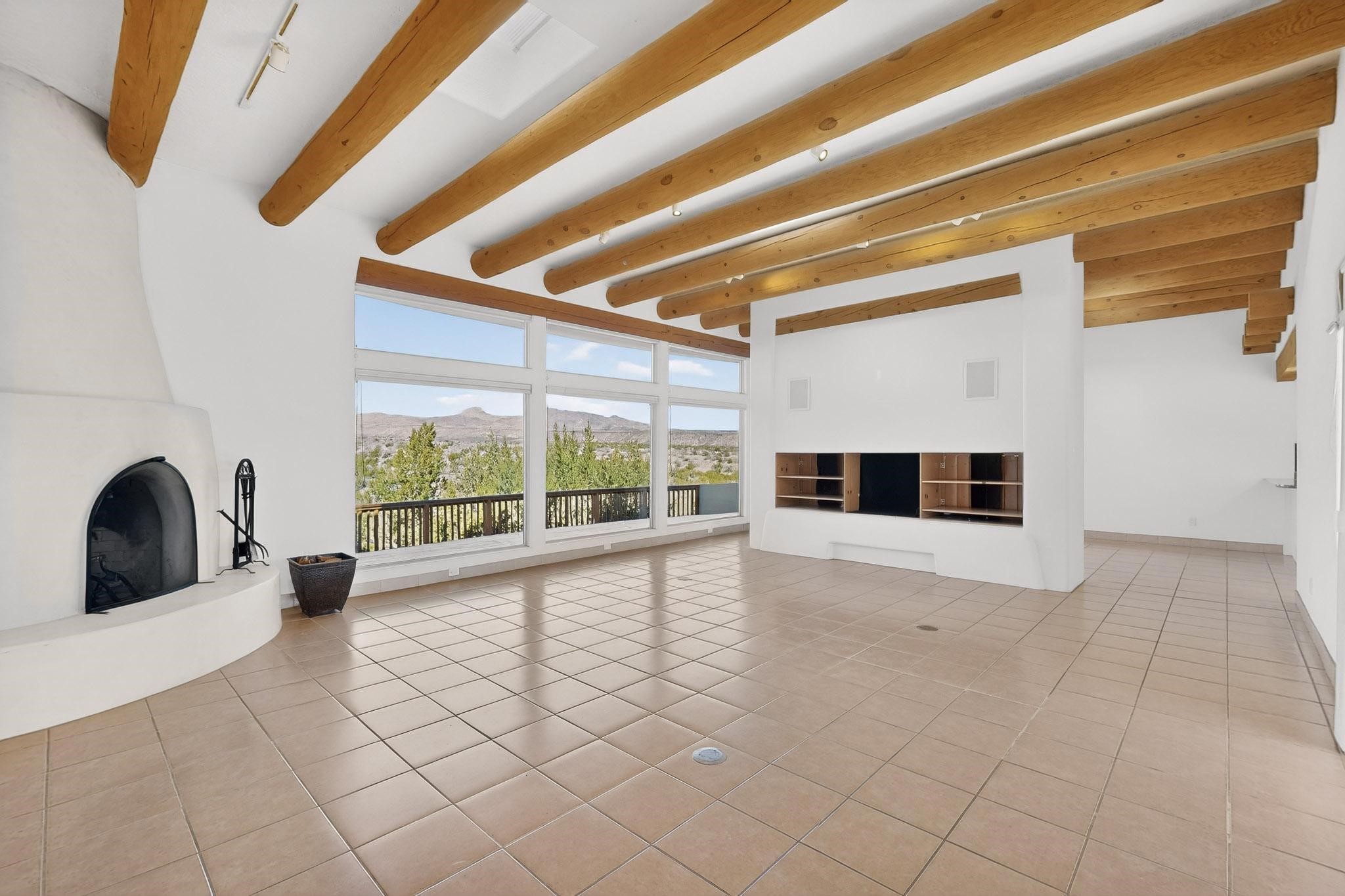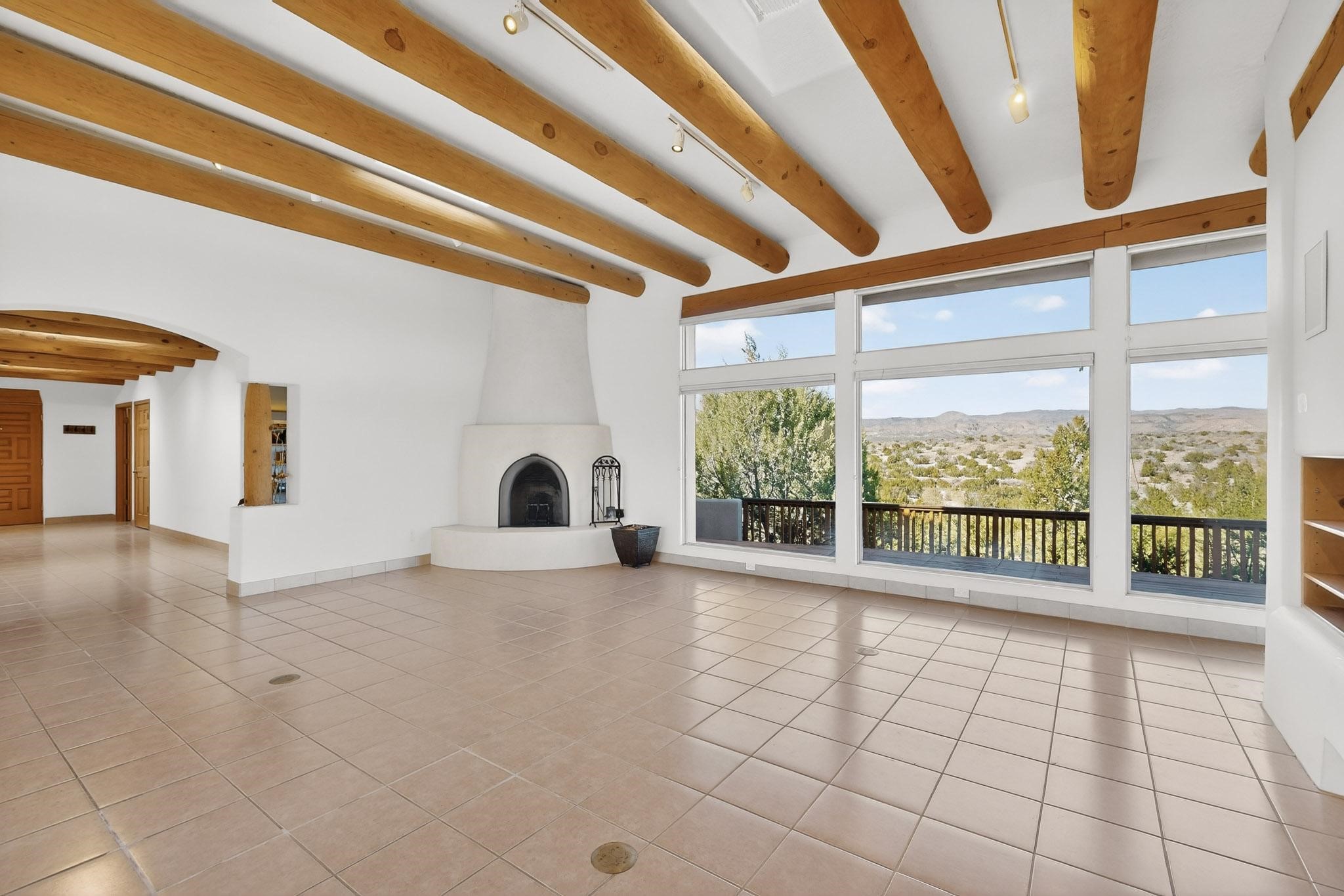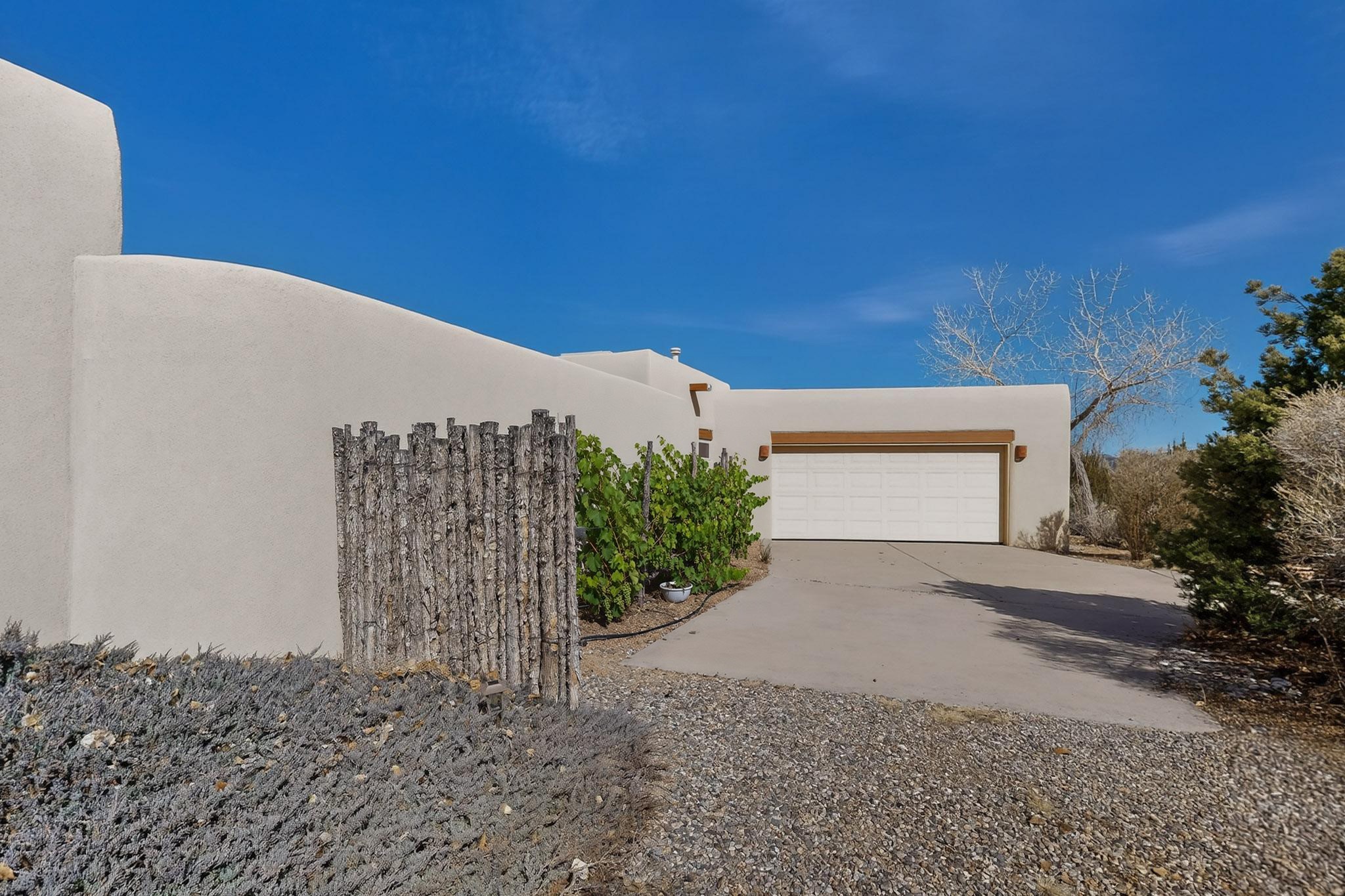 Lovely and bright open concept Santa Fe style 3 bedroom, 4 bathroom 3340 sq ft home plus an additional large walled private courtyard and a second lot to provide preservation of line of sight dramatic views of sunsets and the Jemez Mountains from the living room, dining area and the large exterior patio/deck. This home's spacious kitchen includes a granite island, granite counters, newer appliances, plenty of cabinets and a breakfast nook. In the primary suite, there are two bedrooms and two baths. The main bedroom has a walk-in closet and a bath with a walk-in shower and sauna. The 3rd bedroom is part of a guest suite which includes a full bath and a refrigerator. The guest suite can be accessed without entering the main residence. Other highlights for this exceptional home include kiva fireplace, vigas, skylights, a separate half-bath, 4 ceiling fans, 2 swamp coolers, a two car garage and a fenced area for pets. Enjoy yourself in this home about 30 minutes from Santa Fe or Albuquerque.