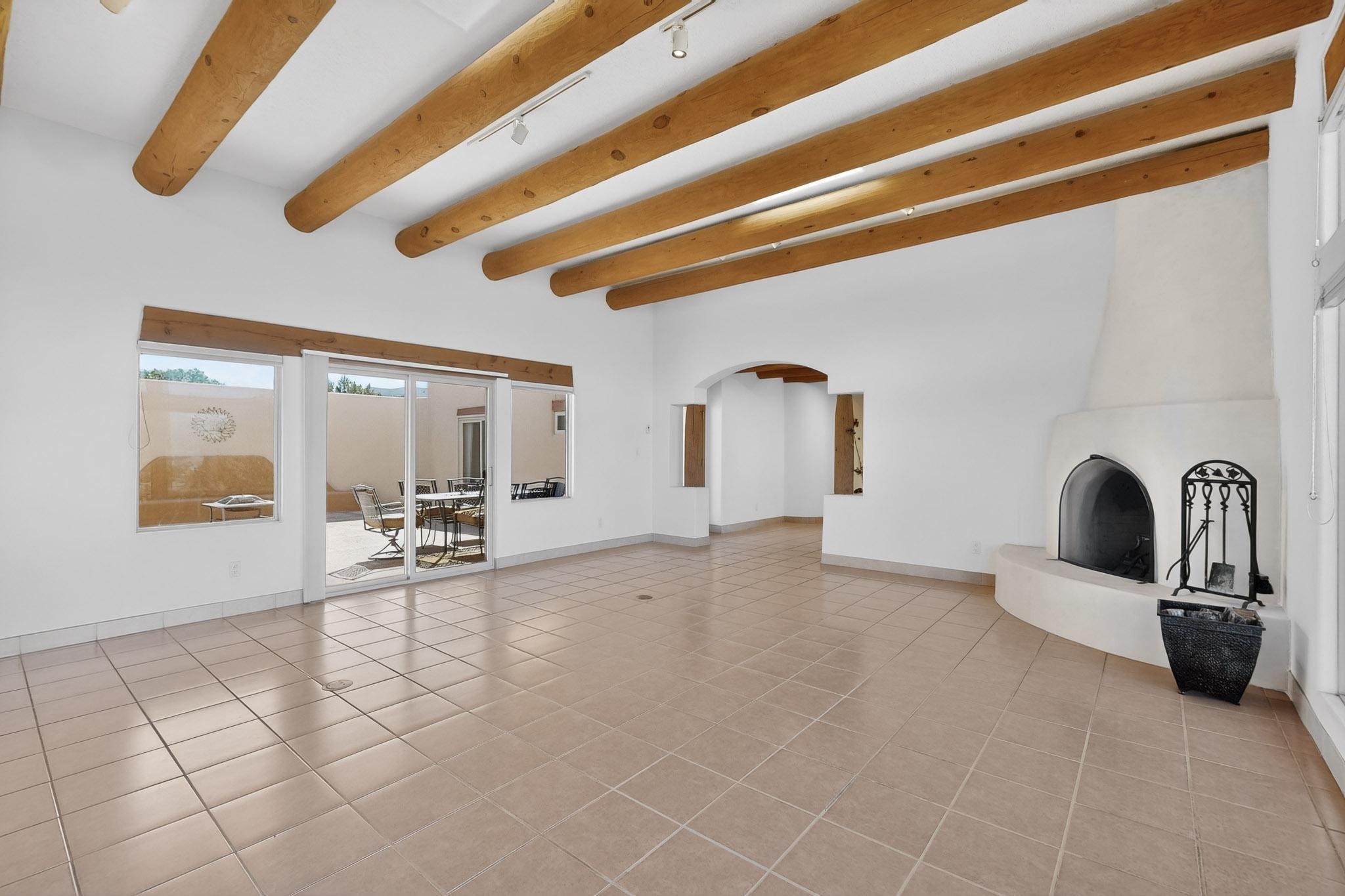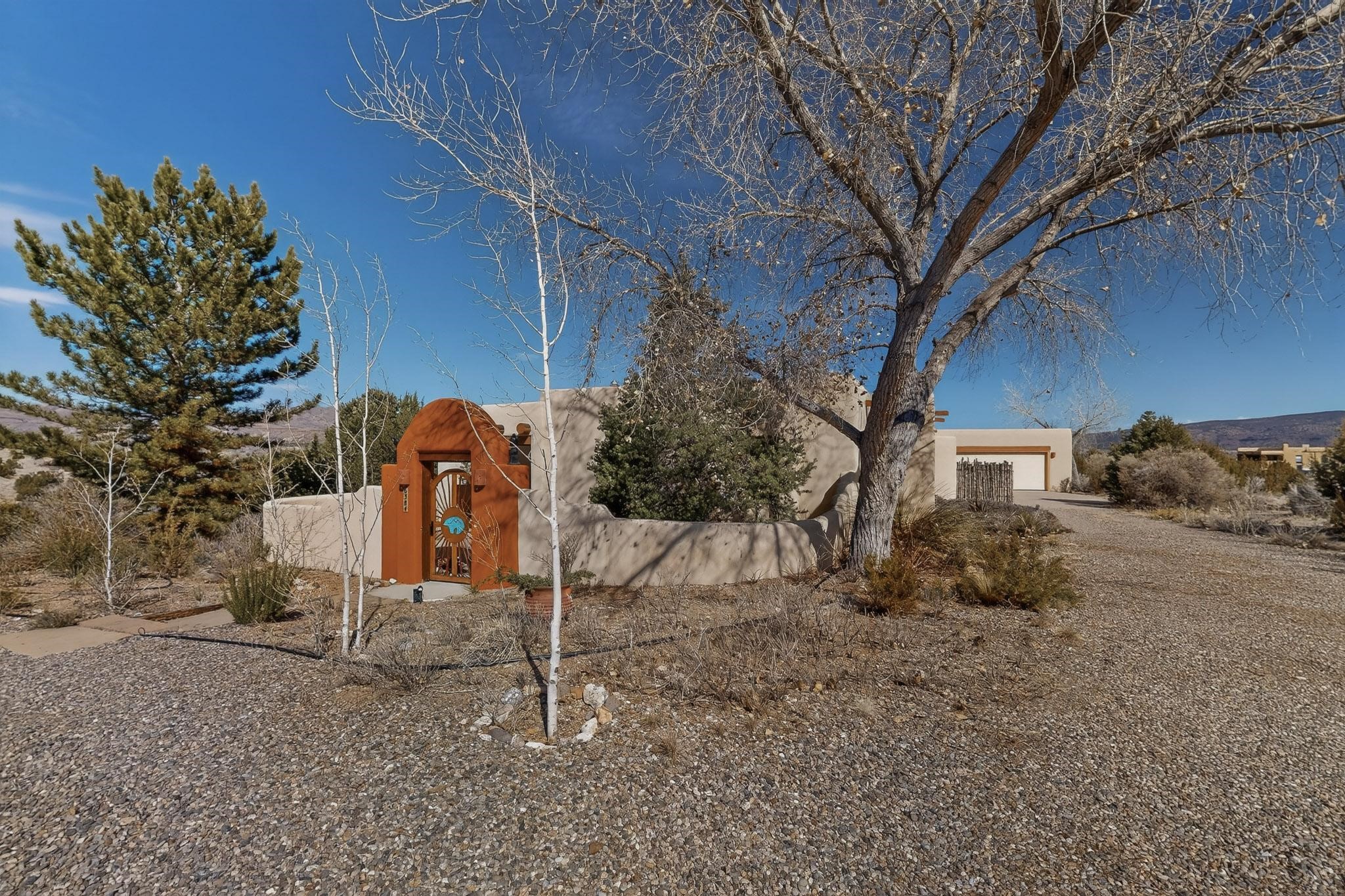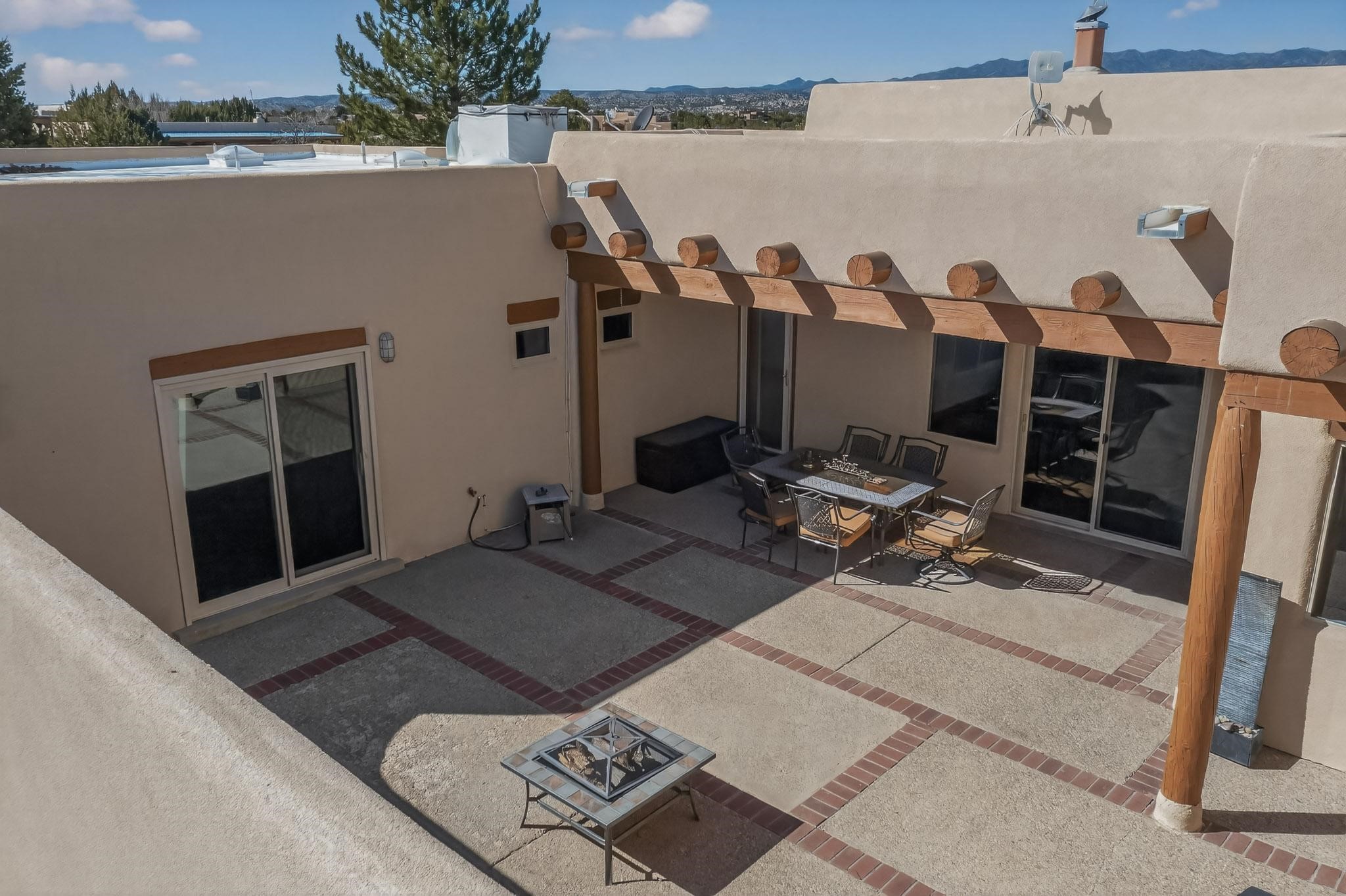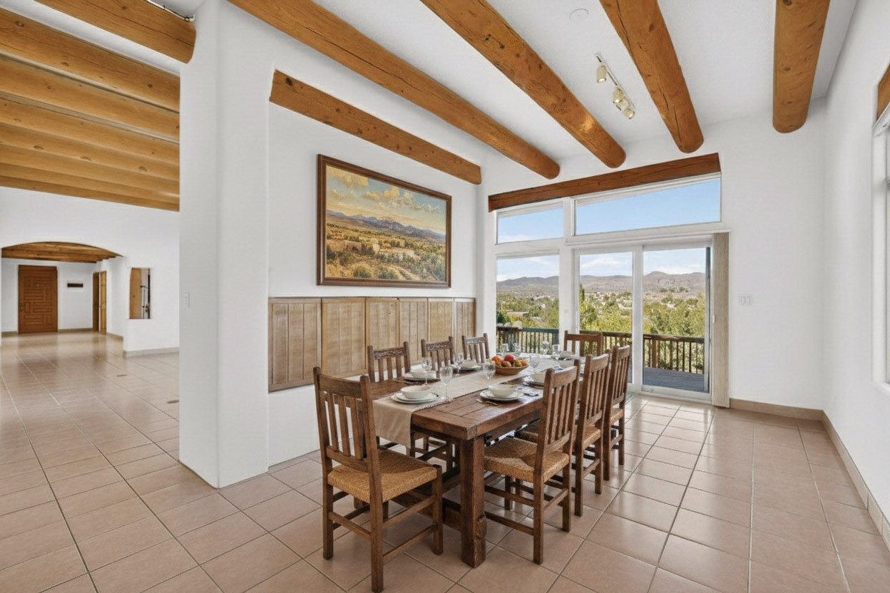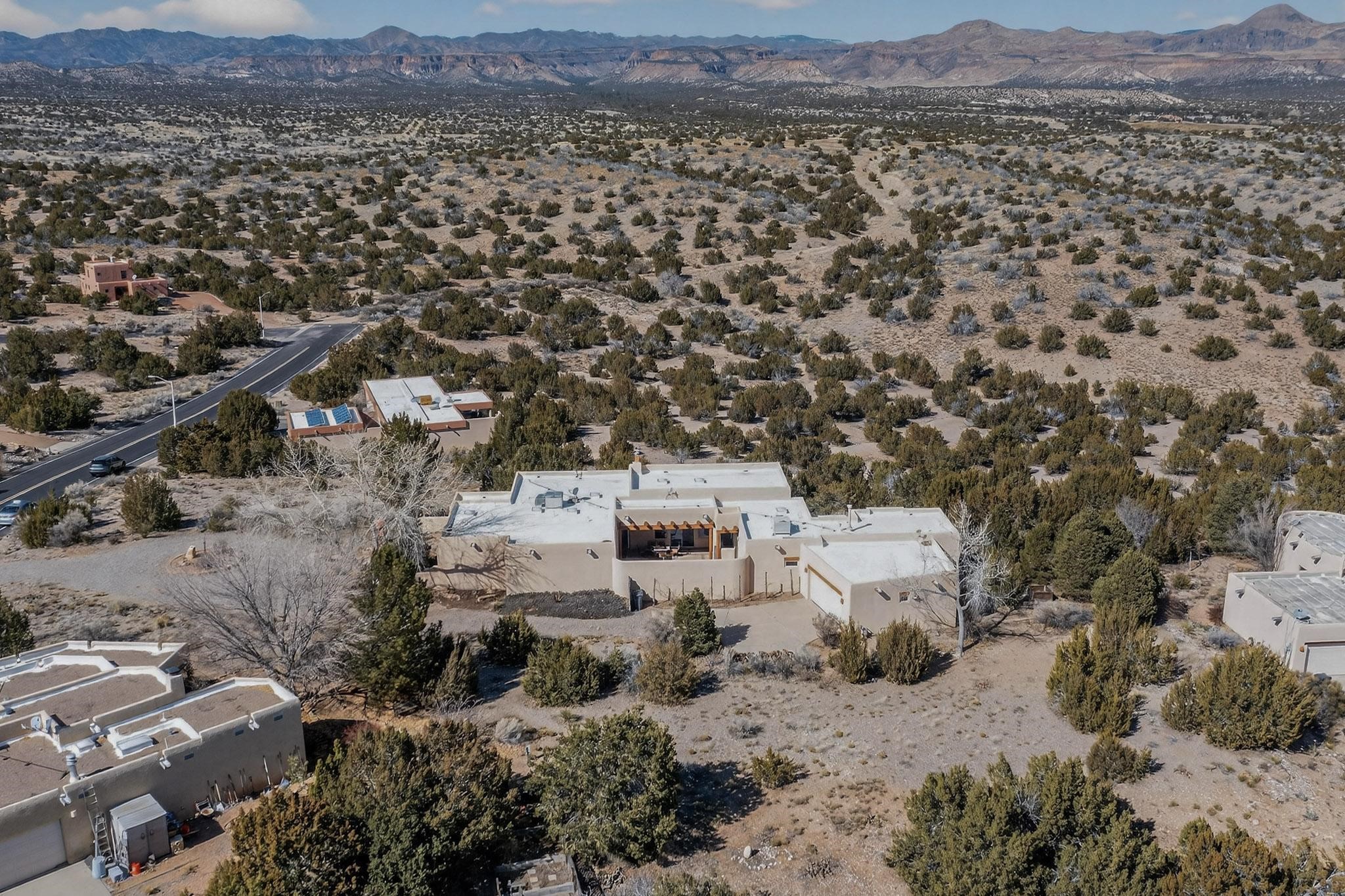Lovely and bright open concept Santa Fe style 3 bedroom, 4 bathroom 3340 sq ft home plus an additional large walled private courtyard and a second lot to provide preservation of line of sight dramatic views of sunsets and the Jemez Mountains from the living room, dining area and the large exterior patio/deck. This home's spacious kitchen includes a granite island, granite counters, newer appliances, plenty of cabinets and a breakfast nook. In the primary suite, there are two bedrooms and two baths. The main bedroom has a walk-in closet and a bath with a walk-in shower and sauna. The 3rd bedroom is part of a guest suite which includes a full bath and a refrigerator. The guest suite can be accessed without entering the main residence. Other highlights for this exceptional home include kiva fireplace, vigas, skylights, a separate half-bath, 4 ceiling fans, 2 swamp coolers, a two car garage and a fenced area for pets. Enjoy yourself in this home about 30 minutes from Santa Fe or Albuquerque.