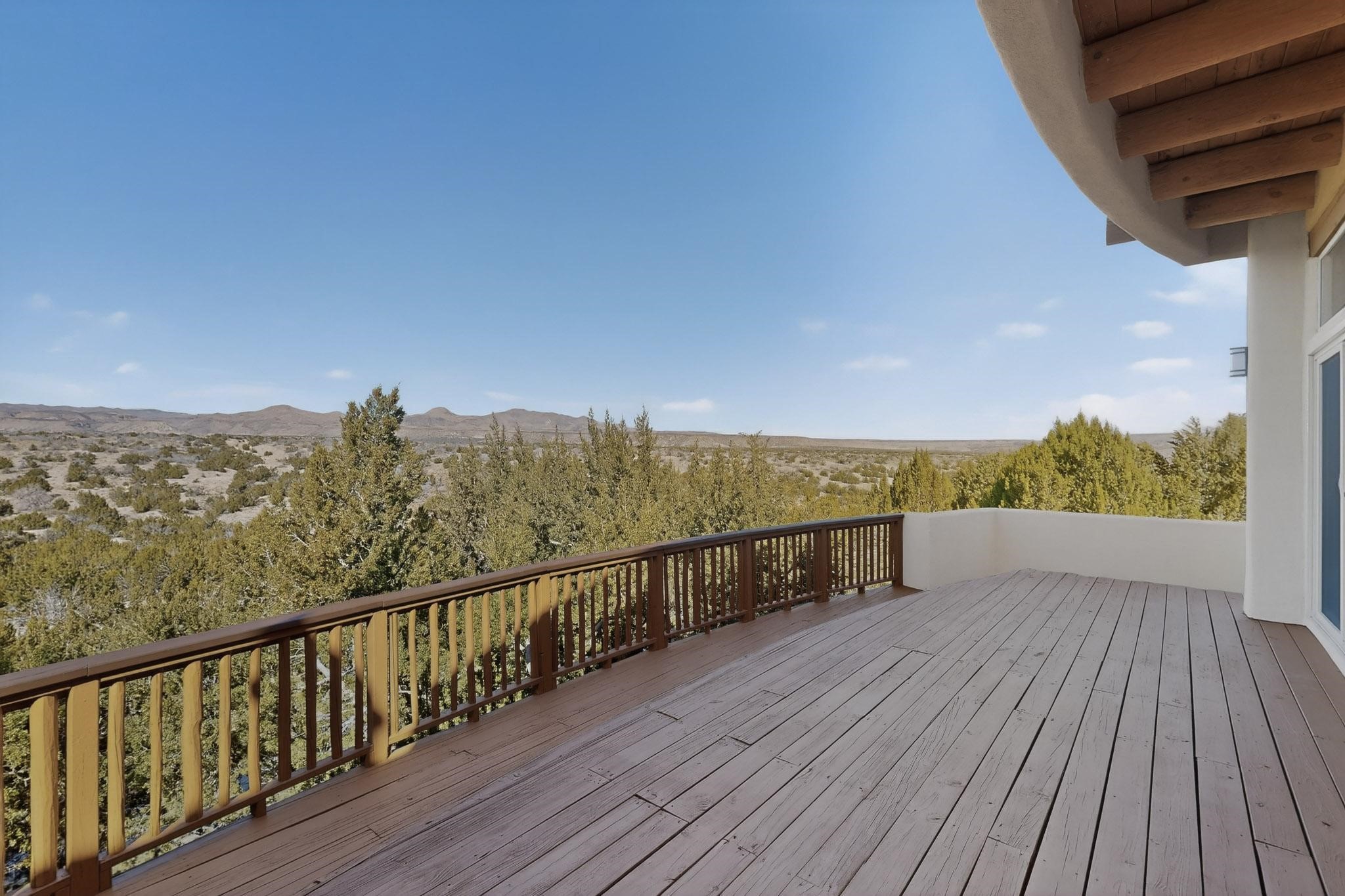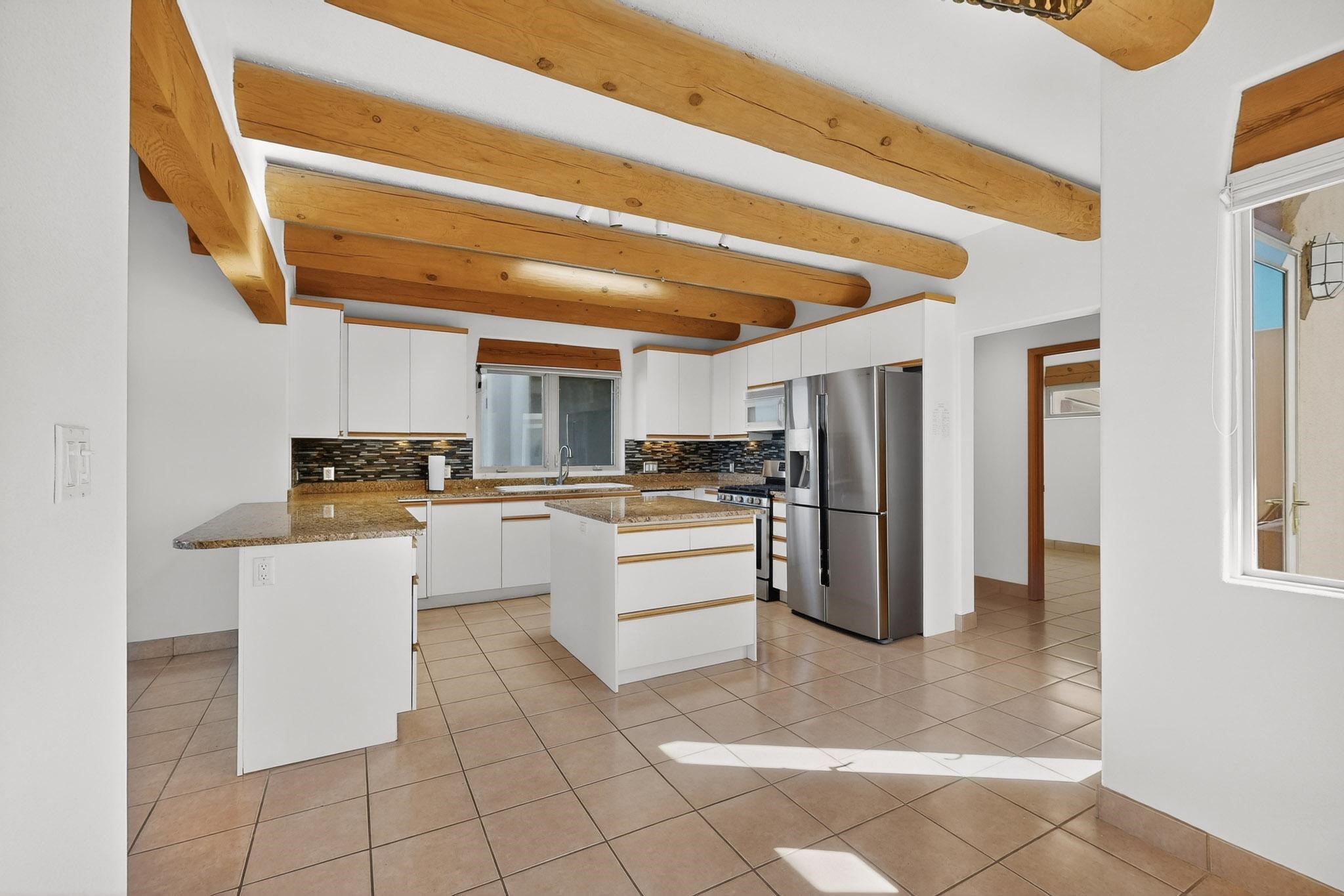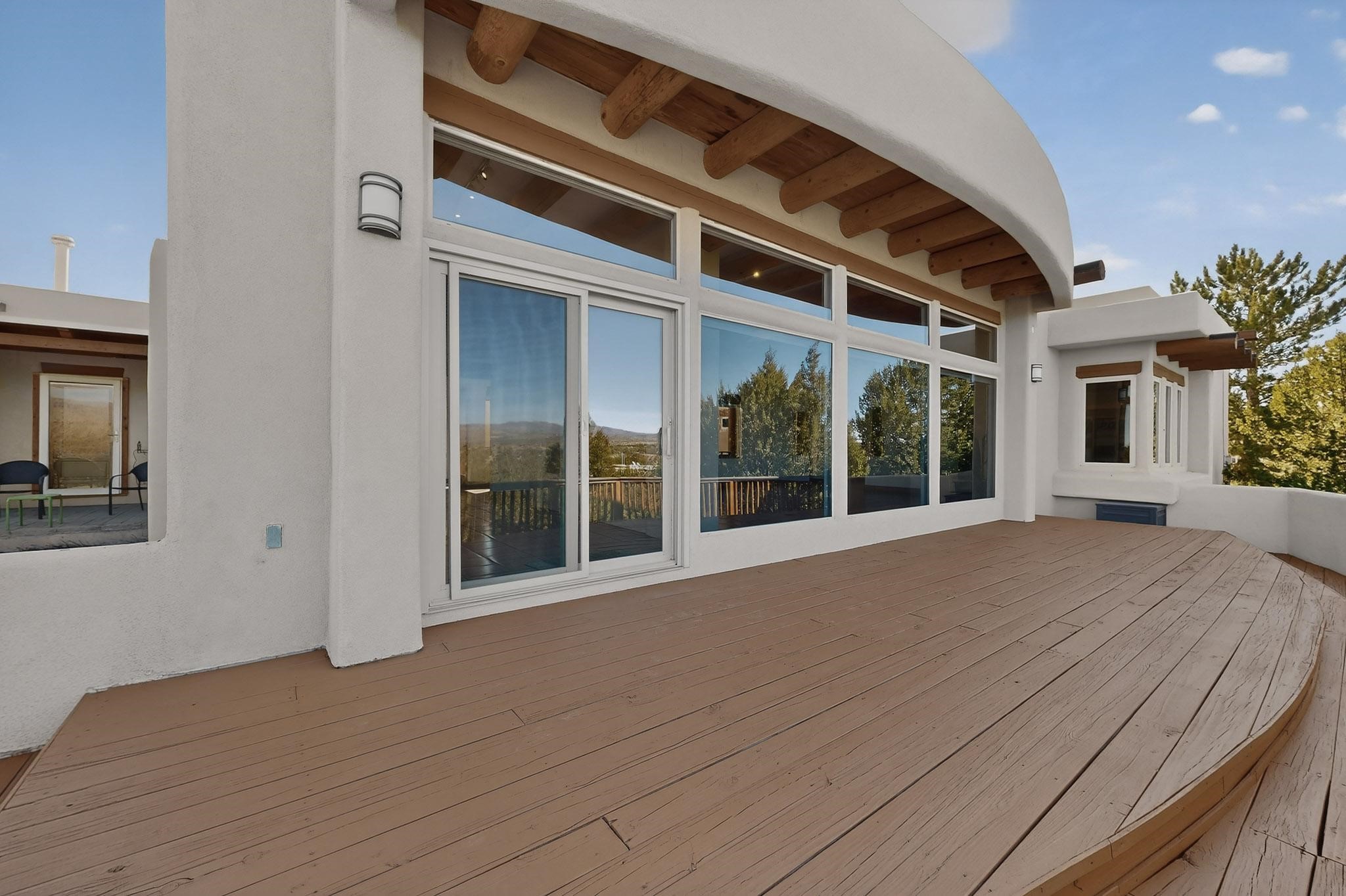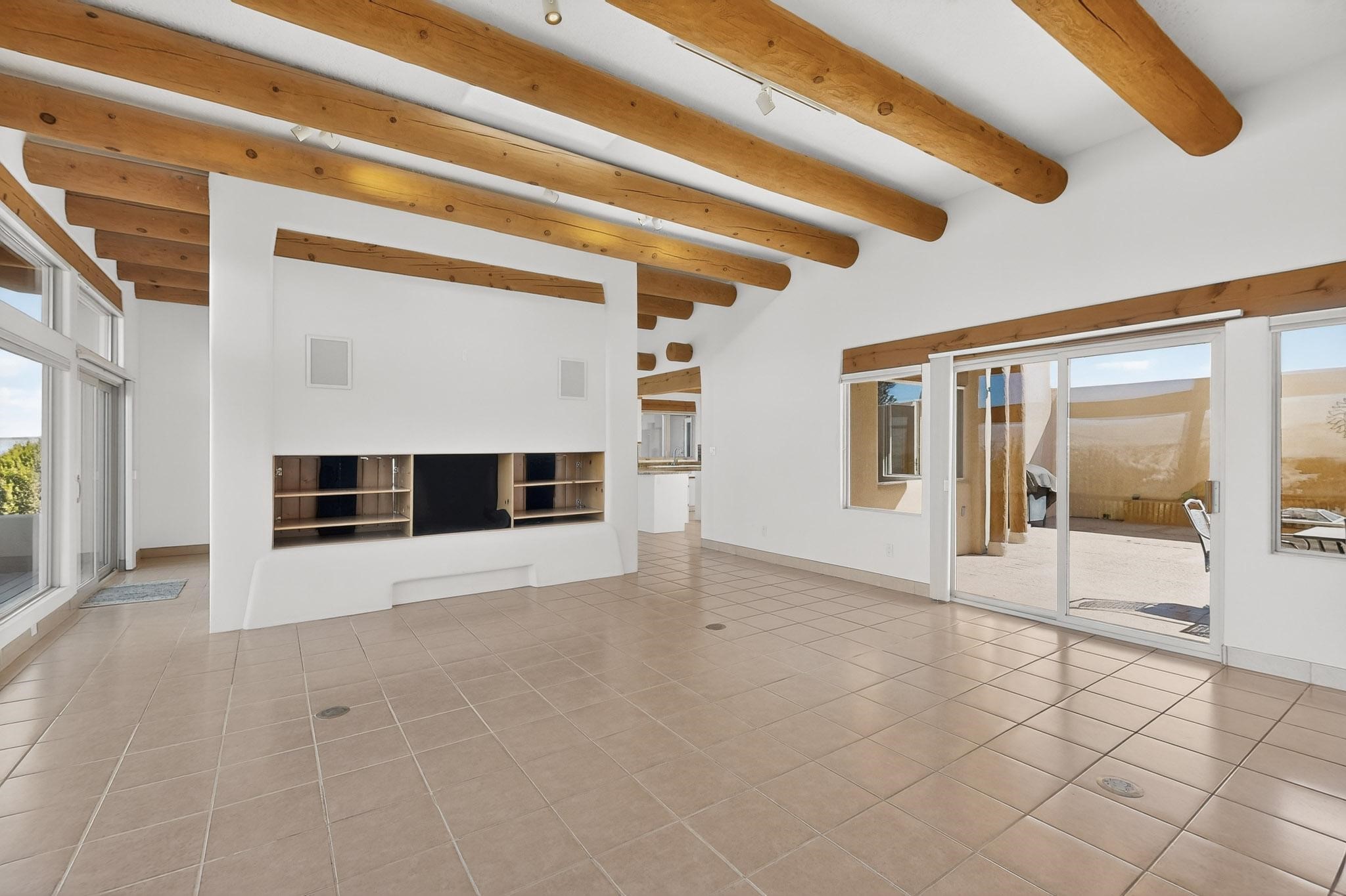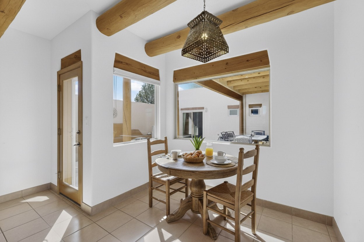 Lovely and bright open concept Santa Fe style 3 bedroom, 4 bathroom 3340 sq ft home plus an additional large walled private courtyard and a second lot to provide preservation of line of sight dramatic views of sunsets and the Jemez Mountains from the living room, dining area and the large exterior patio/deck. This home's spacious kitchen includes a granite island, granite counters, newer appliances, plenty of cabinets and a breakfast nook. In the primary suite, there are two bedrooms and two baths. The main bedroom has a walk-in closet and a bath with a walk-in shower and sauna. The 3rd bedroom is part of a guest suite which includes a full bath and a refrigerator. The guest suite can be accessed without entering the main residence. Other highlights for this exceptional home include kiva fireplace, vigas, skylights, a separate half-bath, 4 ceiling fans, 2 swamp coolers, a two car garage and a fenced area for pets. Enjoy yourself in this home about 30 minutes from Santa Fe or Albuquerque.
