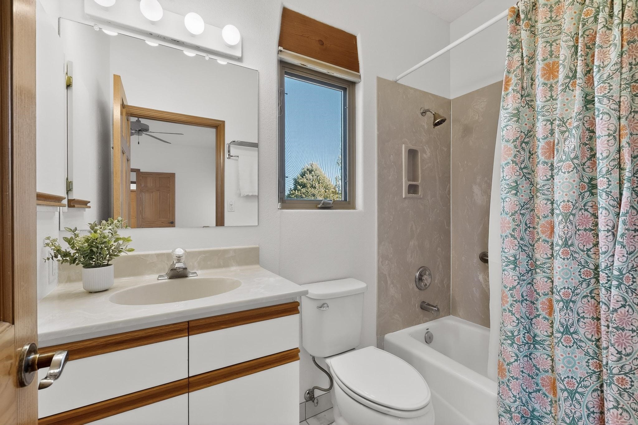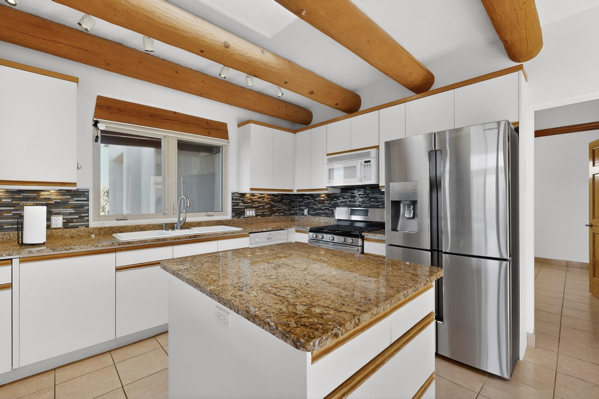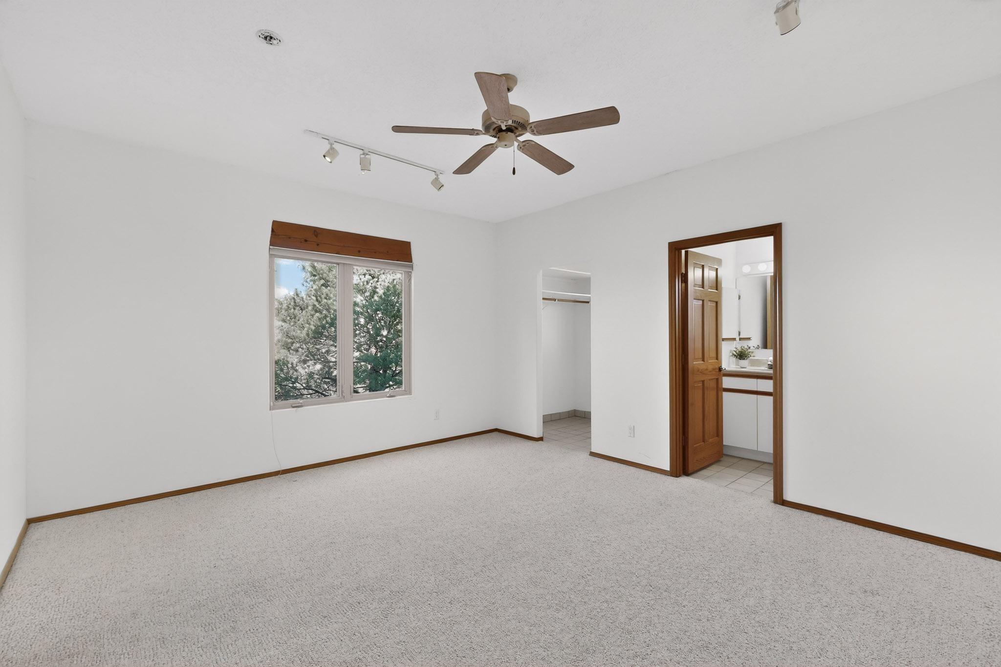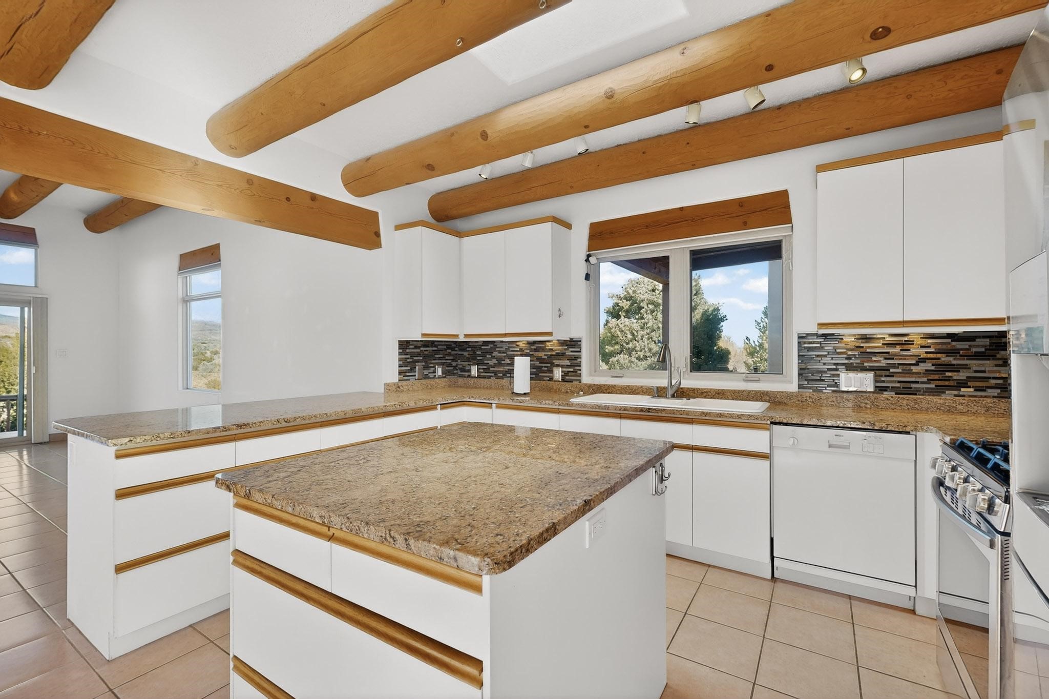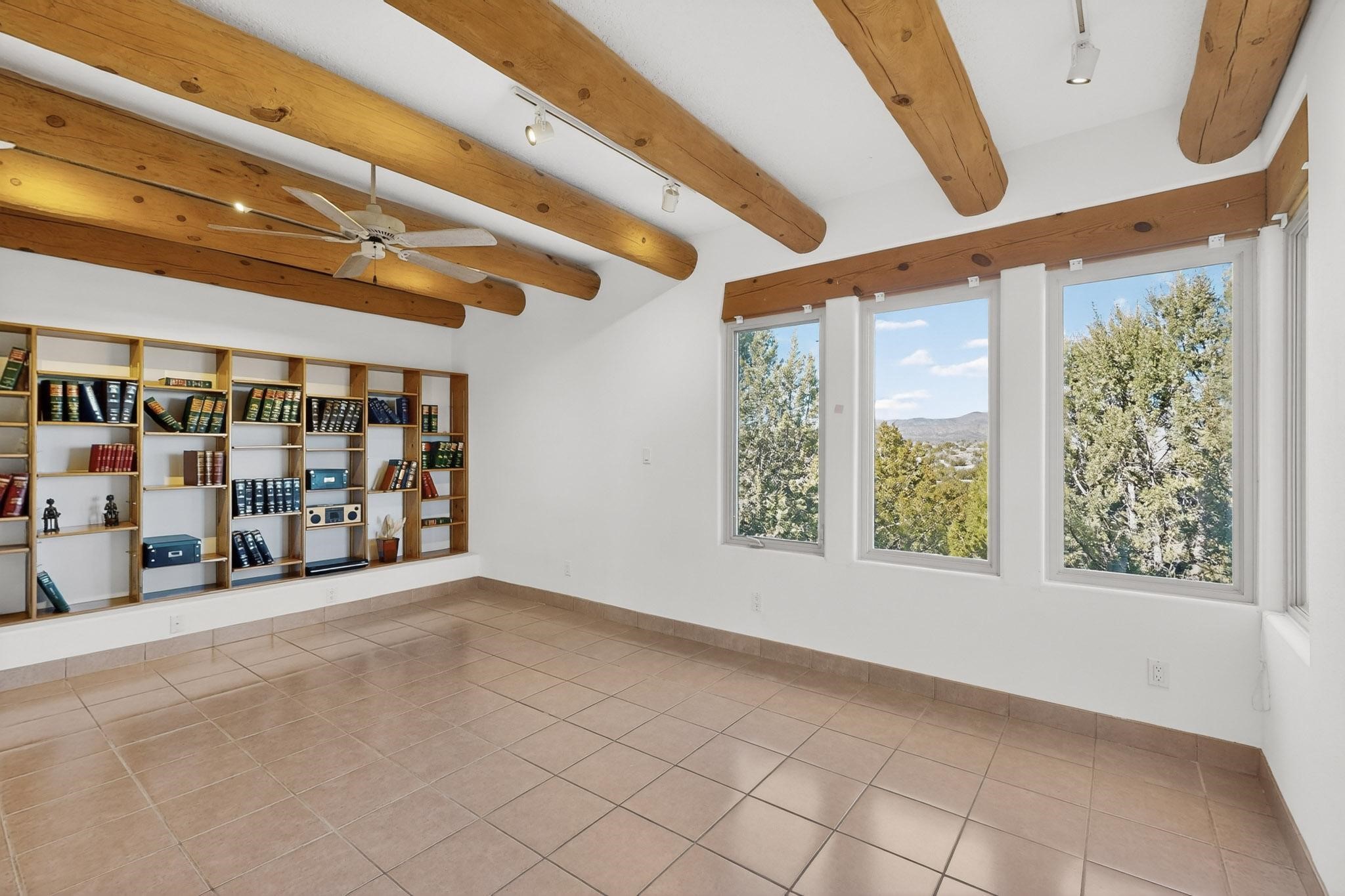 Lovely and bright open concept Santa Fe style 3 bedroom, 4 bathroom 3340 sq ft home plus an additional large walled private courtyard and a second lot to provide preservation of line of sight dramatic views of sunsets and the Jemez Mountains from the living room, dining area and the large exterior patio/deck. This home's spacious kitchen includes a granite island, granite counters, newer appliances, plenty of cabinets and a breakfast nook. In the primary suite, there are two bedrooms and two baths. The main bedroom has a walk-in closet and a bath with a walk-in shower and sauna. The 3rd bedroom is part of a guest suite which includes a full bath and a refrigerator. The guest suite can be accessed without entering the main residence. Other highlights for this exceptional home include kiva fireplace, vigas, skylights, a separate half-bath, 4 ceiling fans, 2 swamp coolers, a two car garage and a fenced area for pets. Enjoy yourself in this home about 30 minutes from Santa Fe or Albuquerque.