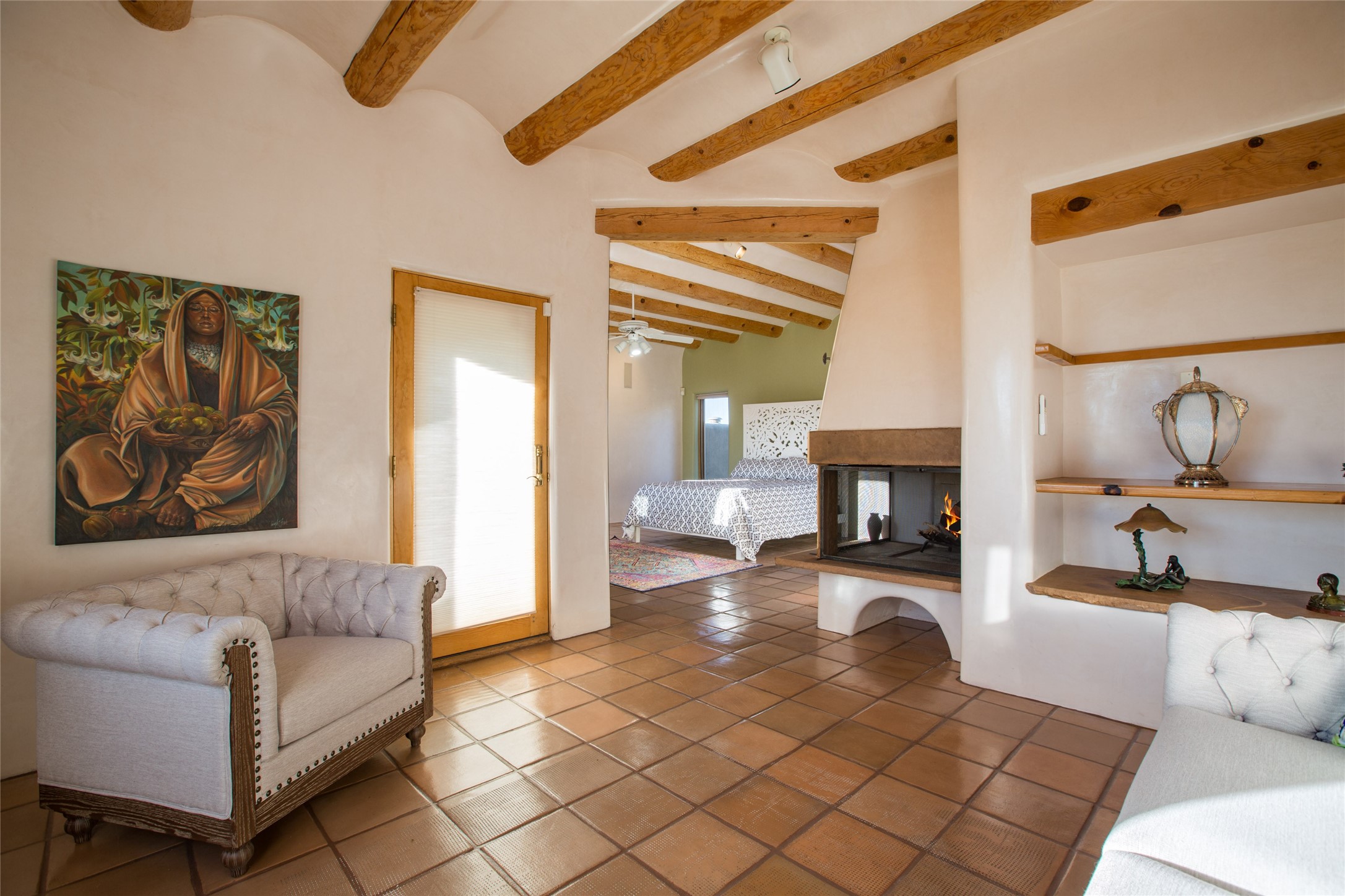 Escape to an Unrivaled Sanctuary Crafted to Capture Unbeatable Sunrises, Sunsets, Sweeping Mountain VIEWS, City Lights, & over an acre. Features 3 Ensuites, Dining Room, Vigas, Diamond Plaster, Nichos, Saltillo Flooring, Kitchen w/SS Bosch Stove Top, Refrigerator & DW, Thermador Oven-Bonco Seating, Fireplace, Mini Splits, & Powder Room. Spacious Primary Suite, offers Sumptuous Embellishments, VIEWS, Dual Sinks & Walk In Closets, Massive Shower-Tub, Fireplace, Flex Area, Built-Ins & access to Patio. Split Floor Plan offers 2 Private Ensuites, Abundance of Natural Light, 1 Ensuite w/a Fireplace-Steam Shower, & both designed to provide access to Patio w/VIEWS. Generous Laundry Room, Walk-in Pantry-Sink, & Ample Storage. Elevated Entertaining areas, Unique Triple Layer Water Fall, Landscaping, Crab Apple, Cherry, Apricot Trees, Irrigation System, Expansive Wrap-Around Patio w/Fireplace, New Roof & Stucco 2024. Oversized 2 Car Garage-Heated-Finished, Shelving, Dual Water Softeners & Storage Shed. Minutes to Historic Plaza, Ten Thousand Waves, Santa Fe Ski Resort, Restaurants, Shopping, & Endless Parks/Trails.FURNITURE & ARTWORK CONVEYS WITH SALE, EXCEPT FOR A FEW PIECES OF ART.