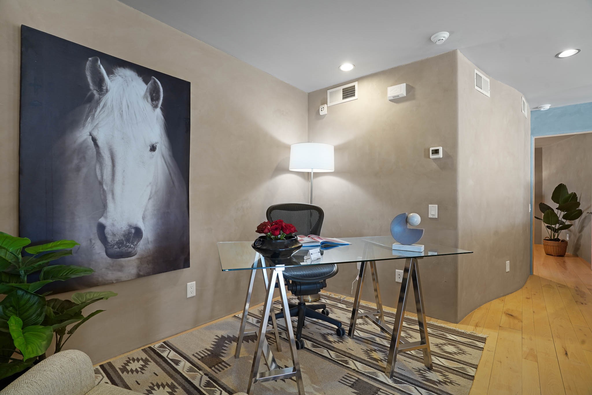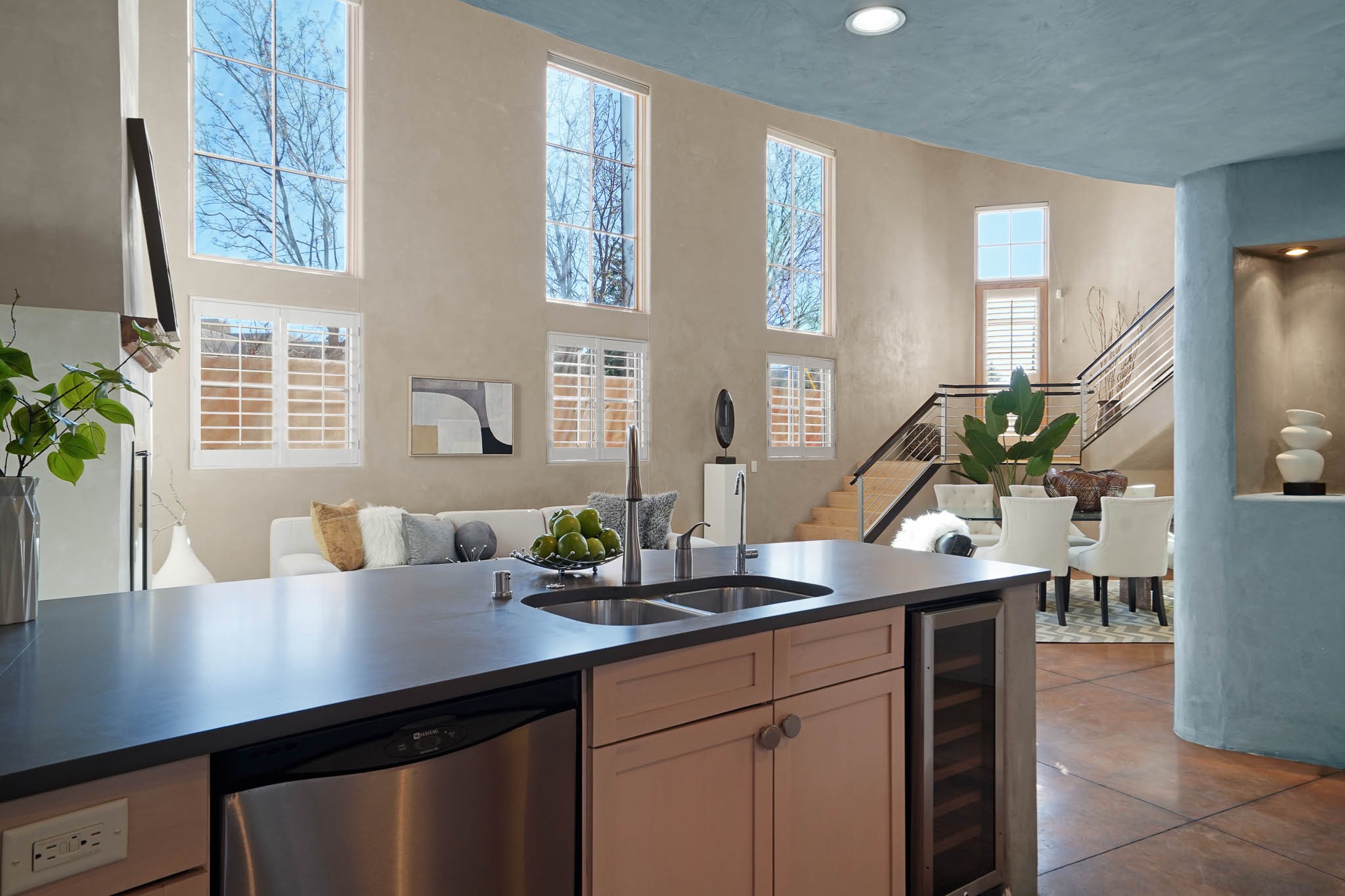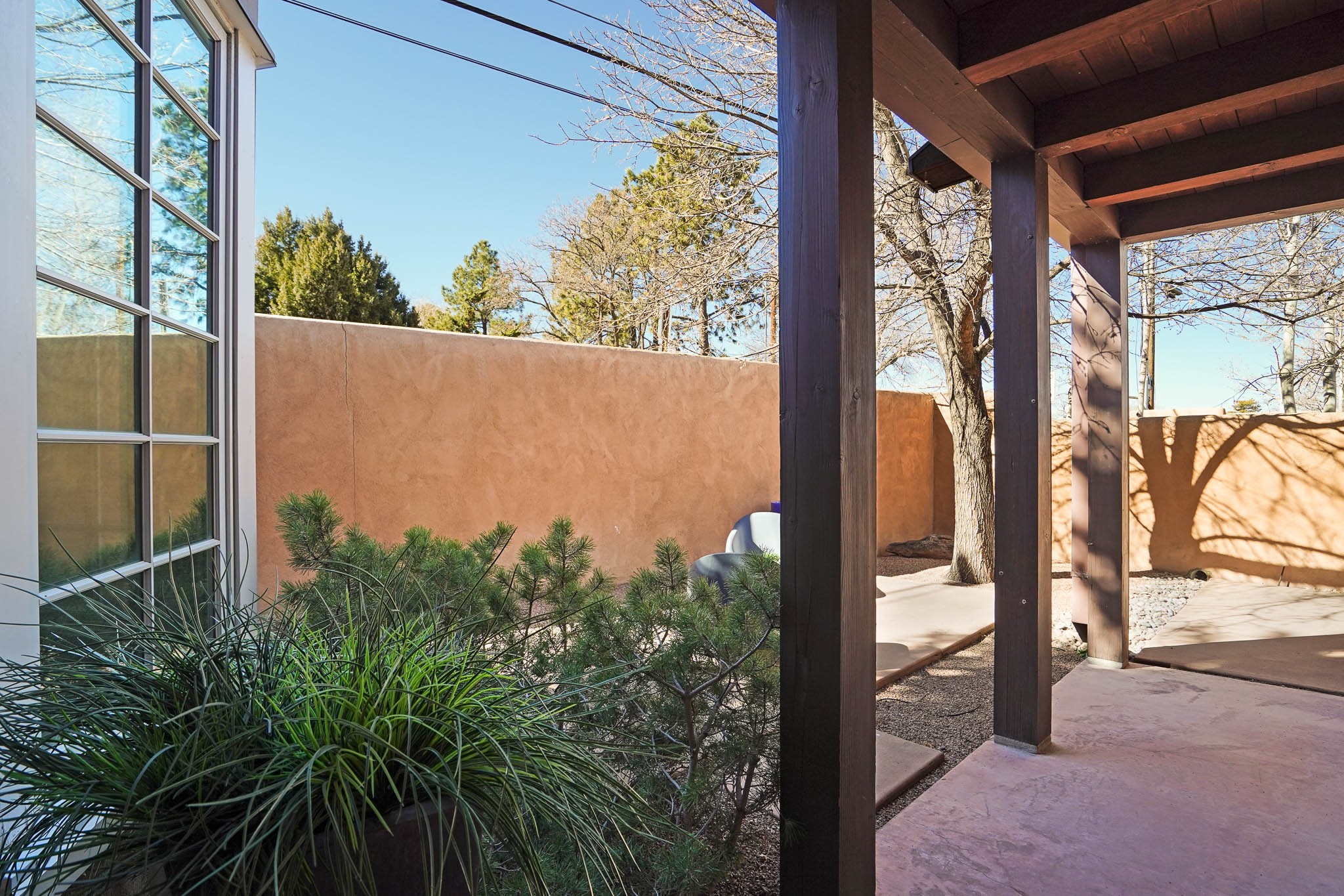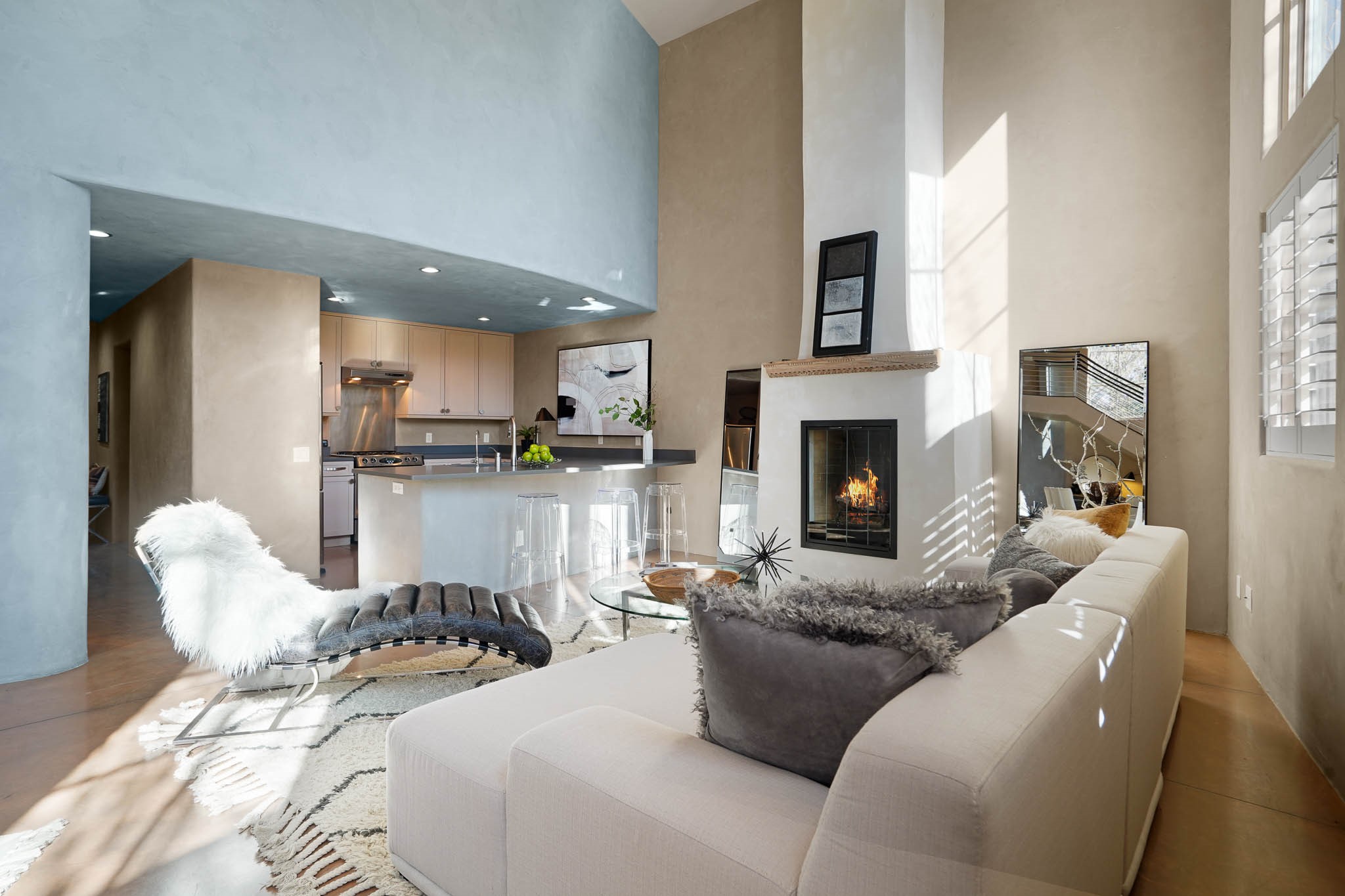 Stylish and thoughtfully designed, this light-filled condo is just steps from Kaune's Neighborhood Market and within walking distance of many of Santa Fe's most beloved destinations. Blending modern comfort with timeless Southwest charm, this home offers an ideal balance of convenience, elegance, and versatility. A private gated front courtyard shaded by graceful Aspen trees welcomes you home and provides a peaceful setting for morning coffee or evening relaxation. Inside, the open-concept main level features soaring ceilings, expansive windows, and American clay walls that beautifully reflect the natural light. A gas log fireplace adds warmth and ambiance, while the chef's kitchen is equipped with high-end appliances and a spacious island perfect for gathering with family and friends. The first floor also includes a comfortable guest bedroom and full bathroom, offering privacy and convenience for visitors. Upstairs, a sunlit landing creates an inviting space for a home office or reading nook. The primary suite serves as a tranquil retreat with picturesque views and a sleek ensuite bathroom. A dedicated laundry area within the primary closet adds everyday ease. Designed for low-maintenance living, this home is an ideal lock-and-leave property. Enjoy year-round comfort with radiant heat, central air conditioning, and a two-car garage.Zoned RAC for multi-purpose use, the property offers rare flexibility in one of Santa Fe's most desirable locations. Schedule your showing today and experience the very best of Santa Fe living.