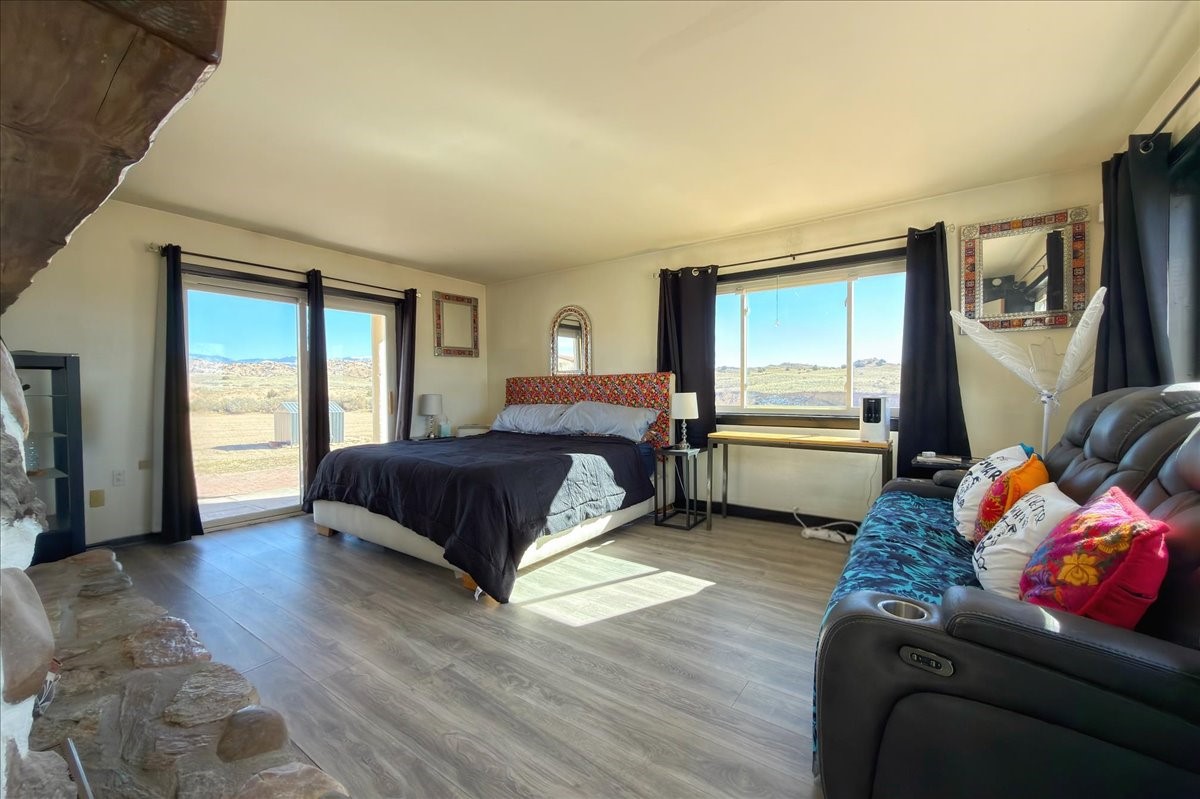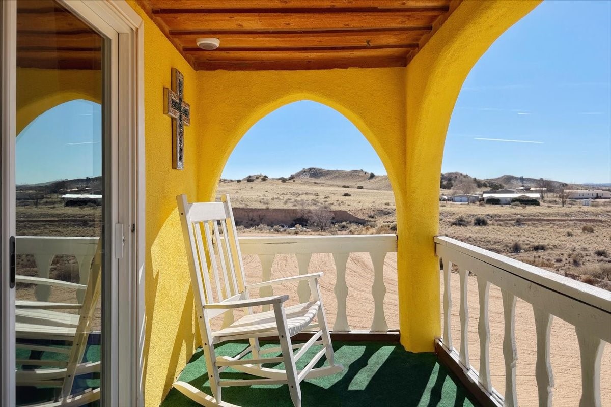 Set on 1.5 private acres with stunning 360-degree views, this beautifully updated home blends sparkle, warmth, and comfort in a peaceful cul-de-sac setting. Featuring 3-4 bedrooms and 3 bathrooms, the home welcomes you with a grand entry, striking lighting, and an open-concept layout designed for both everyday living and entertaining. The main level offers a spacious living area with a cozy pellet stove, a formal dining space highlighted by a gorgeous light fixture, and a bright kitchen updated with granite countertops, a shimmering backsplash, and picturesque views from the sink. A conveniently located laundry room and half bath add ease, while a bonus room or bedroom showcases a beautiful wood-burning fireplace for extra charm. Upstairs, you'll find two generously sized bedrooms with an updated full bath, plus a serene primary suite with an en-suite bathroom and private deck to take in even more breathtaking scenery. Additional features include newer windows, a fenced yard, outbuildings with a detached garage/shop and large shed for storage or projects. The roof and septic system are only seven years old, offering peace of mind. Enjoy quiet country living with easy access to Santa Fe, Espaola, and Los Alamos--privacy, beauty, and convenience all in one sparkling, welcoming home.