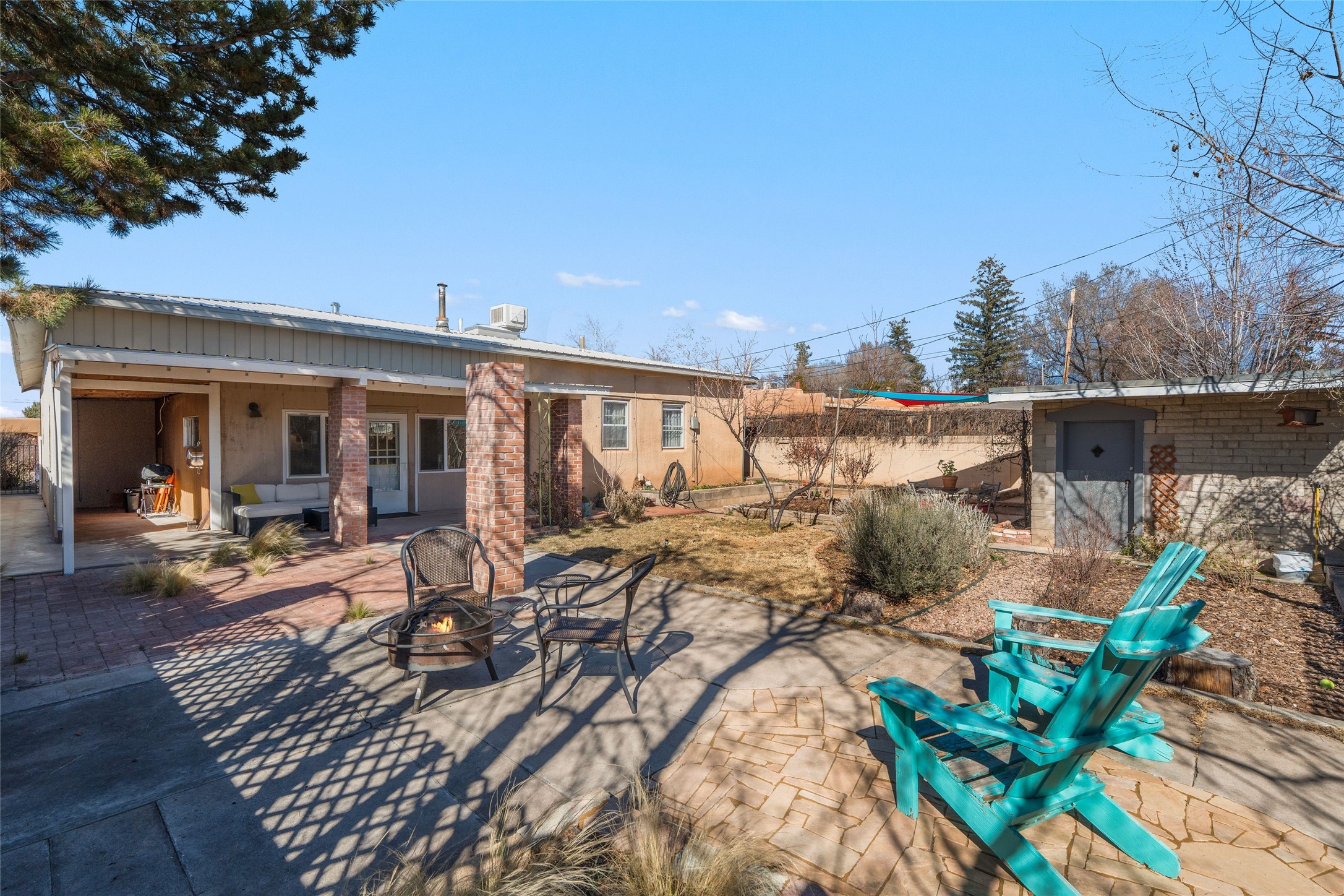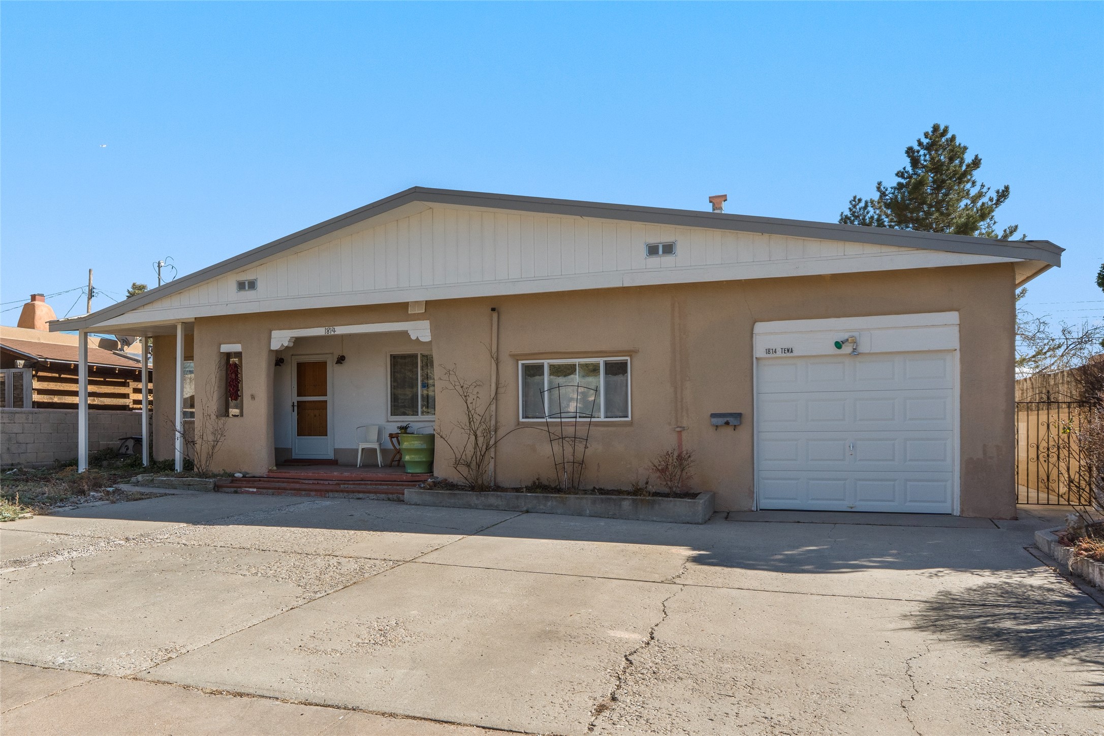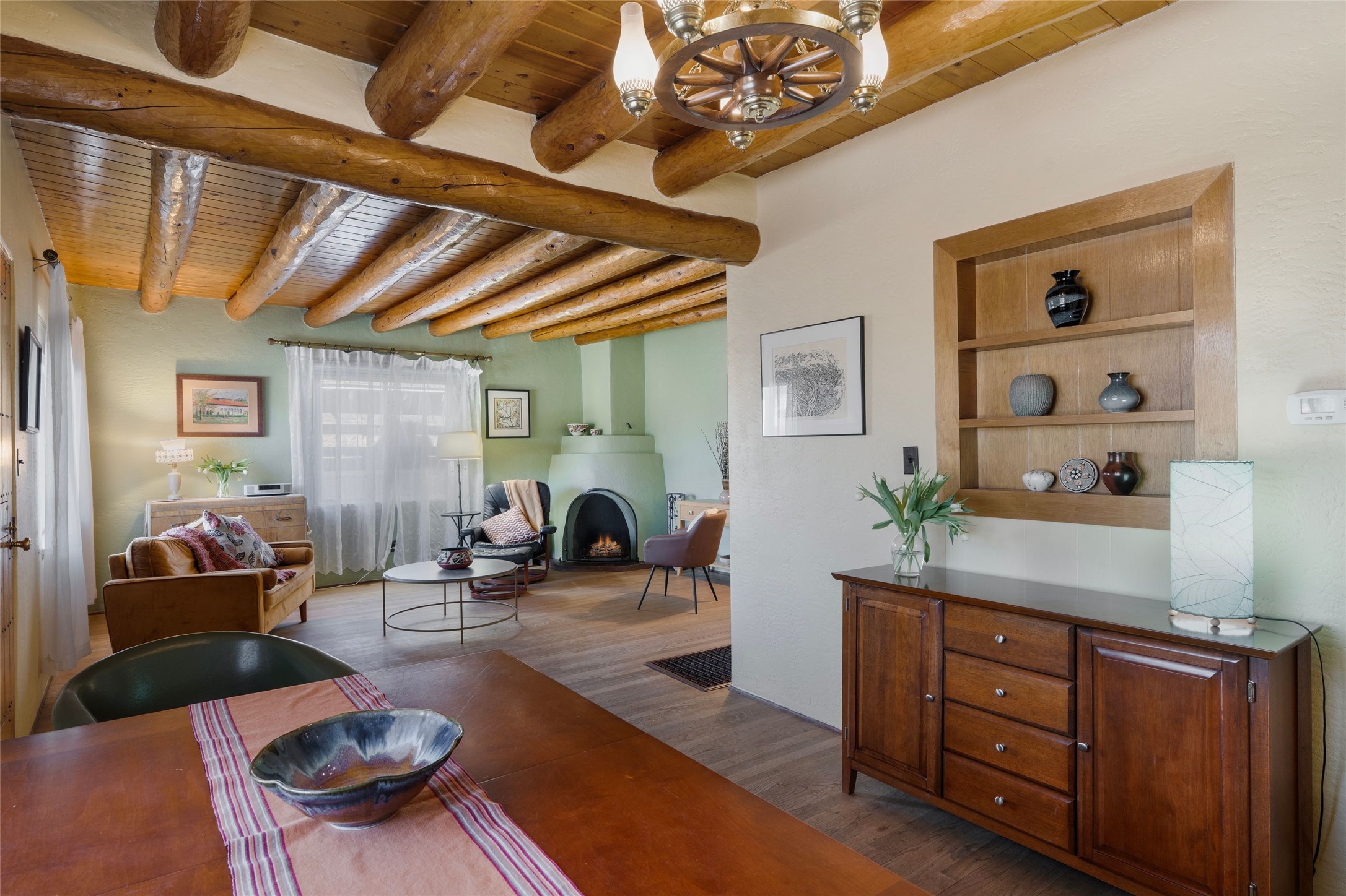 Located in the sought-after Casa Alegre neighborhood, this classic Stamm-built home blends authentic Santa Fe charm with comfortable living. Featuring vigas, a kiva fireplace, original doors, and hardwood floors, the home showcases the timeless character these mid-century properties are known for.Built in 1955, the property offers three bedrooms and two bathrooms, plus a bonus room addition that provides flexible space for a family room, office, or studio. With 1,659 square feet of living space, the home sits on a quiet street in one of Santa Fe's most desirable and convenient locations.The inviting dining area flows seamlessly from the living room into the mid-century kitchen and bonus room, creating a functional and welcoming layout. Enjoy outdoor living on the covered front porch or the covered back patio, perfect for relaxing or entertaining.Outdoor enthusiasts will appreciate the easy access to Frenchy's Field, the River Trail, Ashbaugh Park, the Acequia Trail, and Gregory Lopez Park, all just moments away, while shops and restaurants are only a short drive.Additional features include a storage shed with electricity, ideal for a workshop, studio, or extra storage. An attached one-car garage adds convenience and functionality.Recent upgrades include a new forced-air heating system installed in 2026, an evaporative cooler installed in 2021, remodeled bathrooms, a newer washer and dryer, and a newer hot water heater. The landscaping is supported by drip irrigation for easy maintenance.Schedule your private showing today and experience the charm and location of this Casa Alegre gem.