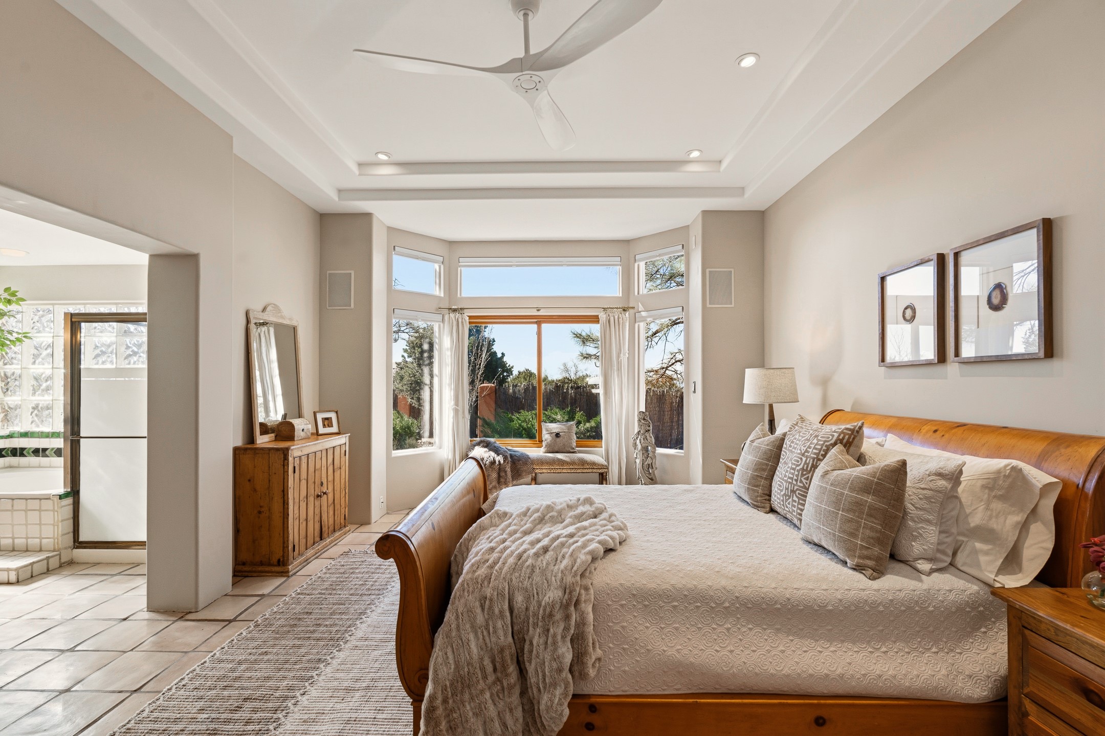 Sited on 5 acres in Dos Griegos and just 20 minutes from the Santa Fe Plaza, this inviting property offers a main house, an attached casita and a 250 sq. ft. attached storage room. A thoughtful nod to sustainable living is reflected in the two-year-old solar array with a rare Pearl Certification and a transferable warranty.Upon entering the home, the formal living room welcomes you with soaring ceilings, vigas, and abundant natural light. A double-sided wood-burning fireplace connects this elegant space to the kitchen's secondary living area, creating warmth and continuity between the rooms. French doors in the living room open to the landscaped backyard, inviting indoor-outdoor living.The kitchen, living, and dining areas form the heart of the home with direct access to a flowing koi pond, where the gentle sound of falling water creates a peaceful year-round setting.Tucked quietly off the kitchen through the laundry room, an additional suite offers a private retreat with its own living room, bedroom, and bath--ideal as an additional primary suite, guest quarters, or studio.In the main home's bedroom wing, the spacious primary suite enjoys abundant southern light and features a colorful bath with soaking tub and walk-in shower. A walk-in closet connects to a dedicated office, creating a flexible work or creative space. The guest bedroom includes a wood-burning kiva fireplace and ensuite bath.The backyard features an organic garden, tranquil koi pond, and southwest-facing patio ideal for outdoor dining. No HOA dues. Served by natural gas and Eldorado community water. A versatile property offering space for generational living or gathering with family and friends.