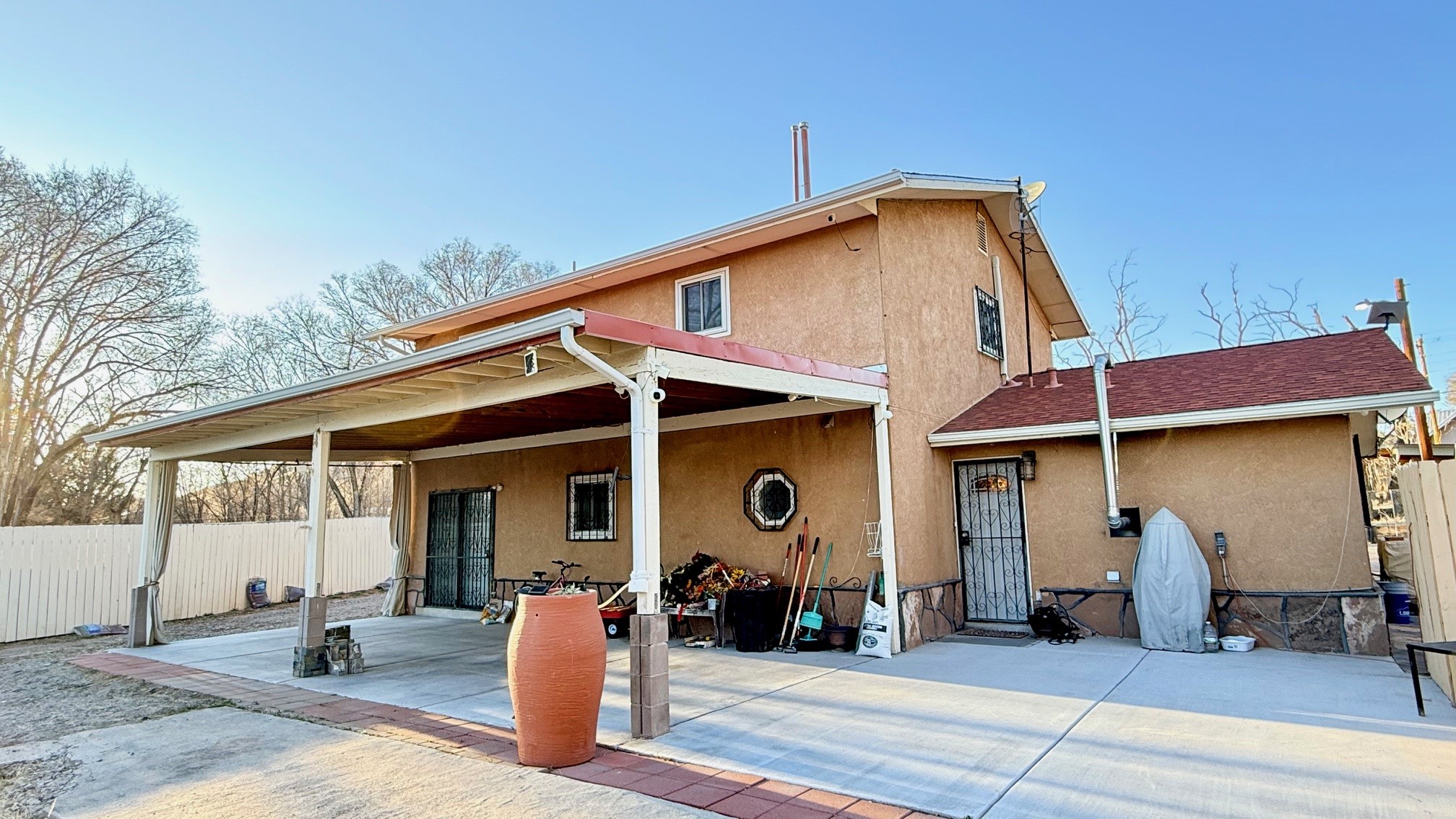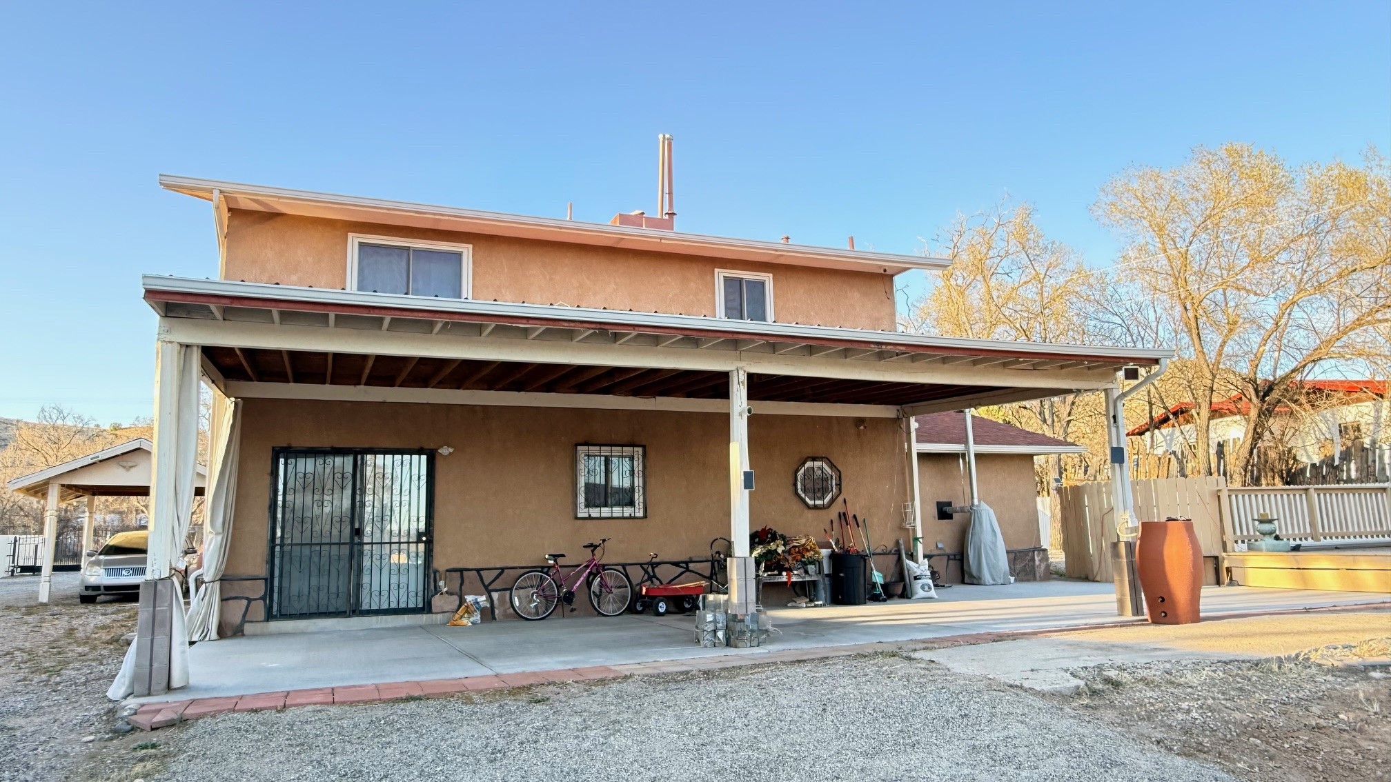 Pride of ownership shines throughout this well-maintained two-story home featuring 3 bedrooms and 2 baths. Recently installed carpet and spacious living areas filled with natural light create a comfortable and inviting atmosphere, complemented by thoughtful updates throughout.Interior highlights include a smart heating thermostat, a regularly serviced HVAC system, and a cozy pellet stove with remote control. Additional features such as smart ceiling fans, removable windows for easy cleaning, a security camera system, and a home alarm provide added convenience and peace of mind. The washer, dryer, and refrigerator will convey with the sale.The exterior offers exceptional versatility, with an electric entry gate, a detached 2-car garage, two covered carports, and a large metal carport providing ample parking and storage. The property also includes a private well and valuable acequia water rights.This home has been kept in immaculate condition. Property is being sold as-is.