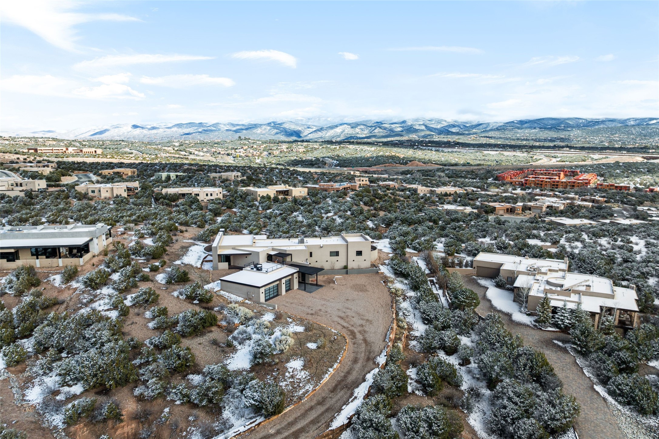 Stunning 3-bedroom custom-built home with awe-inspiring vistas of the Santa Fe's cityscape and the Sangre de Cristo mountains. This 3,500+ sq. ft. Parade of Homes winner for the Award of Excellence (2023) features Boss Builders signature style and luxury finishes throughout. The architectural design respects the traditional historical vernacular of Santa Fe style while layering on a more contemporary interpretation with classic white marble flooring, smooth plaster walls, and crisp corners. Expertly sited on a 1-acre lot, the home offers sweeping 360-degree vistas, with multiple large outdoor spaces that include two covered portals and a rooftop deck (with elevator). Entry opens to a spacious great room with a sleek gas fireplace that flows into a dining area, bar and a walk-out patio with a gas fire pit and panoramic mountain views. Dramatic open gourmet kitchen is appointed with top-of-the-line Sub-Zero and Wolf appliances, black marble counter tops, crisp white cabinetry and a grand center island with room to seat four. With 3 bedrooms, 3 full bathrooms and a flexible studio or media room, the home was designed to adapt to a variety of lifestyles. The primary suite is a private retreat, featuring a corner pocketing slider to its own patio, a spa-like bath with soaking tub, double-sided fireplace, walk-in shower, and generous closet space. Laundry room with sink and plentiful cabinetry. 3 -car garage. Excellent north side location just minutes from the Santa Fe Plaza, Canyon Road and Museum Hill.