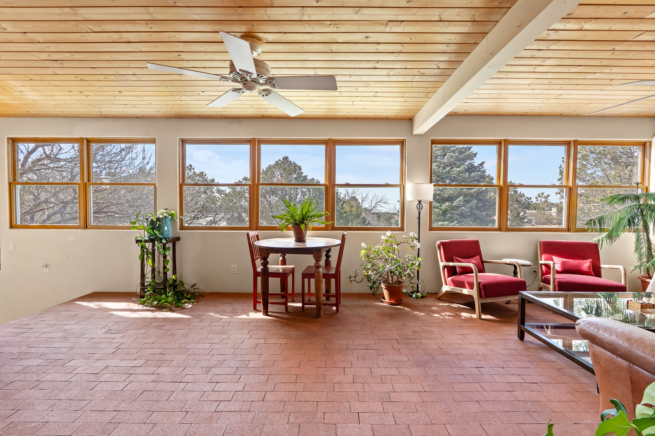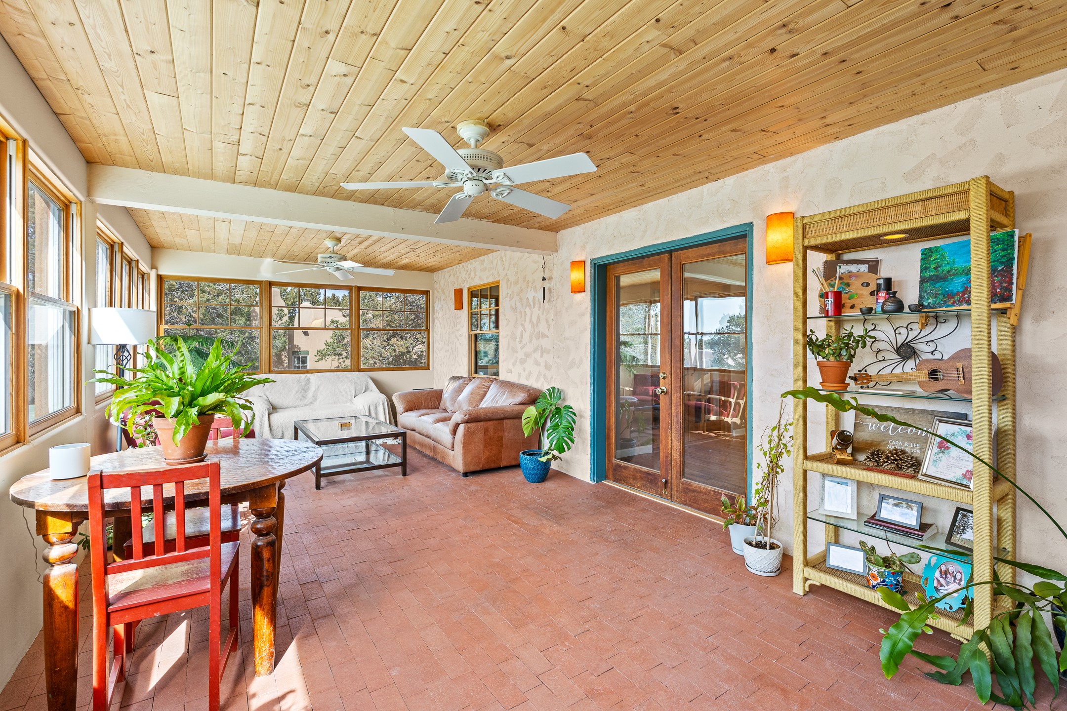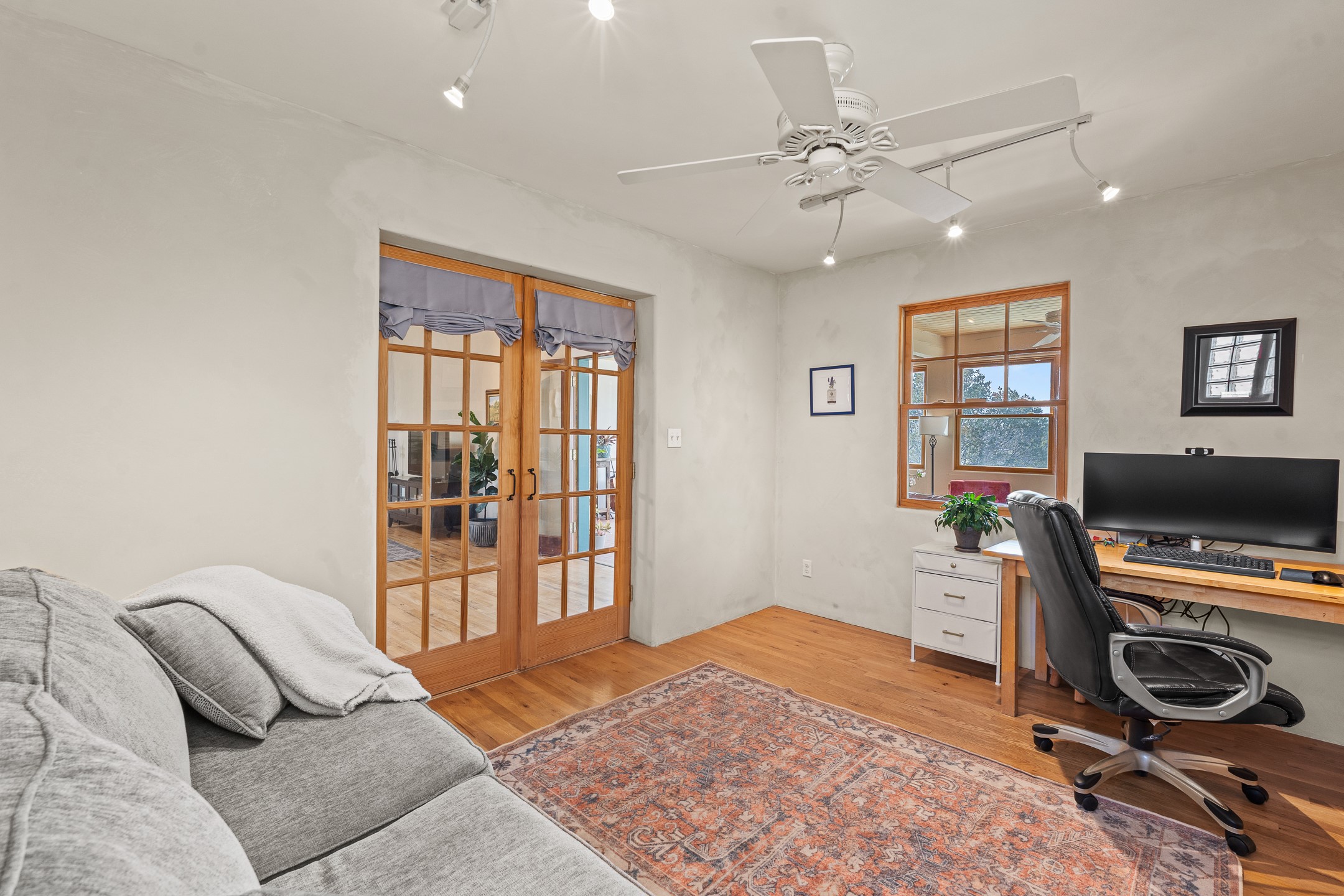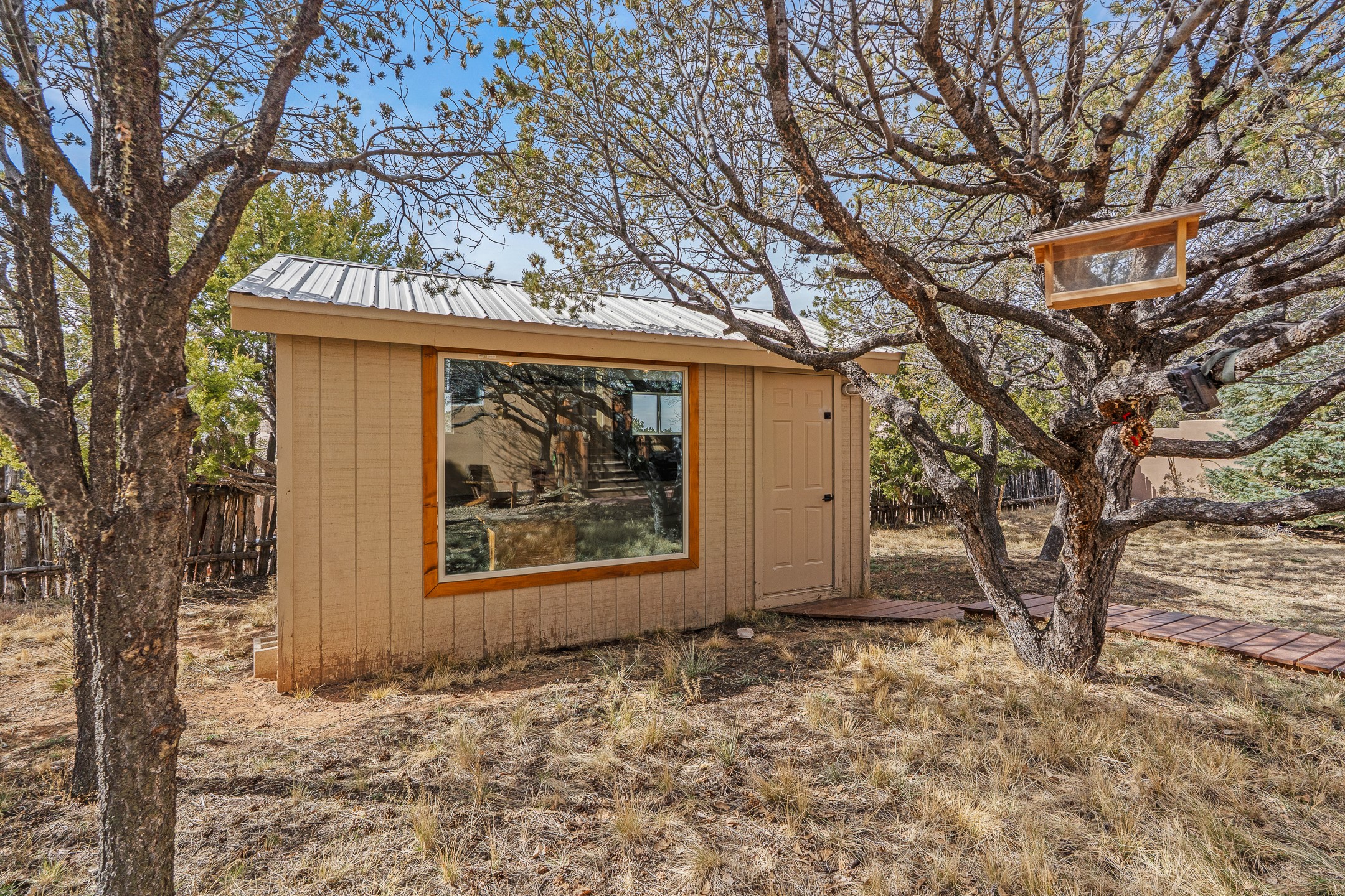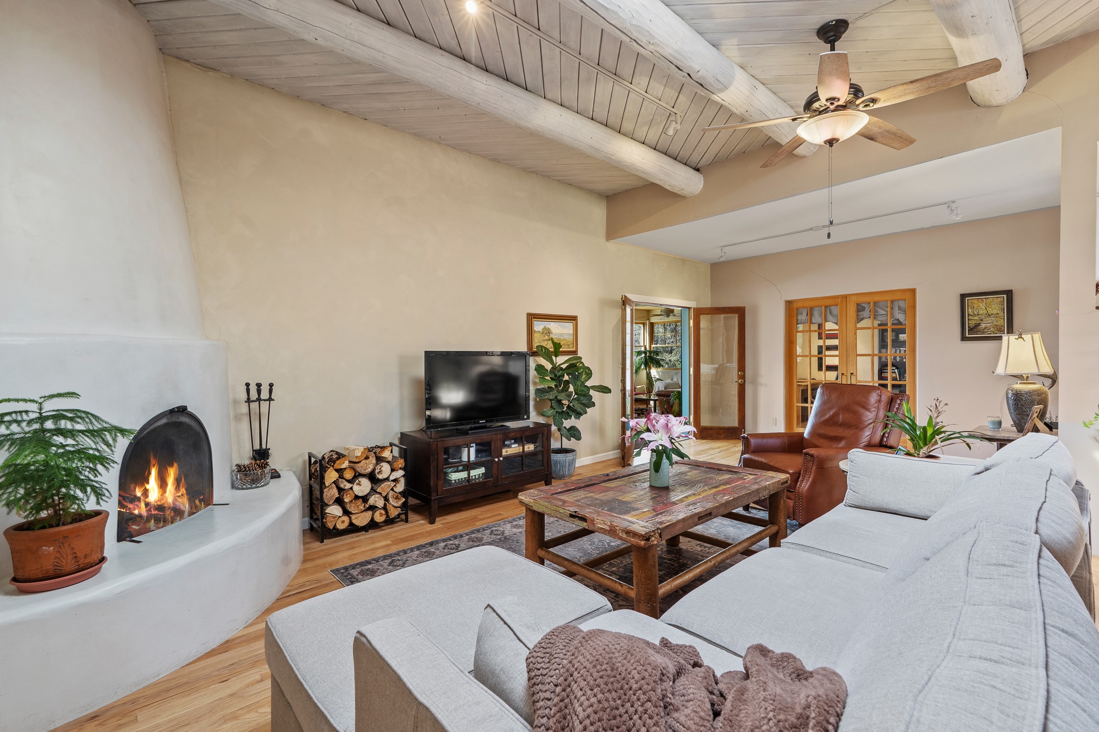 This beautifully renovated 2,025 sq. ft. home in Devargas Heights, just off Old Pecos Trail, is warm, inviting, and exceptionally versatile. Offering 2 bedrooms, 2 full baths, a dedicated office/bonus room within the main house, and a separate 140 sq. ft. detached studio currently used as an office, the layout supports today's flexible lifestyles with ease.The living room is filled with natural light, accented by classic vigas and a charming corner kiva fireplace. The kitchen features beautifully tiled countertops and white cabinetry, and the open-concept design seamlessly connects the kitchen, dining, and living areas. From the dining room, enjoy lovely views of Sun Mountain. An unexpected bonus is the approximately 300 sq. ft. west-facing secondary living area--bathed in light and perfect for relaxing, reading, or entertaining.The primary bath has been completely reimagined with double vanities, a glass-enclosed walk-in shower, and a sculptural vessel soaking tub. The guest bedroom and completely renovated guest bath are thoughtfully separated from the primary suite and reflect the same level of care and quality in the renovation. Outside, the large fenced backyard has beautifully manicured pions, an apricot tree, a large spruce tree and feels private and serene. A deep covered portal extends the living space outdoors, while a winding path leads to the detached studio, adding a touch of whimsy to this already special property.Located in the coveted Devargas Heights neighborhood and within the Wood Gormley school district, this renovated home offers comfort, flexibility, and exceptional value.