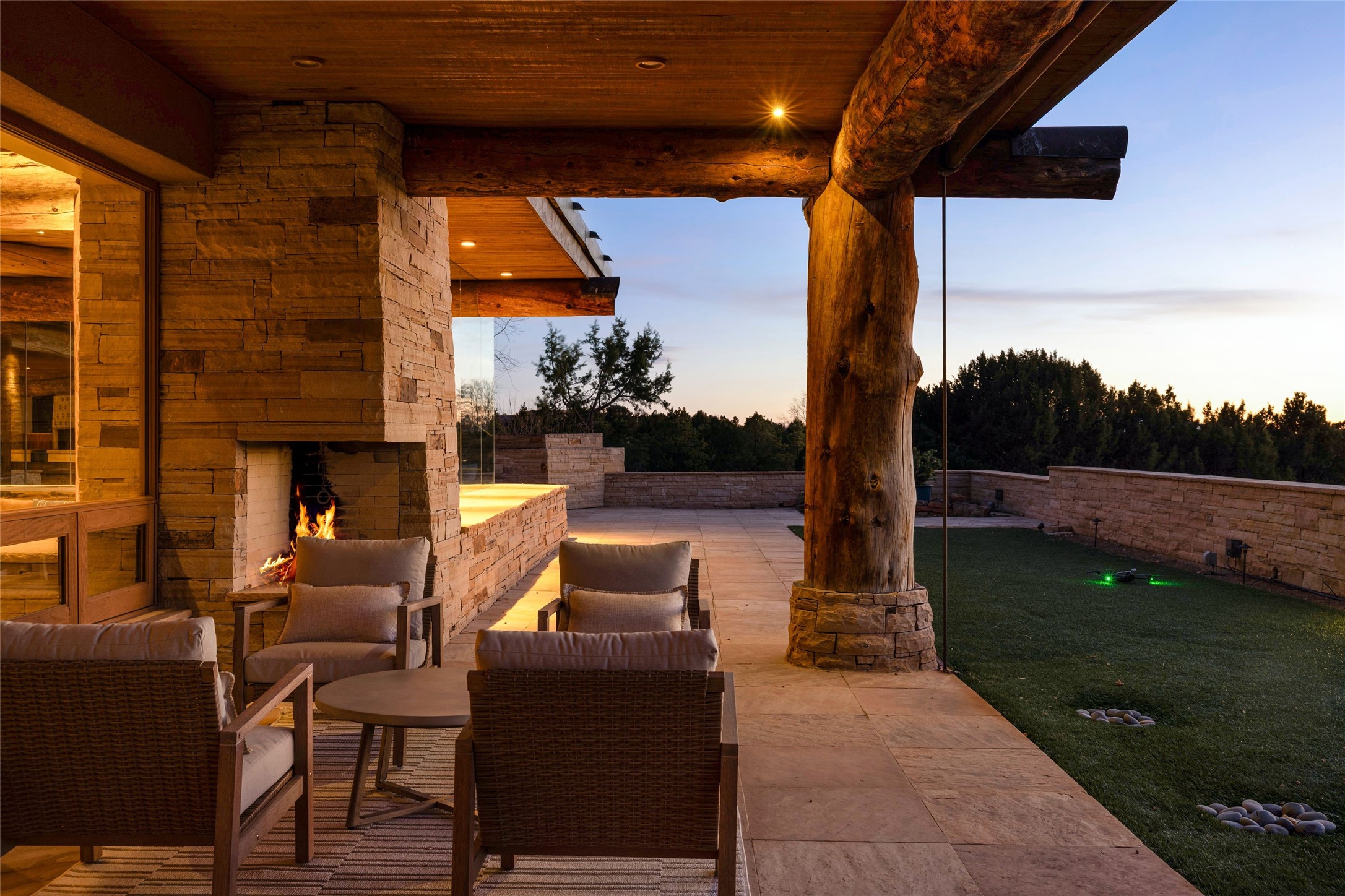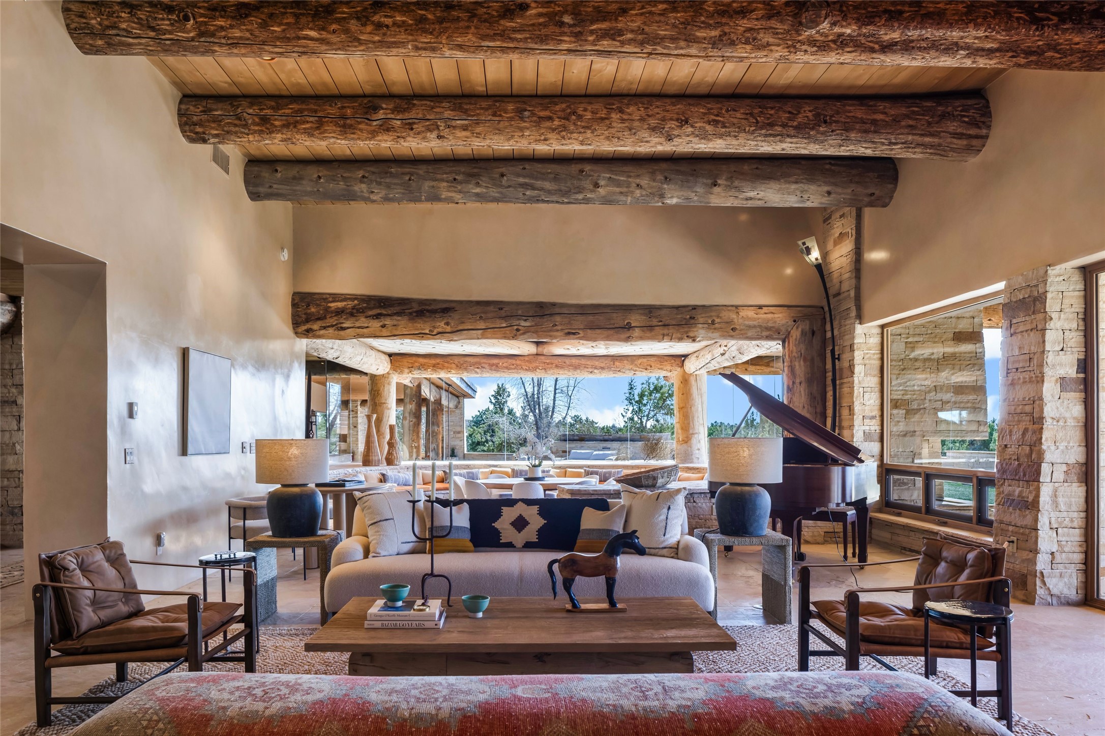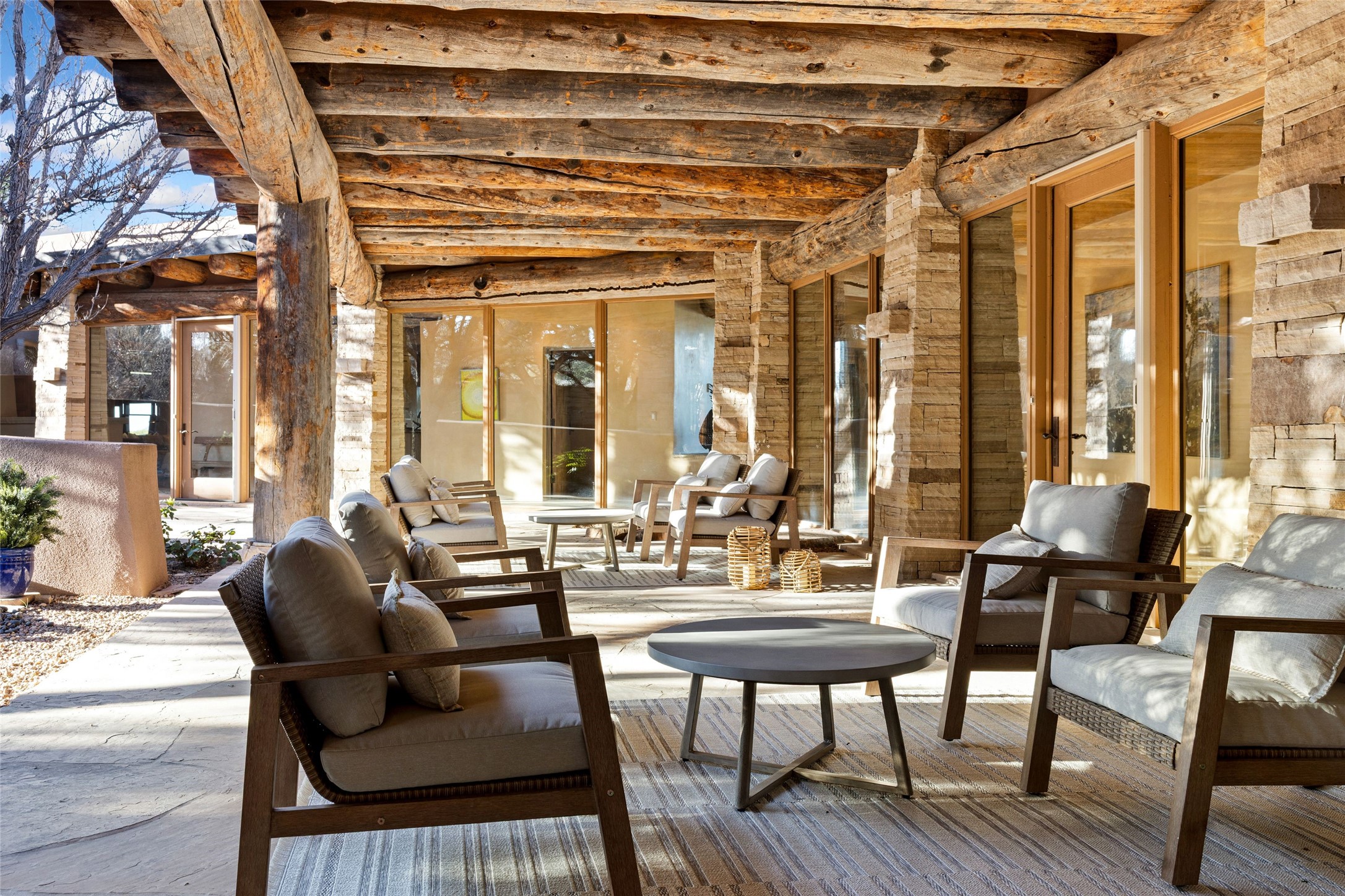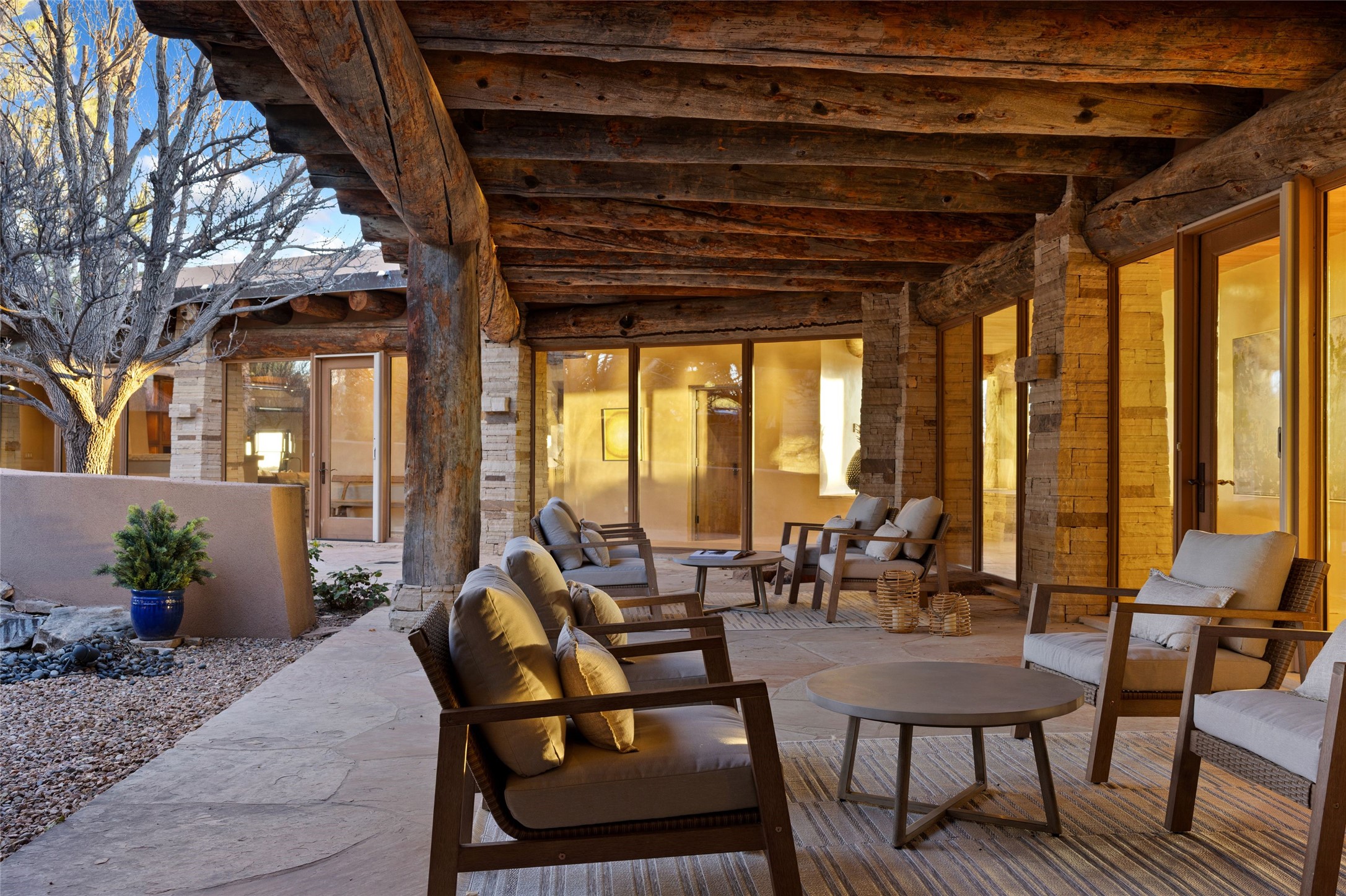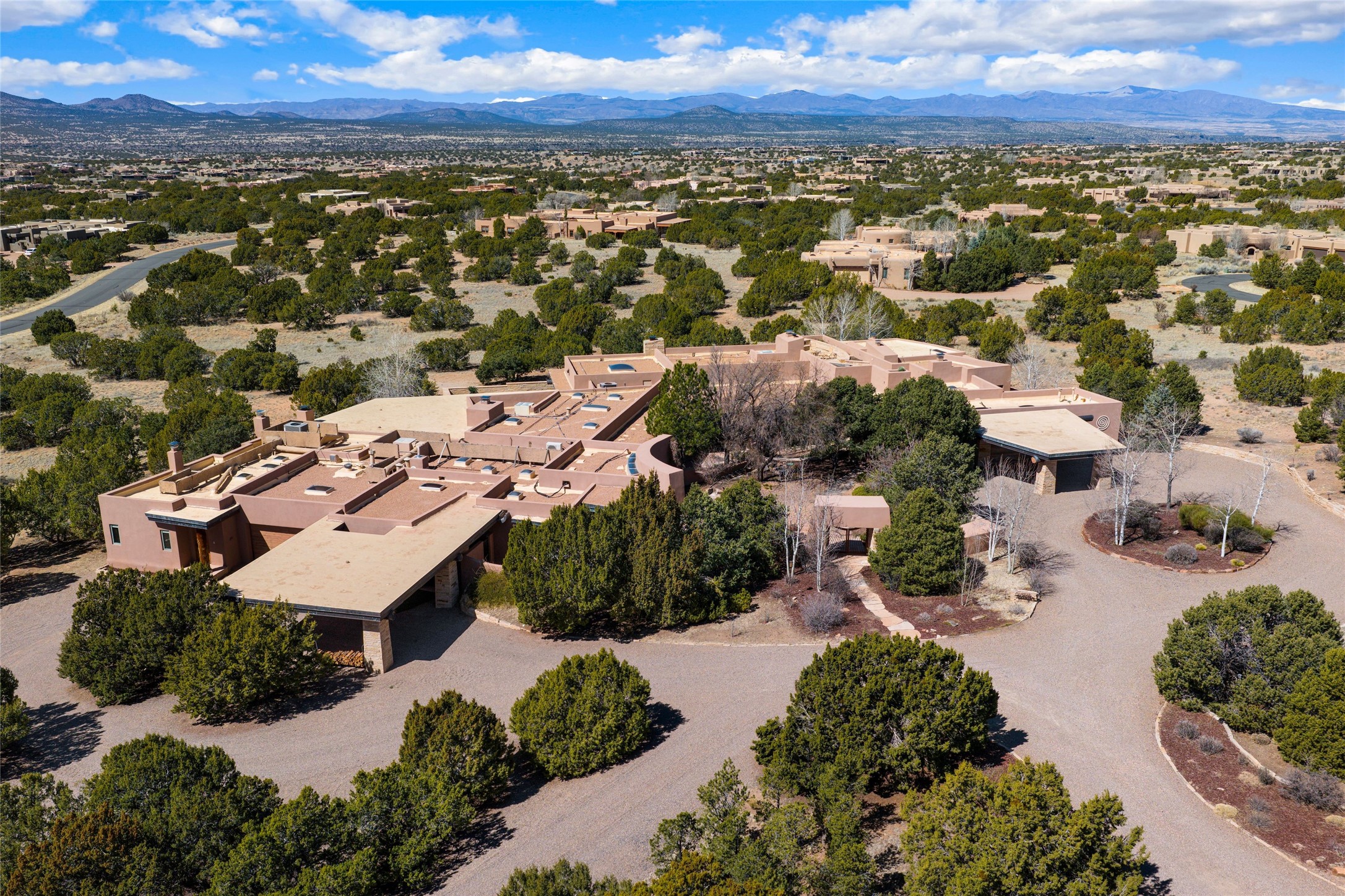 Welcome to 5 Penasco Circle, one of the most exciting estates in Santa Fe, this captivating estate impresses with commanding architecture, majestic mountain views and superior craftsmanship. Privately sited on a premiere 2.3-acre homesite within the famed Las Campanas community, this tour de force home by Turner Lechner & Romero, perfectly blends contemporary design with Northern New Mexico high desert luxury. The gallery-like formal living room stuns and welcomes as a grand centerpiece, flowing into a dining room encased in sheets of glass beneath an iconic hogan-style ceiling, framing surreal Jemez Mountain sunsets. At the heart of the home lies a professional-grade chef's kitchen, an epicurean sanctuary featuring high-performance luxury appliances, walk-in pantry, butler's pantry, and a breakfast bar that anchors the home's casual living and breakfast areas. The primary wing is a sanctuary of refined comfort, offering dual bedroom options with ensuite baths, two private offices, and stone-surround fireplaces--all opening to secluded courtyard living spaces. Three total walk-in closets ensure ample storage for the most discerning homeowner. Guests enjoy ultimate privacy in a dedicated wing featuring a spacious ensuite bedroom, plus two additional guest suites with private entrances. Additional design features include a separate media room/den with its own bath and an attached heated studio. Exceptional craftsmanship is showcased throughout the single-level interior, from quality plaster walls and rare massive vigas to curated natural stone and hardwood flooring. The outdoor experience is unrivaled, featuring vast entertaining areas, deep covered portals, and two covered entry portcacheres. A welcoming front courtyard leads to a rooftop deck providing 360-degree vistas of the high-desert landscape. With extensive guest parking and a tranquil, park-like setting, this estate represents the ultimate Santa Fe and Las Campanas lifestyle.