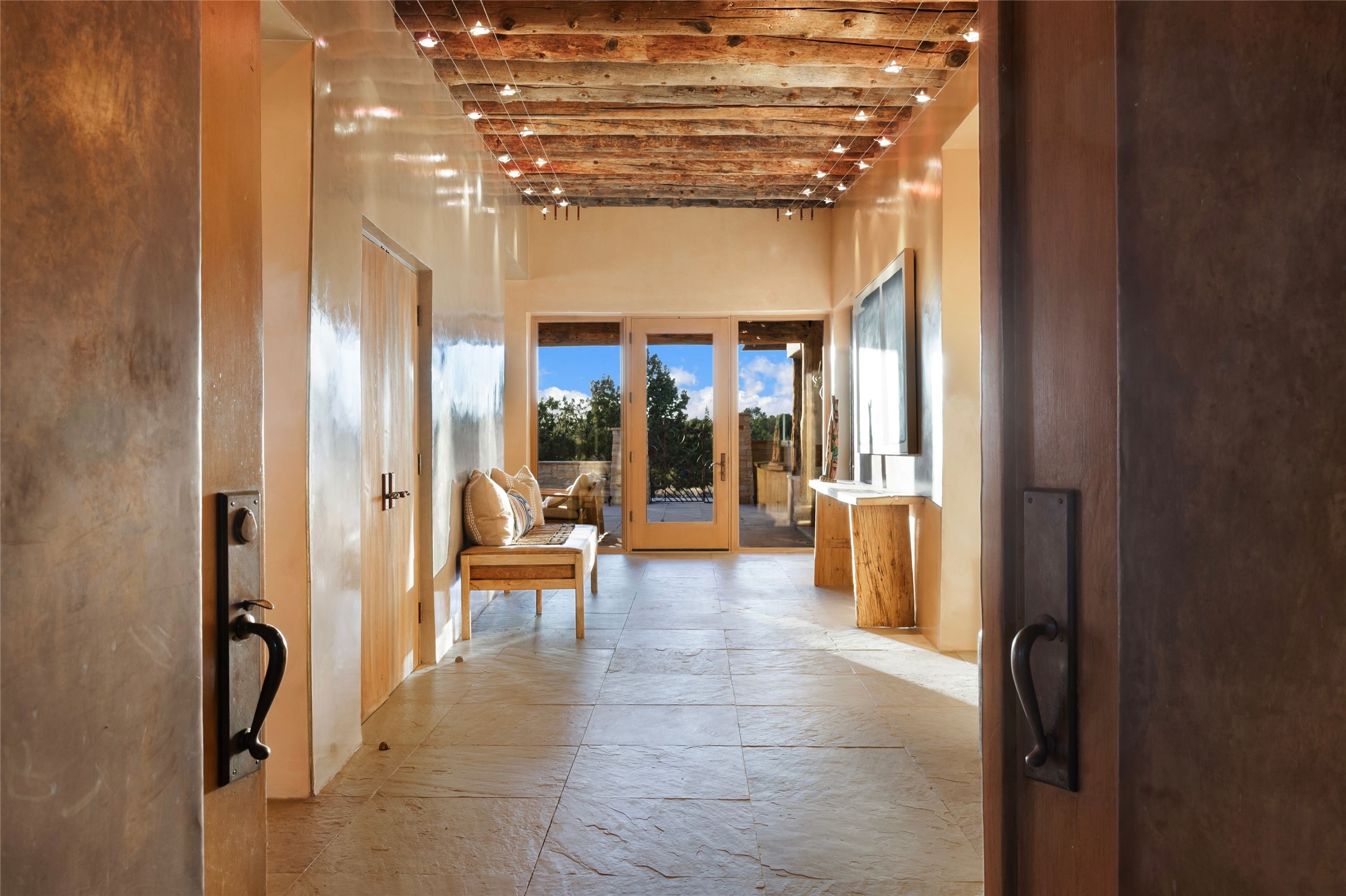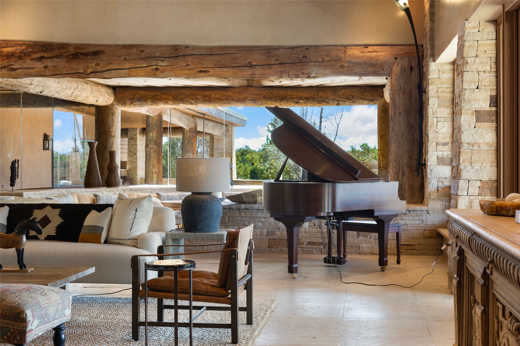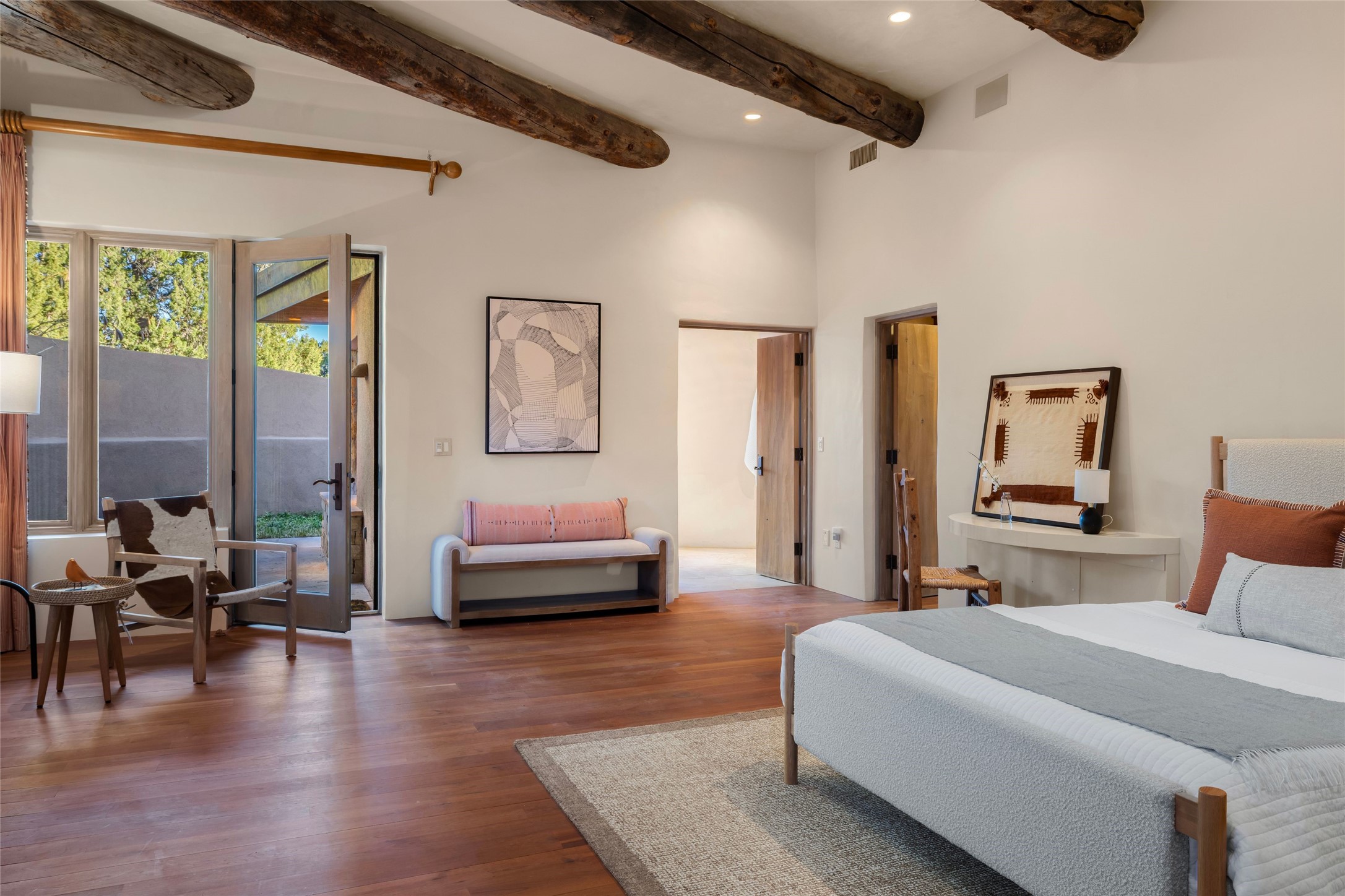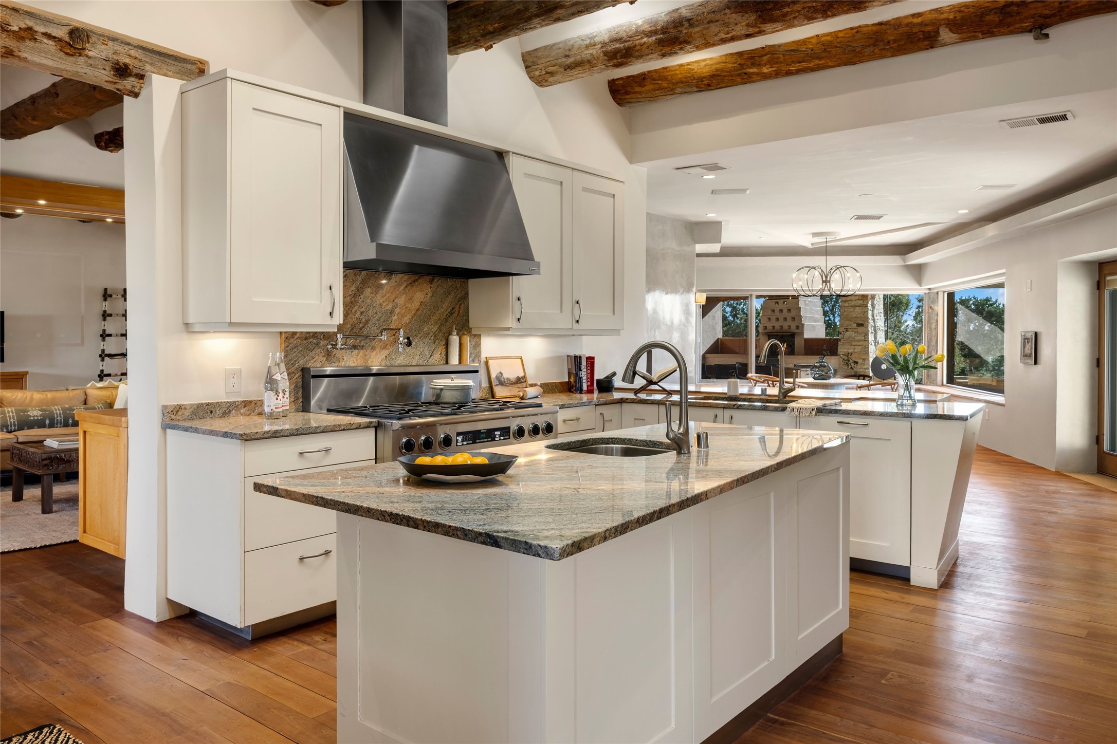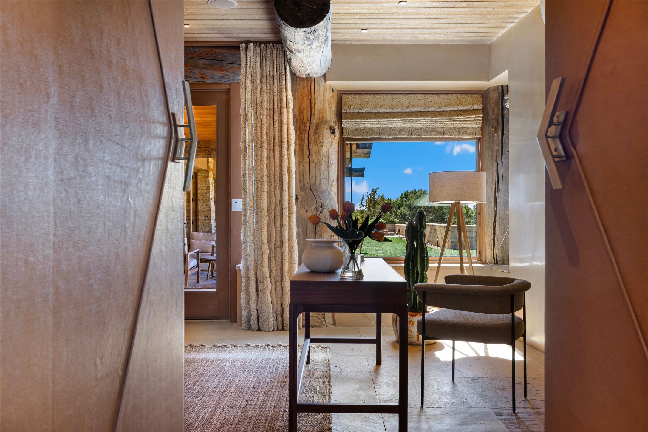 Welcome to 5 Penasco Circle, one of the most exciting estates in Santa Fe, this captivating estate impresses with commanding architecture, majestic mountain views and superior craftsmanship. Privately sited on a premiere 2.3-acre homesite within the famed Las Campanas community, this tour de force home by Turner Lechner & Romero, perfectly blends contemporary design with Northern New Mexico high desert luxury. The gallery-like formal living room stuns and welcomes as a grand centerpiece, flowing into a dining room encased in sheets of glass beneath an iconic hogan-style ceiling, framing surreal Jemez Mountain sunsets. At the heart of the home lies a professional-grade chef's kitchen, an epicurean sanctuary featuring high-performance luxury appliances, walk-in pantry, butler's pantry, and a breakfast bar that anchors the home's casual living and breakfast areas. The primary wing is a sanctuary of refined comfort, offering dual bedroom options with ensuite baths, two private offices, and stone-surround fireplaces--all opening to secluded courtyard living spaces. Three total walk-in closets ensure ample storage for the most discerning homeowner. Guests enjoy ultimate privacy in a dedicated wing featuring a spacious ensuite bedroom, plus two additional guest suites with private entrances. Additional design features include a separate media room/den with its own bath and an attached heated studio. Exceptional craftsmanship is showcased throughout the single-level interior, from quality plaster walls and rare massive vigas to curated natural stone and hardwood flooring. The outdoor experience is unrivaled, featuring vast entertaining areas, deep covered portals, and two covered entry portcacheres. A welcoming front courtyard leads to a rooftop deck providing 360-degree vistas of the high-desert landscape. With extensive guest parking and a tranquil, park-like setting, this estate represents the ultimate Santa Fe and Las Campanas lifestyle.
