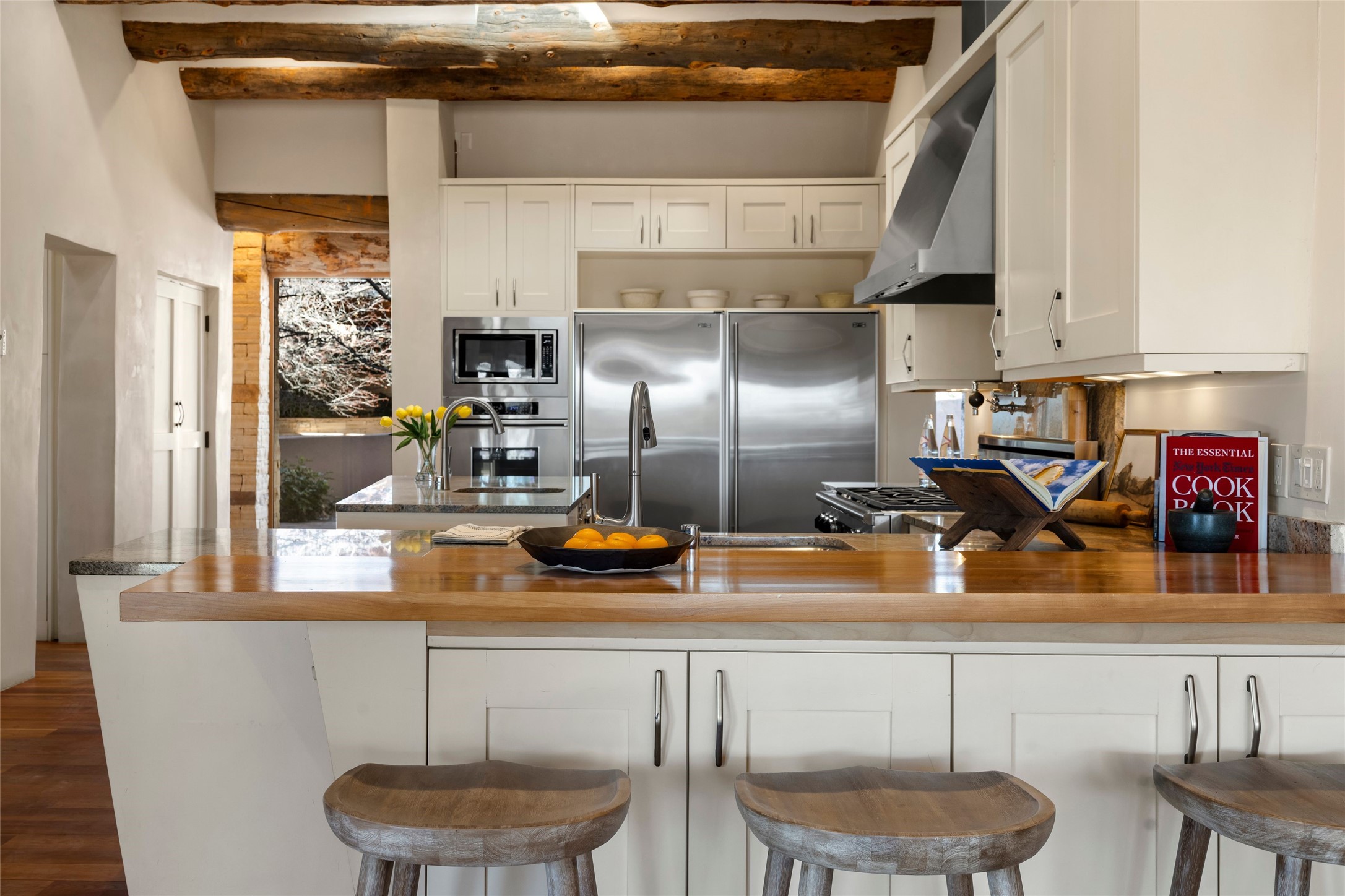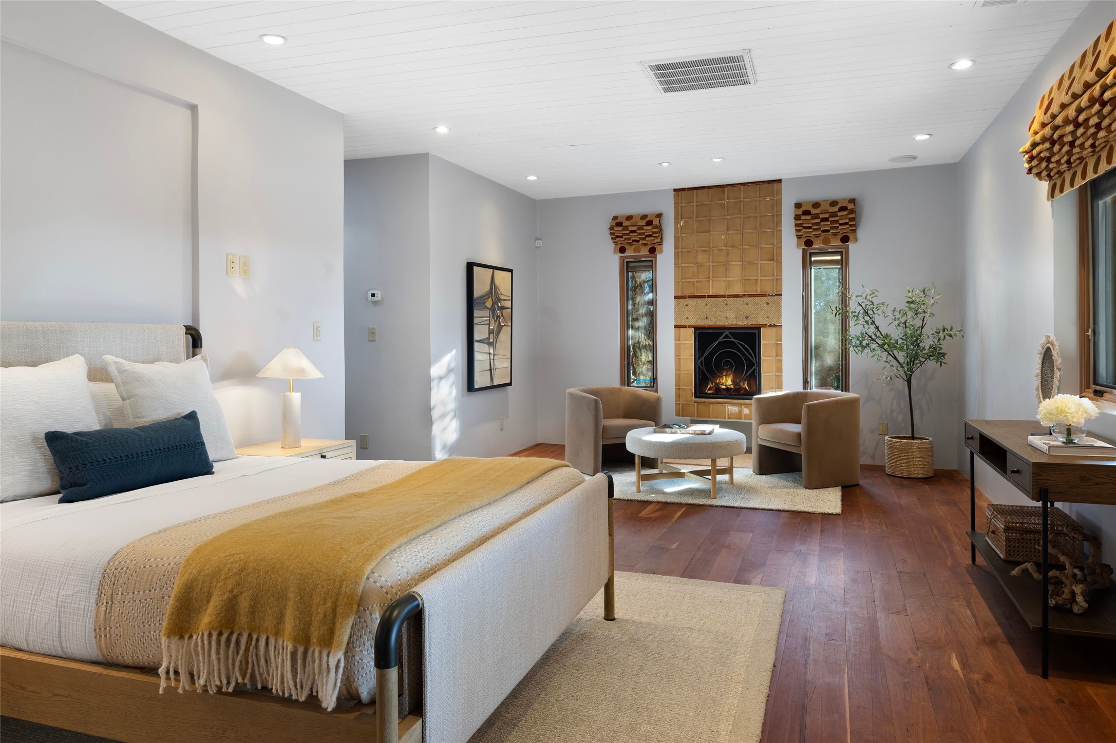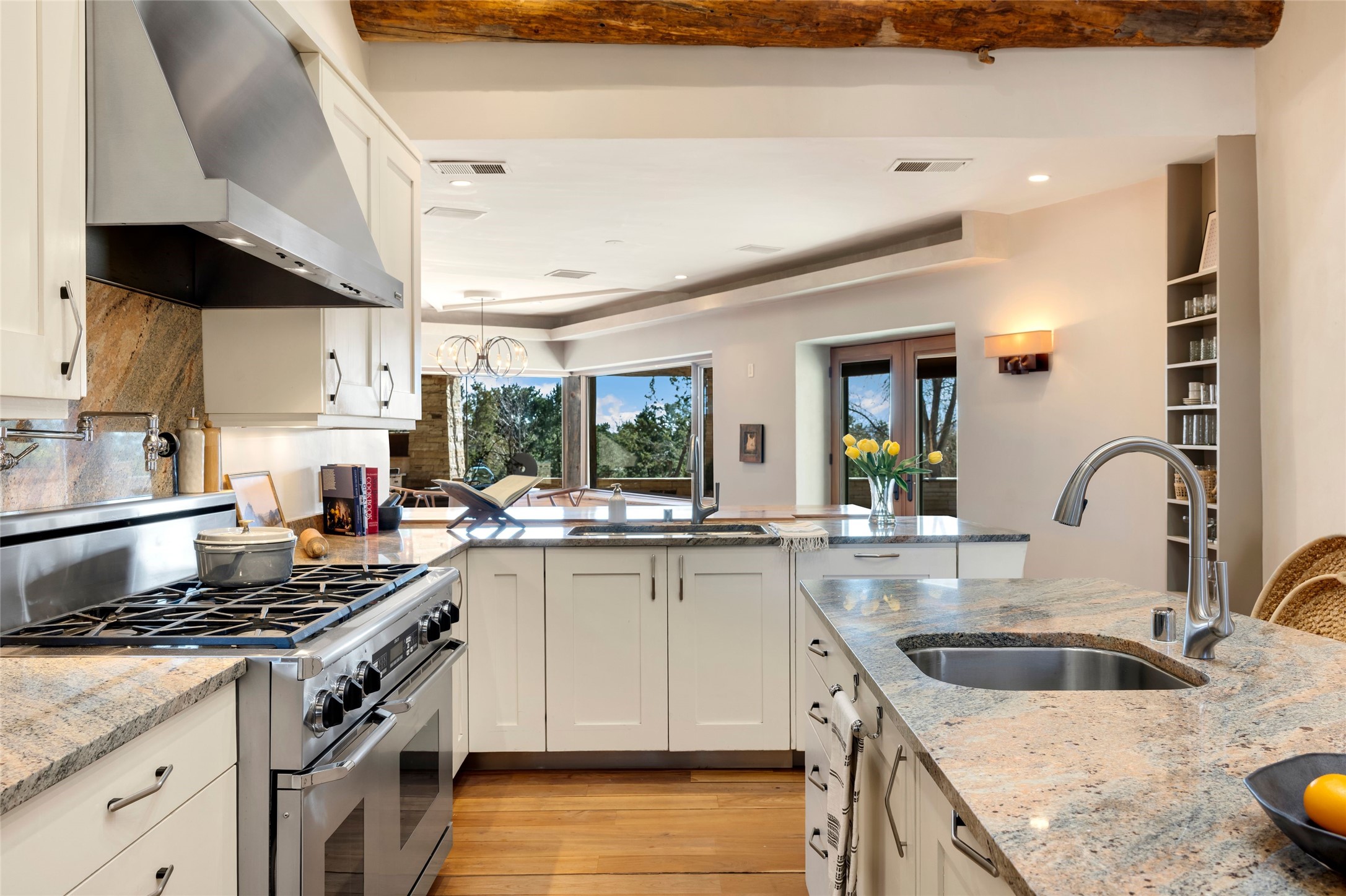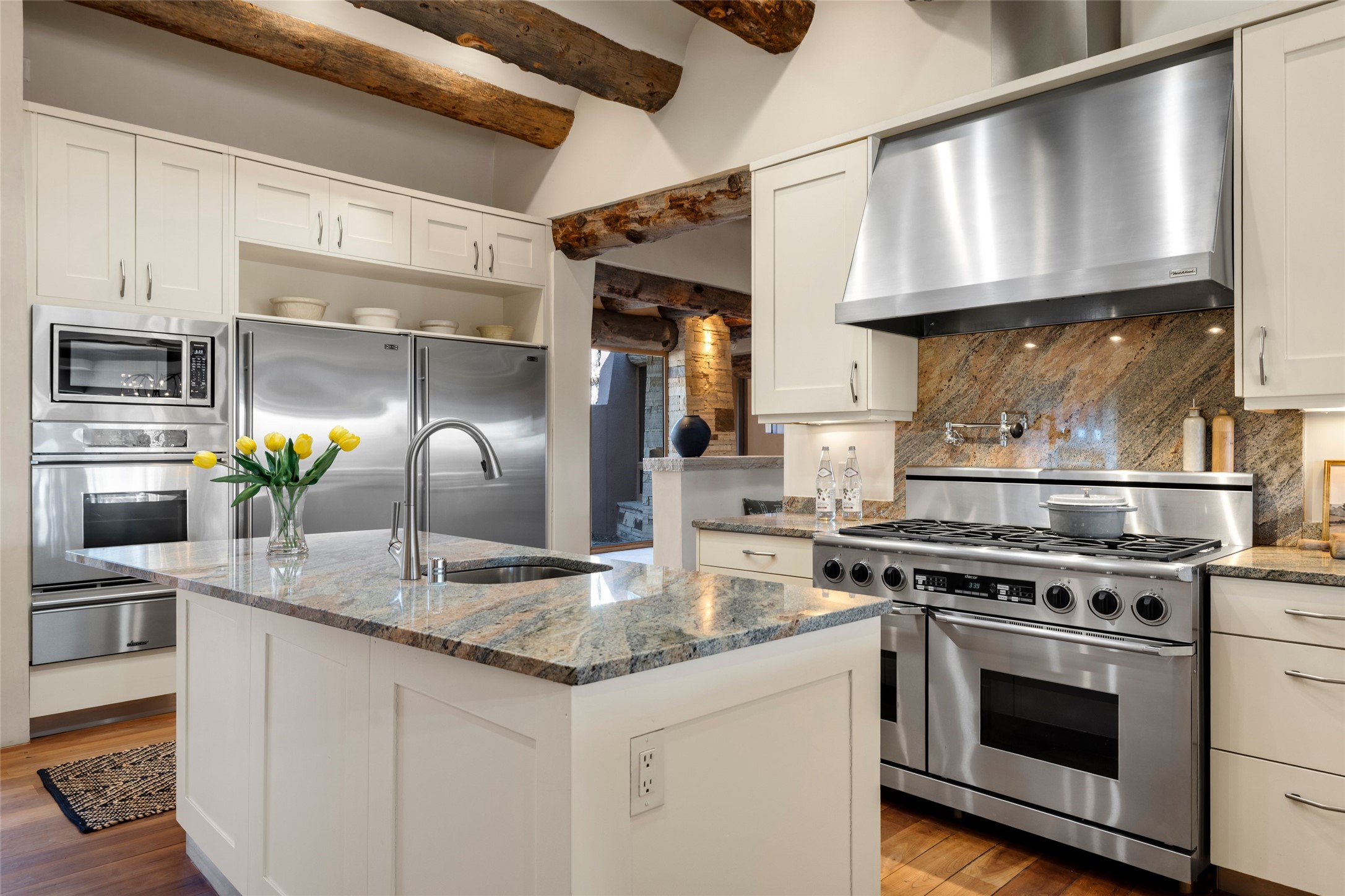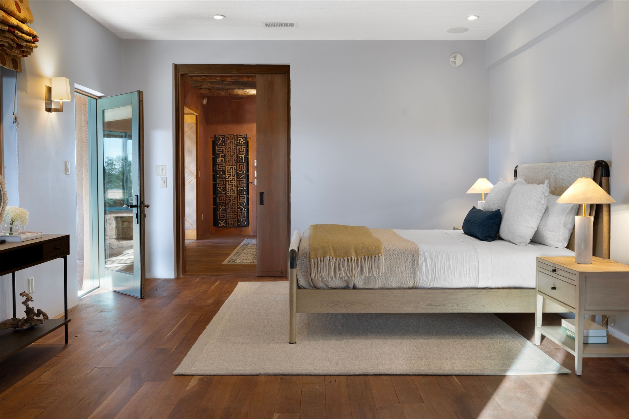 Welcome to 5 Penasco Circle, one of the most exciting estates in Santa Fe, this captivating estate impresses with commanding architecture, majestic mountain views and superior craftsmanship. Privately sited on a premiere 2.3-acre homesite within the famed Las Campanas community, this tour de force home by Turner Lechner & Romero, perfectly blends contemporary design with Northern New Mexico high desert luxury. The gallery-like formal living room stuns and welcomes as a grand centerpiece, flowing into a dining room encased in sheets of glass beneath an iconic hogan-style ceiling, framing surreal Jemez Mountain sunsets. At the heart of the home lies a professional-grade chef's kitchen, an epicurean sanctuary featuring high-performance luxury appliances, walk-in pantry, butler's pantry, and a breakfast bar that anchors the home's casual living and breakfast areas. The primary wing is a sanctuary of refined comfort, offering dual bedroom options with ensuite baths, two private offices, and stone-surround fireplaces--all opening to secluded courtyard living spaces. Three total walk-in closets ensure ample storage for the most discerning homeowner. Guests enjoy ultimate privacy in a dedicated wing featuring a spacious ensuite bedroom, plus two additional guest suites with private entrances. Additional design features include a separate media room/den with its own bath and an attached heated studio. Exceptional craftsmanship is showcased throughout the single-level interior, from quality plaster walls and rare massive vigas to curated natural stone and hardwood flooring. The outdoor experience is unrivaled, featuring vast entertaining areas, deep covered portals, and two covered entry portcacheres. A welcoming front courtyard leads to a rooftop deck providing 360-degree vistas of the high-desert landscape. With extensive guest parking and a tranquil, park-like setting, this estate represents the ultimate Santa Fe and Las Campanas lifestyle.