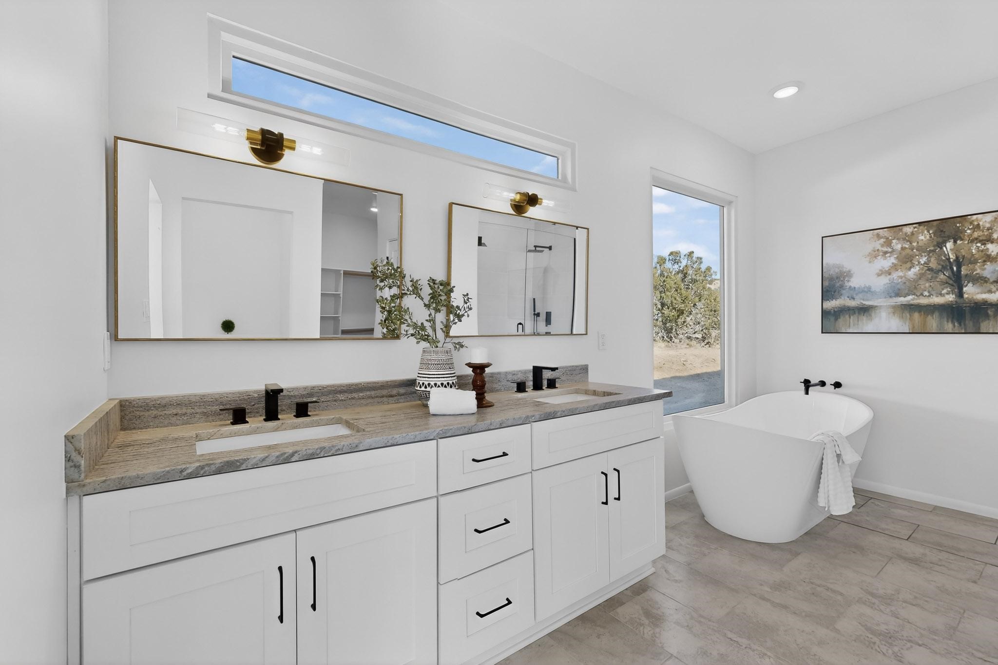 Welcome home! This stunning newly constructed contemporary-modern style home is perfectly positioned on 3.10 acres with stunning views of the Sandia Mountains and the Galisteo Basin. This 2,000 sq ft home has been designed to maximize the natural light and space, featuring high ceilings with contemporary style vigas, an open floor plan great for entertaining or keeping an eye on kids; with walls of windows taking full advantage of the expansive views!The modern kitchen includes a beautiful large granite island, large walk-in pantry, that flows beautifully into the living and dining areas, very functional and ideal for entertaining. Oversized windows and sliding glass doors invite abundant natural light and creates a seamless connection between indoor comfort and outdoor enjoyment; meanwhile framing the surrounding landscape like living artwork. The primary suite offers a peaceful escape with a luxurious spa inspired stand-alone bathtub, dual vanities, walk-in-shower with dual rain heads, and a spacious walk-in closet. Two additional bedrooms and a second full bath provide comfortable accommodations for family or guests.Enjoy the freedom of no HOA, space for horses, and the tranquility of rural living - while remaining just 20 minutes from downtown Santa Fe, close to nearby restaurants, shopping and outdoor activities. Brand new, beautifully designed, and ready to be lived in!