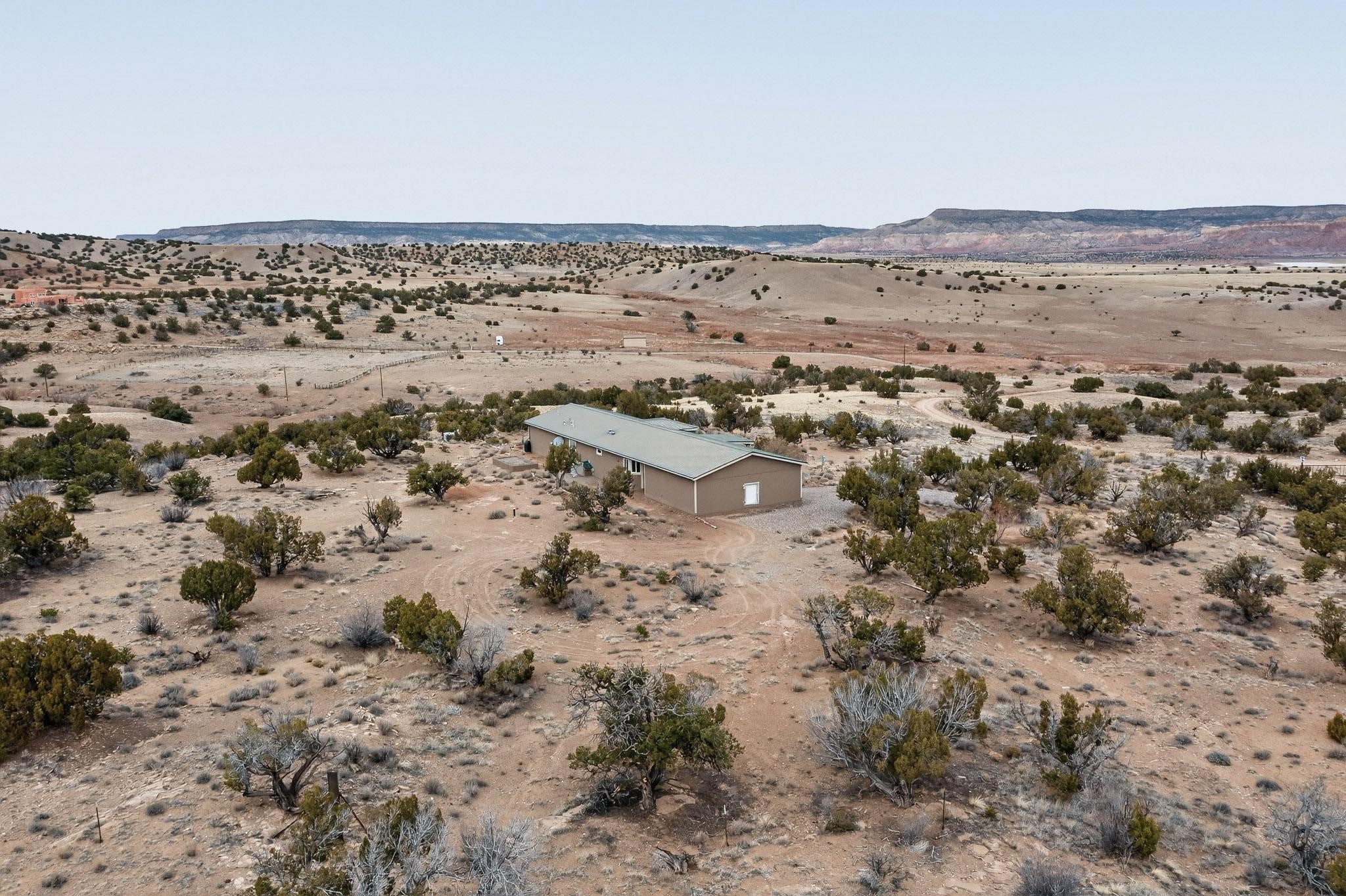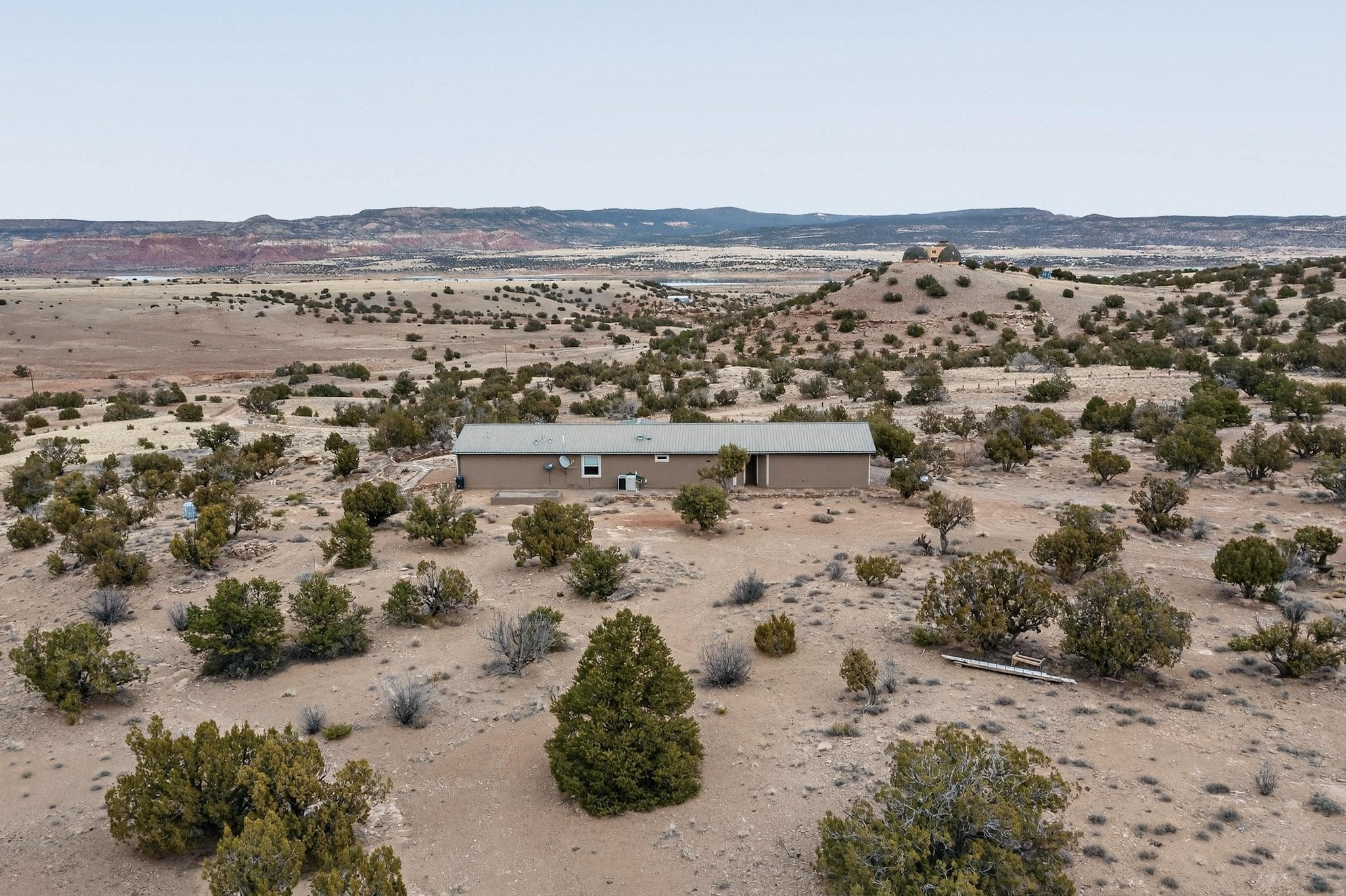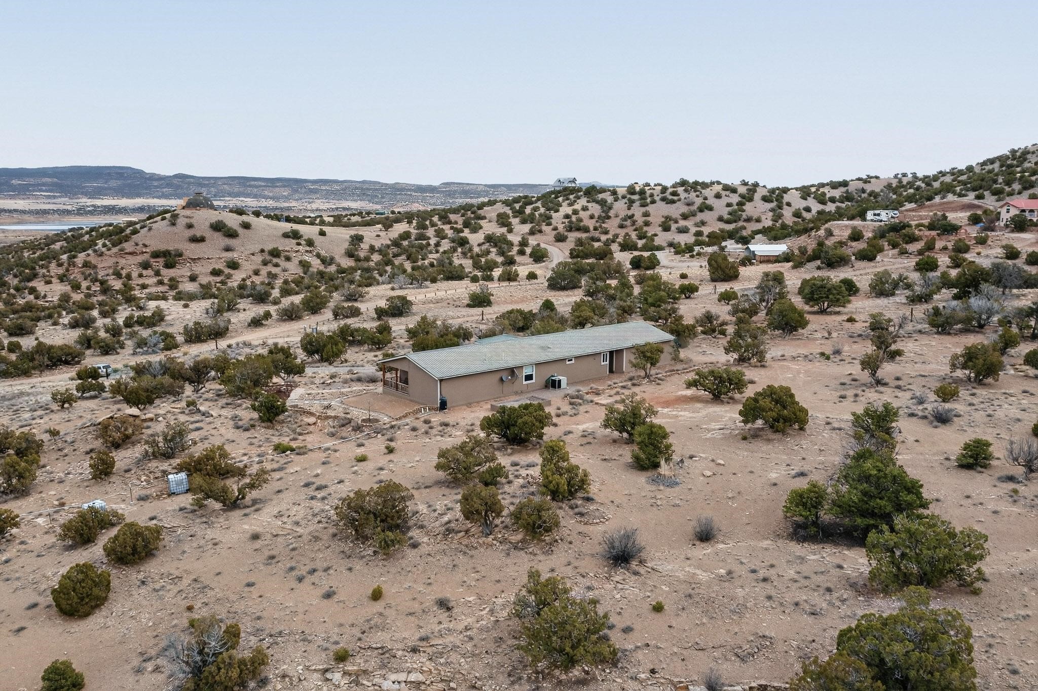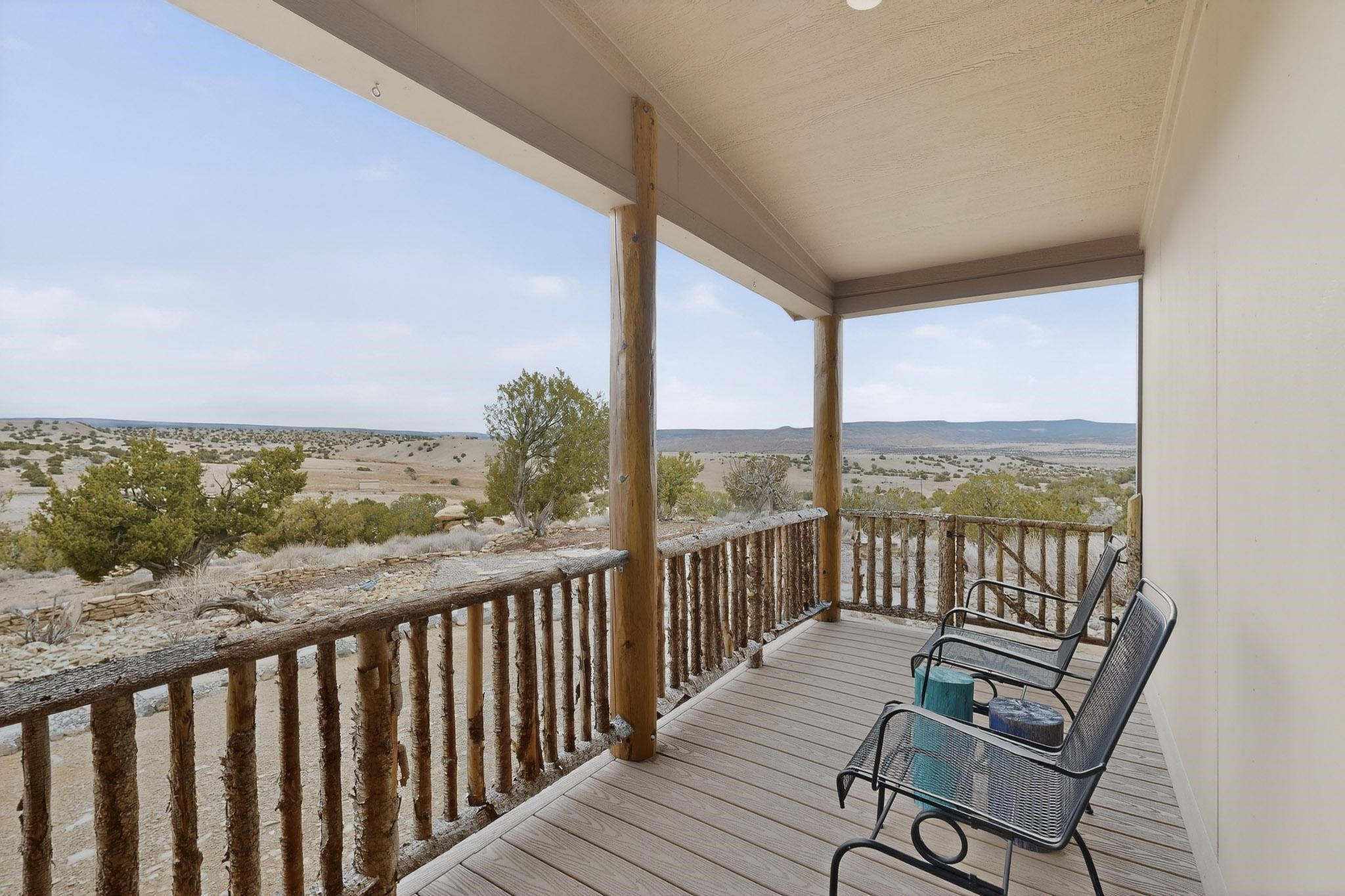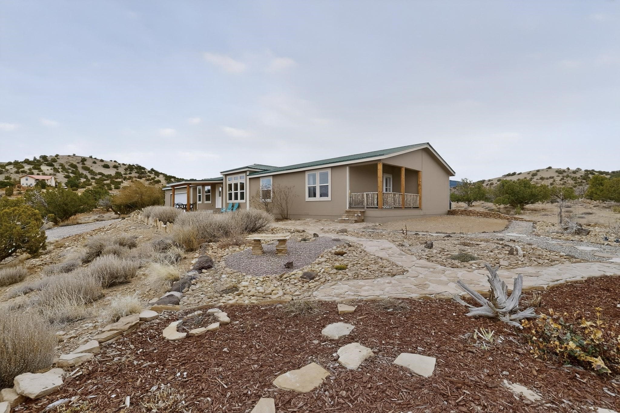Discover unparalleled tranquility and magnificent scenery at this exceptional 9.43-acre property, offering quiet privacy and stunning lake and mountain vistas. This meticulously maintained acreage has about 3.5acres fenced, providing a secure and serene environment for the perfect New Mexico lifestyle. The full-featured, spacious 2,010 sq. ft. home is designed for comfortable living and practical functionality. Storage is ample, including an oversized laundry room and an impressive 30 ft. by 30 ft. garage. The heart of the home is the spacious, user-friendly kitchen, a culinary delight boasting high-quality finishes, a Bosch dishwasher, and a central island complete with a second sink and a convenient eating bar. The master suite is a true sanctuary, featuring its own private covered porch--an ideal spot for morning coffee or quiet reflection. The large ensuite bath is a luxurious space with a beautifully tiled walk-in shower and an expansive, huge closet. The second bedroom offers the same stunning views as the master and includes its own generous walk-in closet. A flexible office space features elegant built-in cabinetry and holds the potential to easily serve as a comfortable third bedroom. Throughout the home, you will find high-end architectural details and finishes, including soaring vaulted ceilings, solid stem walls, rich hickory cabinets, graceful arched doorways, and durable berber carpets. Allow yourself to be completely enchanted by the legendary sunrises and sunsets that grace this part of New Mexico, painting the sky with unforgettable colors. We invite you to experience this property in full detail. Read the narrative under the first two photos. Please watch the comprehensive 3D VIDEO and the SHOWCASE VIDEO to fully appreciate the unique beauty and quality of this extraordinary lake-view retreat.