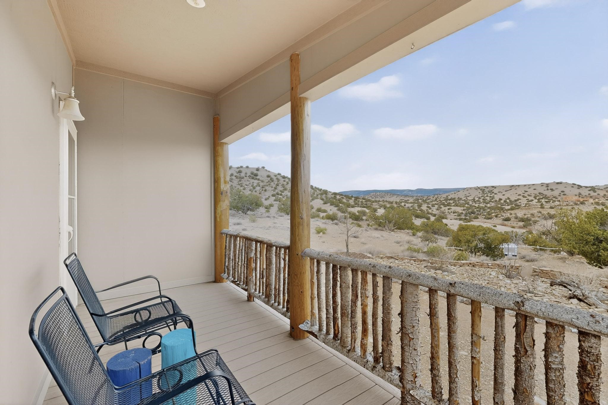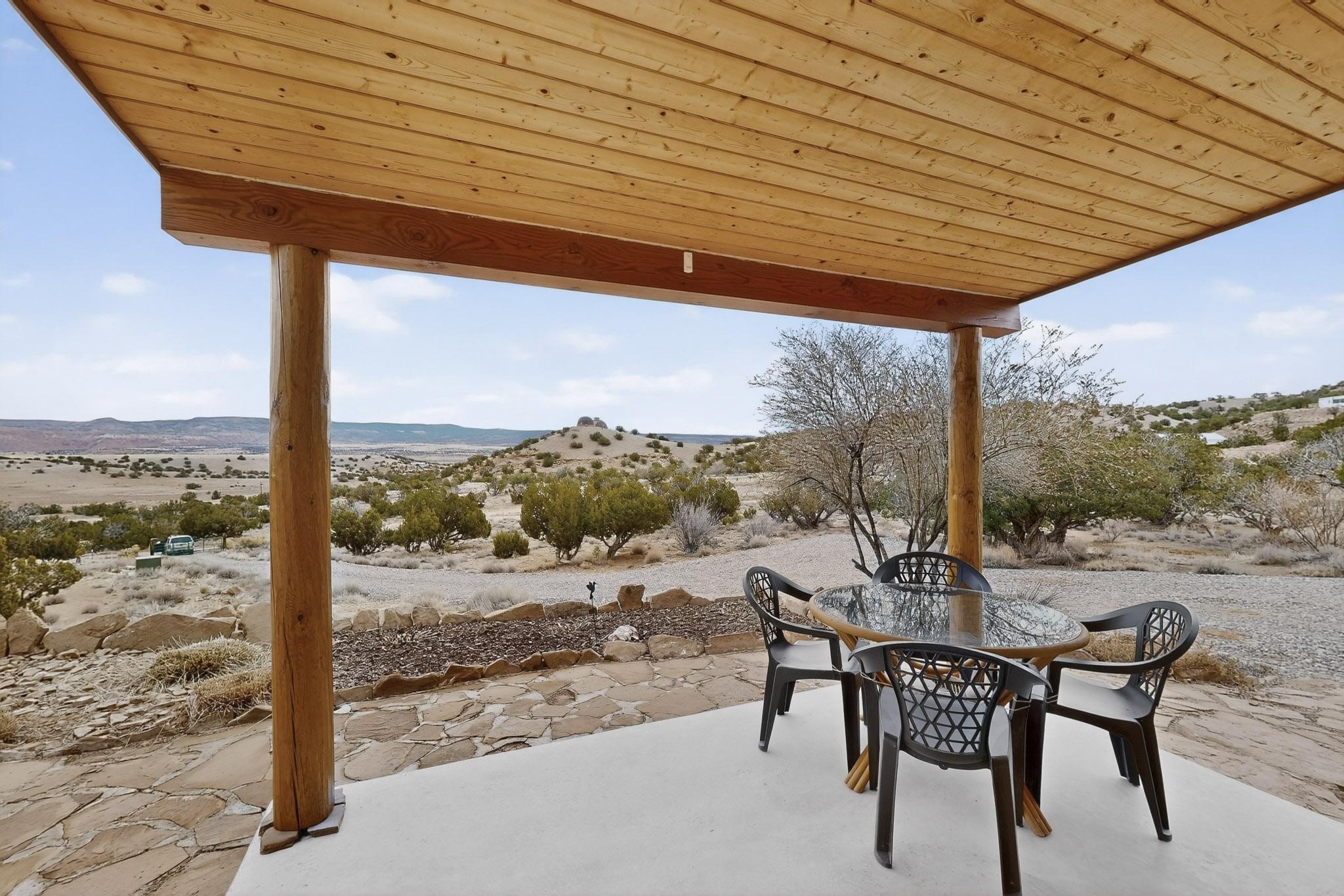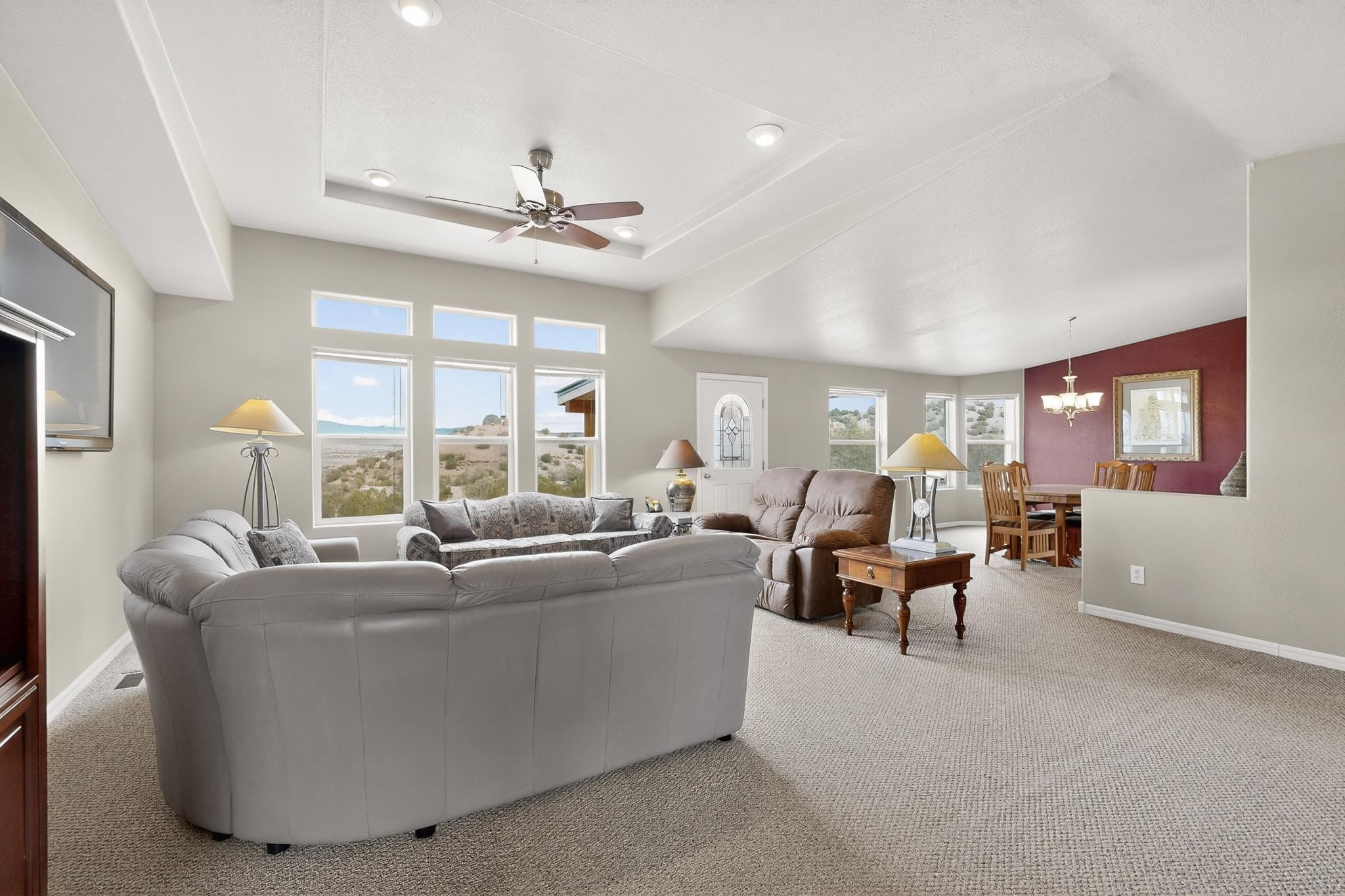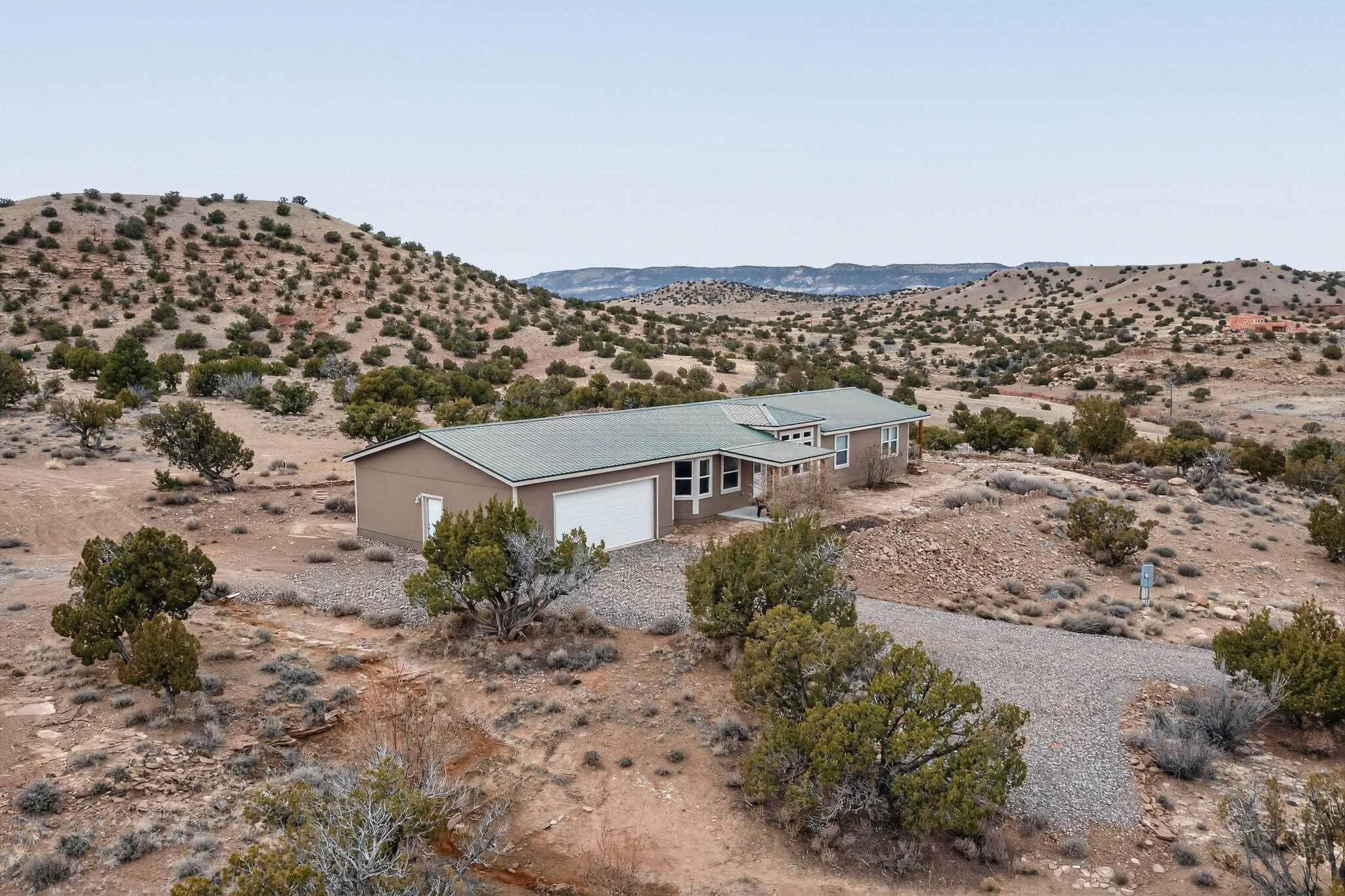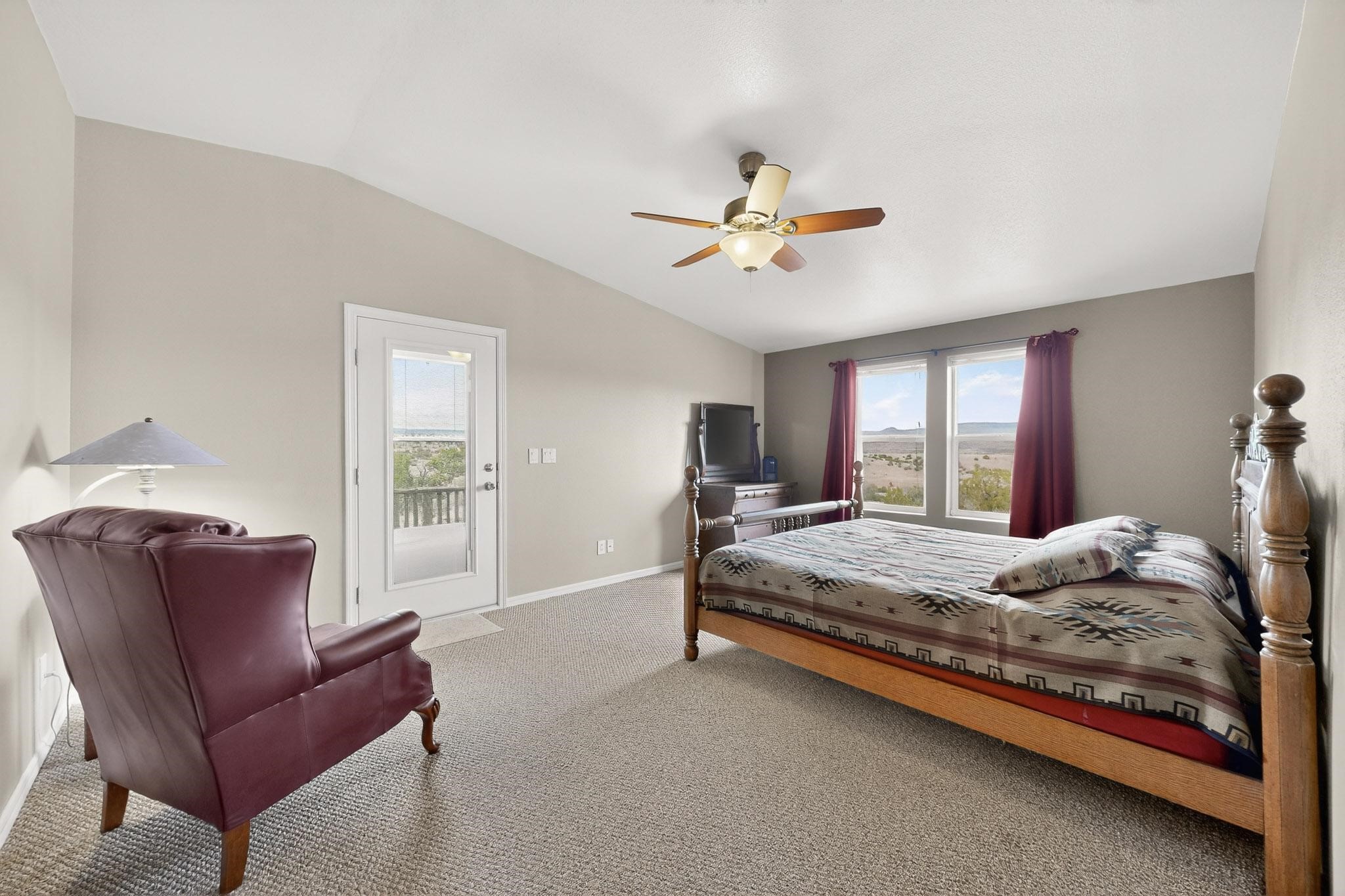 Discover unparalleled tranquility and magnificent scenery at this exceptional 9.43-acre property, offering quiet privacy and stunning lake and mountain vistas. This meticulously maintained acreage has about 3.5acres fenced, providing a secure and serene environment for the perfect New Mexico lifestyle. The full-featured, spacious 2,010 sq. ft. home is designed for comfortable living and practical functionality. Storage is ample, including an oversized laundry room and an impressive 30 ft. by 30 ft. garage. The heart of the home is the spacious, user-friendly kitchen, a culinary delight boasting high-quality finishes, a Bosch dishwasher, and a central island complete with a second sink and a convenient eating bar. The master suite is a true sanctuary, featuring its own private covered porch--an ideal spot for morning coffee or quiet reflection. The large ensuite bath is a luxurious space with a beautifully tiled walk-in shower and an expansive, huge closet. The second bedroom offers the same stunning views as the master and includes its own generous walk-in closet. A flexible office space features elegant built-in cabinetry and holds the potential to easily serve as a comfortable third bedroom. Throughout the home, you will find high-end architectural details and finishes, including soaring vaulted ceilings, solid stem walls, rich hickory cabinets, graceful arched doorways, and durable berber carpets. Allow yourself to be completely enchanted by the legendary sunrises and sunsets that grace this part of New Mexico, painting the sky with unforgettable colors. We invite you to experience this property in full detail. Read the narrative under the first two photos. Please watch the comprehensive 3D VIDEO and the SHOWCASE VIDEO to fully appreciate the unique beauty and quality of this extraordinary lake-view retreat.