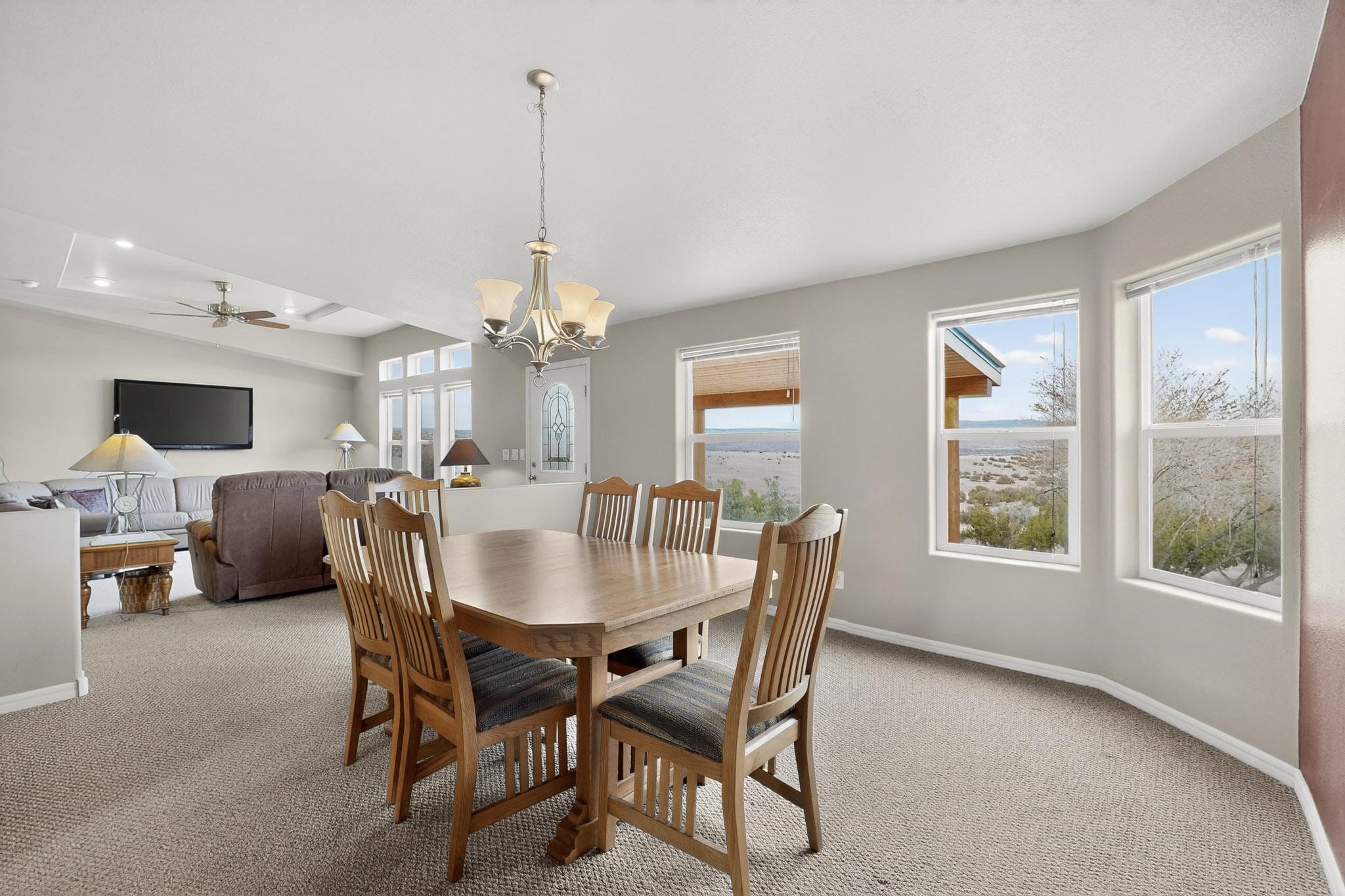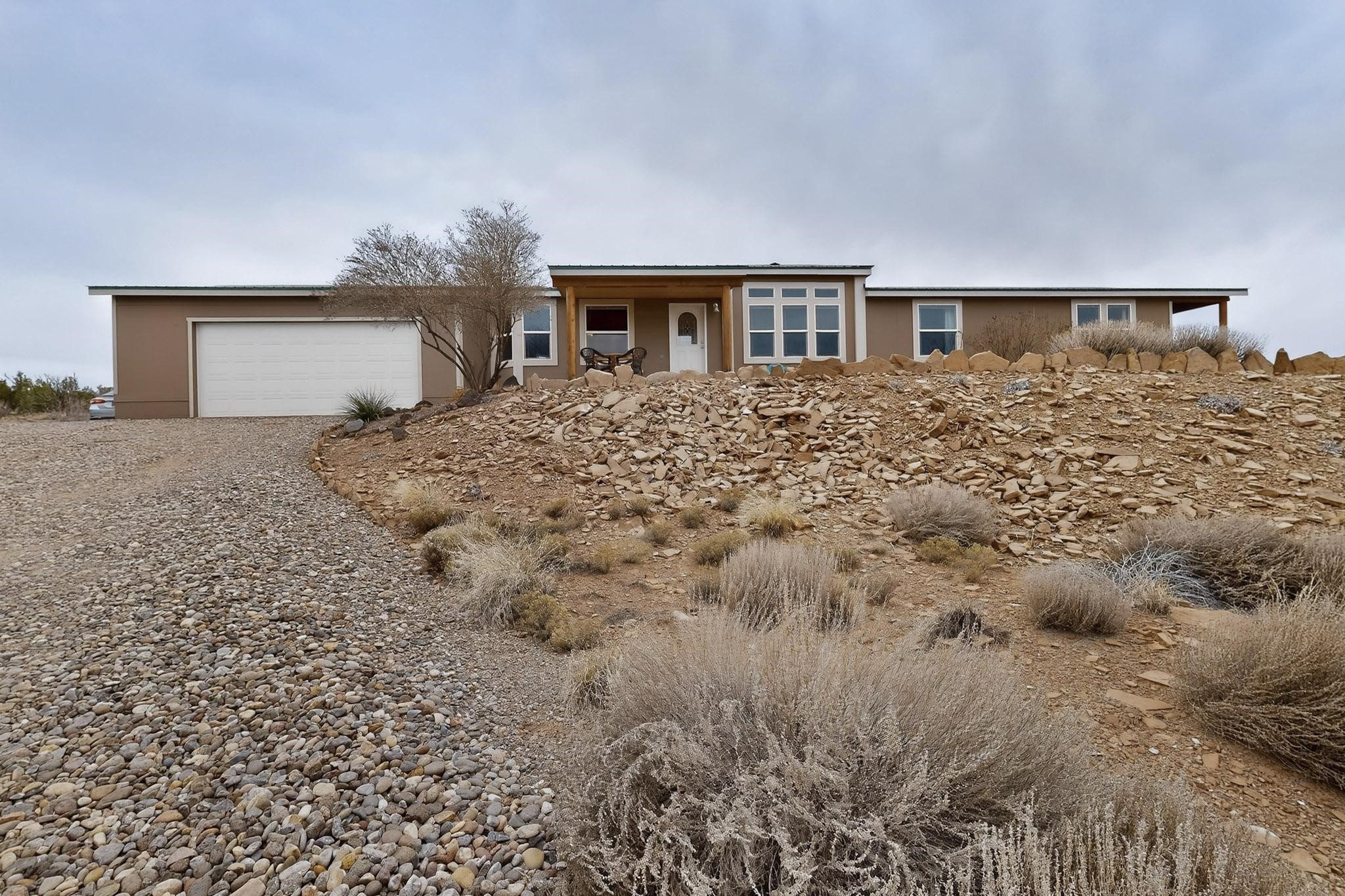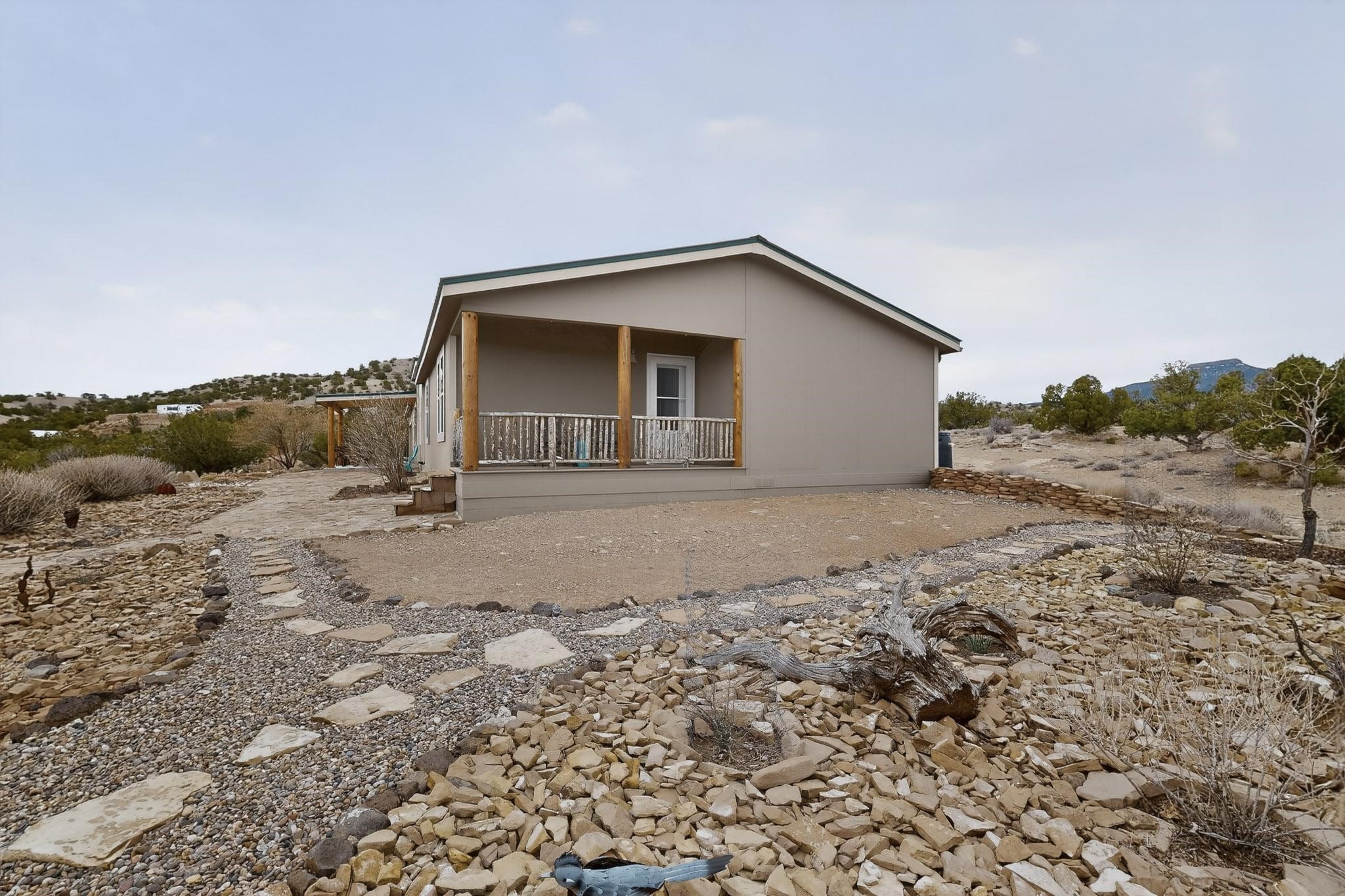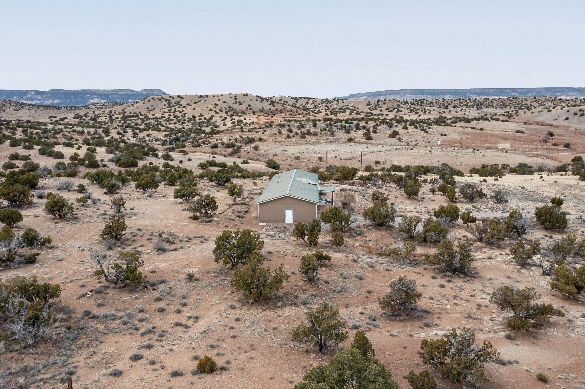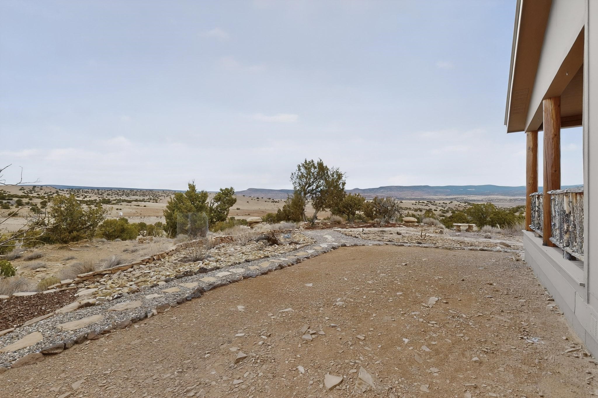 Discover unparalleled tranquility and magnificent scenery at this exceptional 9.43-acre property, offering quiet privacy and stunning lake and mountain vistas. This meticulously maintained acreage has about 3.5acres fenced, providing a secure and serene environment for the perfect New Mexico lifestyle. The full-featured, spacious 2,010 sq. ft. home is designed for comfortable living and practical functionality. Storage is ample, including an oversized laundry room and an impressive 30 ft. by 30 ft. garage. The heart of the home is the spacious, user-friendly kitchen, a culinary delight boasting high-quality finishes, a Bosch dishwasher, and a central island complete with a second sink and a convenient eating bar. The master suite is a true sanctuary, featuring its own private covered porch--an ideal spot for morning coffee or quiet reflection. The large ensuite bath is a luxurious space with a beautifully tiled walk-in shower and an expansive, huge closet. The second bedroom offers the same stunning views as the master and includes its own generous walk-in closet. A flexible office space features elegant built-in cabinetry and holds the potential to easily serve as a comfortable third bedroom. Throughout the home, you will find high-end architectural details and finishes, including soaring vaulted ceilings, solid stem walls, rich hickory cabinets, graceful arched doorways, and durable berber carpets. Allow yourself to be completely enchanted by the legendary sunrises and sunsets that grace this part of New Mexico, painting the sky with unforgettable colors. We invite you to experience this property in full detail. Read the narrative under the first two photos. Please watch the comprehensive 3D VIDEO and the SHOWCASE VIDEO to fully appreciate the unique beauty and quality of this extraordinary lake-view retreat.
