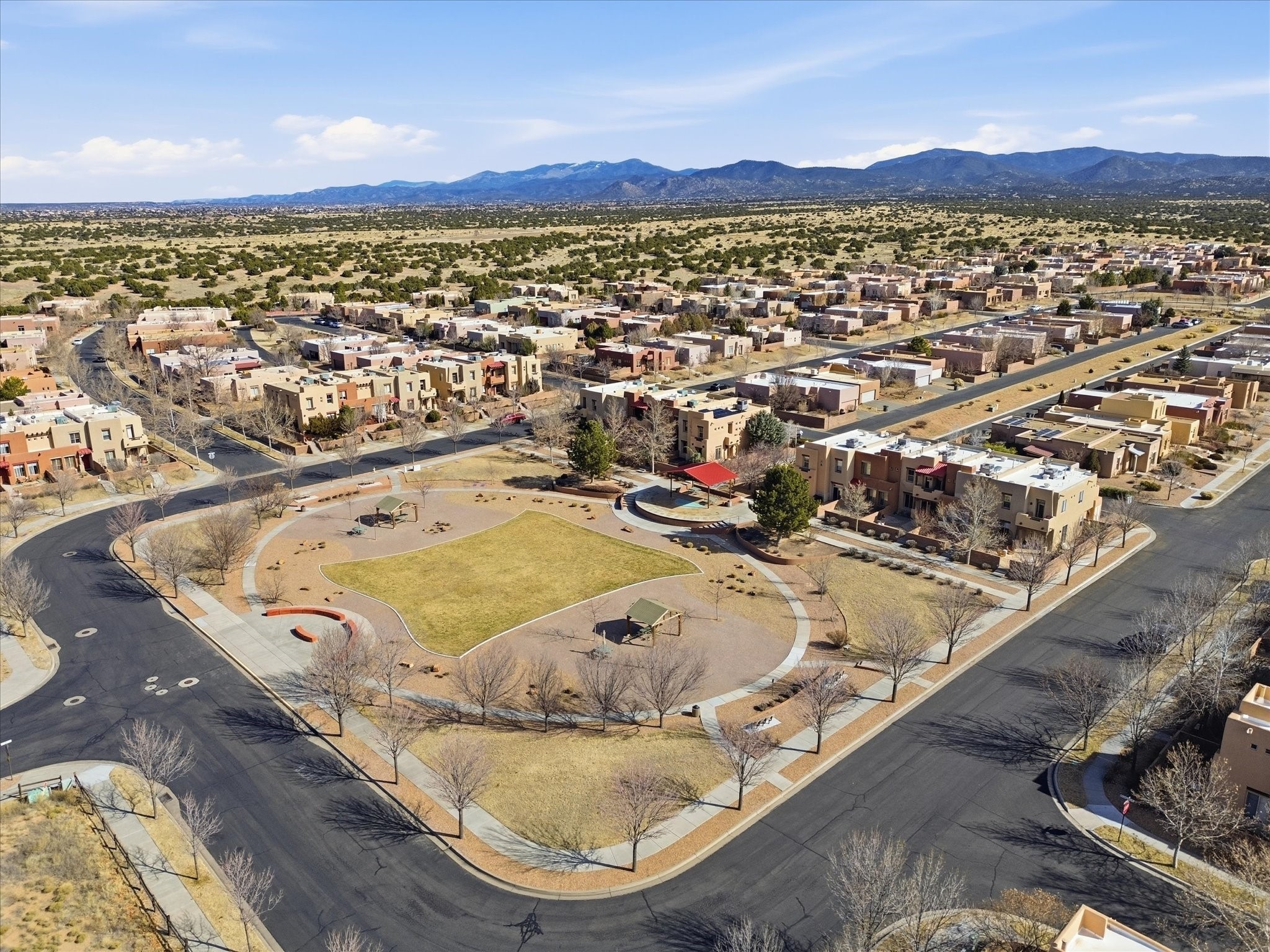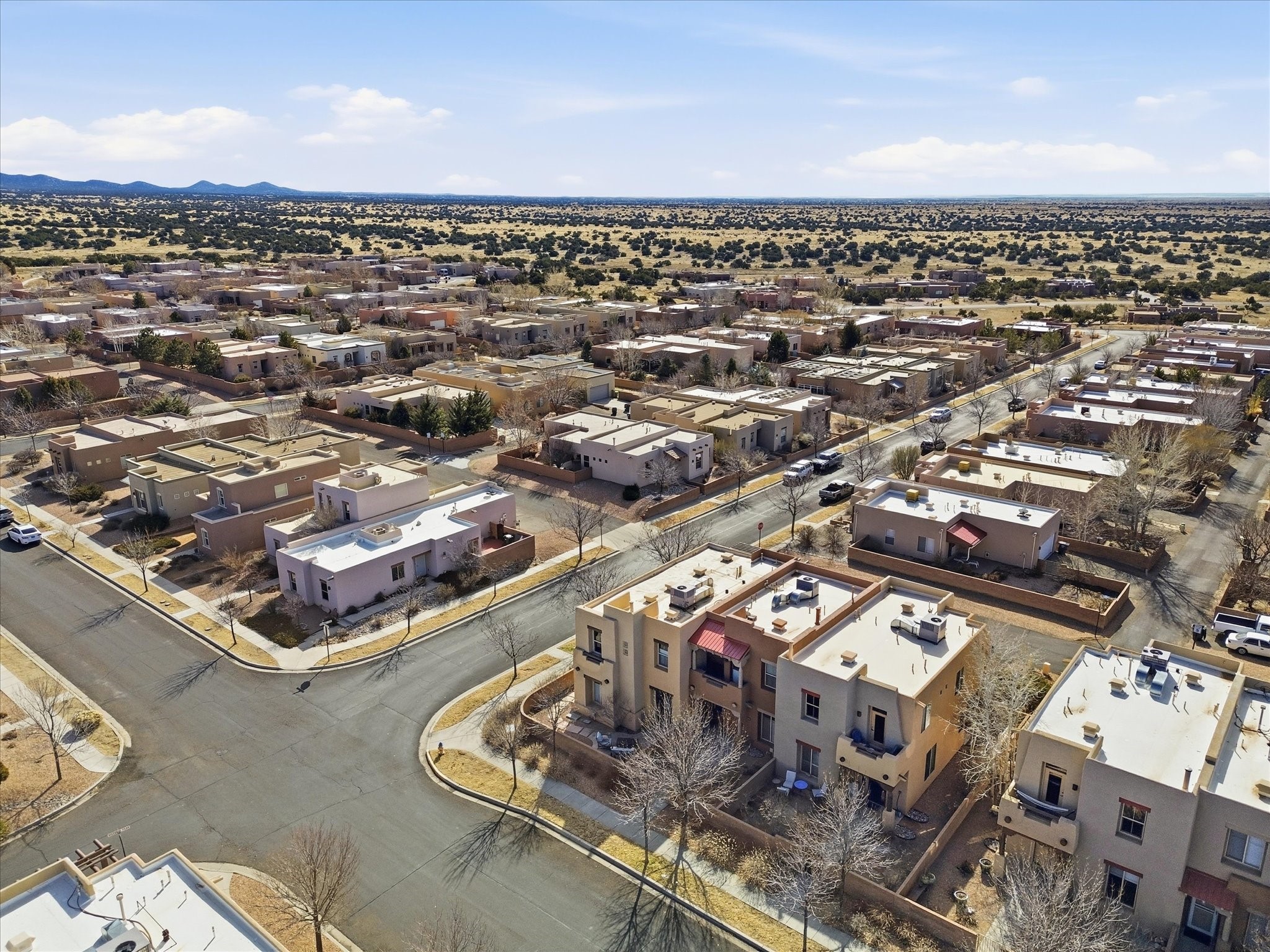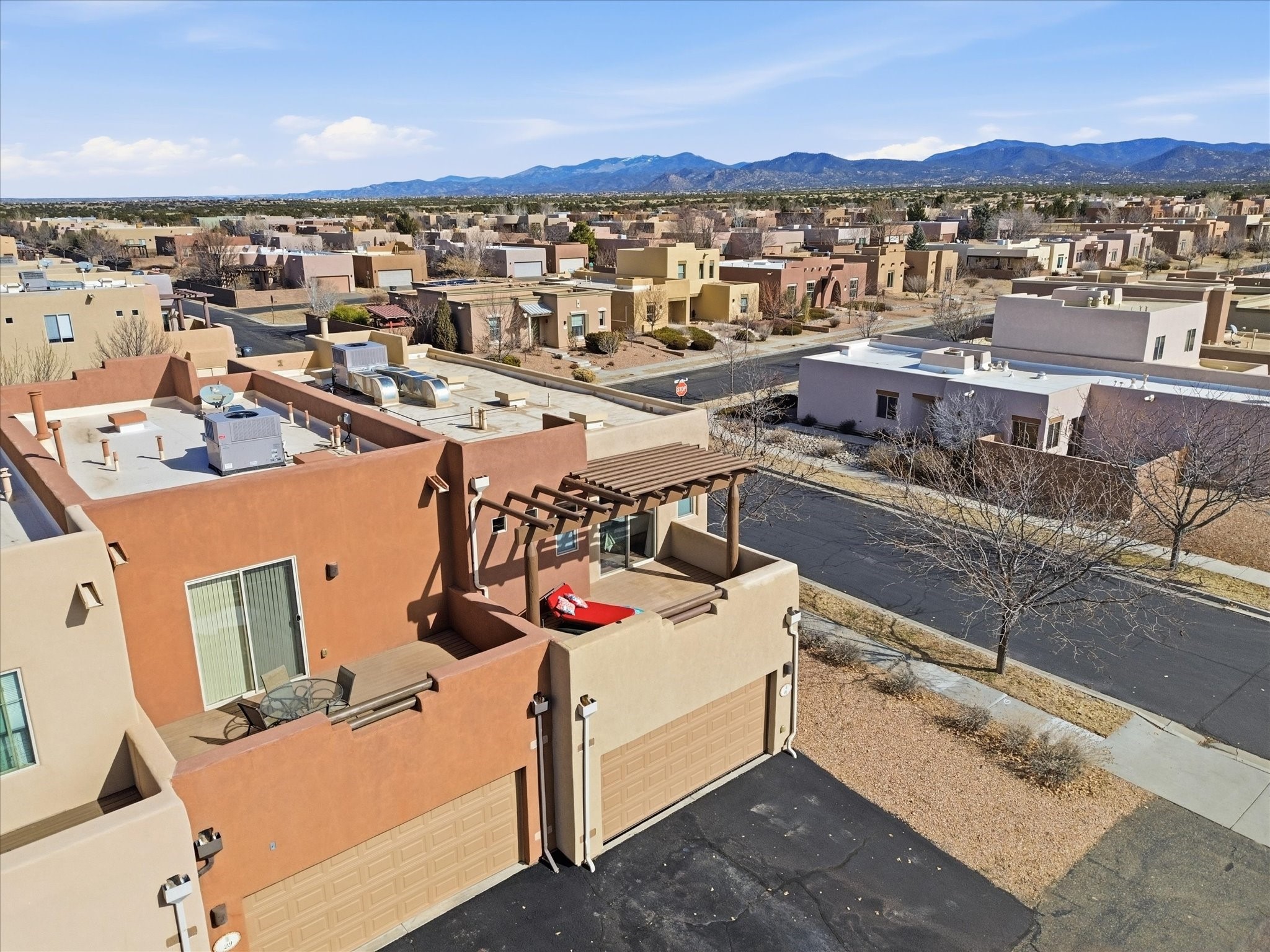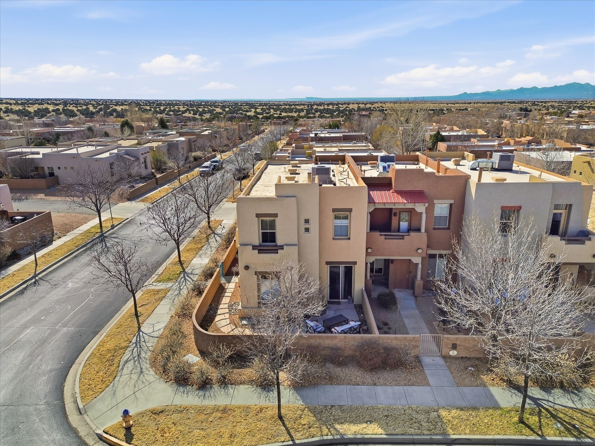 Elevate your lifestyle with this exceptional sun filled end-unit townhome in the desirable Rancho Viejo community. Combine modern comforts and Santa Fe charm in this elegant residence of +/-1700 sq. ft. thoughtfully designed living space with a versatile 3BR and 2 1/2 Bath. Step into a low maintenance wrap around courtyard on a flagstone patio with a sliding door to the tiled dining area. In the kitchen, you'll experience updated modern amenities including a new appliance package (2025) and a Kohler black stainless steel farmhouse sink. Convenient soft close cabinetry and Rev a shelf cabinet drawers for easy access. Enjoy filtered drinking water with the RO water filtration system.The living room is centered around a traditional Kiva gas fireplace and dramatic two-story ceiling adorned with classic vigas and clerestory windows. An efficient HVAC system with a Google Nest control panel allows remote monitoring while away or on the go. In-home and remote monitoring security features include Simplisafe security system and video ring doorbell.Follow the tiled hallway to the flex room appointed as an additional bedroom, office or media room with courtyard view and entry. Powder room (1/2 bath) is steps away. Upstairs, the primary bedroom ensuite offers a private retreat complete with sliding door to a generous deck to enjoy the remarkably quiet neighborhood with views to the East, South, and West. Your walk-in closet is set adjacent to the double vanity, bathtub and water closet.A loft area and second bedroom with reading nook and full bath completes the upper floor. All rooms adorned with custom Graber cellular shades. Entire interior repainted (2023) with custom accent walls. Solid wood door package complements the warm color palette.Additional upgrades include dimmer switches in every room with new flush mount overhead lighting and replaced lighting fixtures throughout.Ample storage with ground floor closet below stairway, double door linen closet off of loft and custom floor to ceiling cabinets in the attached 2-car garage.With Santa Fe's 320+ days of sunshine a year, the surrounding miles and miles of (paved) walking/biking trails are the perfect place for your sunrise and sunset strolls.