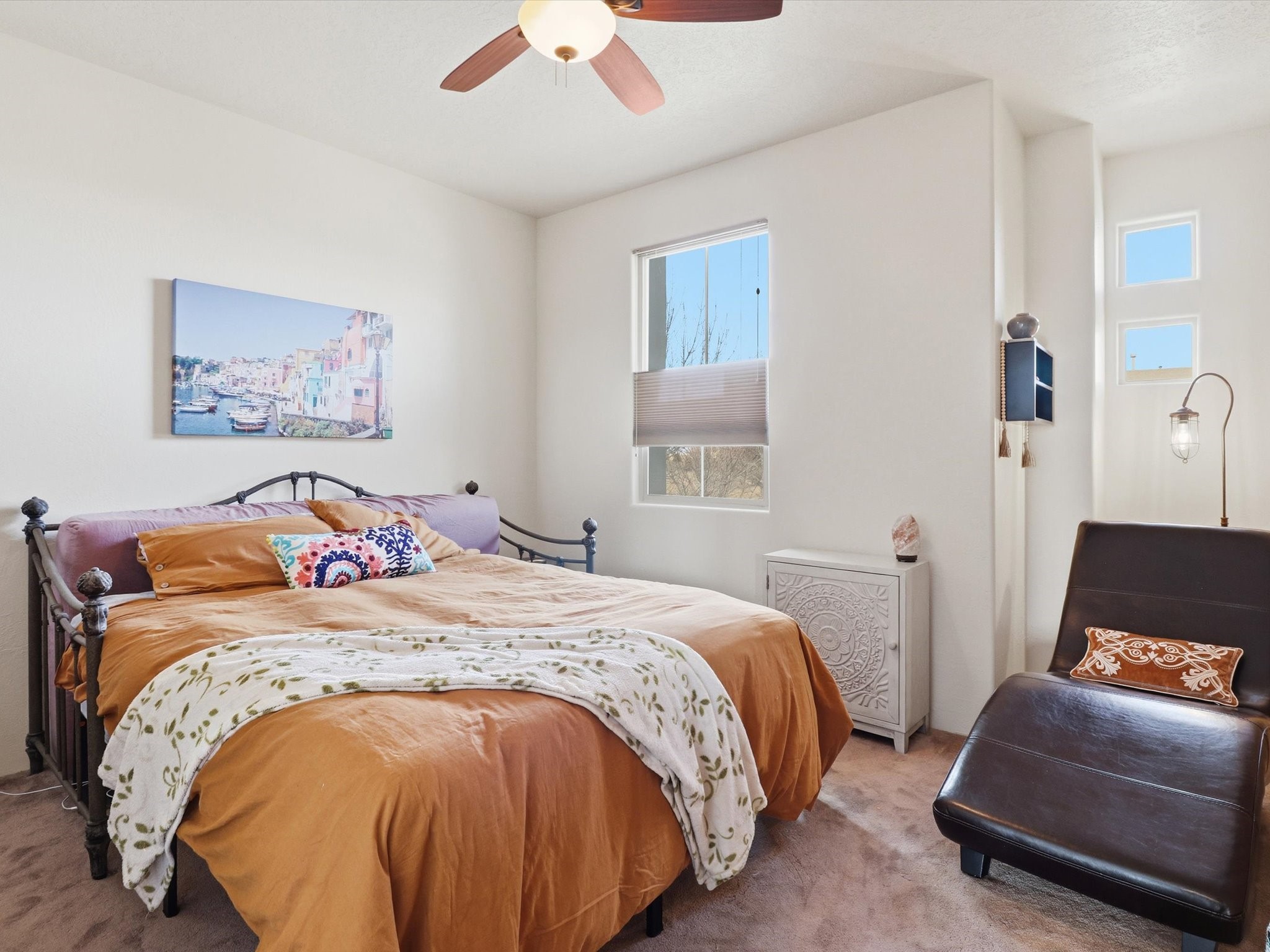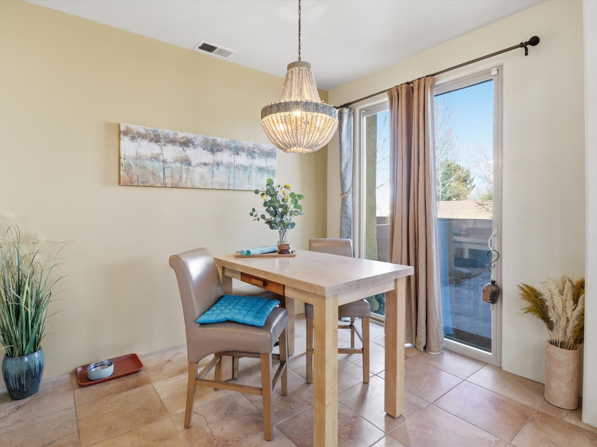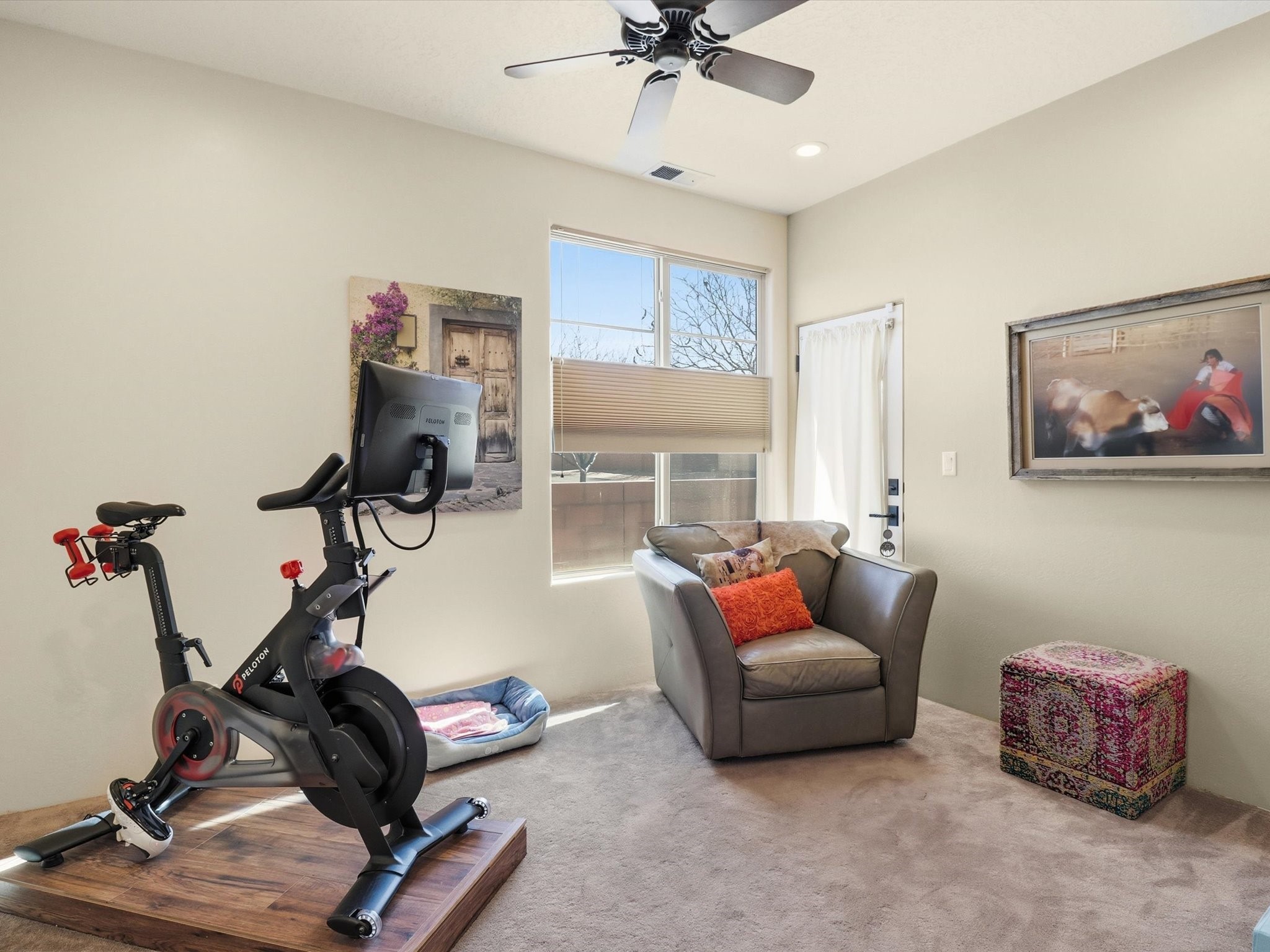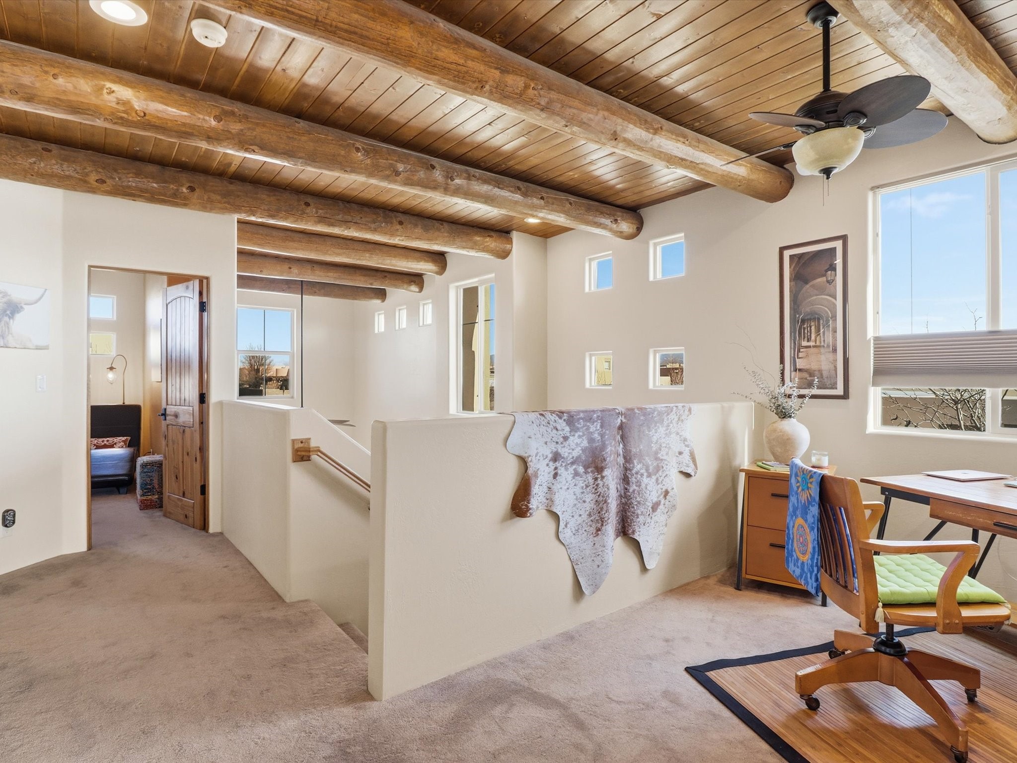 Elevate your lifestyle with this exceptional sun filled end-unit townhome in the desirable Rancho Viejo community. Combine modern comforts and Santa Fe charm in this elegant residence of +/-1700 sq. ft. thoughtfully designed living space with a versatile 3BR and 2 1/2 Bath. Step into a low maintenance wrap around courtyard on a flagstone patio with a sliding door to the tiled dining area. In the kitchen, you'll experience updated modern amenities including a new appliance package (2025) and a Kohler black stainless steel farmhouse sink. Convenient soft close cabinetry and Rev a shelf cabinet drawers for easy access. Enjoy filtered drinking water with the RO water filtration system.The living room is centered around a traditional Kiva gas fireplace and dramatic two-story ceiling adorned with classic vigas and clerestory windows. An efficient HVAC system with a Google Nest control panel allows remote monitoring while away or on the go. In-home and remote monitoring security features include Simplisafe security system and video ring doorbell.Follow the tiled hallway to the flex room appointed as an additional bedroom, office or media room with courtyard view and entry. Powder room (1/2 bath) is steps away. Upstairs, the primary bedroom ensuite offers a private retreat complete with sliding door to a generous deck to enjoy the remarkably quiet neighborhood with views to the East, South, and West. Your walk-in closet is set adjacent to the double vanity, bathtub and water closet.A loft area and second bedroom with reading nook and full bath completes the upper floor. All rooms adorned with custom Graber cellular shades. Entire interior repainted (2023) with custom accent walls. Solid wood door package complements the warm color palette.Additional upgrades include dimmer switches in every room with new flush mount overhead lighting and replaced lighting fixtures throughout.Ample storage with ground floor closet below stairway, double door linen closet off of loft and custom floor to ceiling cabinets in the attached 2-car garage.With Santa Fe's 320+ days of sunshine a year, the surrounding miles and miles of (paved) walking/biking trails are the perfect place for your sunrise and sunset strolls.