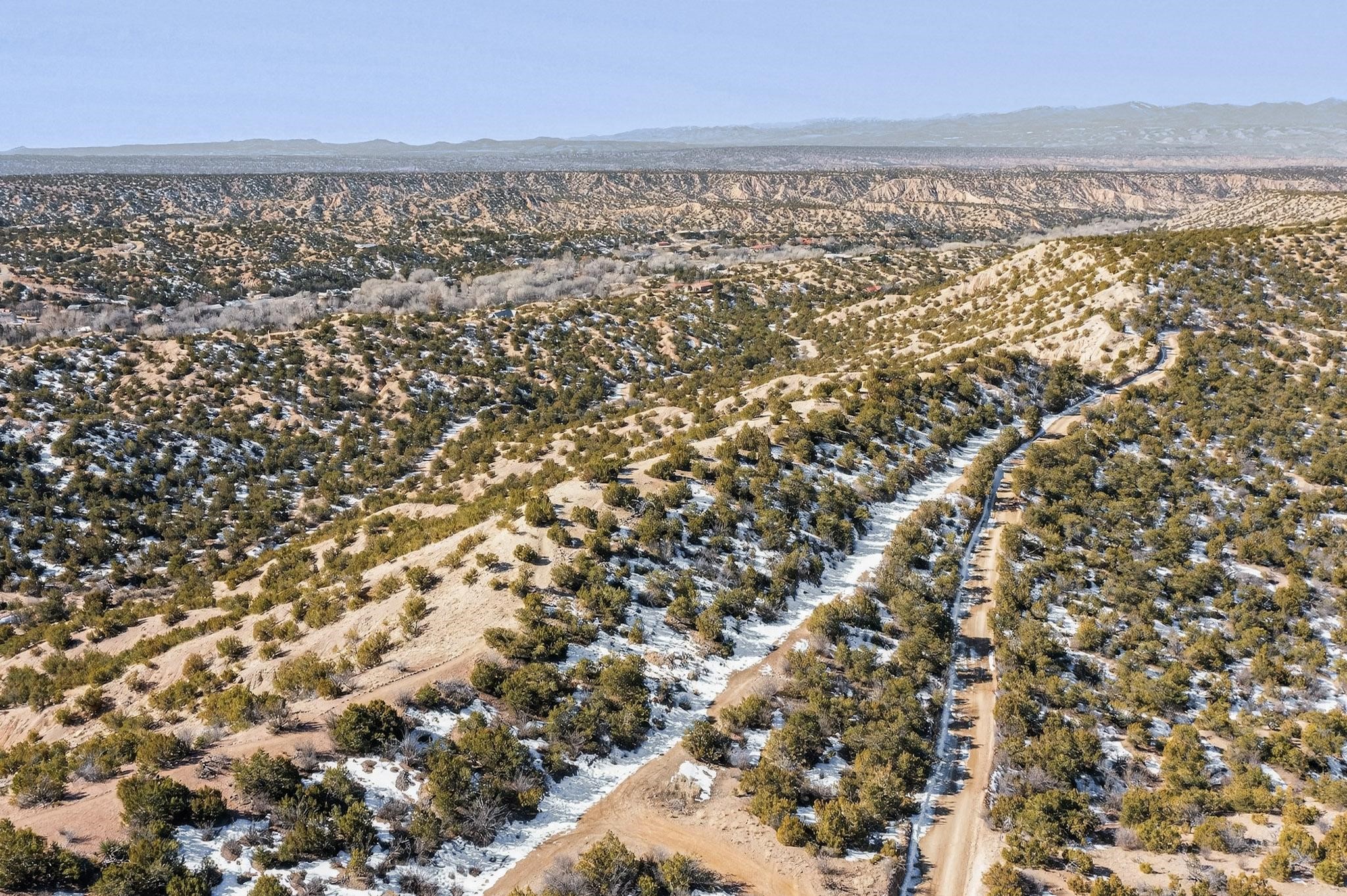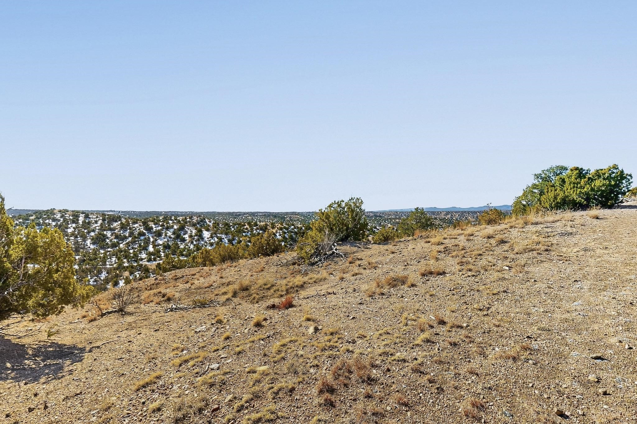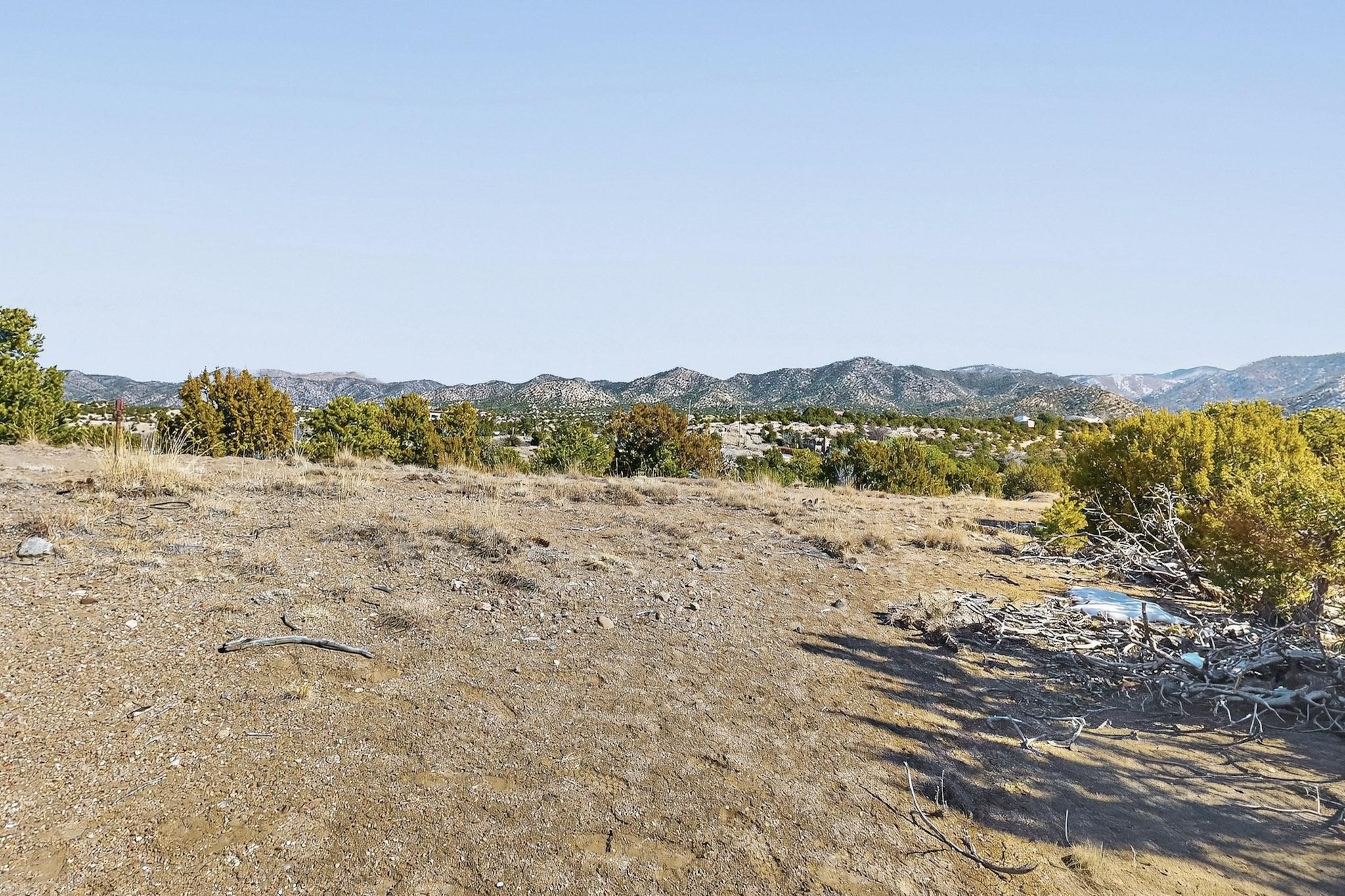 Breathtaking views from this astonishing 5.6 acre ridge top lot in a small private and gated subdivision moments from the village of Rio En Medio, which offers access to a trail head into the mountains of the National Forest and a nearby waterfall. A deep, sandy bottomed, canyon cuts through the lot. On Rio en medio community water. Power available. First lot inside the gate with a large flat building site . Minimal CC&Rs. All 5 lots can be purchased as a package. 2 minutes drive to fine dining at the Four Seasons Encantado Resort. Tesuque Village Market is 5 minutes and Santa Fe itself another 10.