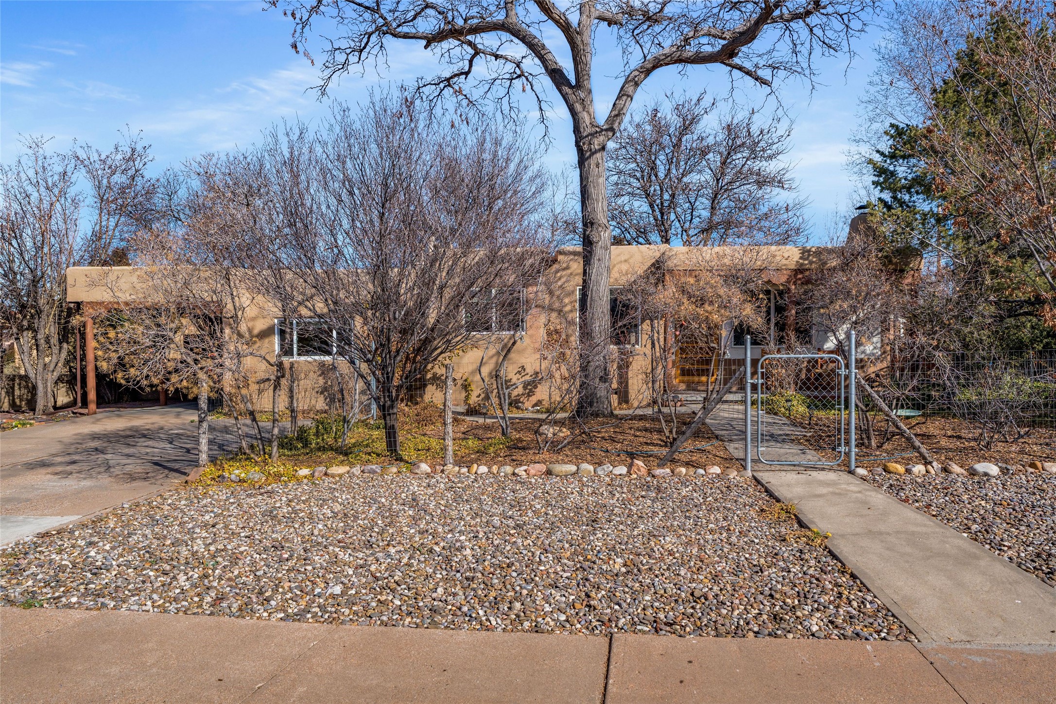 Immaculately preserved Allen Stamm-designed home on Casa Alegre's most sought-after street. Built in 1957, this charming three-bedroom, two-bathroom residence perfectly balances authentic mid-century character with thoughtful modern updates. Ideally situated in the heart of Casa Alegre, just steps from Gregory Lopez Park, this home offers the best of Santa Fe living in one of the city's most desirable neighborhoods. The sun-filled living room features a classic kiva fireplace and frames enchanting views of the lush front garden. An inviting dining room flows seamlessly into a beautifully updated kitchen, creating an ideal space for both everyday living and entertaining. Three bedrooms provide comfortable, peaceful sanctuaries, complemented by two tastefully remodeled bathrooms. Authentic details abound, including original hardwood floors, a traditional kiva fireplace, exposed vigas in most rooms, and original Stamm architectural character. From front and back portals, enjoy mature landscaping, deciduous trees, vibrant plantings, and established shrubs. Recent updates include a new sewer line to the street, updated windows, an updated hot water heater and boiler, a newer washer and dryer, mini-split systems in two bedrooms and the living room, and new tile flooring in the third bedroom.