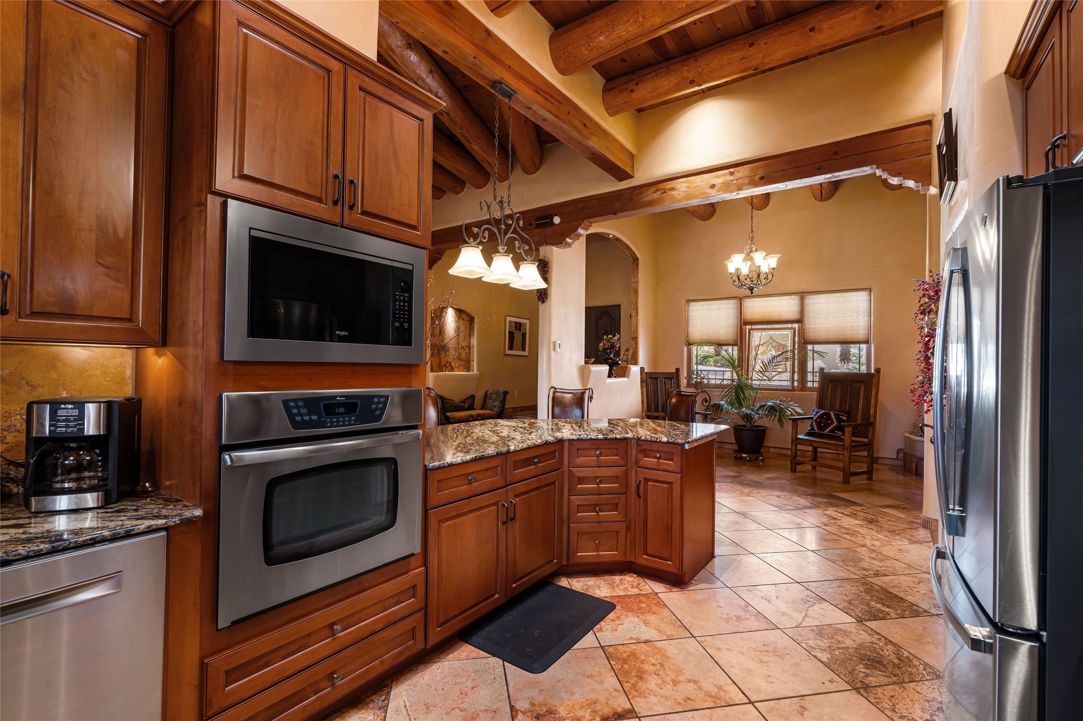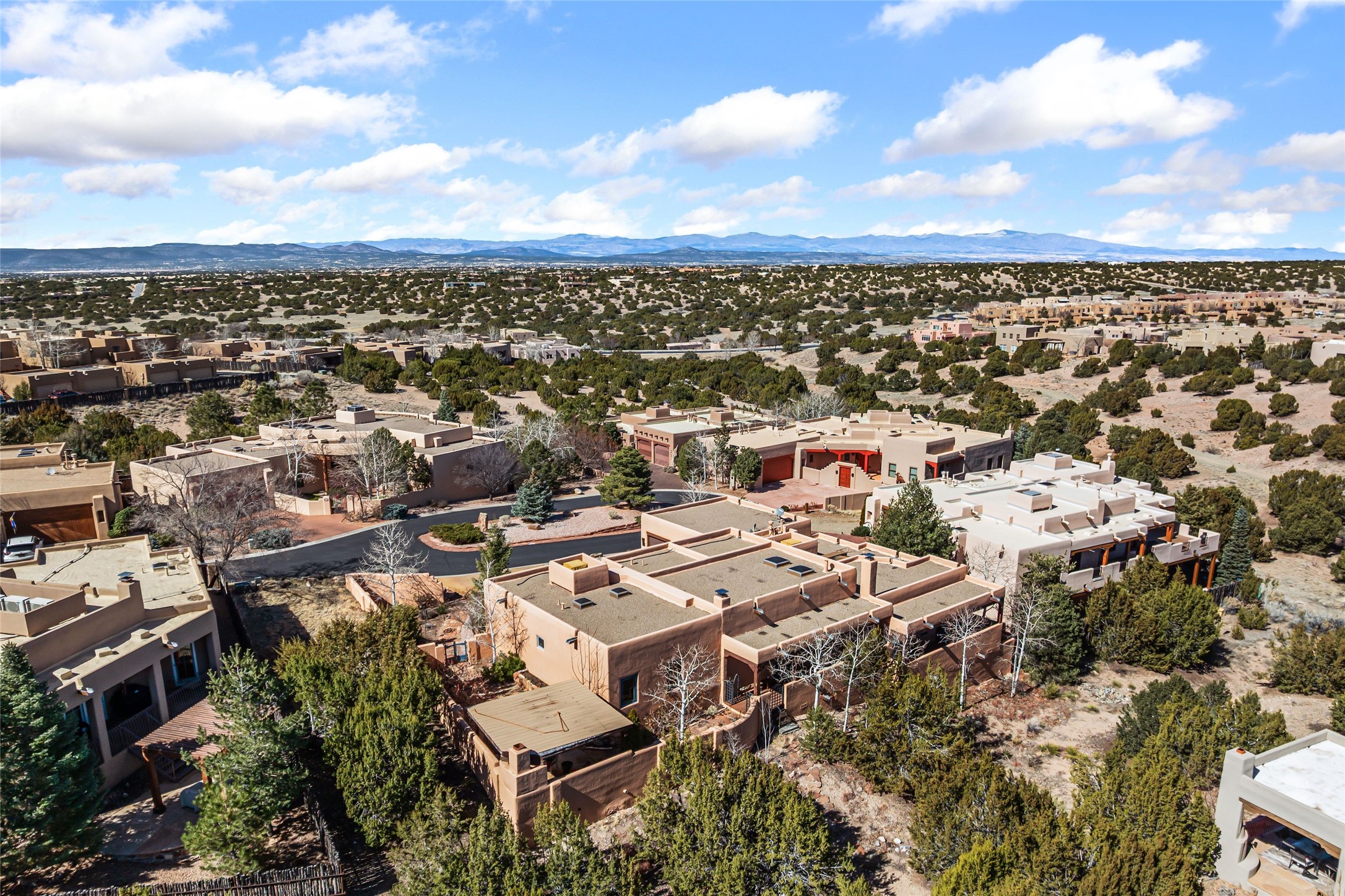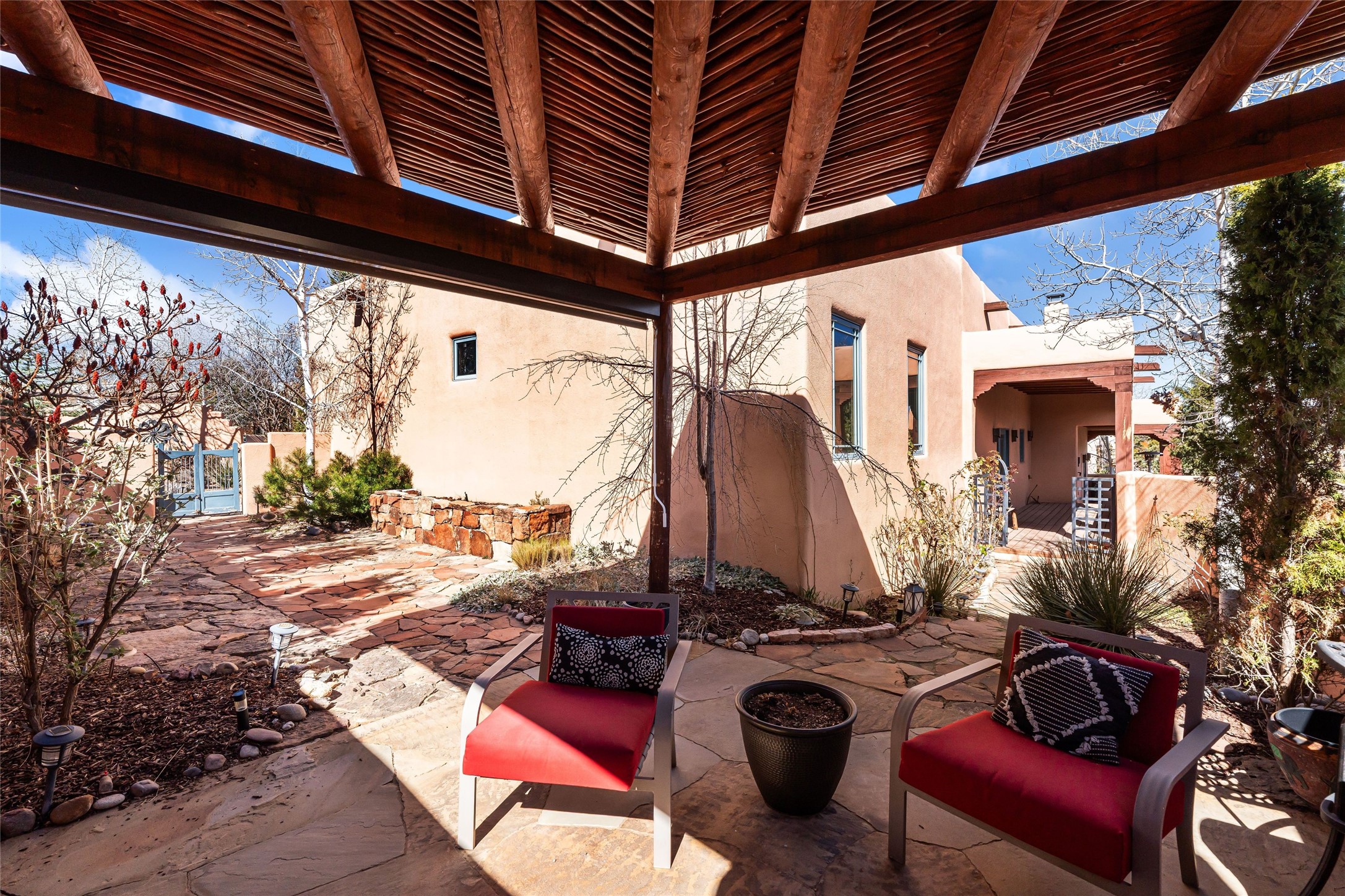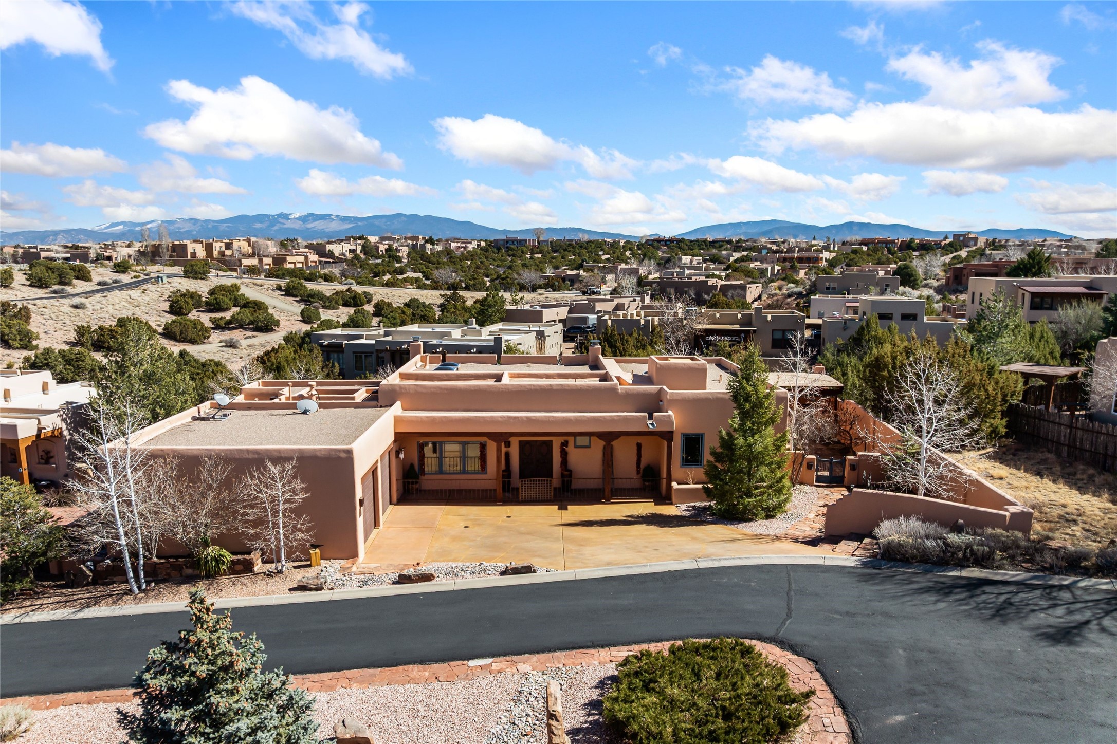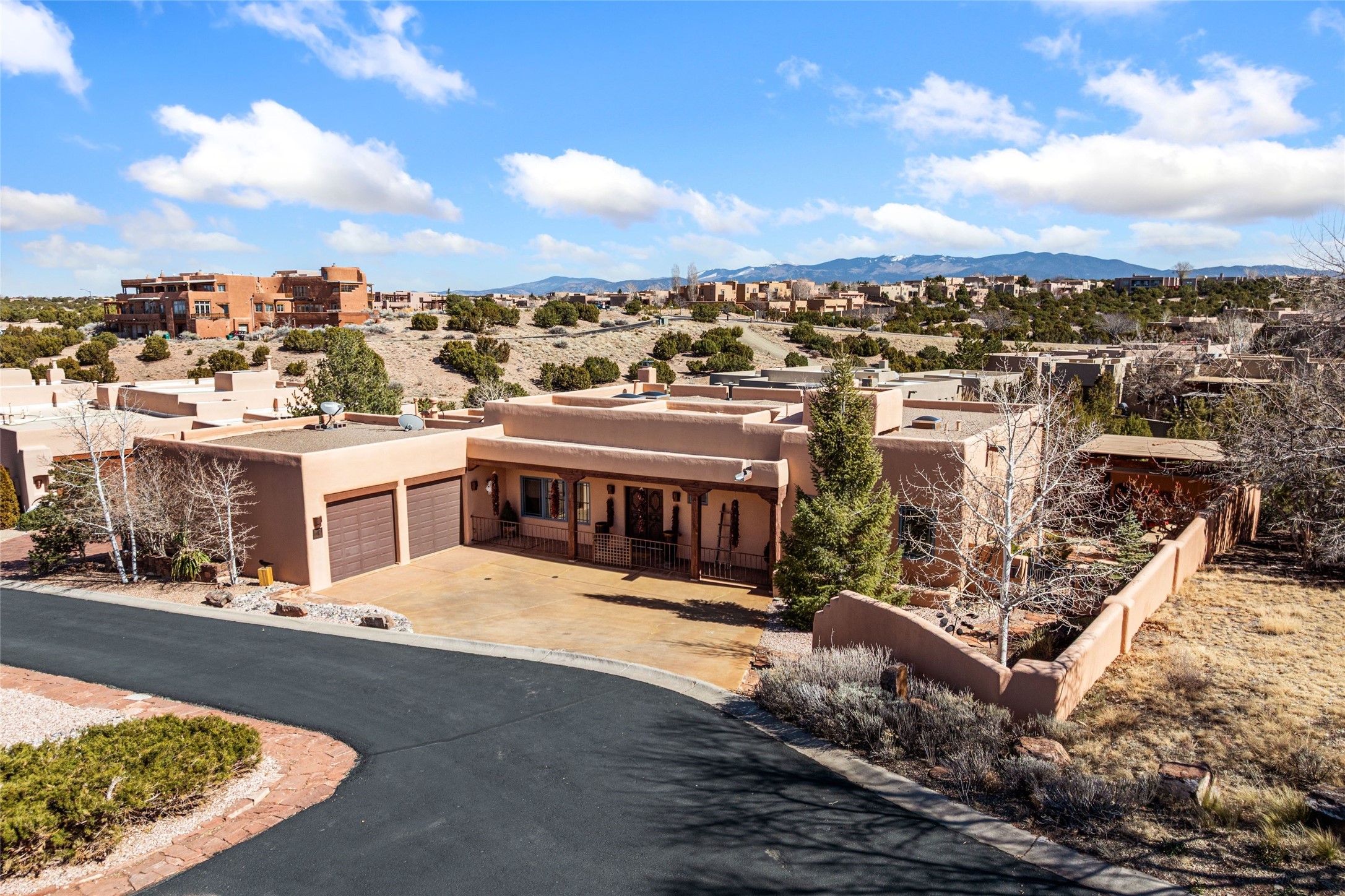 Discover this single-level Aldea home in Santa Fe, just 13 minutes to the Plaza, where travertine floors, diamond plaster walls, and soaring wood ceilings with substantial vigas create a warm, elegant, and inviting Santa Fe experience. Built by Mirtha Davalos of El Bosque Builders, this 2,529 sf residence blends craftsmanship, privacy, and thoughtful design on a quiet cul-de-sac bordering open space with mature trees. The living room opens seamlessly to an expansive entertaining portal with woodburning kiva fireplace that will wow your guests. Extensive portals wrap the home alongside landscaped gardens, mature trees, and bordering open space, creating a tranquil setting and a sanctuary for birds in the area. The kitchen offers gorgeous granite countertops, double wall ovens, under-counter lighting, a large pantry, generous cabinetry, and natural flow into the dining area that has a lovely built-in fountain. Sliders extend living spaces outward for effortless indoor-outdoor living. The primary bedroom suite includes its own kiva fireplace, en-suite bathroom, walk-in closet, and direct access to a covered portal. Two guest bedrooms are positioned on the opposite wing for strong separation of space. All three bedrooms include large walk-in closets. Additional features include a powder room, two coat closets, skylights, nichos, laundry room with sink, and attached two-car garage. In-floor radiant heat and evaporative cooling provide year-round comfort. No carpeting! Located within the Aldea community with access to walking trails, parks, and a community center, this single-level Santa Fe home offers architectural authenticity, open-space privacy, and proximity to downtown.