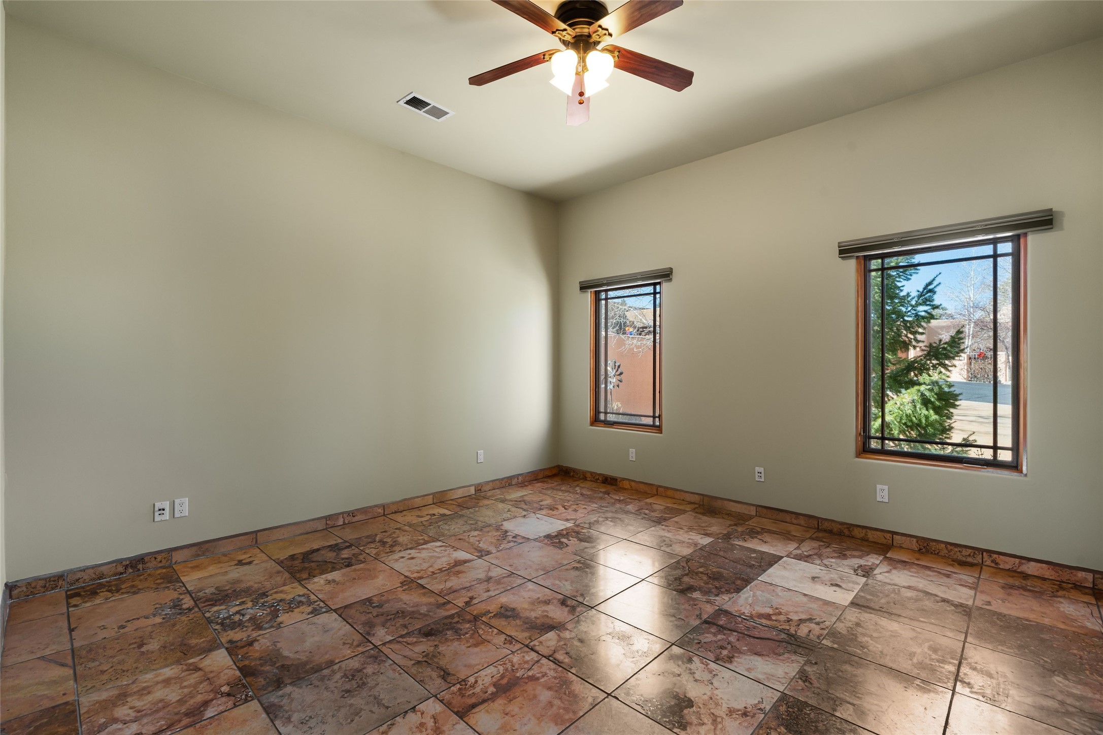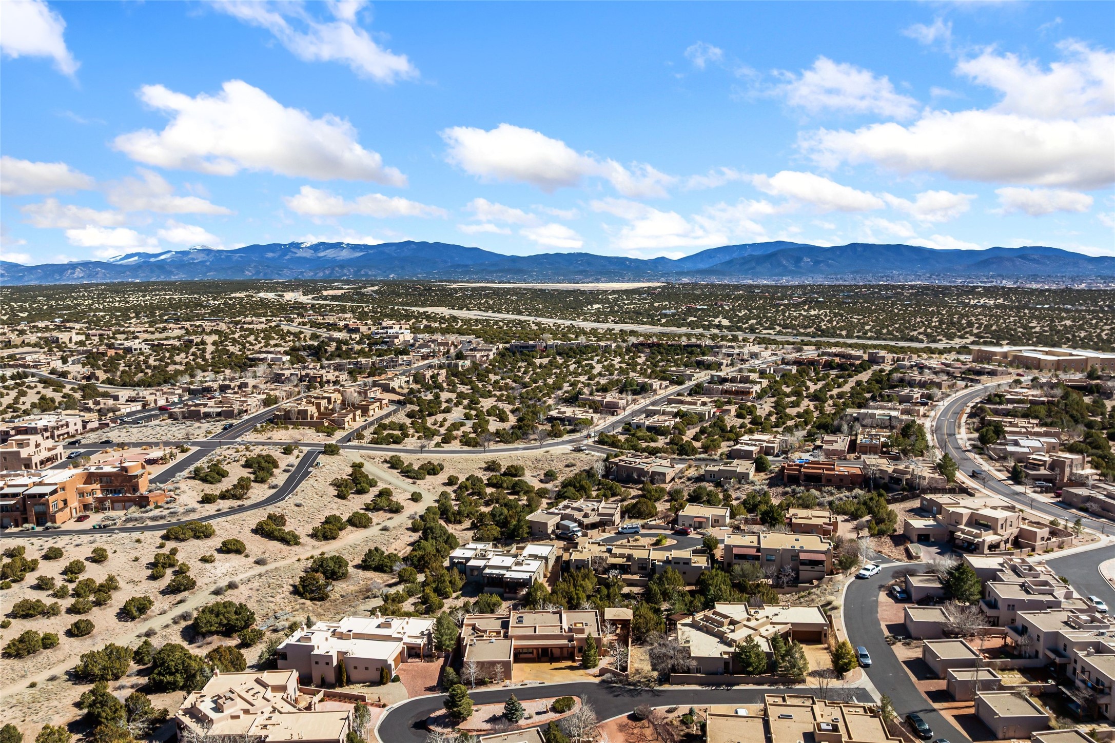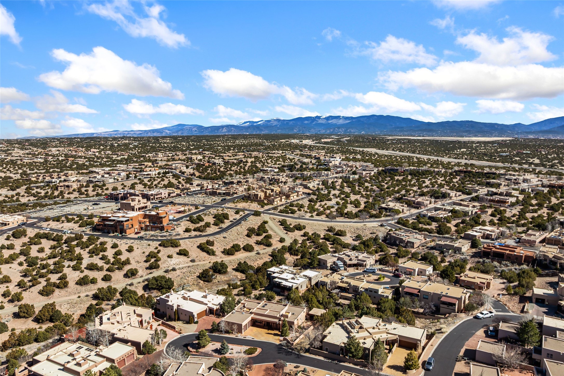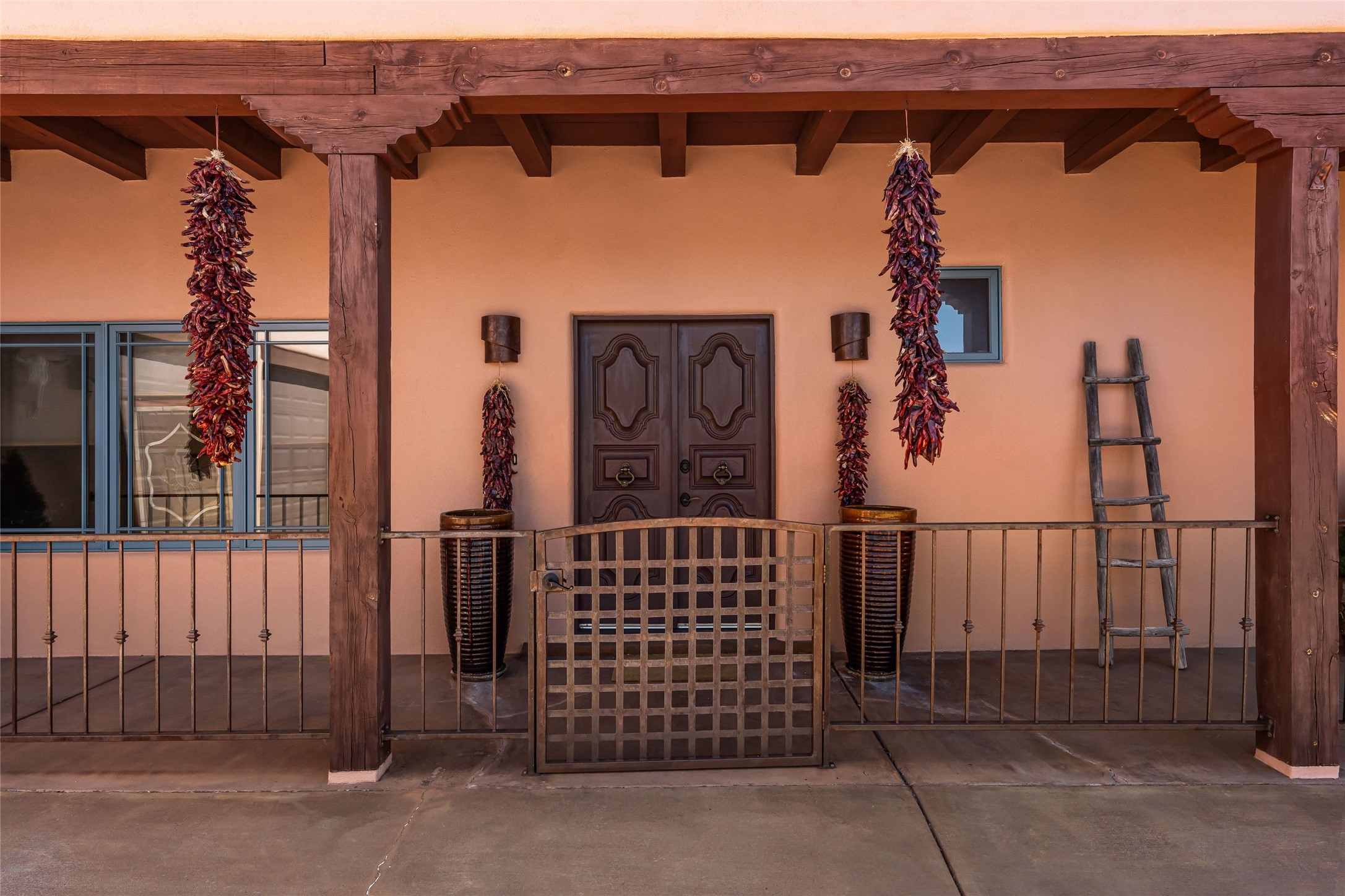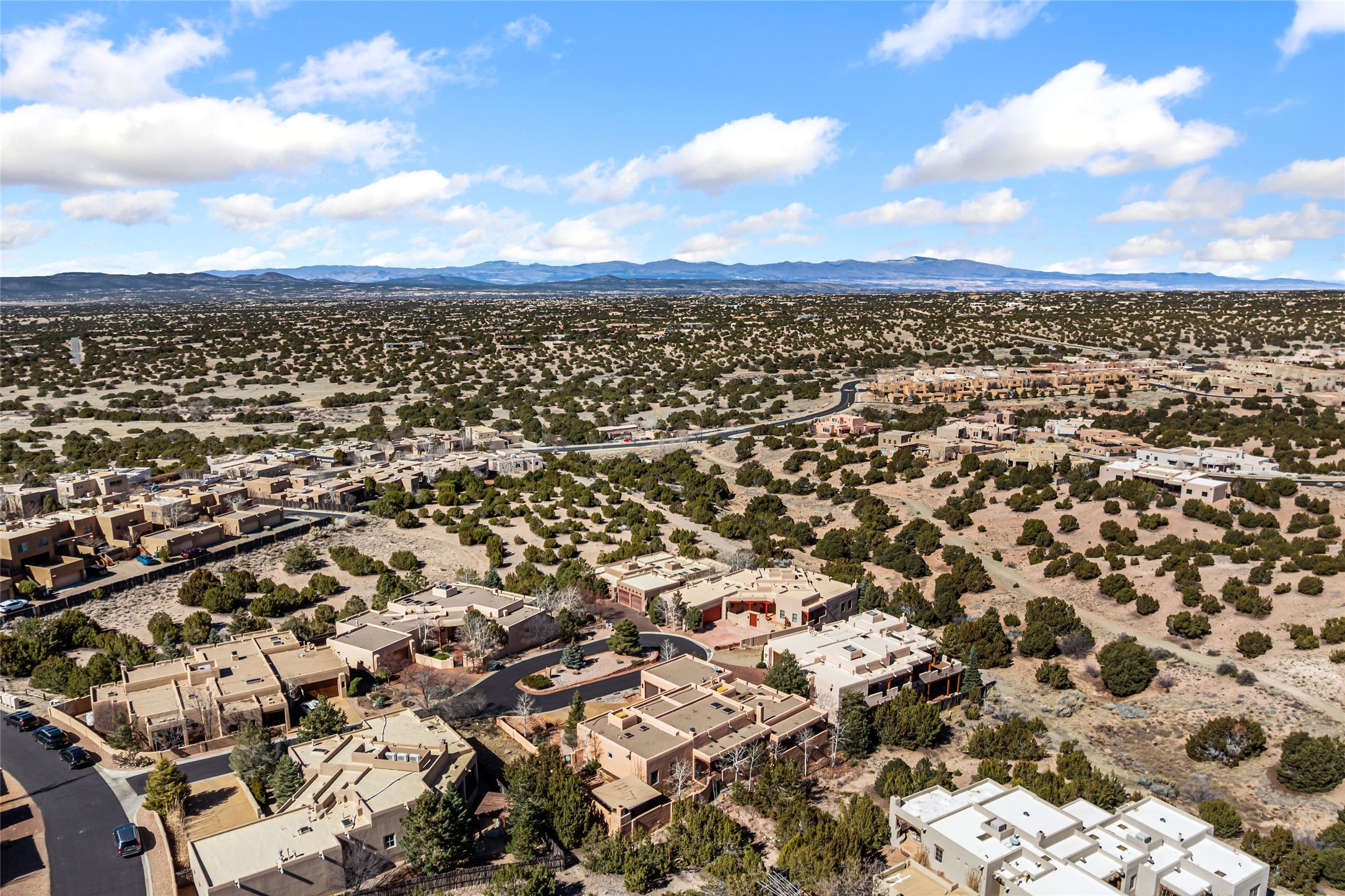 Discover this single-level Aldea home in Santa Fe, just 13 minutes to the Plaza, where travertine floors, diamond plaster walls, and soaring wood ceilings with substantial vigas create a warm, elegant, and inviting Santa Fe experience. Built by Mirtha Davalos of El Bosque Builders, this 2,529 sf residence blends craftsmanship, privacy, and thoughtful design on a quiet cul-de-sac bordering open space with mature trees. The living room opens seamlessly to an expansive entertaining portal with woodburning kiva fireplace that will wow your guests. Extensive portals wrap the home alongside landscaped gardens, mature trees, and bordering open space, creating a tranquil setting and a sanctuary for birds in the area. The kitchen offers gorgeous granite countertops, double wall ovens, under-counter lighting, a large pantry, generous cabinetry, and natural flow into the dining area that has a lovely built-in fountain. Sliders extend living spaces outward for effortless indoor-outdoor living. The primary bedroom suite includes its own kiva fireplace, en-suite bathroom, walk-in closet, and direct access to a covered portal. Two guest bedrooms are positioned on the opposite wing for strong separation of space. All three bedrooms include large walk-in closets. Additional features include a powder room, two coat closets, skylights, nichos, laundry room with sink, and attached two-car garage. In-floor radiant heat and evaporative cooling provide year-round comfort. No carpeting! Located within the Aldea community with access to walking trails, parks, and a community center, this single-level Santa Fe home offers architectural authenticity, open-space privacy, and proximity to downtown.