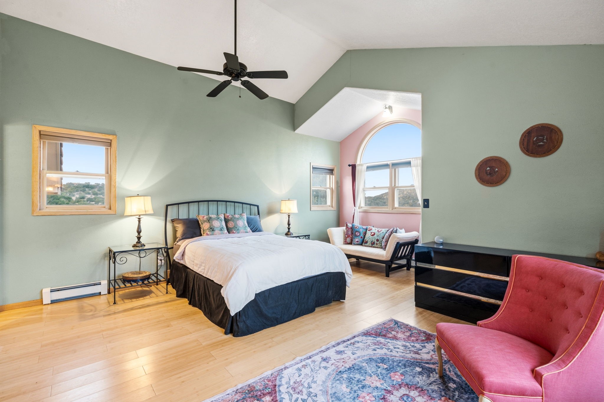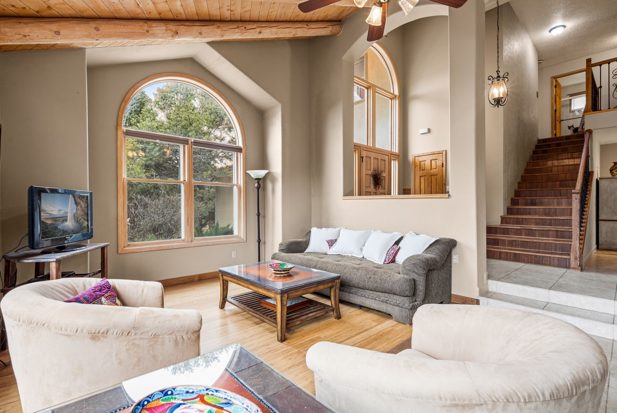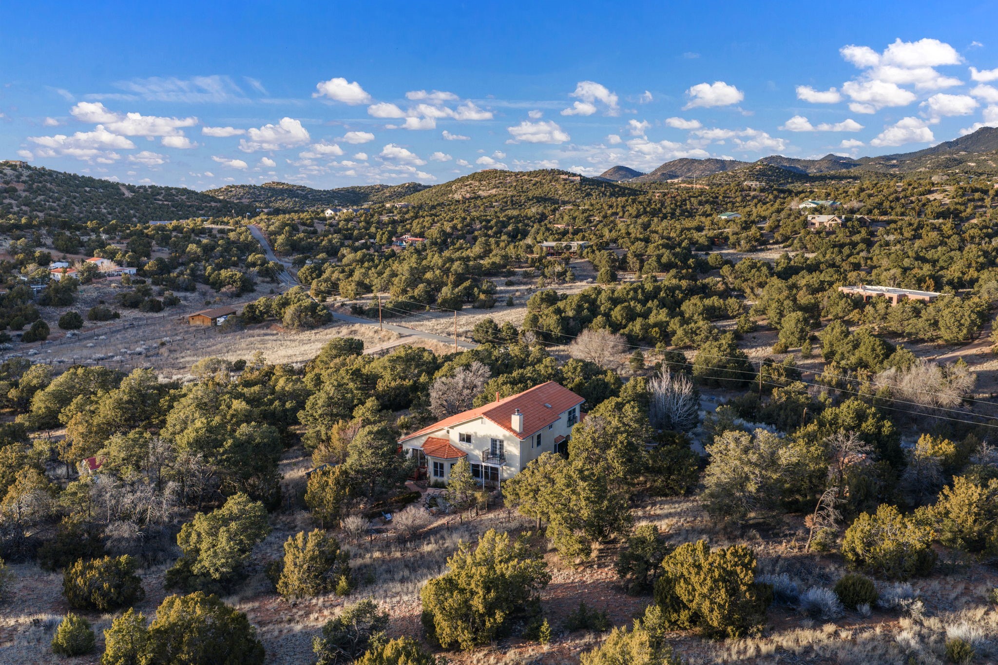 Set on more than five wooded acres just 20 minutes from the historic Santa Fe Plaza, this Spanish-style retreat offers rare privacy, expansive views, and the feeling of owning your own secluded oasis while remaining close to town. Elevated above the road and surrounded by native pion, pine, and cedar, the property enjoys rolling terrain, endless skies, and sunsets that glow in gold and crimson before giving way to brilliant, star-filled nights. The setting is peaceful, immersive, and grounding. Inside, natural light pours through generous windows, illuminating soaring ceilings and open living spaces that feel both grand and inviting. Warm wood and tile flooring, iron accents, and timeless architectural details reflect authentic Spanish character. The beautifully refreshed kitchen anchors the home, offering generous space to gather, cook, and entertain with ease. Upstairs, spacious bedrooms provide comfort and privacy, including one with a balcony set among the trees. The primary suite serves as a private sanctuary with a deep soaking tub and oversized shower for a spa-inspired experience. A detached studio offers flexibility for guests, creative pursuits, or a home office. Outdoors, enjoy curated landscaping, a tranquil pond, covered patio with traditional horno, and fenced space for pets.Offering land, light, views, and proximity, this is Santa Fe living at its most serene, a rare opportunity to experience space, beauty, and quiet connection to nature just minutes from the Plaza.