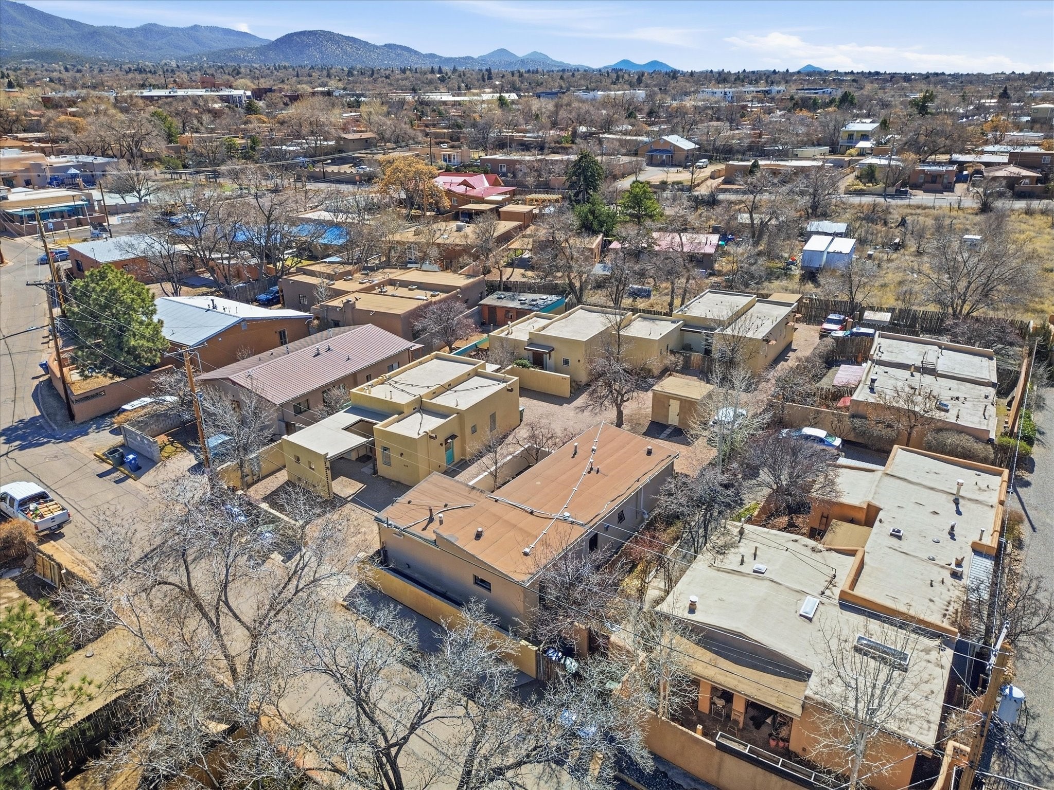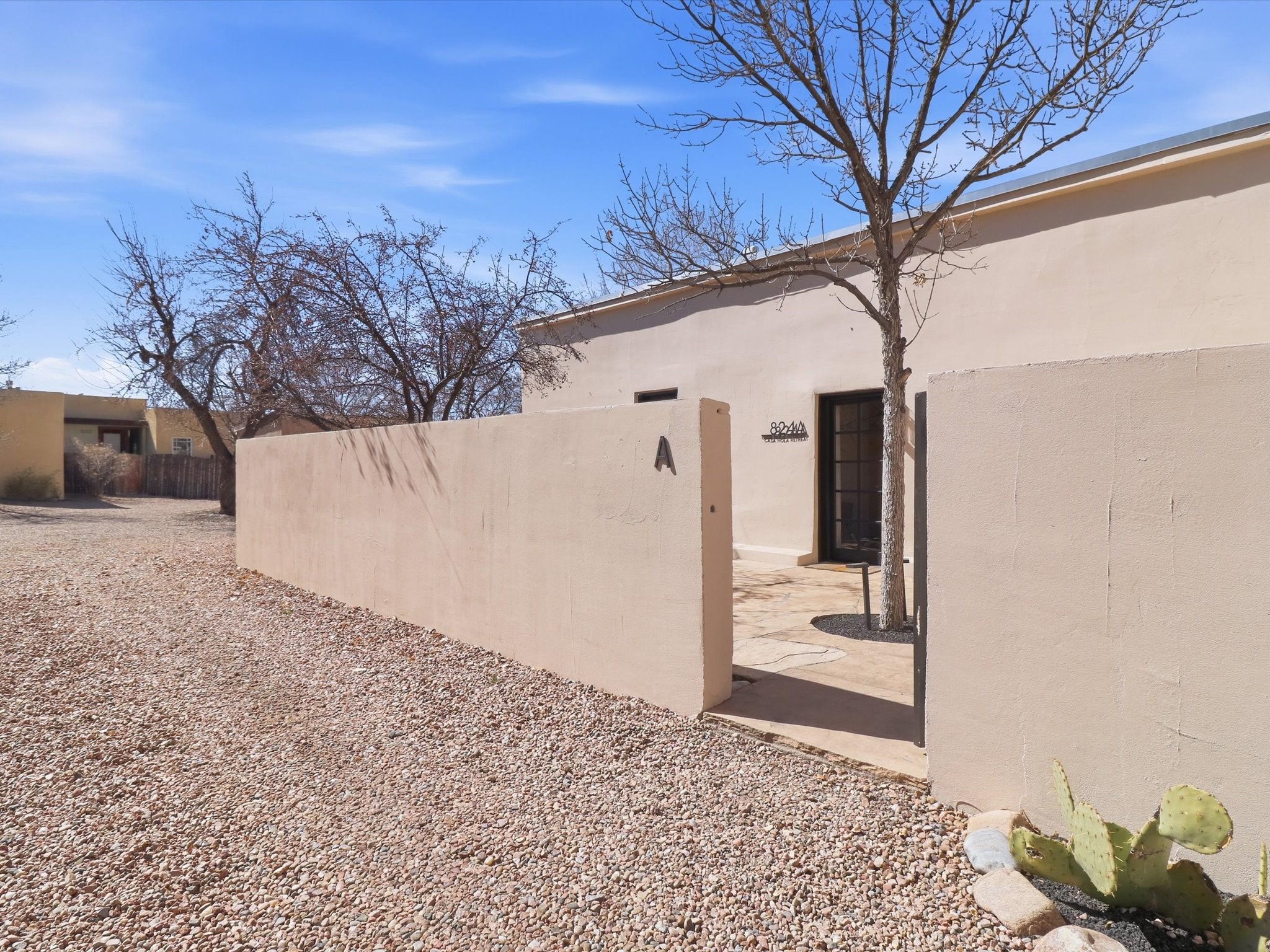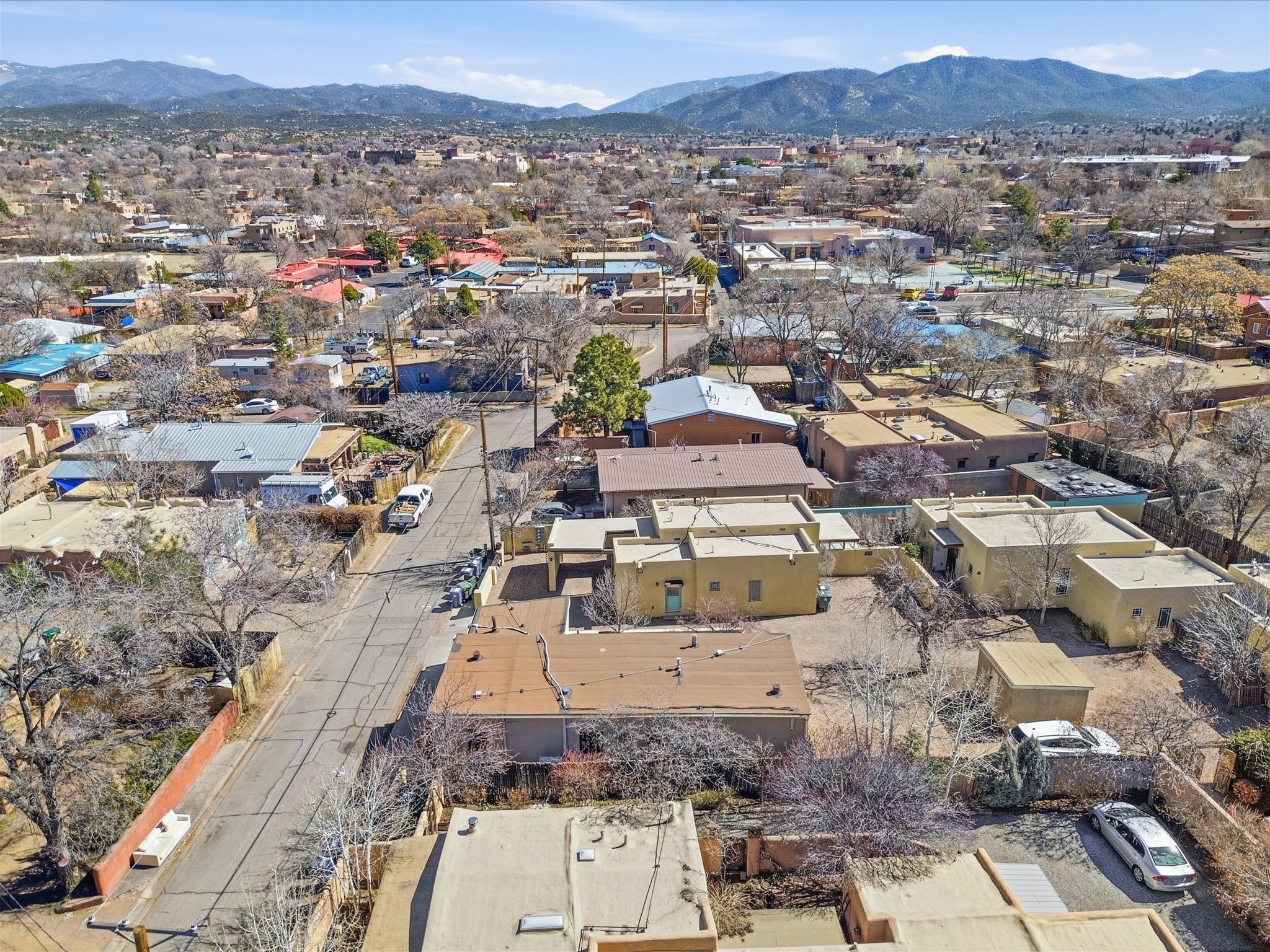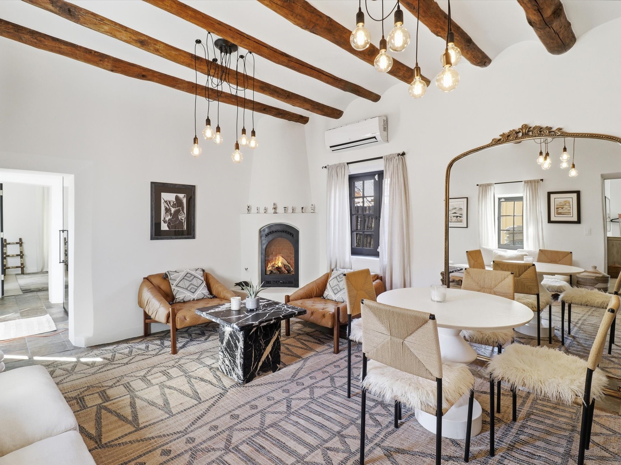 Own a piece of Santa Fe history in this free-standing Pueblo style Adobe. The original building of a charming four-condo enclave. Old world feel with Modern touches includes Coved ceilings, traditional Vigas, and a gas Kiva fireplace defining the living and dining space, complemented by spider chandeliers and modern updates like concrete countertops, hammered copper sink, and wooden floating shelves. White oak floors, plaster walls, and mini-split climate control offer comfort throughout. The bathroom features a mirrored barn door, contemporary vanity, walk-in shower with hand-painted Moroccan-style concrete tiles, and heated floors.Enjoy the walled and gated flagstone courtyard for morning coffee or sunset entertaining. Split floor plan provides bedroom privacy, plus a separate shed beside two assigned parking spaces.A short walk from the Rail yard District with cafs, dining, galleries, farmers market, and live music. Or head into the Historic Santa Fe Plaza. Casa Nola Retreat blends charm with modern living.