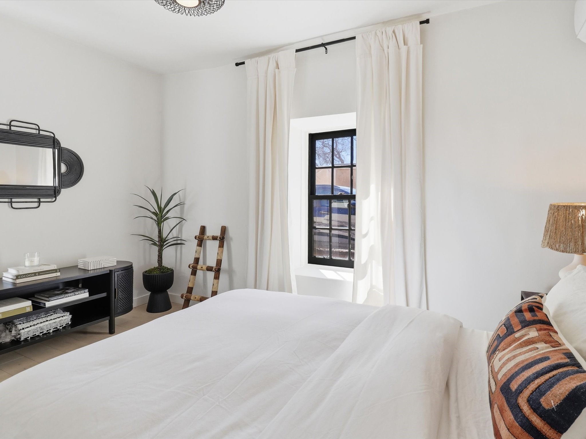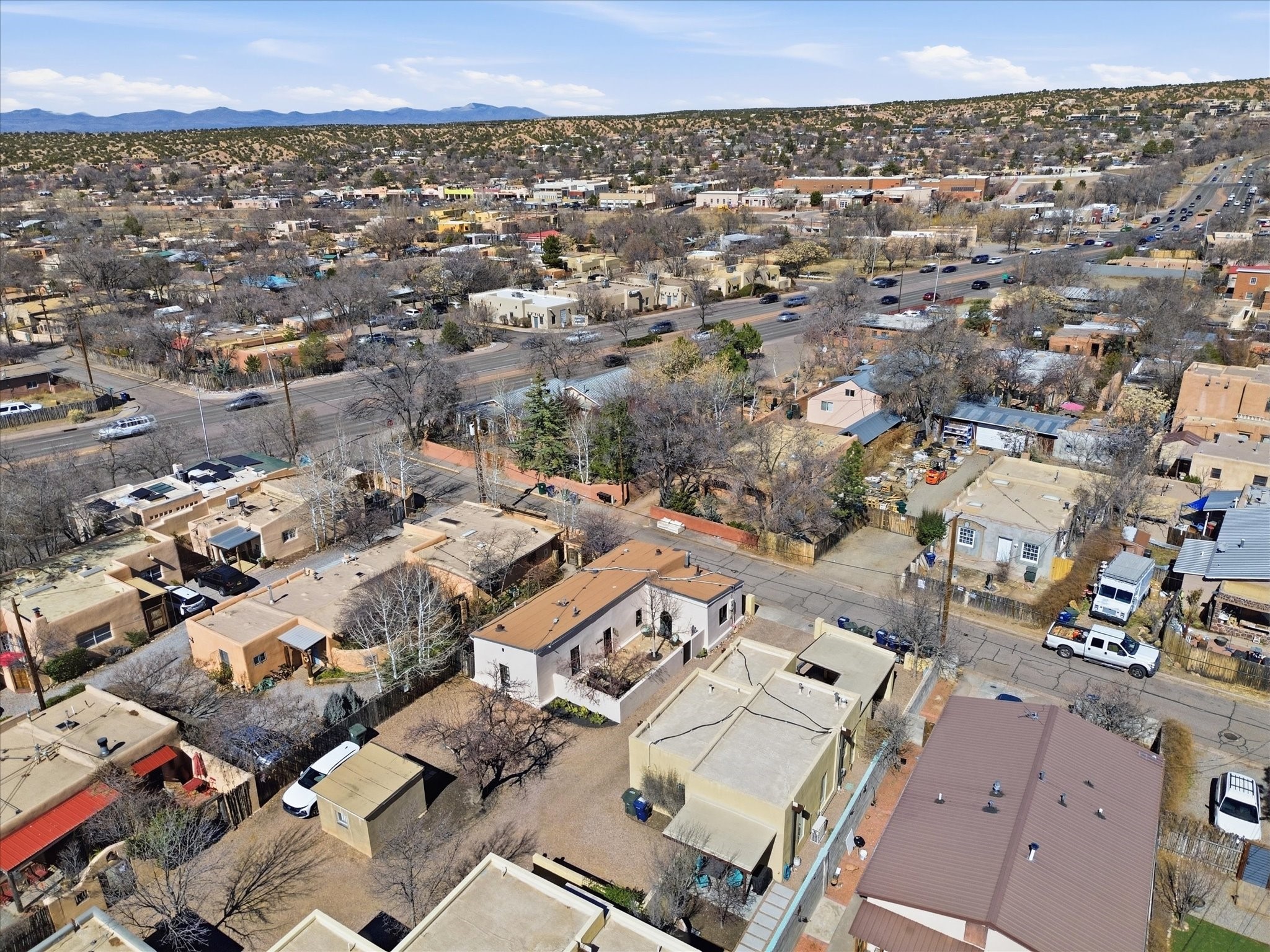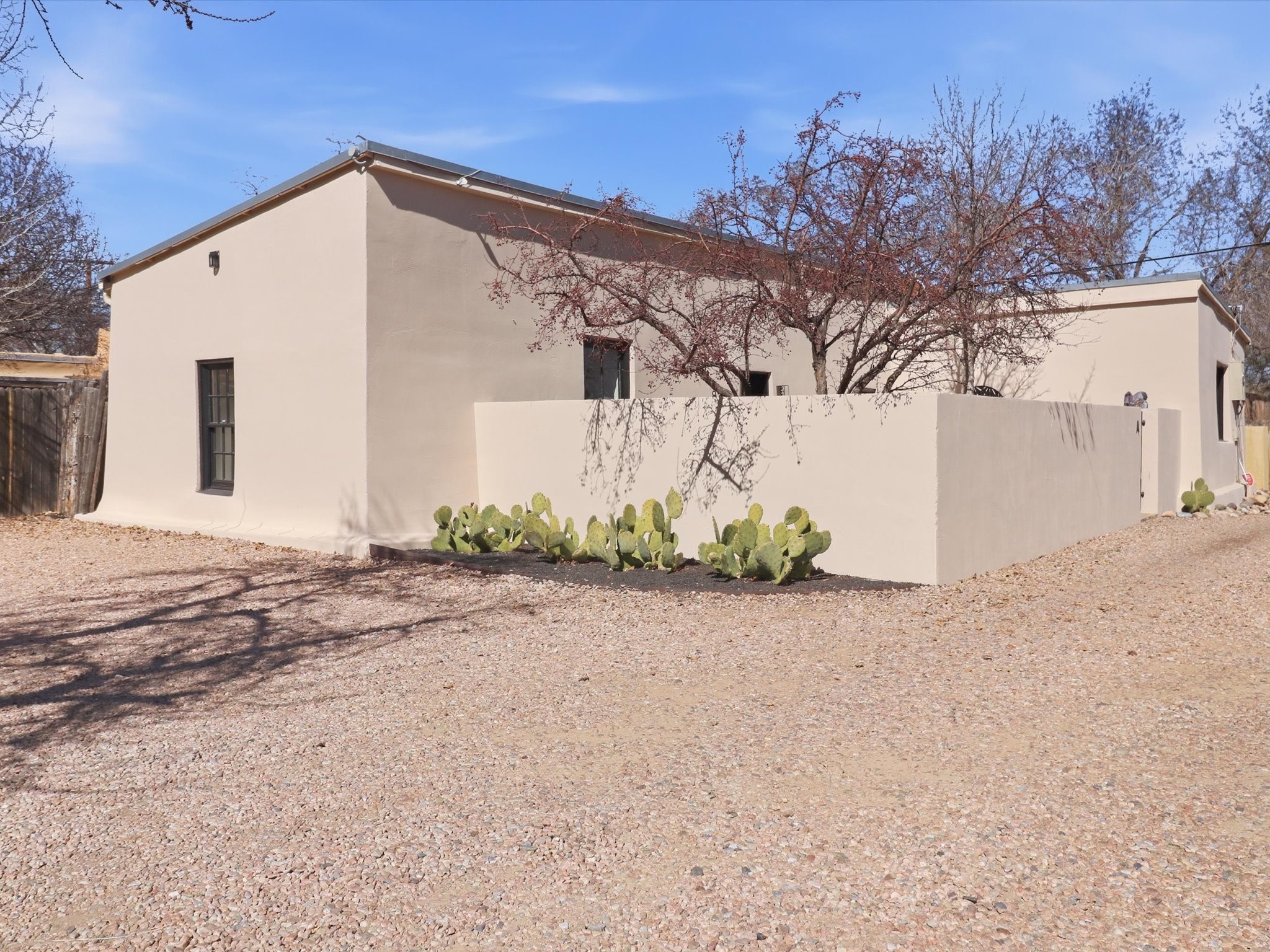 Own a piece of Santa Fe history in this free-standing Pueblo style Adobe. The original building of a charming four-condo enclave. Old world feel with Modern touches includes Coved ceilings, traditional Vigas, and a gas Kiva fireplace defining the living and dining space, complemented by spider chandeliers and modern updates like concrete countertops, hammered copper sink, and wooden floating shelves. White oak floors, plaster walls, and mini-split climate control offer comfort throughout. The bathroom features a mirrored barn door, contemporary vanity, walk-in shower with hand-painted Moroccan-style concrete tiles, and heated floors.Enjoy the walled and gated flagstone courtyard for morning coffee or sunset entertaining. Split floor plan provides bedroom privacy, plus a separate shed beside two assigned parking spaces.A short walk from the Rail yard District with cafs, dining, galleries, farmers market, and live music. Or head into the Historic Santa Fe Plaza. Casa Nola Retreat blends charm with modern living.