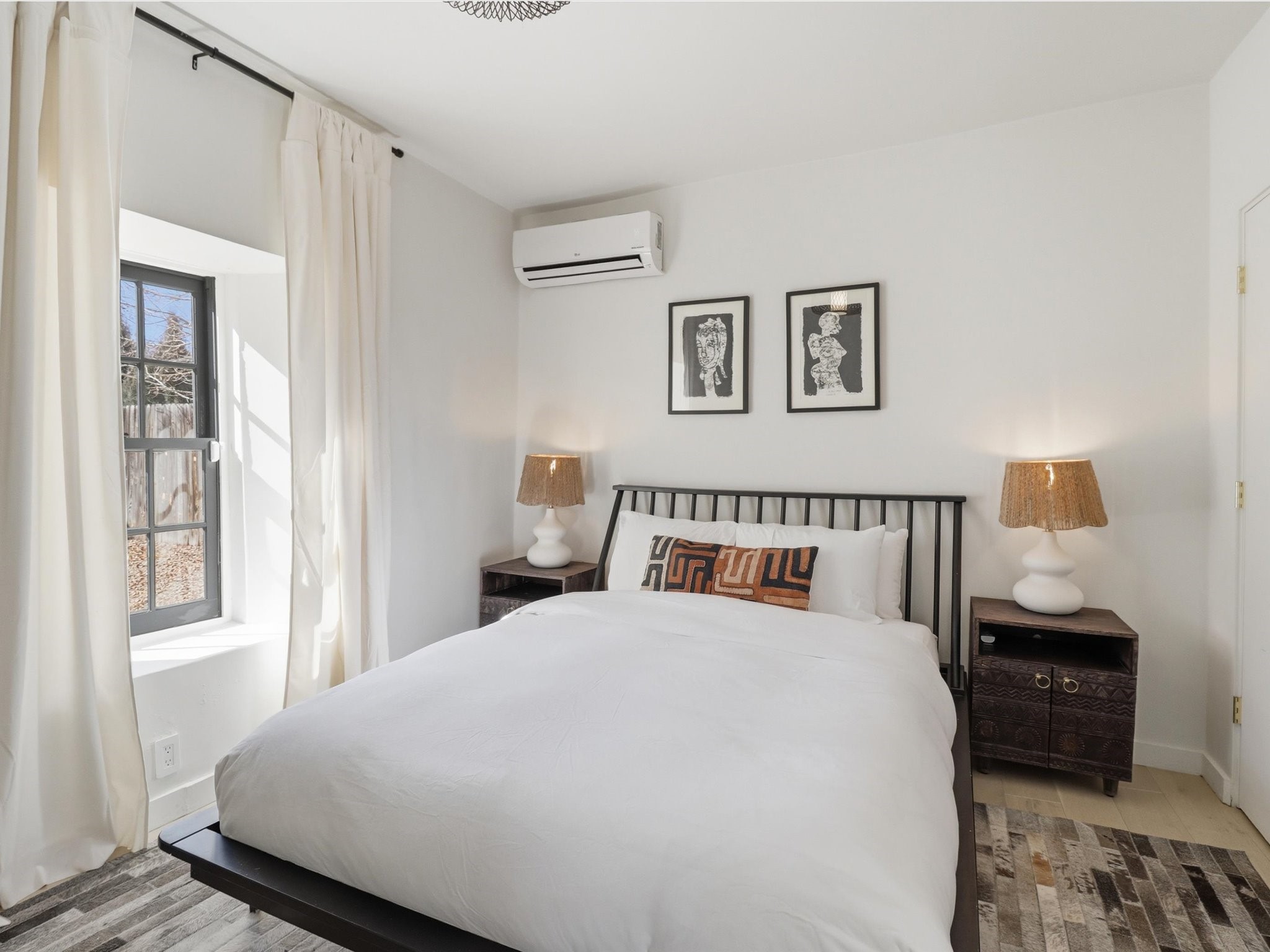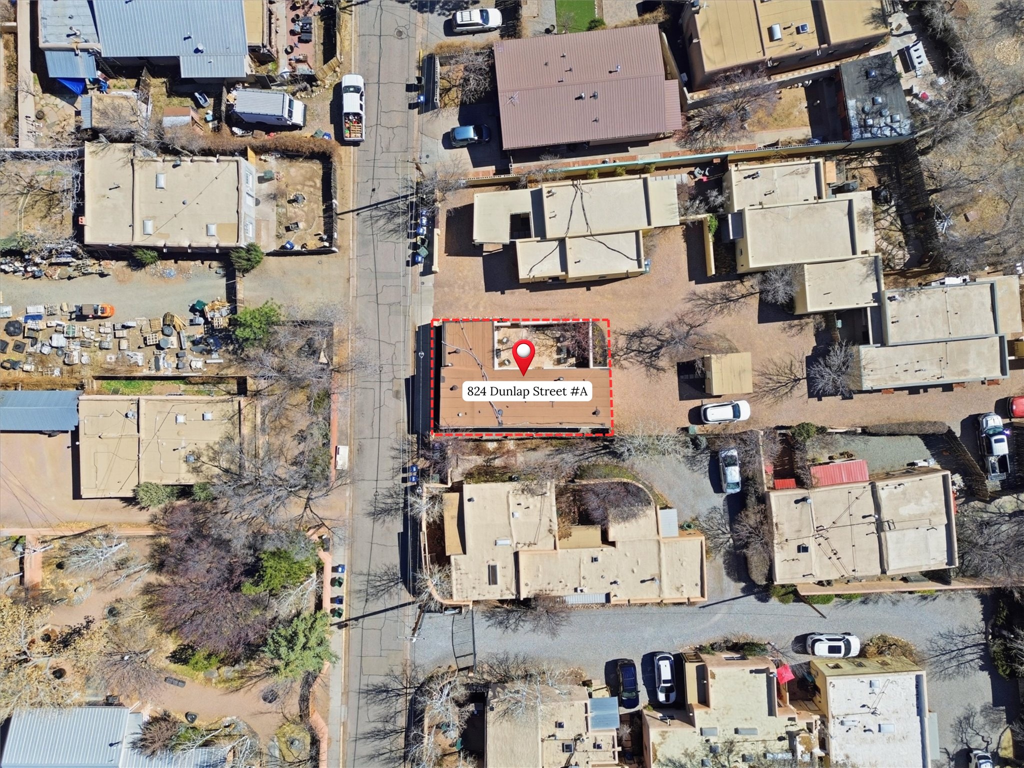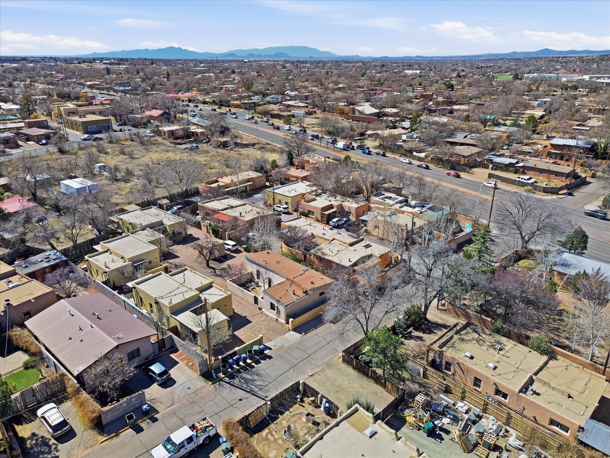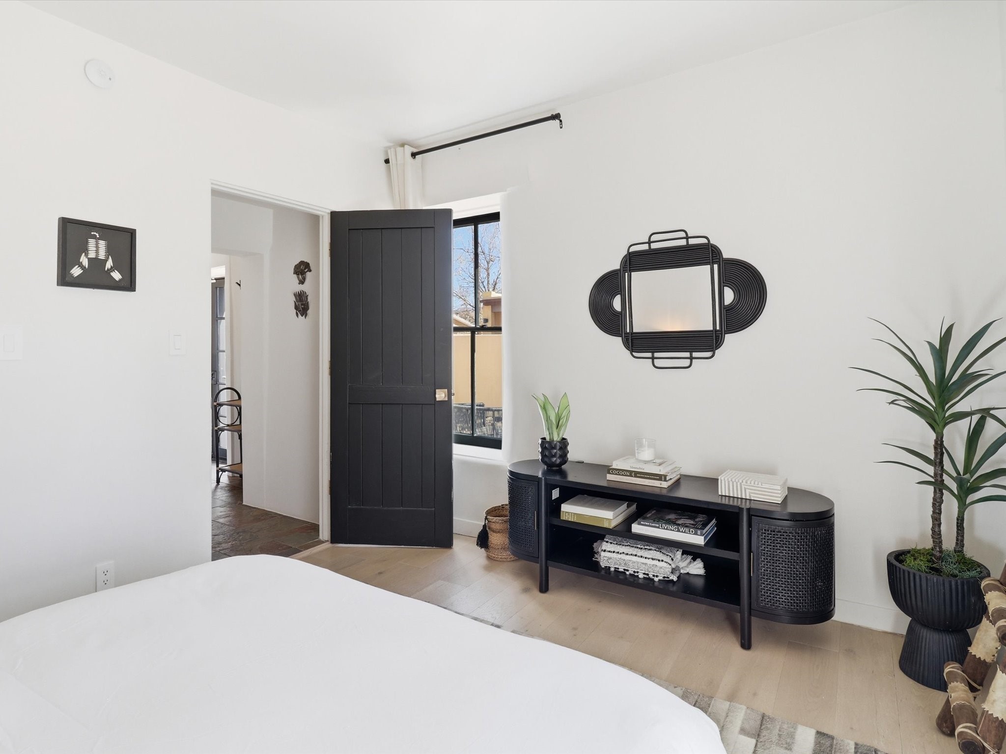 Own a piece of Santa Fe history in this free-standing Pueblo style Adobe. The original building of a charming four-condo enclave. Old world feel with Modern touches includes Coved ceilings, traditional Vigas, and a gas Kiva fireplace defining the living and dining space, complemented by spider chandeliers and modern updates like concrete countertops, hammered copper sink, and wooden floating shelves. White oak floors, plaster walls, and mini-split climate control offer comfort throughout. The bathroom features a mirrored barn door, contemporary vanity, walk-in shower with hand-painted Moroccan-style concrete tiles, and heated floors.Enjoy the walled and gated flagstone courtyard for morning coffee or sunset entertaining. Split floor plan provides bedroom privacy, plus a separate shed beside two assigned parking spaces.A short walk from the Rail yard District with cafs, dining, galleries, farmers market, and live music. Or head into the Historic Santa Fe Plaza. Casa Nola Retreat blends charm with modern living.